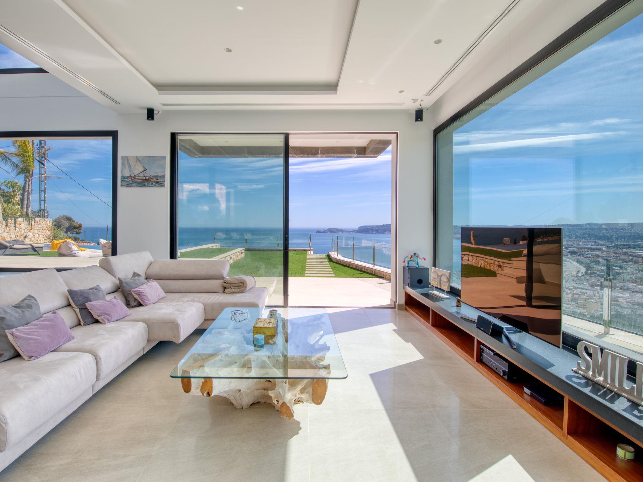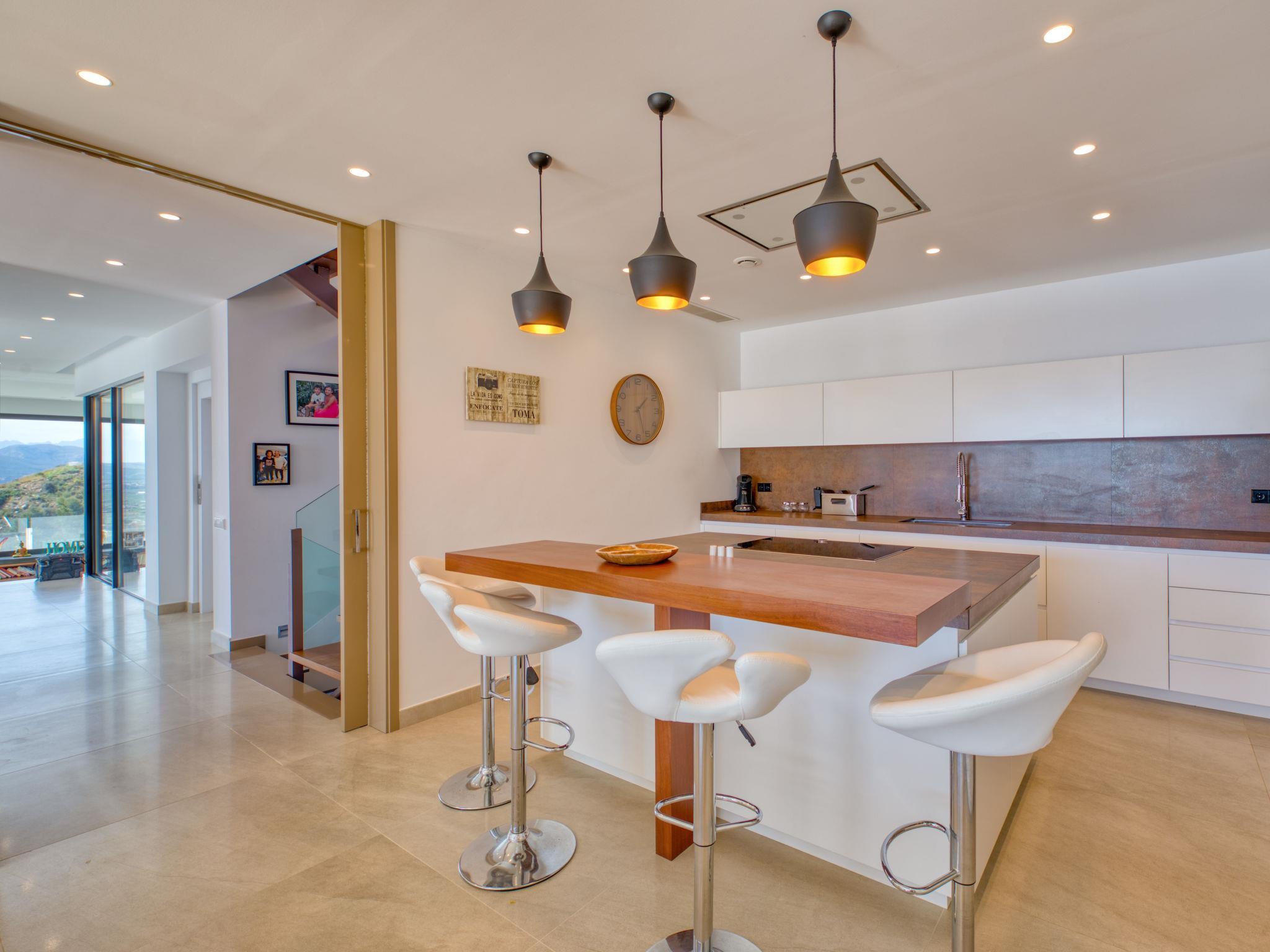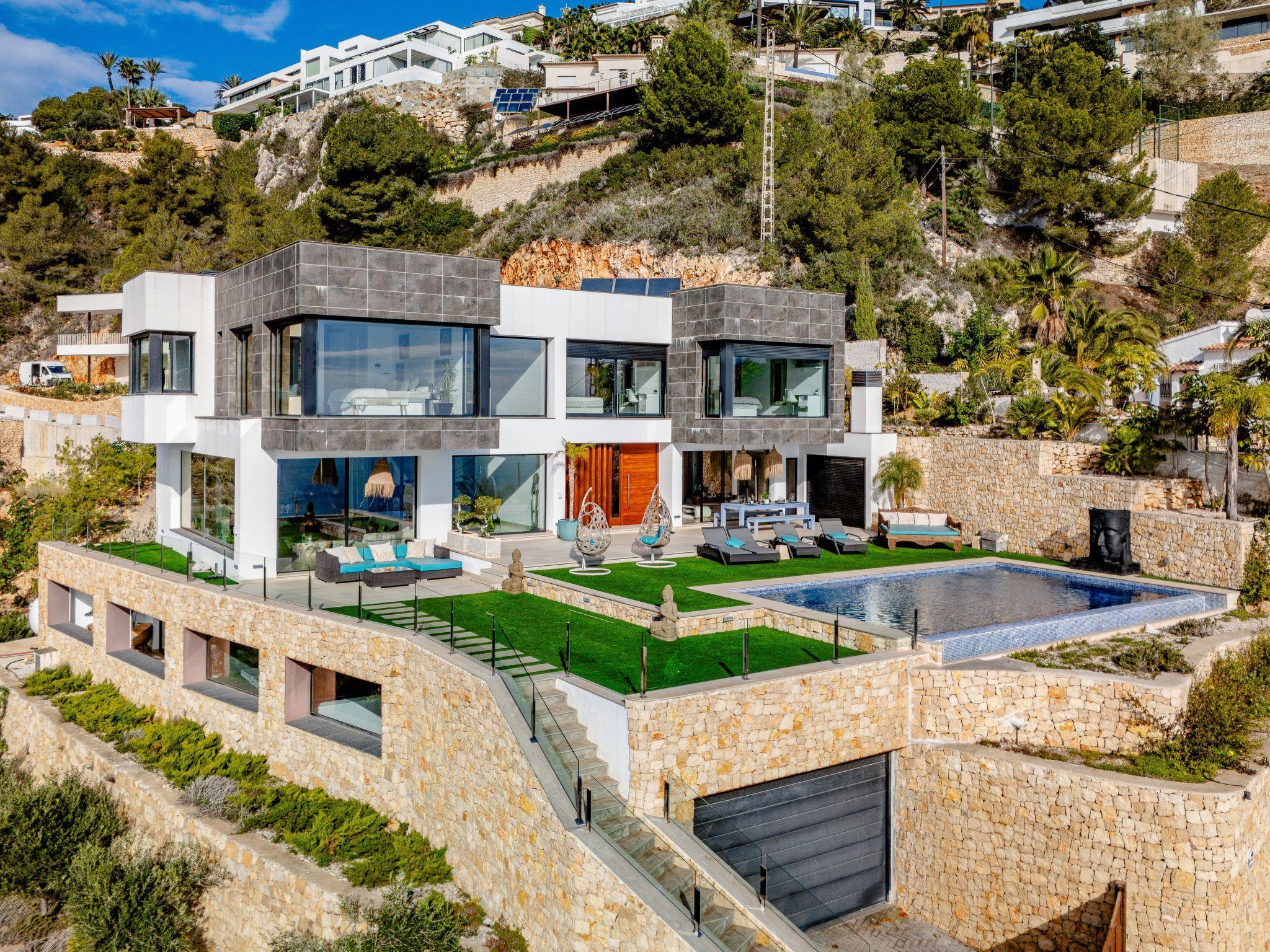 Villa Jakarta is a beautiful and impressive villa, modern in style, with fantastic views of the sea and the city of Jávea. Very large, very luxurious villa "Bali Infinity", 2 storeys. In the district of La Cuesta de San Antonio, 1 km from the sea, 1 km from the beach. Private: swimming pool (9 x 5 m, depth 110 - 180 cm, seasonal availability: 01.Jan. - 31.Dec.). Shower/WC in the pool area, outdoor shower, hot tub, terrace, garden furniture, barbecue, barbecue house. In the house: fitness room, hot tub, table tennis, lift, central heating system, air conditioning, laundry, washing machine, tumble dryer. Parking (for 3 cars) on the premises, single garage. Shop 1 km, supermarket 3 km, restaurant 1 km, bus stop 2 km, sandy beach "Arenal" 4 km pebble beach "La Grava" 1 km. Sports harbour 1 km, marina 1 km, surf school 1 km, sailing school 1 km, tennis 2 km.
