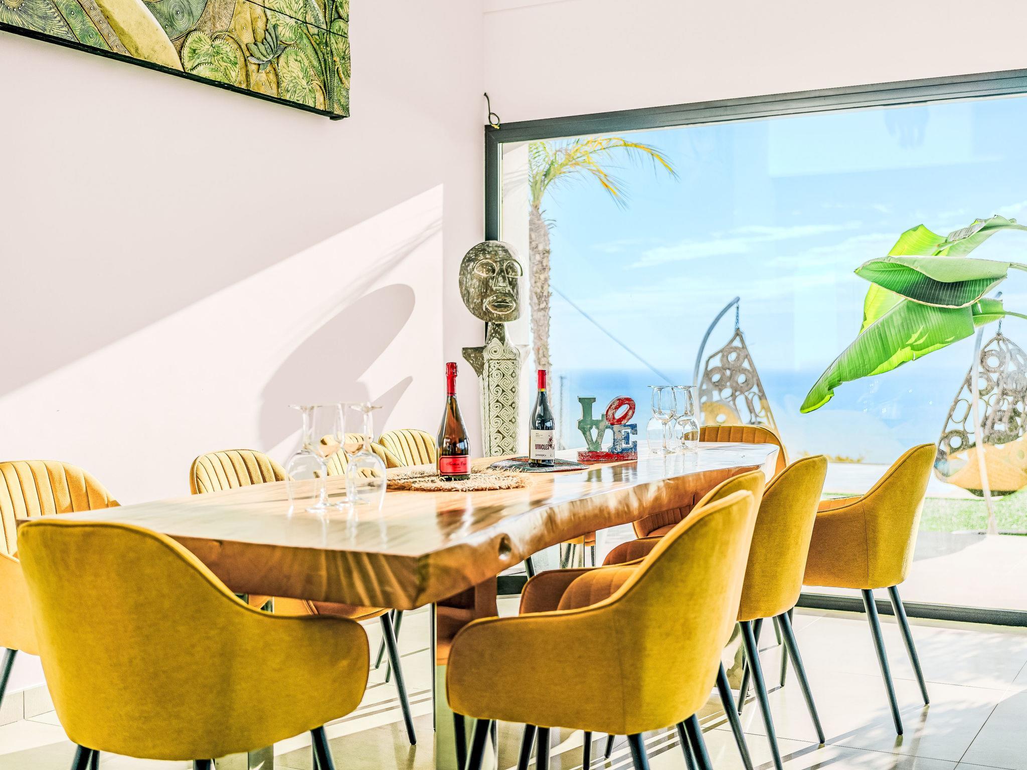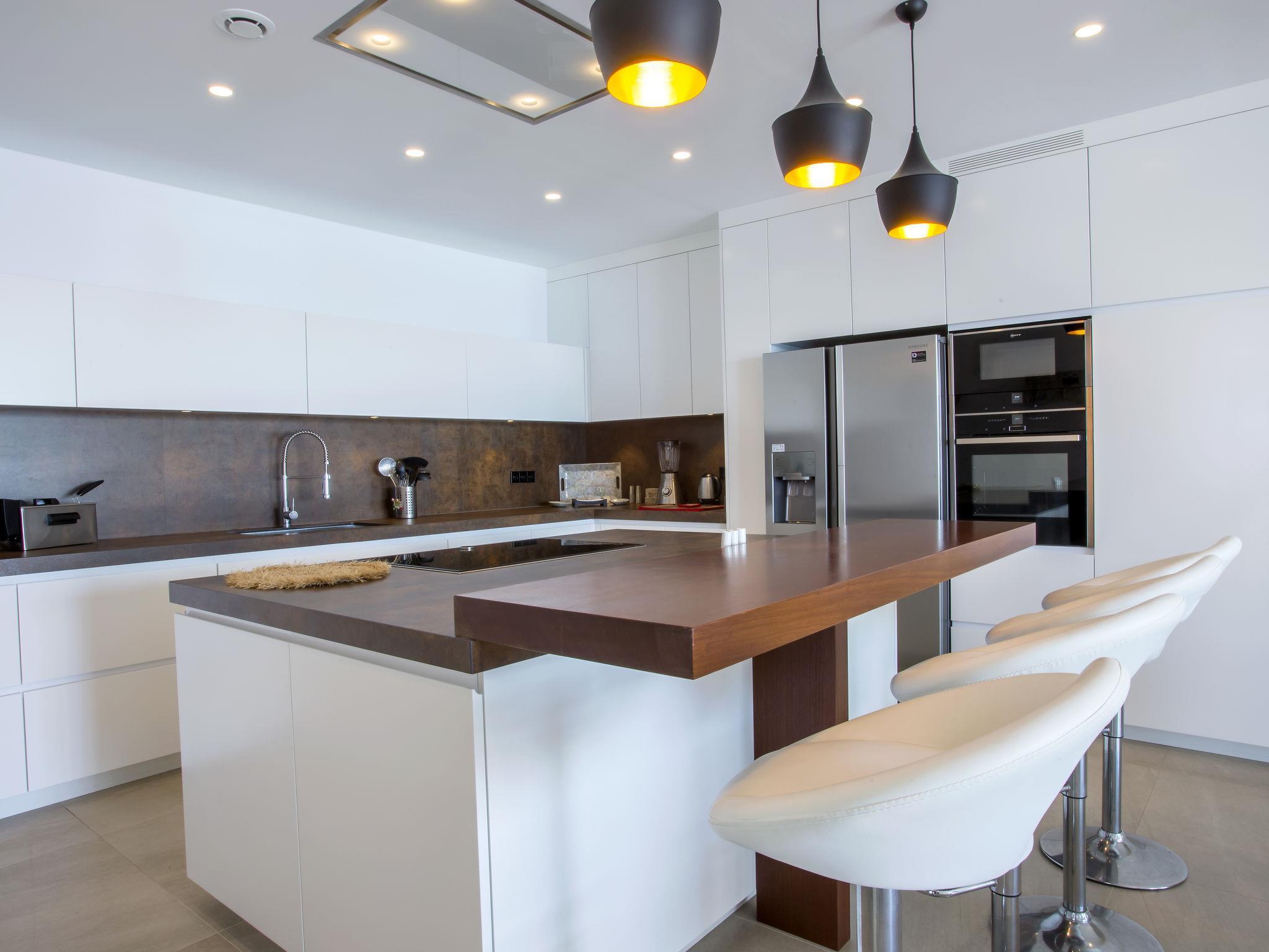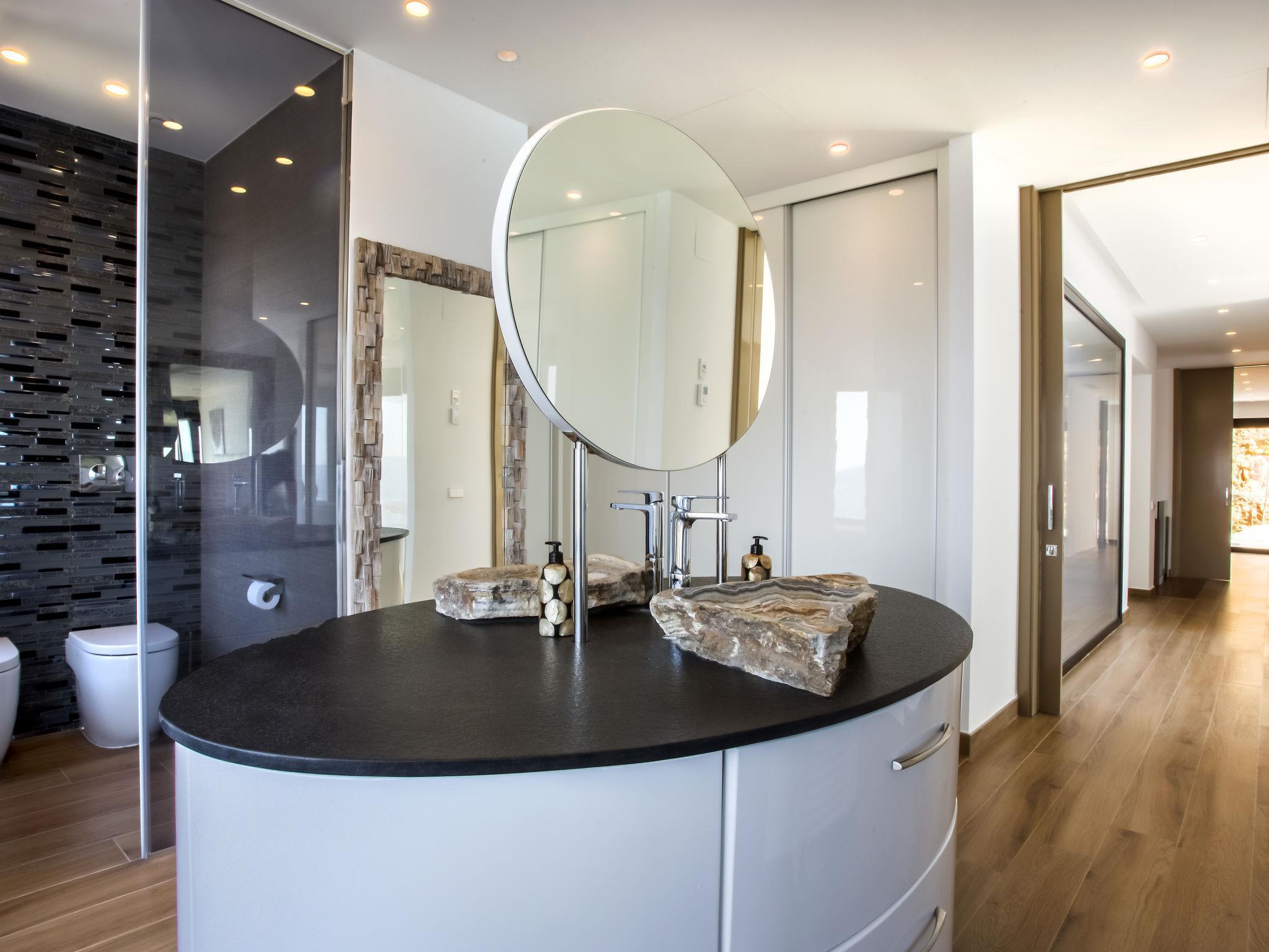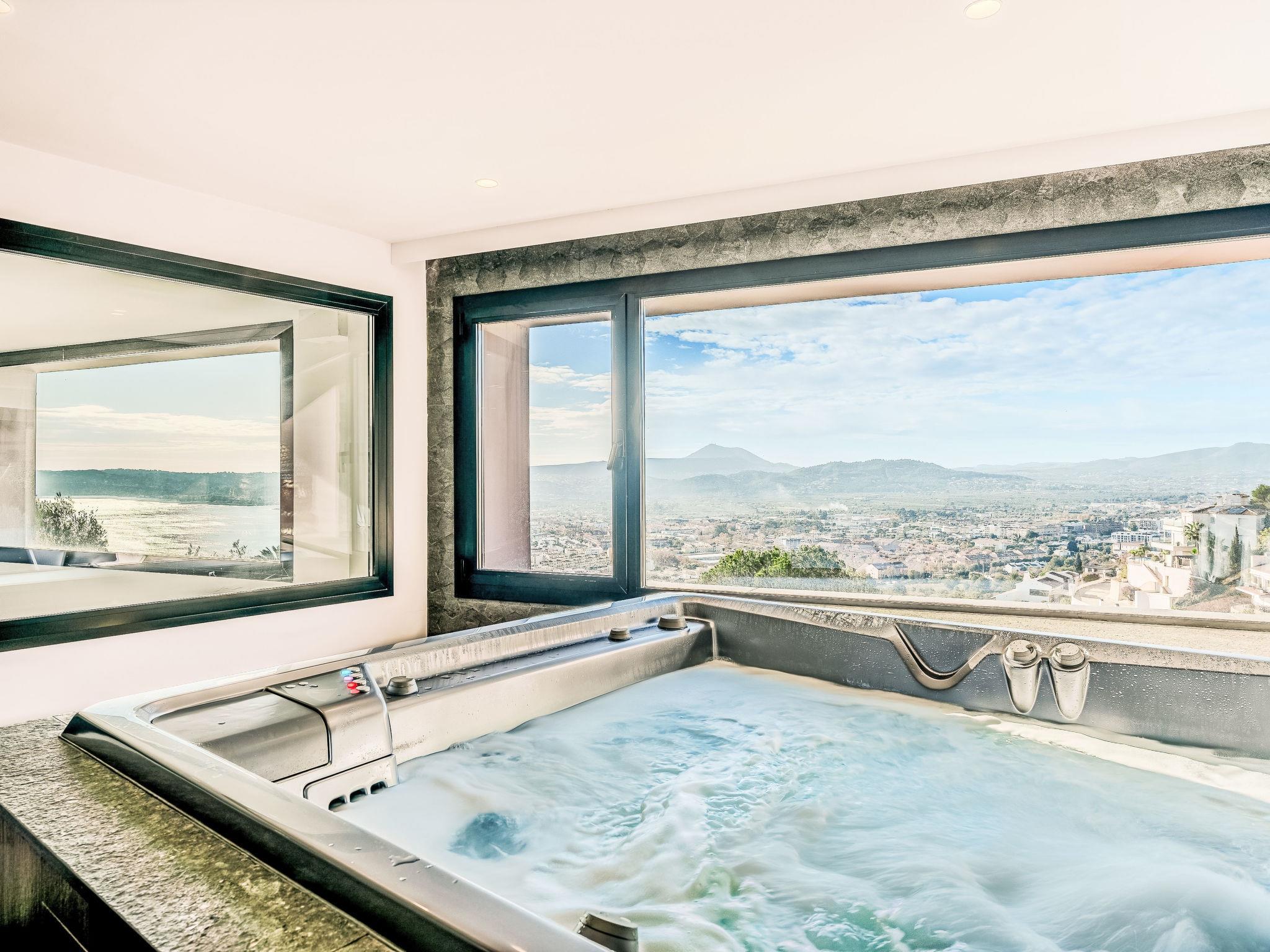 "Villa Bali Infinity", 7-room villa 650 m2 on 2 levels. Spacious and bright, very modern and luxurious furnishings: living/dining room with open-hearth fireplace, dining table, satellite TV and digital TV. Large kitchen (oven, dishwasher, 4 induction hot plates, toaster, kettle, microwave, freezer, electric coffee machine, cooking island). Shower/WC. On the lower ground floor: 1 room with 1 french bed (160 cm, length 200 cm), shower/WC. 1 room with 1 french bed (160 cm, length 200 cm), shower/WC. Upper floor: 1 room with 1 french bed (180 cm, length 200 cm), shower/WC. 1 room with 1 french bed (160 cm, length 200 cm), shower/WC. 1 room with 1 french bed (160 cm, length 200 cm), shower/WC. Large terrace. Terrace furniture, barbecue, deck chairs (3). Marvellous panoramic view of the sea and the resort. Facilities: washing machine, dryer, iron, hair dryer. Internet (WiFi, free). At the house. On the lower floor there is also a gym with hot tub and toilet. Garage for three cars. VT-484887-A // Reg. Nr.: ESFCTU0000030710009718020000000000000CV-VUT0484887-A6