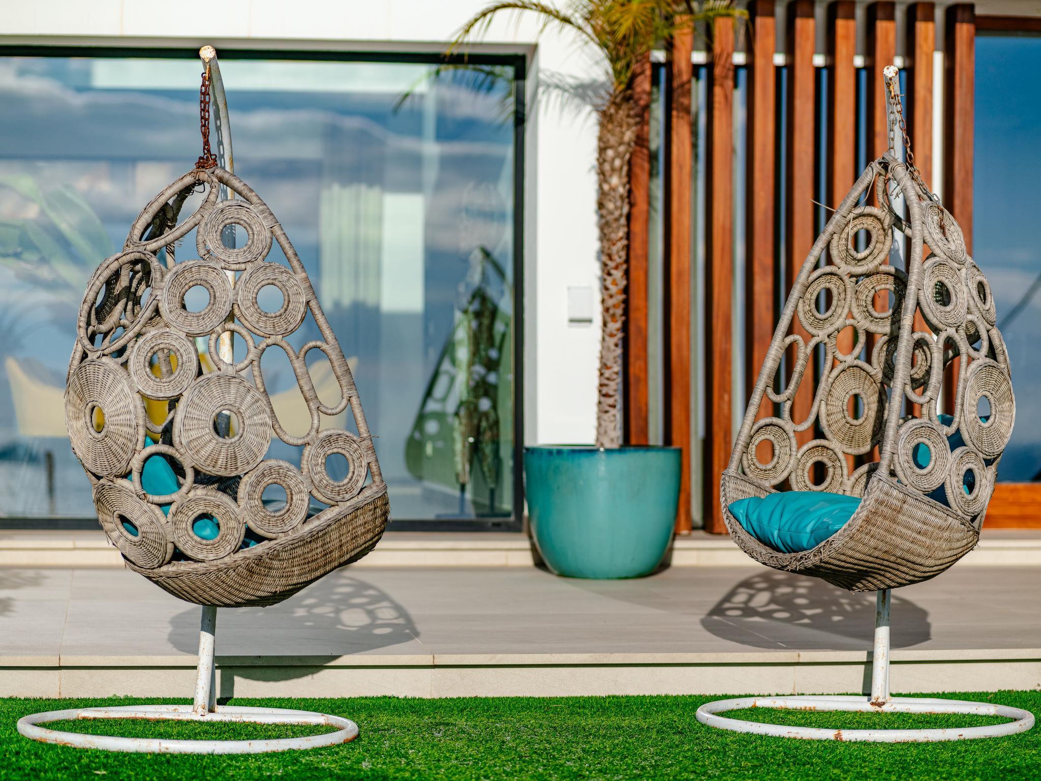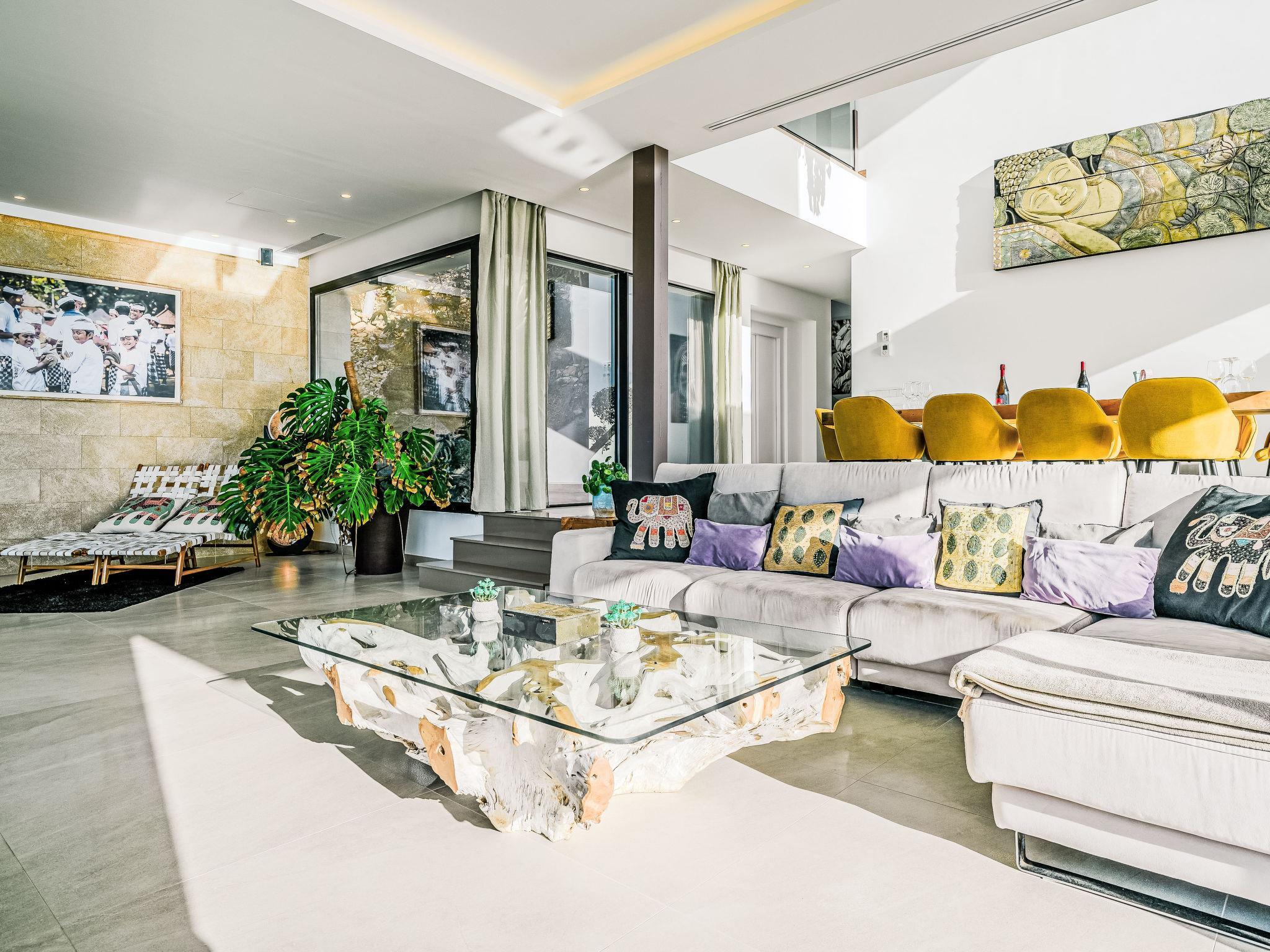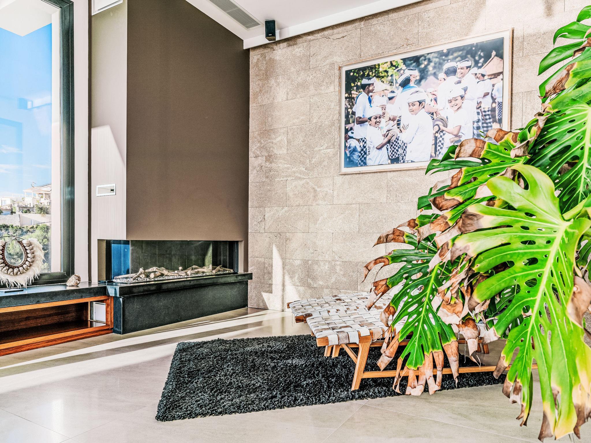 "Villa Bali Infinity", 7-room villa 650 m2 on 2 levels. Spacious and bright, very modern and luxurious furnishings: living/dining room with open-hearth fireplace, dining table, satellite TV and digital TV. Large kitchen (oven, dishwasher, 4 induction hot plates, toaster, kettle, microwave, freezer, electric coffee machine, cooking island). Shower/WC. On the lower ground floor: 1 room with 1 french bed (160 cm, length 200 cm), shower/WC. 1 room with 1 french bed (160 cm, length 200 cm), shower/WC. Upper floor: 1 room with 1 french bed (180 cm, length 200 cm), shower/WC. 1 room with 1 french bed (160 cm, length 200 cm), shower/WC. 1 room with 1 french bed (160 cm, length 200 cm), shower/WC. Large terrace. Terrace furniture, barbecue, deck chairs (3). Marvellous panoramic view of the sea and the resort. Facilities: washing machine, dryer, iron, hair dryer. Internet (WiFi, free). At the house. On the lower floor there is also a gym with hot tub and toilet. Garage for three cars. VT-484887-A // Reg. Nr.: ESFCTU0000030710009718020000000000000CV-VUT0484887-A6