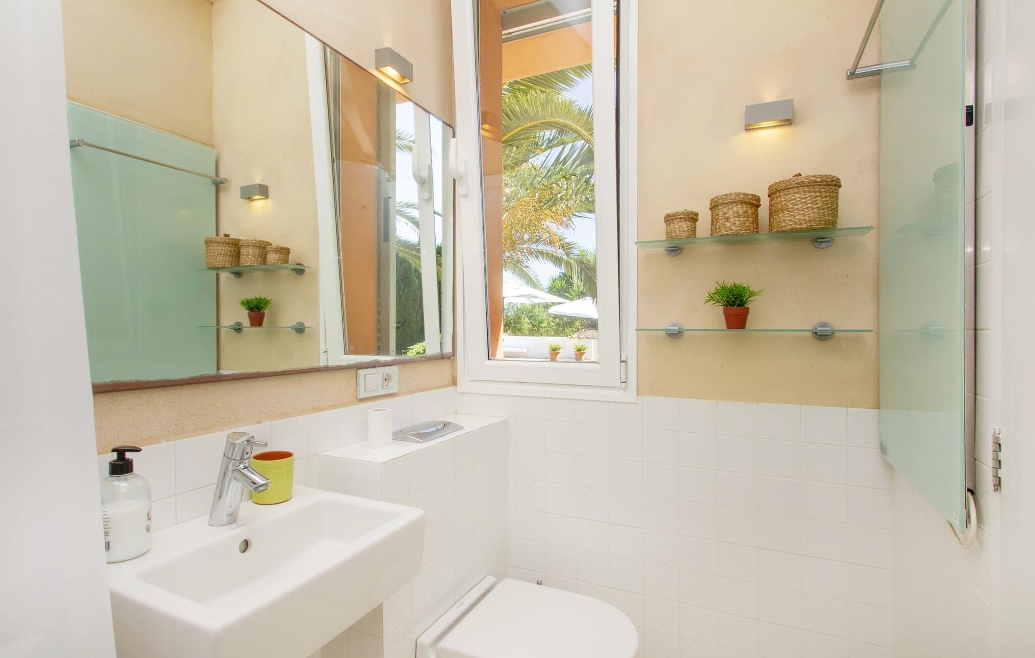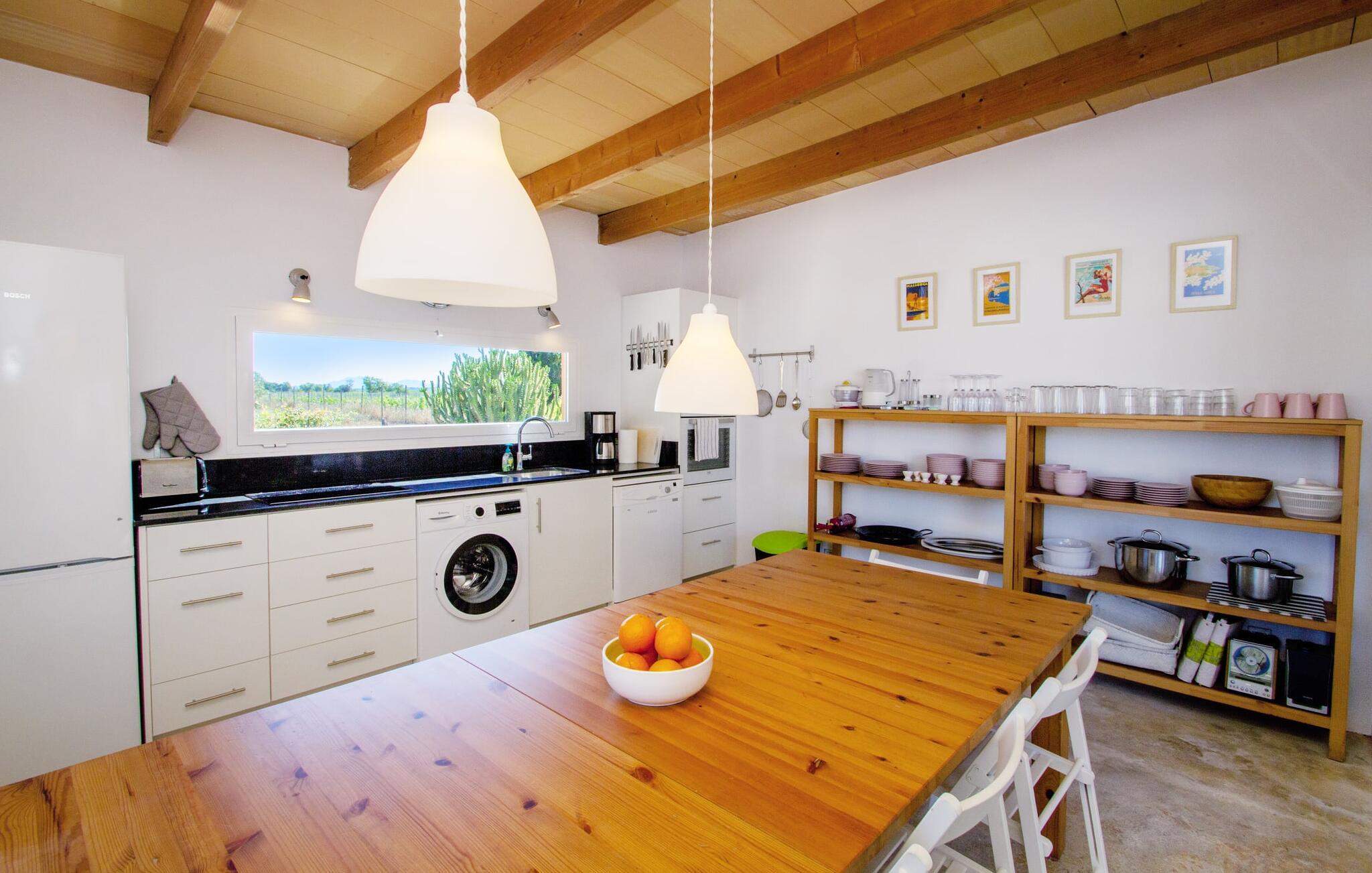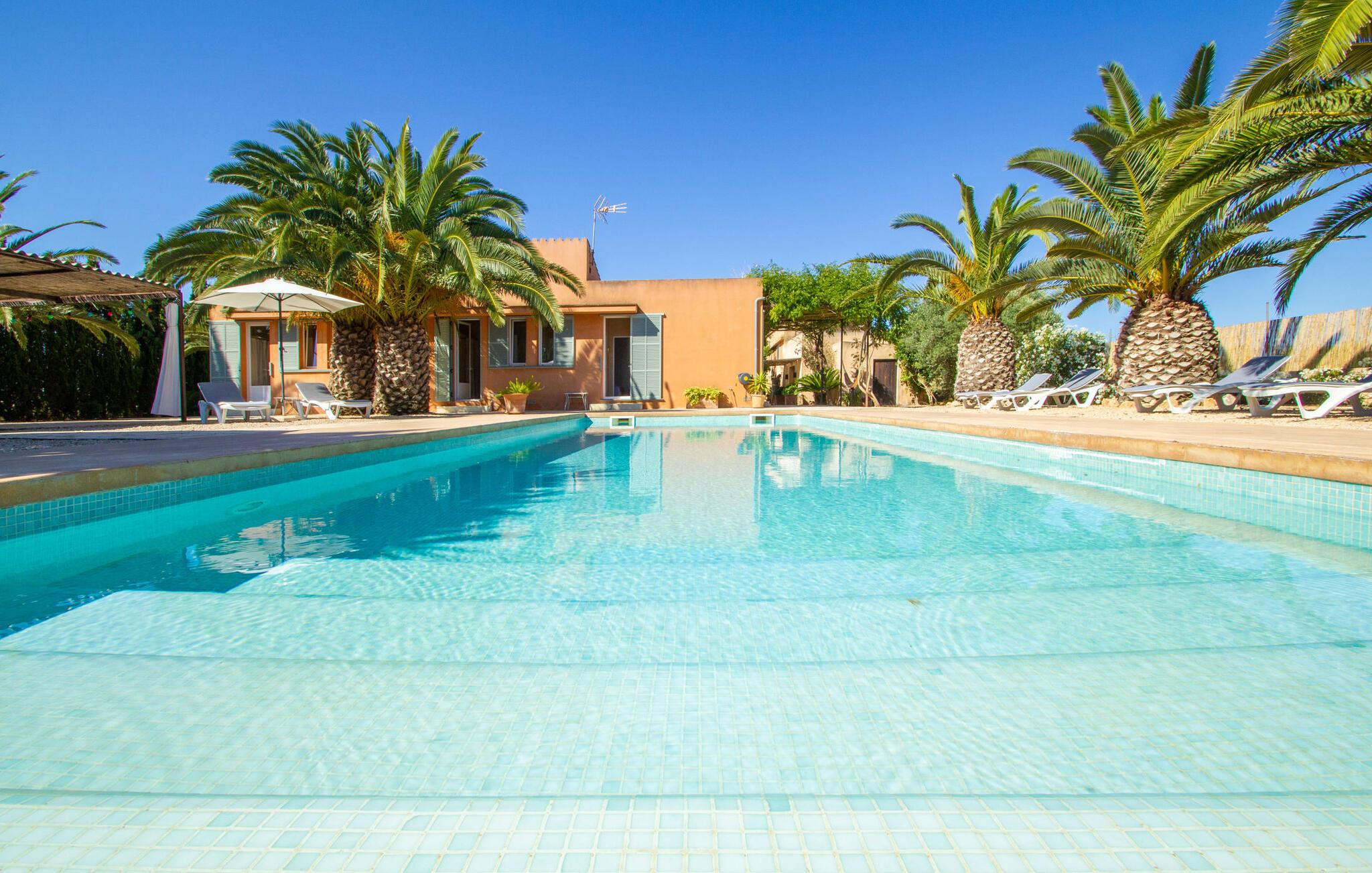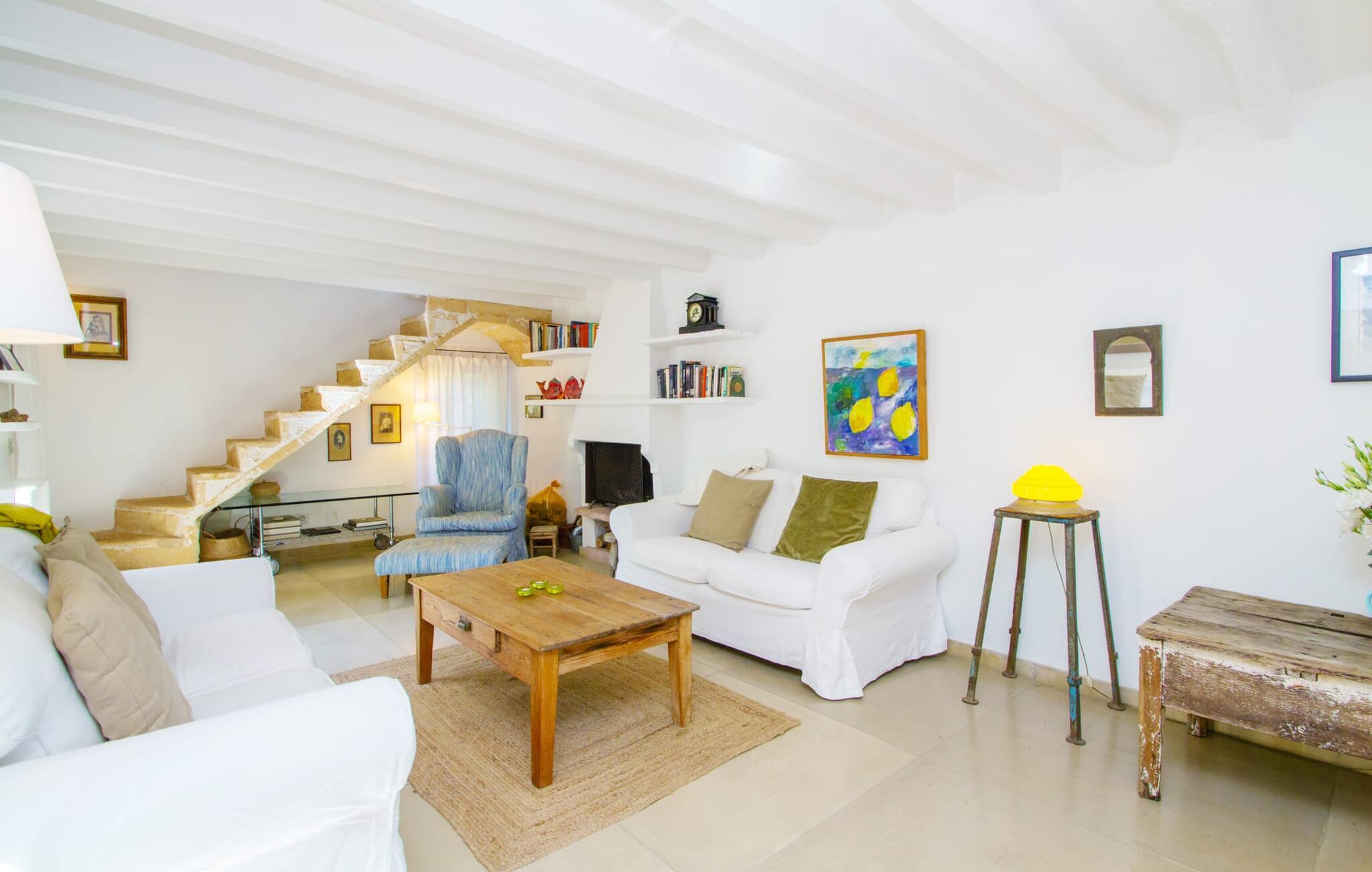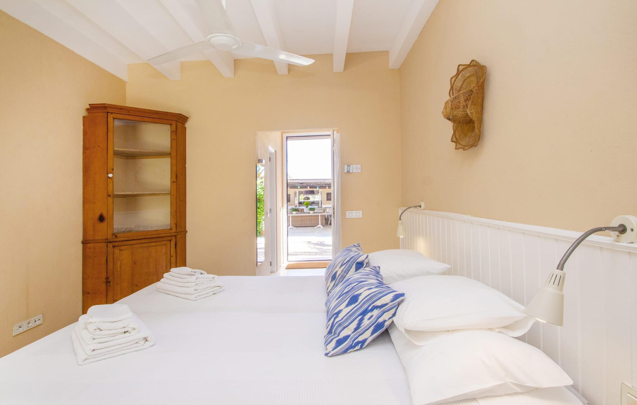 Den renoverede gamle villa "Jara" er en meget speciel ejendom. Den består af en cirka 200 år gammel og totalrenoveret hovedbygning, en ny bygning med yderligere soveværelser, hver med eget toilet og bad en suite, og en tredje del af ejendommen med et stort sommerkøkken, en stor skyggefuld terrasse med udsigt over poolen og en terrasse foran med et afslappet område Siddemuligheder. I det nænsomt renoverede hovedhus er der åbent køkken og en meget stor, åben og moderne stue/alrum. Møblerne er vidunderlige lyse og overvejende hvide: de gamle synlige bjælkelofter er blevet malet hvide, de komfortable møbler i opholdsområdet er hvide og væggene er lyse hvide. De store, sandstensfarvede gulvfliser og de til dels antikke vægmalerier og træmøbler danner en smuk kontrast til dette rum. Spisepladsen åbner op og fører jer ind i den store, moderne indrettede stue/køkken. Det cremefarvede køkken er fuldt udstyret med alt hvad I har brug for, lige fra en kedel, brødrister, mikroovn, juicer, kaffemaskine, komfur (indstillet i en behagelig højde) til en opvaskemaskine. Det lange, smalle trævindue i køkkenet er særligt smukt, et særligt træk med en fantastisk udsigt og giver masser af lys i rummet. Til de koldere årstider er der en pejs i hovedhuset, der skaber hyggelig varme. Overfor køkkenet i den anden ende af stuen fører en fritstående stentrappe op til det eneste soveværelse i den gamle bygning, som også er det eneste udstyret med aircondition. Fra det komfortable soveværelse har I udgang til en privat terrasse. Der er naturligvis også et moderne badeværelse på denne etage. Når I forlader hovedhuset, får I adgang til den overdækkede veranda og en lille frugthave. Begge er lige ved siden af ??huset. Her finder I indbyggede stenbænke, der er udstyret med tykke, hvide sædehynder og giver plads nok til at slappe af og blive hængende. Udearealet har i alt 3 terrasser, hvoraf den ene ligger direkte på det flot renoverede, antikke hovedhus. Den anden terrasse er placeret langs den nye bygning og byder også på adskillige siddepladser, der inviterer jer til at slappe af. I den terracottafarvede nybygning finder I fire helt selvstændige dobbeltværelser med hver sin indgang og ikke forbundet med hinanden. Hvert af disse individuelt designede soveværelser er udstyret med loftsventilator og har eget badeværelse med al komfort. Et af rummene har endda et ekstra værelse, der kunne bruges som enten stue eller børneværelse, en funktion, som vi synes, den vil egne sig særdeles godt til. Terrasseområder dækket med et bambustag strækker sig langs hvert soveværelse. Her er også placeret et komfortabelt møbelsæt, så uanset hvilket soveværelse I befinder jer i, kan I stå op om morgenen og nyde direkte udgang til terrassen og nyde den friske morgenluft. Sengene er 1,40 m og 1,60 m store, og i to af soveværelserne endda 1,80 m. Om vinteren kan hovedhuset lejes af kun to personer, især takket være pejsen. Både hovedbygningen og de nye huse har centralvarme. Vi er særligt imponerede over det store poolområde med dets enestående detaljer. Niveaubassinet måler 10 x 4 m og har en dybde mellem 0,70 og 2 meter. Poolen er omgivet af en omsluttende terrasse. En liggestol er til rådighed for hver gæst, og to parasoller er tilgængelige for at give skygge. Murstensbænken foran poolen tilbyder en ekstra plads, hvor I kan læne jer tilbage og nyde et langt solbad. I sommermånederne vil livet sandsynligvis for det meste foregå udenfor. Udover de to andre overdækkede terrasser finder vi endnu en terrasse, der strækker sig direkte langs poolen. Denne terrasse er dækket af en baldakin og bambus, hvilket gør den til et perfekt sted at finde ly for solen. De hvide stofgardiner på siderne tilføjer ikke kun mere æstetik til dette område, men giver også yderligere beskyttelse mod vind og sol. Under det store lærredstag er der endnu en malerisk siddeplads med lounge-atmosfære, hvor I kan trække vejret dybt og komme jer fra hverdagens stress. Der er plads nok til hver enkelt gæst ved det lange spisebord - og et særligt højdepunkt er det tilstødende sommerkøkken, der ligesom køkkenet i hovedhuset er indrettet efter høj standard og har opvaskemaskine, vaskemaskine, køleskab, ovn, kogeplader, mikroovn og masser af bestik. Udover dette sommerkøkken er der også en fritstående kulgrill. Så hvis I vil lave mad, finder I et ideelt sommersted i dette fantastiske udekøkken, mens I reserverer hovedhusets komfortable, hyggelige vægge og sovepladsen i den nye bygning næsten udelukkende til at sove eller som et tilflugtssted efter en lang dag med at udforske det omkringliggende område. Den charmerende villa "Jara" ligger i en helt privat beliggenhed tæt på en landevej, der fører direkte til den smukke naturlige strand Es Trenc. Hvis I planlægger en dag på stranden, er der udover Es Trenc, her i den sydlige del af øen utallige forskellige muligheder med hver deres fordele: Mellem Es Trenc og Sa Rapita stranden ligger den storslåede Platja Ses Covetes, som er 300 meter lang og kun 4,5 km fra villaen. Der kan I leje parasoller og liggestole samt en strandbar og en kiosk. Uanset hvordan I bruger jeres dag - hvad enten I er på en af ??de smukke strande i den sydlige del af øen eller i jeres rummelige villa "Jara" og dens ekstraordinære udendørsområde - lover jeres ophold i denne hyggelige villa afslapning og berigelse for sjælen i en kærlig, individuel måde og hyggelig atmosfære. Vi hos Fincallorca ønsker jer en afslappende ferie. Den 200 år gamle villa "Jara" med en ekstra ny bygning og et fantastisk udendørs køkken ligger i en vidunderlig landlig beliggenhed mellem Campos (10 minutter væk i bil) og den lille kystby Ses Covetes. I Campos kan I gøre jeres daglige indkøb eller måske forsyne jer med friske lokale produkter, der sælges på det lokale ugentlige marked torsdag og søndag. Det attraktive Platja Ses Covetes ligger kun 4,5 km v
