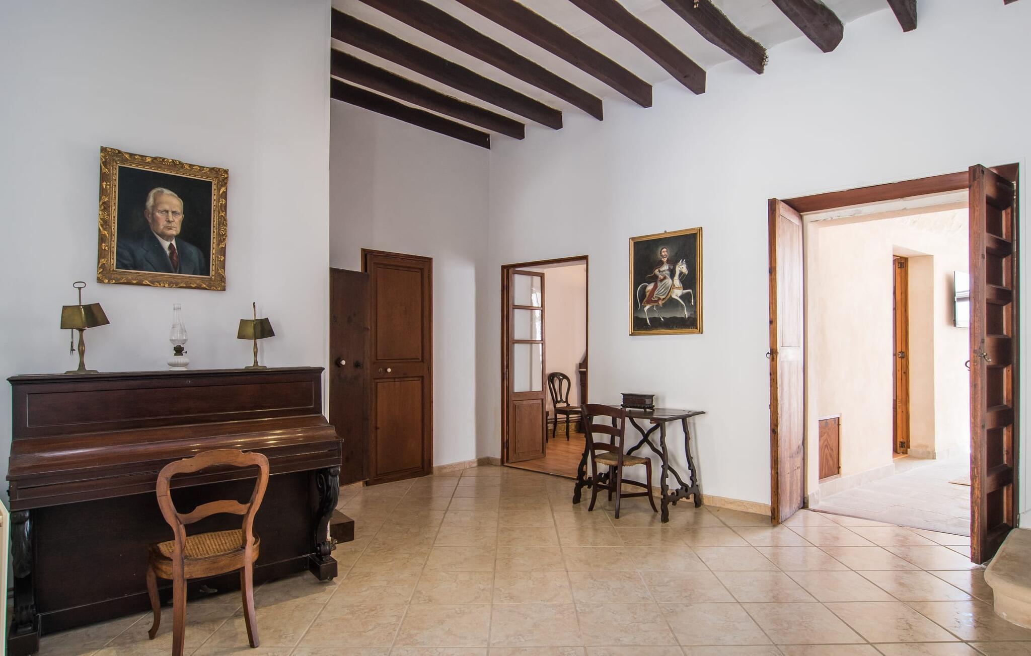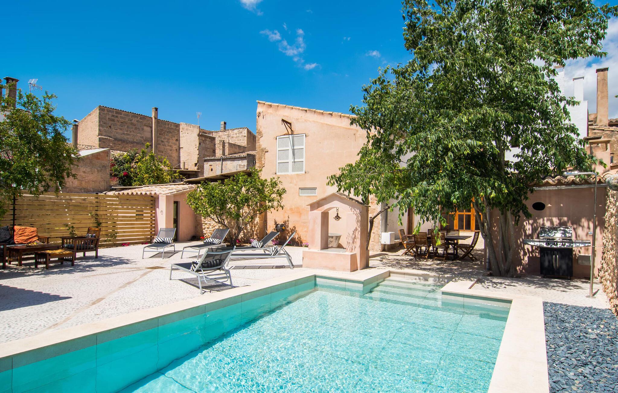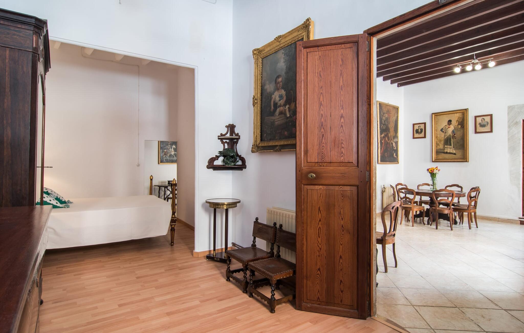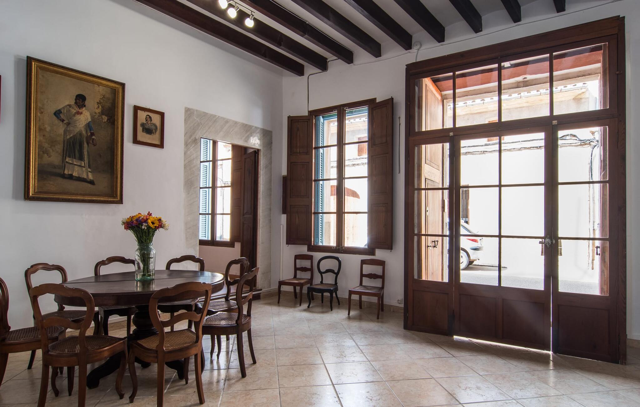 Nyder du at være blandt mennesker, være midt i travlheden, have en hyggelig snak med naboerne og frem for alt nyde godt af en central beliggenhed, der gør, at du kan gøre dine indkøb og restaurantbesøg til fods? Sætter du også pris på en autentisk, traditionel flair og elsker følelsen af, at historien kommer til live, mens du samtidig nyder moderne komfort? Så har du fundet det perfekte feriehus med det smukke rækkehus "Jaume II". Det er beliggende i Llucmajor i det sydlige Mallorca, i et typisk boligområde. Bag huset har du en oase: På ejendommen finder du ikke kun en skrånende pool med liggestole og parasoller, et udendørs badeværelse, et køkken og et brusebad, men også et stort, solrigt terrasseområde med forskellige siddemuligheder, nogle under træer . Lige ved siden af huset står spisebordet, hvor du kan servere grillede lækkerier. Ved siden af poolen, omgivet af naturstensvægge, kan du sætte dig til en siesta på komfortable loungemøbler. Store vinduer slipper lys ind, stemningen er præget af hvælvede stenlofter i nogle rum, mens mørke træbjælker er synlige i andre. Så snart du træder ind i huset, vil du straks føle dig som en spansk konge - antikke møbler, nogle kunstfærdigt udskåret og dekoreret med indlæg, samt oliemalerier i guldrammer udstråler en luksuriøs atmosfære. Trods den til dels historiske indretning fremstår huset ikke gammeldags – tværtimod. Gammelt og nyt er smagfuldt og dygtigt blevet kombineret her. De to badeværelser, for eksempel - et en-suite i stueetagen og et på øverste etage - er meget smarte og moderne og næsten puristisk flisebelagt med natursten. Køkkenet i stueetagen er også bevidst holdt enkelt, en fin kontrast til de gamle, stilrene møbler, der er at finde i de øvrige rum. Der er endda plads til et klaver i det rummelige indgangsparti. Der er også to spisestuer og en stue med en dejlig stor sofa og udsigt udenfor. Der er i alt tre soveværelser i stueetagen og øverste etager, alle med imponerende, næsten majestætiske træsenge, hvoraf det ene endda er udstyret med pejs. Omkring dit hus kan du tage afslappende gåture gennem kvarteret og ind i de landlige omgivelser. Llucmajor, malerisk omgivet af abrikos- og mandellunde, skabte engang et navn for sig selv som et industricenter. Byen blev især berømt for produktion af sko, men den dag i dag er der ikke fokus på turisme – hvilket er en stor del af dens charme. Når du slentrer gennem byens gader, finder du ikke kun alt, hvad du behøver til det daglige liv, men også nogle få historiske bygninger, såsom Placa d'Espanya rådhus, San Miguel kirke fra det 18. århundrede på Placa Santa Catalina Tomas, barokke klosteret San Bonaventura, skomagermonumentet ved den vestlige byport og monumentet til Jaime III. Det ugentlige marked finder sted hver søndag. For en tur til stranden kan du køre 13,7 km til S'Arenal ad vejen, der fra tid til anden kan høres fra dit hus. Fint, hvidt sand, skyggefulde palmer og en livlig promenade venter dig her. "Jaume II", et smukt, historisk og stilfuldt renoveret rækkehus venter dig på den sydlige del af øen. Den centrale beliggenhed gør, at du nemt kan nå butikker og restauranter til fods - og stadig nyde et rummeligt terrasseområde omgivet af rustikke naturstensmure og gamle træer samt en skrånende pool og et udekøkken. Byens centrum ligger kun omkring 1,4 km væk, og den nærmeste strand, S'Arenal, er 13,7 km væk. Dette er et Fincallorca feriehus.