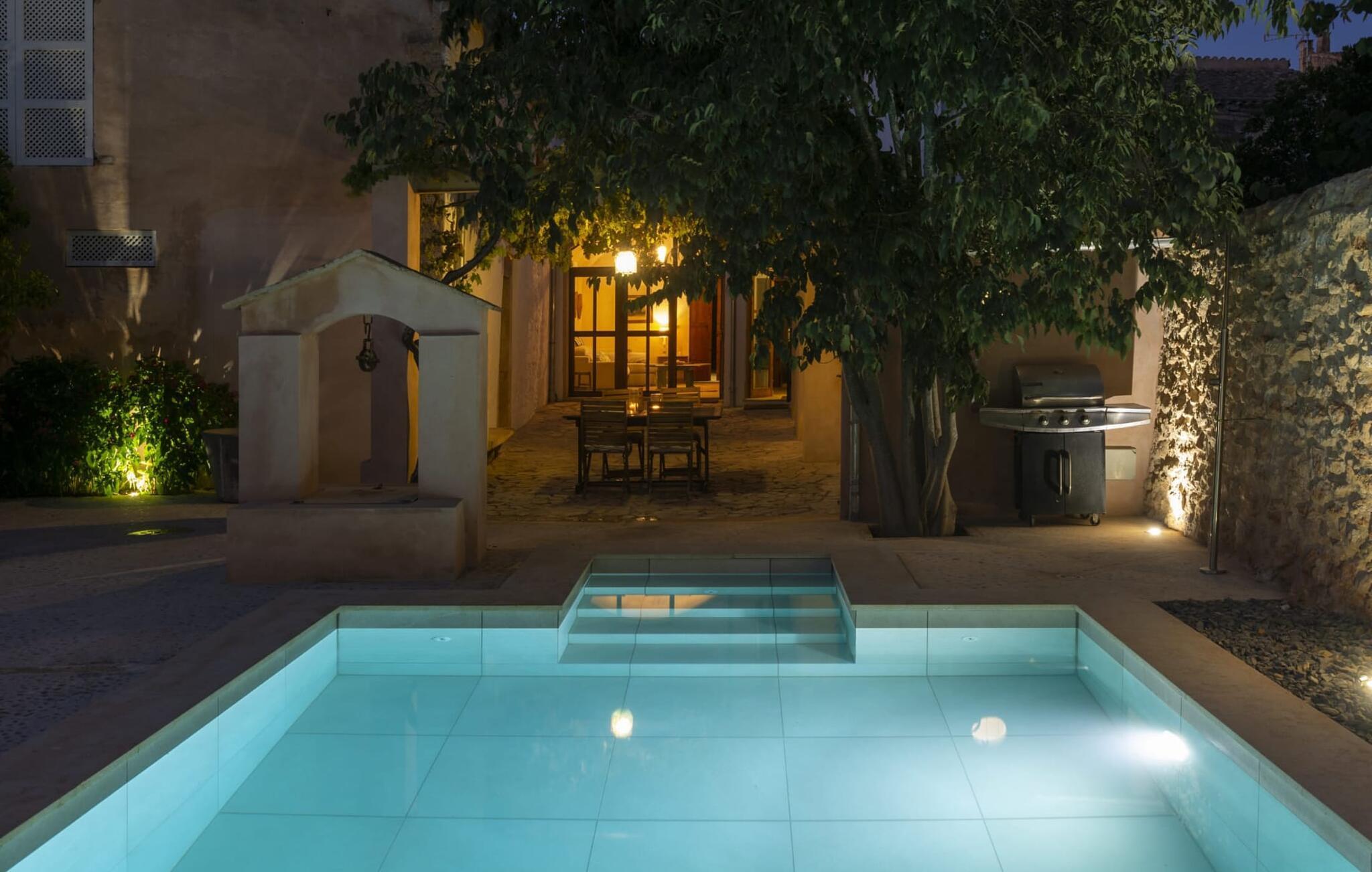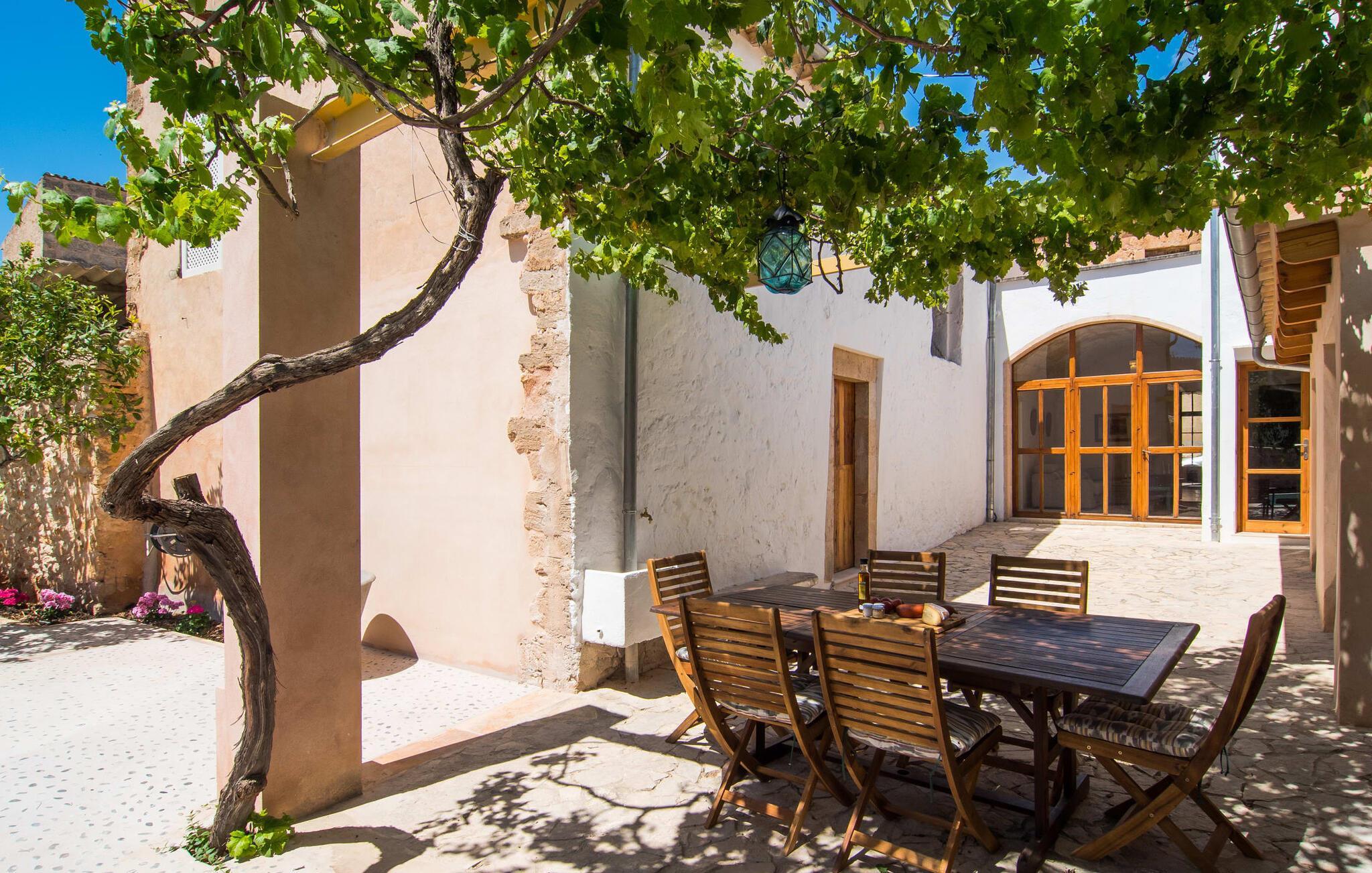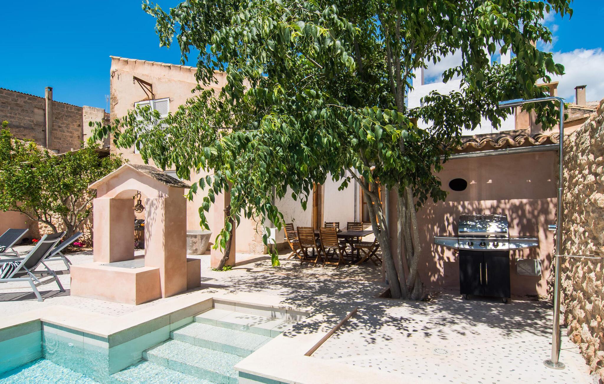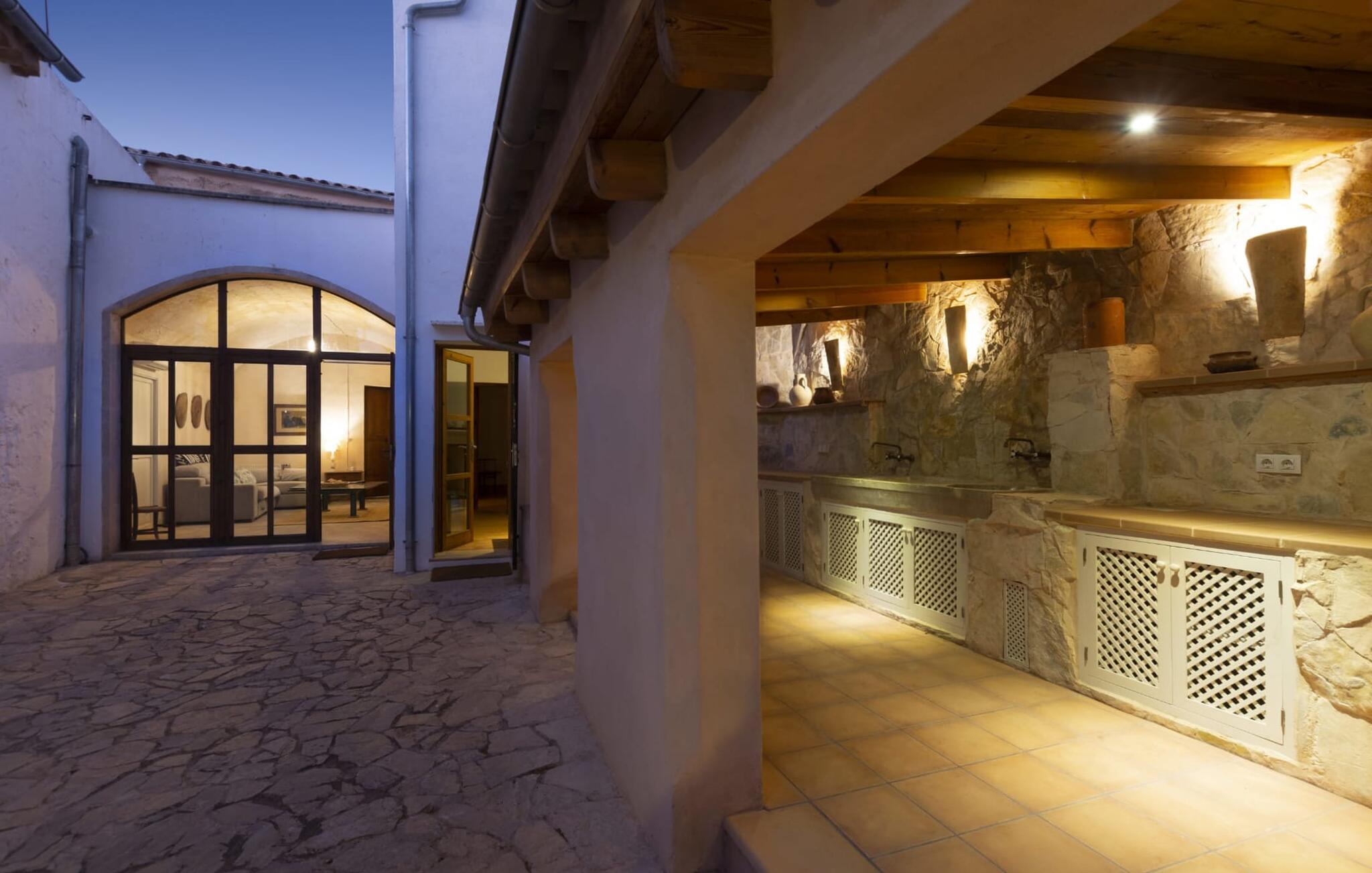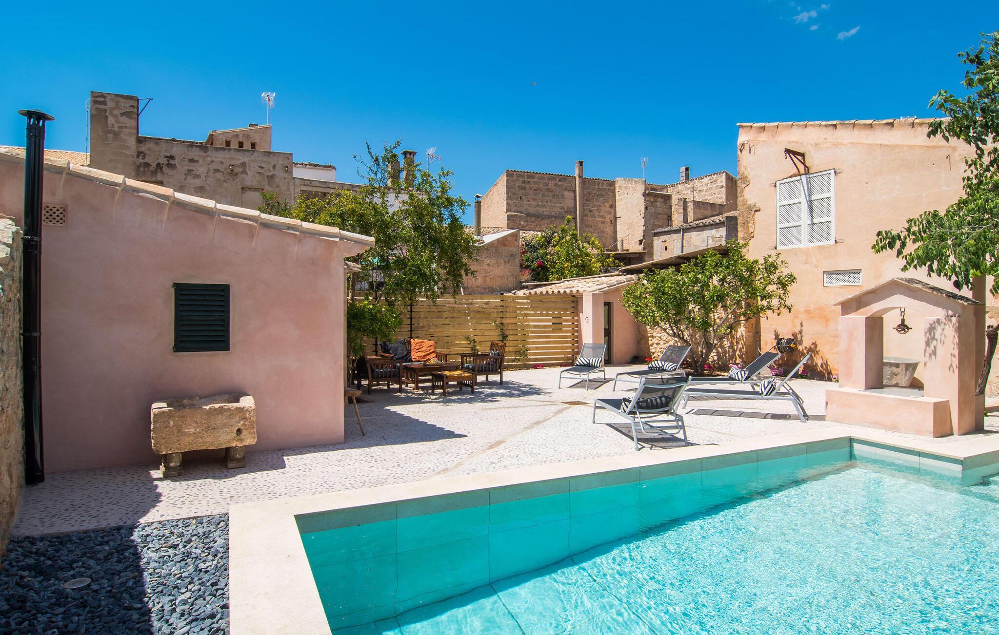 Nyder du at være blandt mennesker, være midt i travlheden, have en hyggelig snak med naboerne og frem for alt nyde godt af en central beliggenhed, der gør, at du kan gøre dine indkøb og restaurantbesøg til fods? Sætter du også pris på en autentisk, traditionel flair og elsker følelsen af, at historien kommer til live, mens du samtidig nyder moderne komfort? Så har du fundet det perfekte feriehus med det smukke rækkehus "Jaume II". Det er beliggende i Llucmajor i det sydlige Mallorca, i et typisk boligområde. Bag huset har du en oase: På ejendommen finder du ikke kun en skrånende pool med liggestole og parasoller, et udendørs badeværelse, et køkken og et brusebad, men også et stort, solrigt terrasseområde med forskellige siddemuligheder, nogle under træer . Lige ved siden af huset står spisebordet, hvor du kan servere grillede lækkerier. Ved siden af poolen, omgivet af naturstensvægge, kan du sætte dig til en siesta på komfortable loungemøbler. Store vinduer slipper lys ind, stemningen er præget af hvælvede stenlofter i nogle rum, mens mørke træbjælker er synlige i andre. Så snart du træder ind i huset, vil du straks føle dig som en spansk konge - antikke møbler, nogle kunstfærdigt udskåret og dekoreret med indlæg, samt oliemalerier i guldrammer udstråler en luksuriøs atmosfære. Trods den til dels historiske indretning fremstår huset ikke gammeldags – tværtimod. Gammelt og nyt er smagfuldt og dygtigt blevet kombineret her. De to badeværelser, for eksempel - et en-suite i stueetagen og et på øverste etage - er meget smarte og moderne og næsten puristisk flisebelagt med natursten. Køkkenet i stueetagen er også bevidst holdt enkelt, en fin kontrast til de gamle, stilrene møbler, der er at finde i de øvrige rum. Der er endda plads til et klaver i det rummelige indgangsparti. Der er også to spisestuer og en stue med en dejlig stor sofa og udsigt udenfor. Der er i alt tre soveværelser i stueetagen og øverste etager, alle med imponerende, næsten majestætiske træsenge, hvoraf det ene endda er udstyret med pejs. Omkring dit hus kan du tage afslappende gåture gennem kvarteret og ind i de landlige omgivelser. Llucmajor, malerisk omgivet af abrikos- og mandellunde, skabte engang et navn for sig selv som et industricenter. Byen blev især berømt for produktion af sko, men den dag i dag er der ikke fokus på turisme – hvilket er en stor del af dens charme. Når du slentrer gennem byens gader, finder du ikke kun alt, hvad du behøver til det daglige liv, men også nogle få historiske bygninger, såsom Placa d'Espanya rådhus, San Miguel kirke fra det 18. århundrede på Placa Santa Catalina Tomas, barokke klosteret San Bonaventura, skomagermonumentet ved den vestlige byport og monumentet til Jaime III. Det ugentlige marked finder sted hver søndag. For en tur til stranden kan du køre 13,7 km til S'Arenal ad vejen, der fra tid til anden kan høres fra dit hus. Fint, hvidt sand, skyggefulde palmer og en livlig promenade venter dig her. "Jaume II", et smukt, historisk og stilfuldt renoveret rækkehus venter dig på den sydlige del af øen. Den centrale beliggenhed gør, at du nemt kan nå butikker og restauranter til fods - og stadig nyde et rummeligt terrasseområde omgivet af rustikke naturstensmure og gamle træer samt en skrånende pool og et udekøkken. Byens centrum ligger kun omkring 1,4 km væk, og den nærmeste strand, S'Arenal, er 13,7 km væk. Dette er et Fincallorca feriehus.