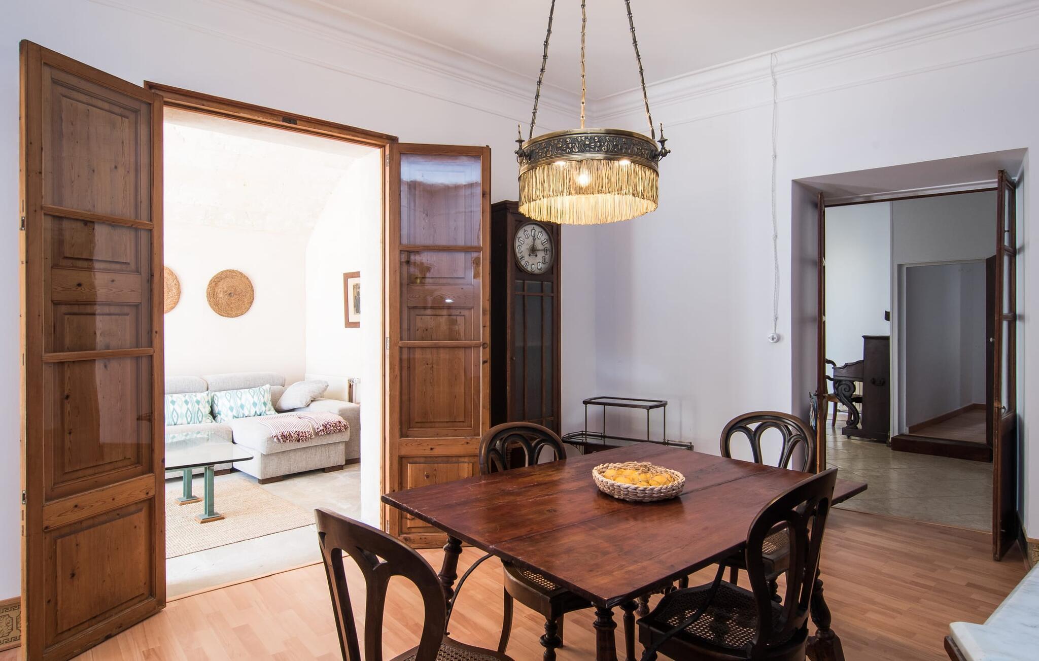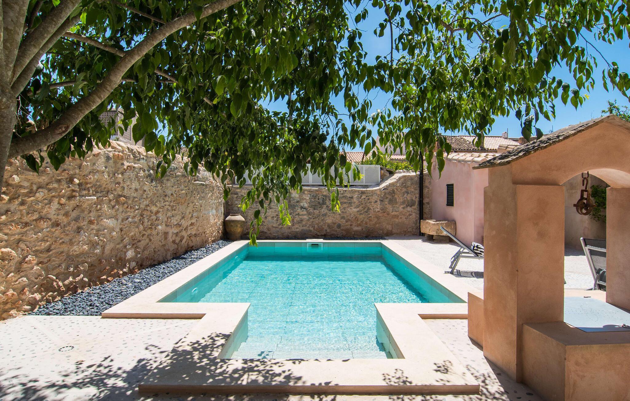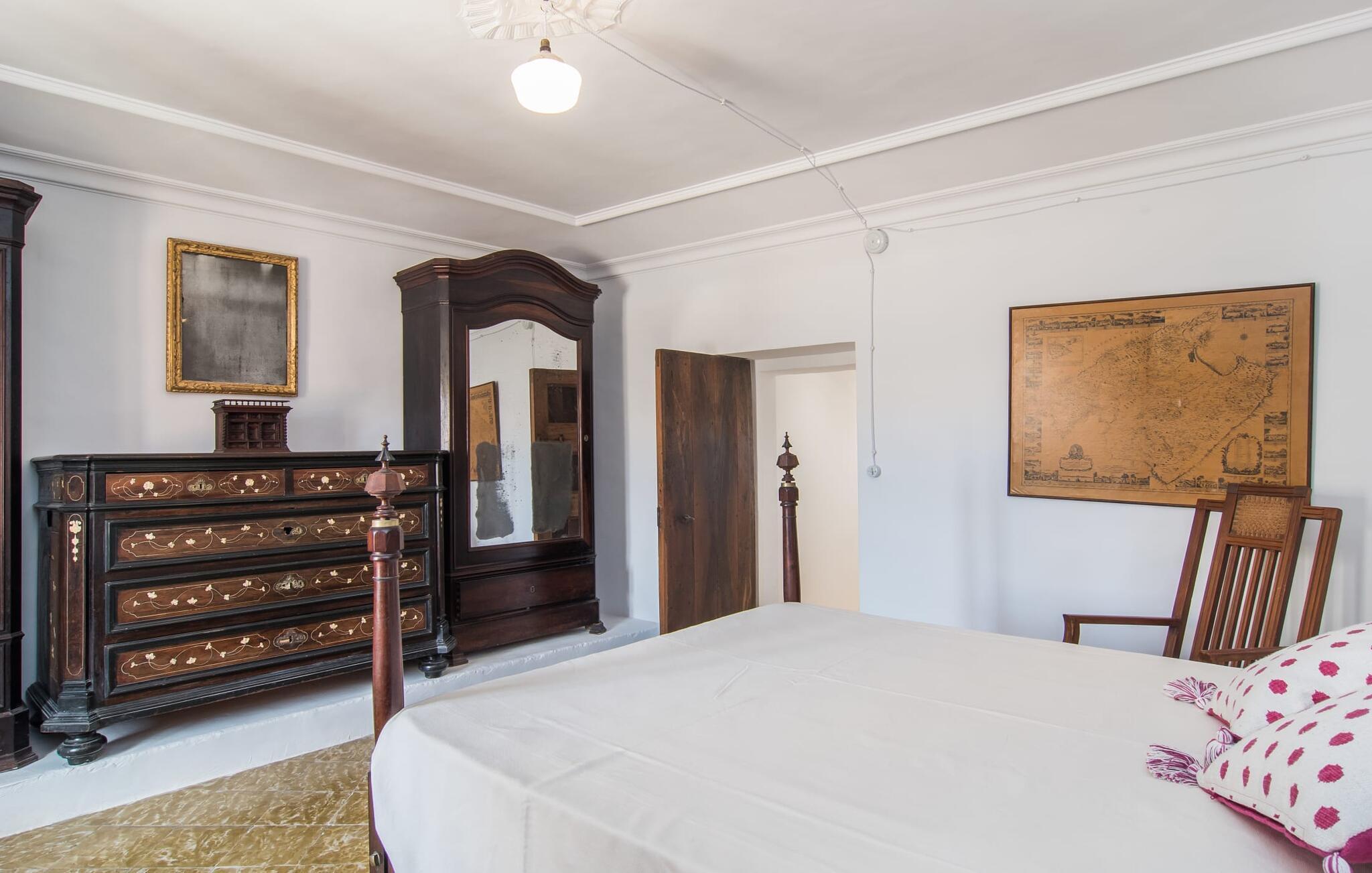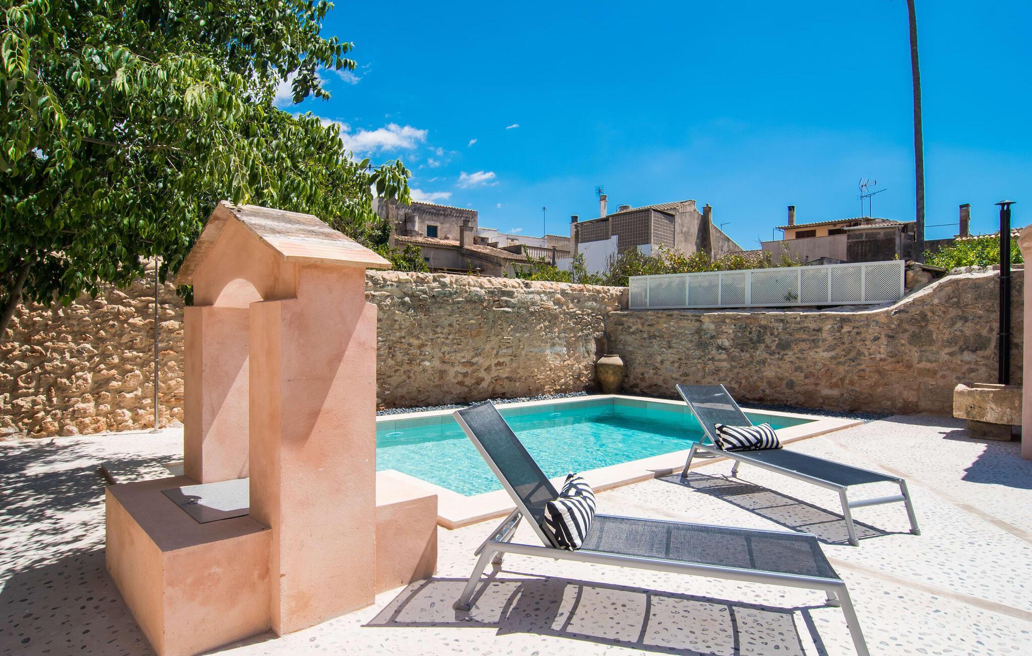 Nyder du at være blandt mennesker, være midt i travlheden, have en hyggelig snak med naboerne og frem for alt nyde godt af en central beliggenhed, der gør, at du kan gøre dine indkøb og restaurantbesøg til fods? Sætter du også pris på en autentisk, traditionel flair og elsker følelsen af, at historien kommer til live, mens du samtidig nyder moderne komfort? Så har du fundet det perfekte feriehus med det smukke rækkehus "Jaume II". Det er beliggende i Llucmajor i det sydlige Mallorca, i et typisk boligområde. Bag huset har du en oase: På ejendommen finder du ikke kun en skrånende pool med liggestole og parasoller, et udendørs badeværelse, et køkken og et brusebad, men også et stort, solrigt terrasseområde med forskellige siddemuligheder, nogle under træer . Lige ved siden af huset står spisebordet, hvor du kan servere grillede lækkerier. Ved siden af poolen, omgivet af naturstensvægge, kan du sætte dig til en siesta på komfortable loungemøbler. Store vinduer slipper lys ind, stemningen er præget af hvælvede stenlofter i nogle rum, mens mørke træbjælker er synlige i andre. Så snart du træder ind i huset, vil du straks føle dig som en spansk konge - antikke møbler, nogle kunstfærdigt udskåret og dekoreret med indlæg, samt oliemalerier i guldrammer udstråler en luksuriøs atmosfære. Trods den til dels historiske indretning fremstår huset ikke gammeldags – tværtimod. Gammelt og nyt er smagfuldt og dygtigt blevet kombineret her. De to badeværelser, for eksempel - et en-suite i stueetagen og et på øverste etage - er meget smarte og moderne og næsten puristisk flisebelagt med natursten. Køkkenet i stueetagen er også bevidst holdt enkelt, en fin kontrast til de gamle, stilrene møbler, der er at finde i de øvrige rum. Der er endda plads til et klaver i det rummelige indgangsparti. Der er også to spisestuer og en stue med en dejlig stor sofa og udsigt udenfor. Der er i alt tre soveværelser i stueetagen og øverste etager, alle med imponerende, næsten majestætiske træsenge, hvoraf det ene endda er udstyret med pejs. Omkring dit hus kan du tage afslappende gåture gennem kvarteret og ind i de landlige omgivelser. Llucmajor, malerisk omgivet af abrikos- og mandellunde, skabte engang et navn for sig selv som et industricenter. Byen blev især berømt for produktion af sko, men den dag i dag er der ikke fokus på turisme – hvilket er en stor del af dens charme. Når du slentrer gennem byens gader, finder du ikke kun alt, hvad du behøver til det daglige liv, men også nogle få historiske bygninger, såsom Placa d'Espanya rådhus, San Miguel kirke fra det 18. århundrede på Placa Santa Catalina Tomas, barokke klosteret San Bonaventura, skomagermonumentet ved den vestlige byport og monumentet til Jaime III. Det ugentlige marked finder sted hver søndag. For en tur til stranden kan du køre 13,7 km til S'Arenal ad vejen, der fra tid til anden kan høres fra dit hus. Fint, hvidt sand, skyggefulde palmer og en livlig promenade venter dig her. "Jaume II", et smukt, historisk og stilfuldt renoveret rækkehus venter dig på den sydlige del af øen. Den centrale beliggenhed gør, at du nemt kan nå butikker og restauranter til fods - og stadig nyde et rummeligt terrasseområde omgivet af rustikke naturstensmure og gamle træer samt en skrånende pool og et udekøkken. Byens centrum ligger kun omkring 1,4 km væk, og den nærmeste strand, S'Arenal, er 13,7 km væk. Dette er et Fincallorca feriehus.