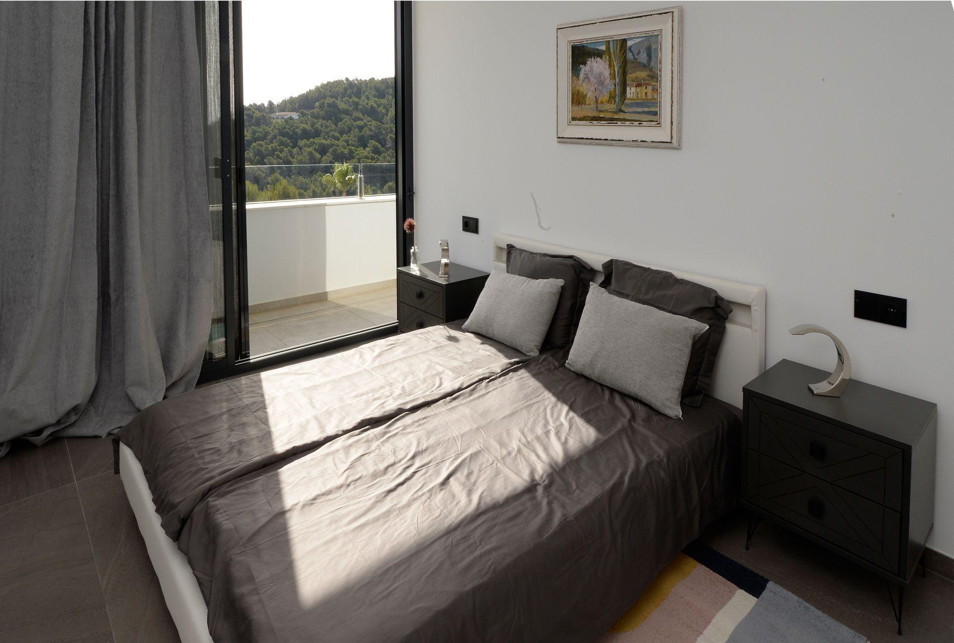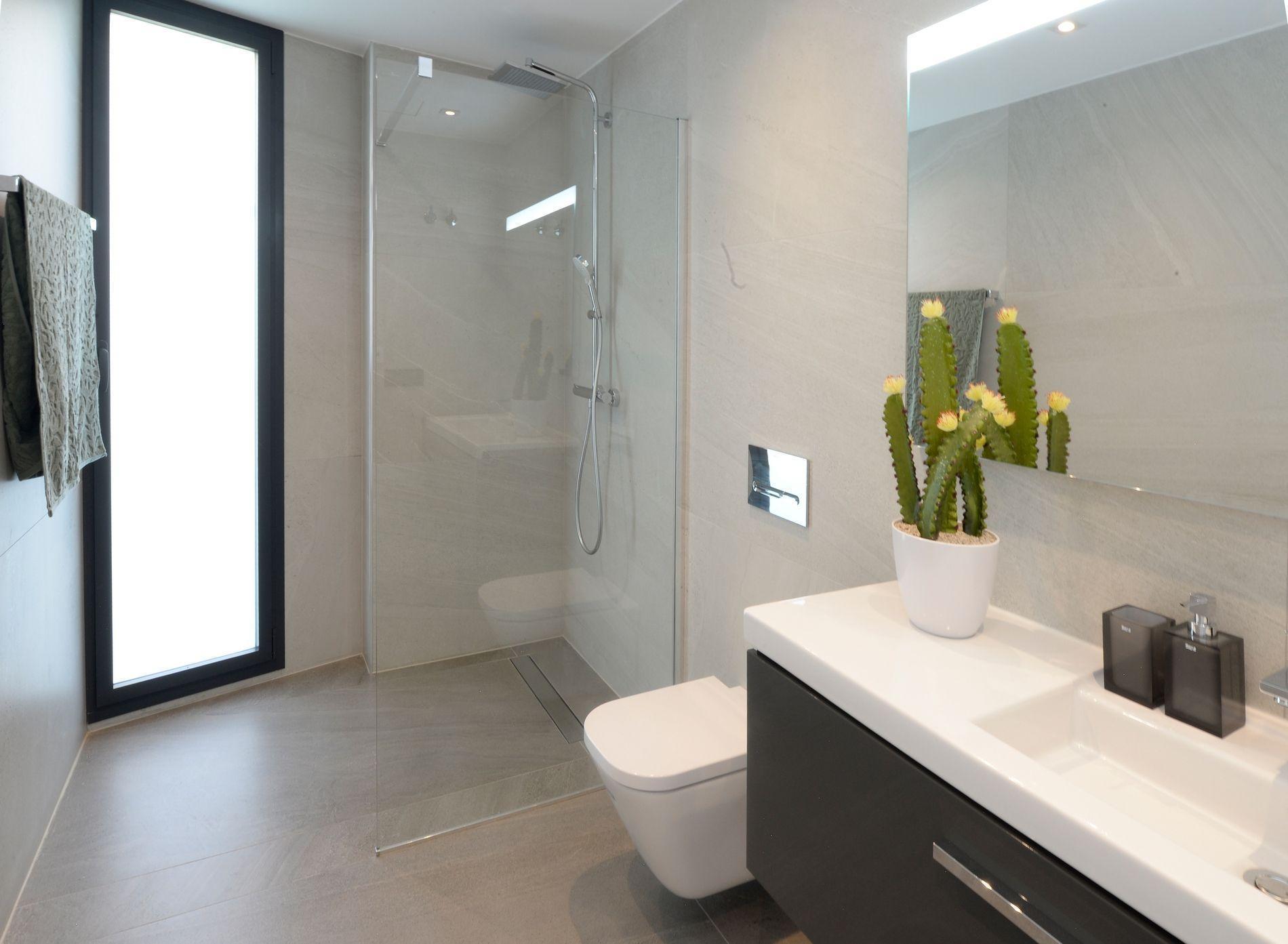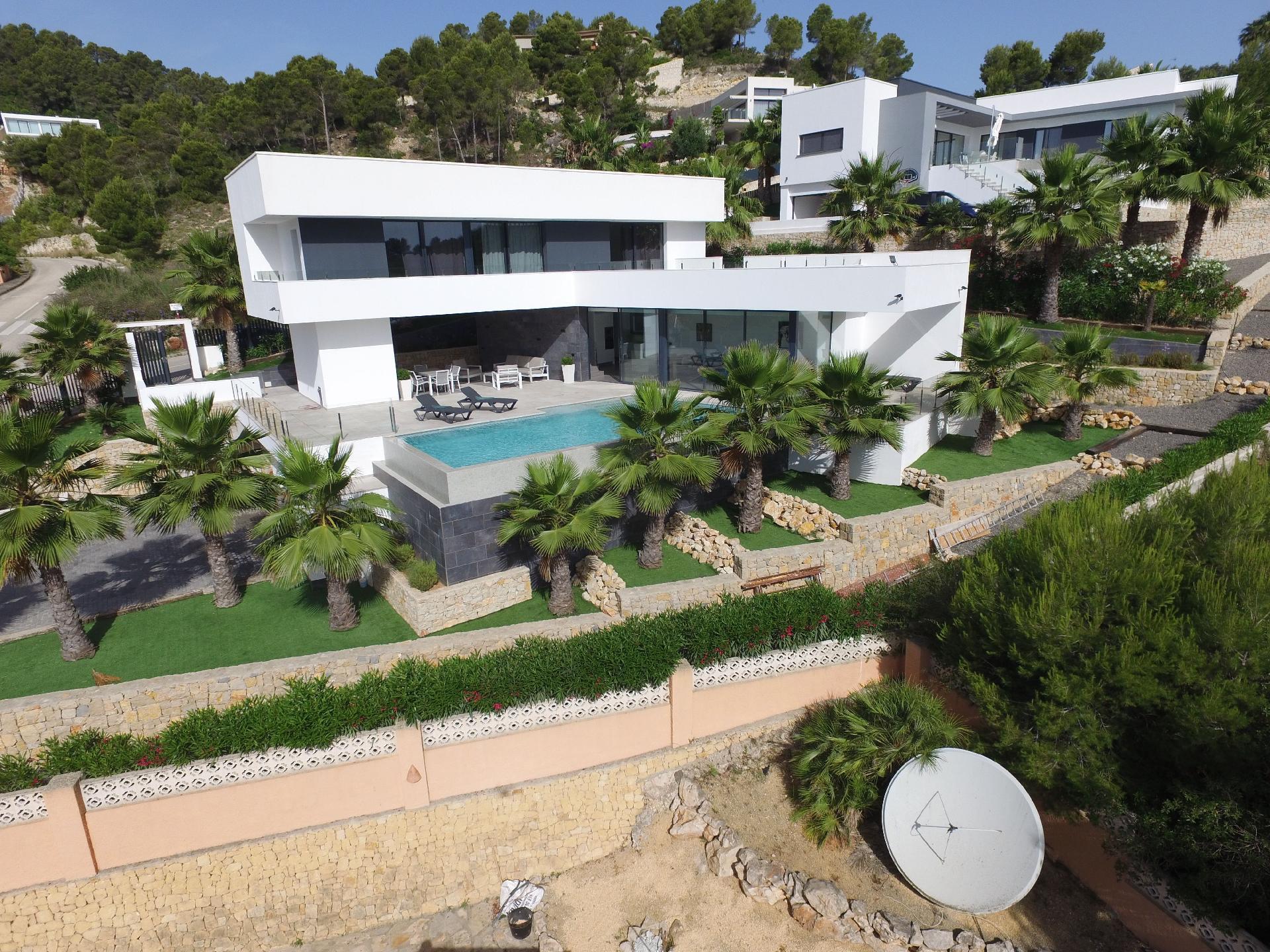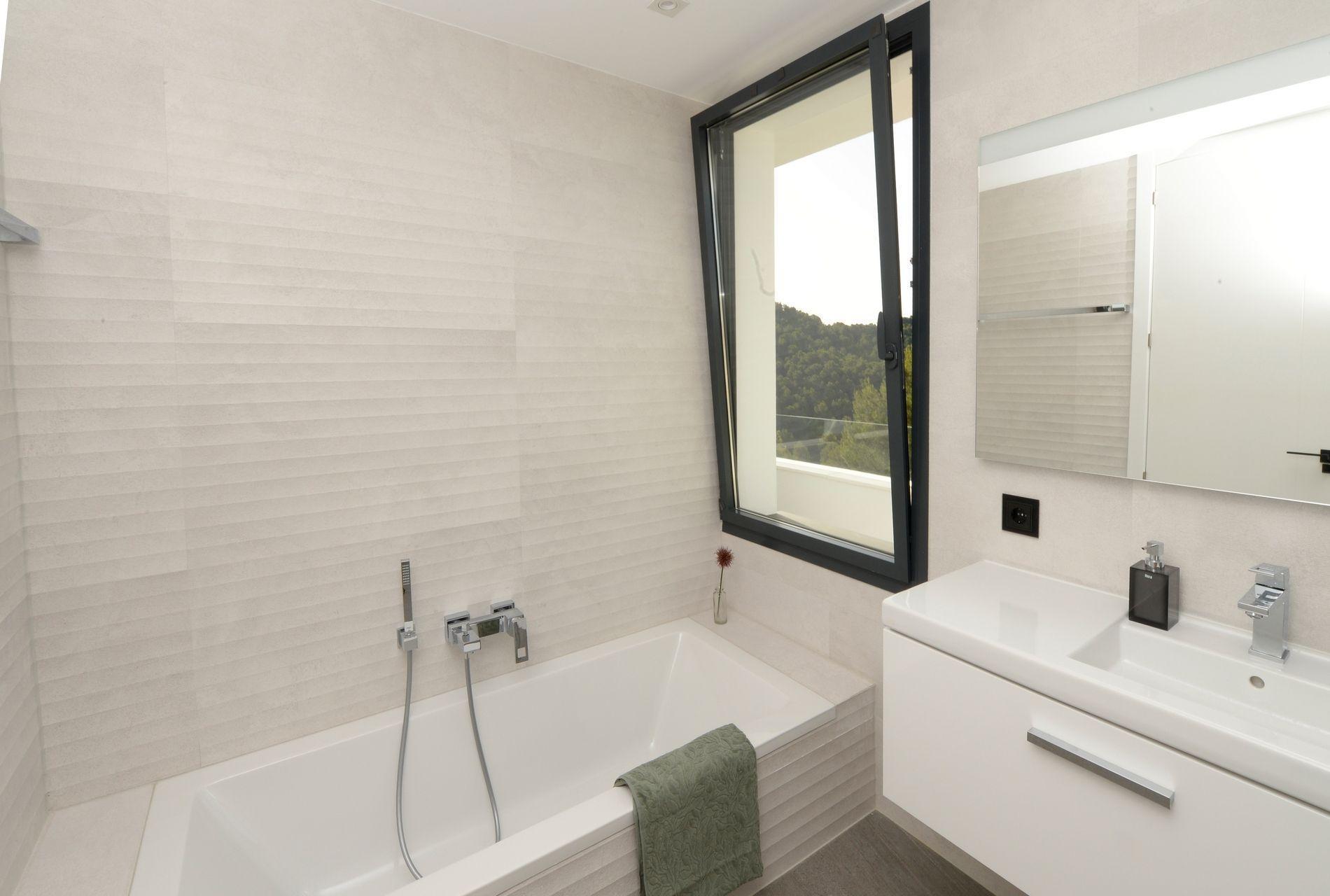 In front of the living room there is a covered terrace and an area with a pergola to have a shady place in the summer months from where you can enjoy the views of the Mediterranean Sea. In the same area there is a BBQ area. On the open pool terrace there is a large pool with an "infinity" effect, wide steps and underwater lighting. On the upper floor there are 3 spacious bedrooms and 2 bathrooms. The master bedroom has an en suite bathroom. All bedrooms have access to the large roof terrace. In the basement there is a double garage with automatic door (of which one garage space is also rented) and a spacious cellar area, as well as the building services. The ground floor is divided into a large living/dining area, American kitchen with adjoining utility room and a guest toilet.