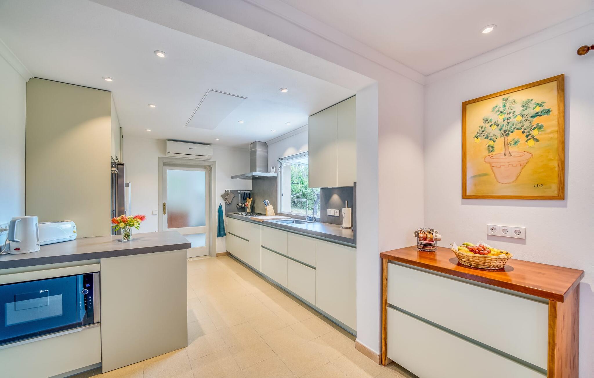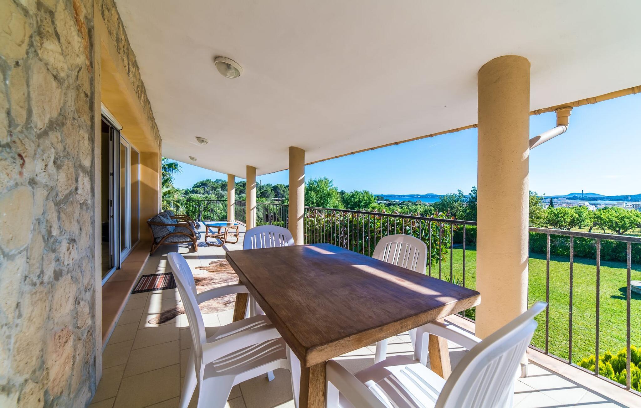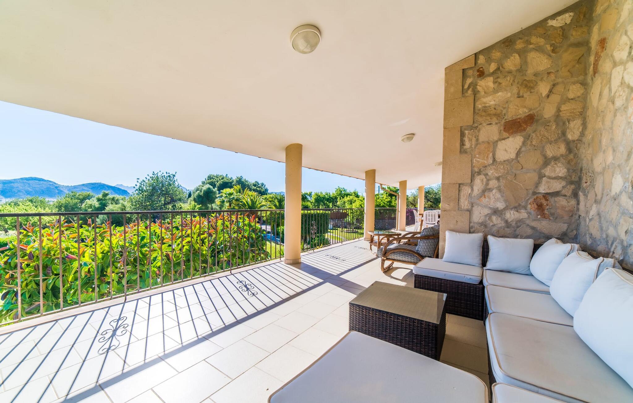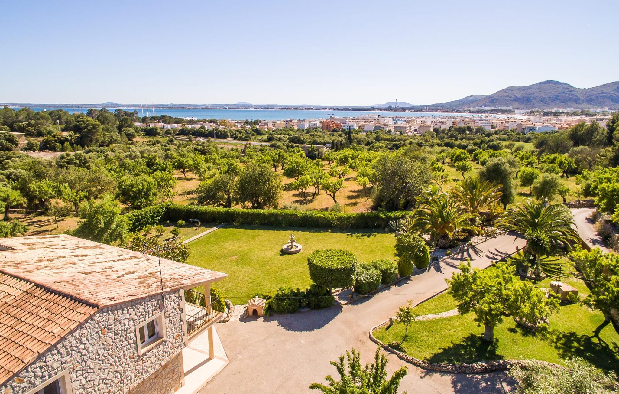 Lang indkørsel, fire parkeringspladser, middelhavsflora: mosaikstenvillaen "Koy" har taget temafarverne grøn, rød og gul til sig, farver, der kan findes i naturen og overalt i denne imponerende ferieejendom. Den velholdte ejendom med sin store græsplæne byder på en række muligheder for sport og leg. En specialdesignet spillebane har et fodboldmål og et tennisnet; Der er også to cykler til rådighed for at udforske. Andre foretrækker måske en drink i galleriet bag søjlerne. Den lange balkon på første sal, med dens vidunderligt komfortable loungeområder, har fået sin del af klapsalver og byder på udsigt fra forreste række - men spillerne nedenfor skal konkurrere mod udsigten over den glitrende bugt og toppene af Tramuntana-bjergene. Og når I virkelig sveder derude, skal I bare hoppe ind i den udendørs bruser og derefter ind i den smukt buede pool på bagsiden af huset; I mellemtiden er der forhåbentlig nogen, der har fyret op i grillen i det overdækkede udekøkken og sat et par ordentlige burgere på grillen (den vegetariske udgave med friske unge grøntsager er også en fornøjelse). Og så leder alle efter et sted at hvile, hvilket ikke burde være et problem med otte liggestole og en grund på over 8.000 m². jeres familiehund er også velkommen; "Johann" ville med glæde lade jer bruge sin kennel til jeres tid her. Har I kun set grønt før? Så følg os nu ind i det ekstremt familievenlige interiør! Røde gardiner, puder og bordløbere sætter dynamiske accenter mod den varme gule på væggene. Hvis det ikke bringer lidt solskin ind i huset... I stueetagen dominerer det rustikke køkken med opvaskemaskine og en tilstødende spisestue indgangspartiet og giver mulighed for at lukke den duftende luft ind fra haven; Et par tulipaner pynter op i soveværelset hernede, som har eget brusebad og fuldender stueetagen. Der er også vaskemaskine til fodboldtrøjer i bryggerset. På øverste etage finder I yderligere tre "drømmesteder" (herunder et hyggeligt værelse med to senge, perfekt til børn), et badeværelse med badekar og bruser og panorama-stuen på første sal med store skydedøre til terrassen; Med sådan en imponerende udsigt fra loungebalkonen må fjernsynet nøjes med sin substituerende rolle. Og da farverige sommerfugle elsker at flyve, er et af dobbeltværelserne med adgang til det fri bestemt i høj kurs. Man kan vel ikke opfylde alles ønsker? Børnene vil gerne til stranden (selvfølgelig), far er en ivrig golfspiller, og mor vil virkelig gerne tage sine vandresko på. Er der ikke en hyggelig lille by i nærheden, som alle kan besøge? Hvordan skal I glæde alle denne ferie? Ningún problem for villa "Koy": Ma-3460 (nogle gange hørbar) tager jer, hvorhen I vil... Den lille strand Cala Ponset med dens let skrånende kyst og stenstranden i Alcanada (nær golfbanen) med udsigt af øen og fyrtårnet af samme navn er blot to af de utallige strande langs den kilometerlange Alcúdia-bugt; Alcúdias snoede bymidte byder på isbarer, caféer og restauranter, og i Pollença, kun 13 km væk, byder en vandretur op ad Puig de Maria på en vidunderlig udsigt over Formentor-halvøens særegne bakkede landskab. "Koy" kunne gøre hele familien glad! I nærheden af Port d'Alcúdia-bugten, mellem Alcúdia og Alcanada, ser den lidt forhøjede, familievenlige villa "Koy" ud over havet fra balkonen på øverste etage. Der er kun få minutter på cykel til havnen, talrige butikker, en bank, restauranter og udendørscaféer, alt inden for 3 km. Andre positive punkter omfatter nærheden til Alcanada Golf Club, den hurtige adgang til stranden og de fremragende vandrestier, der strækker sig fra Pollença over La Victoria-halvøen.