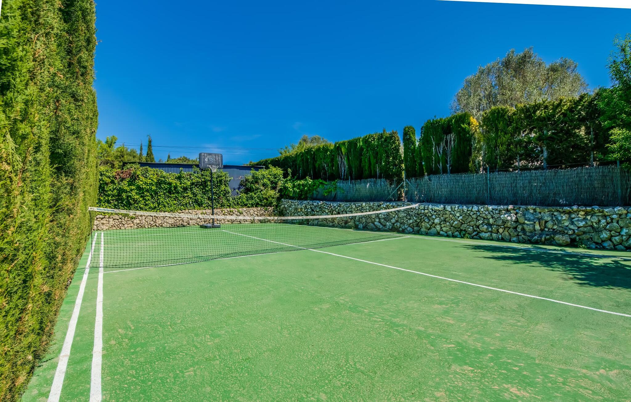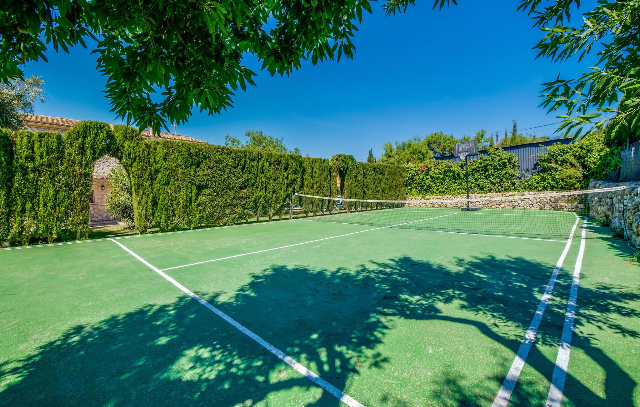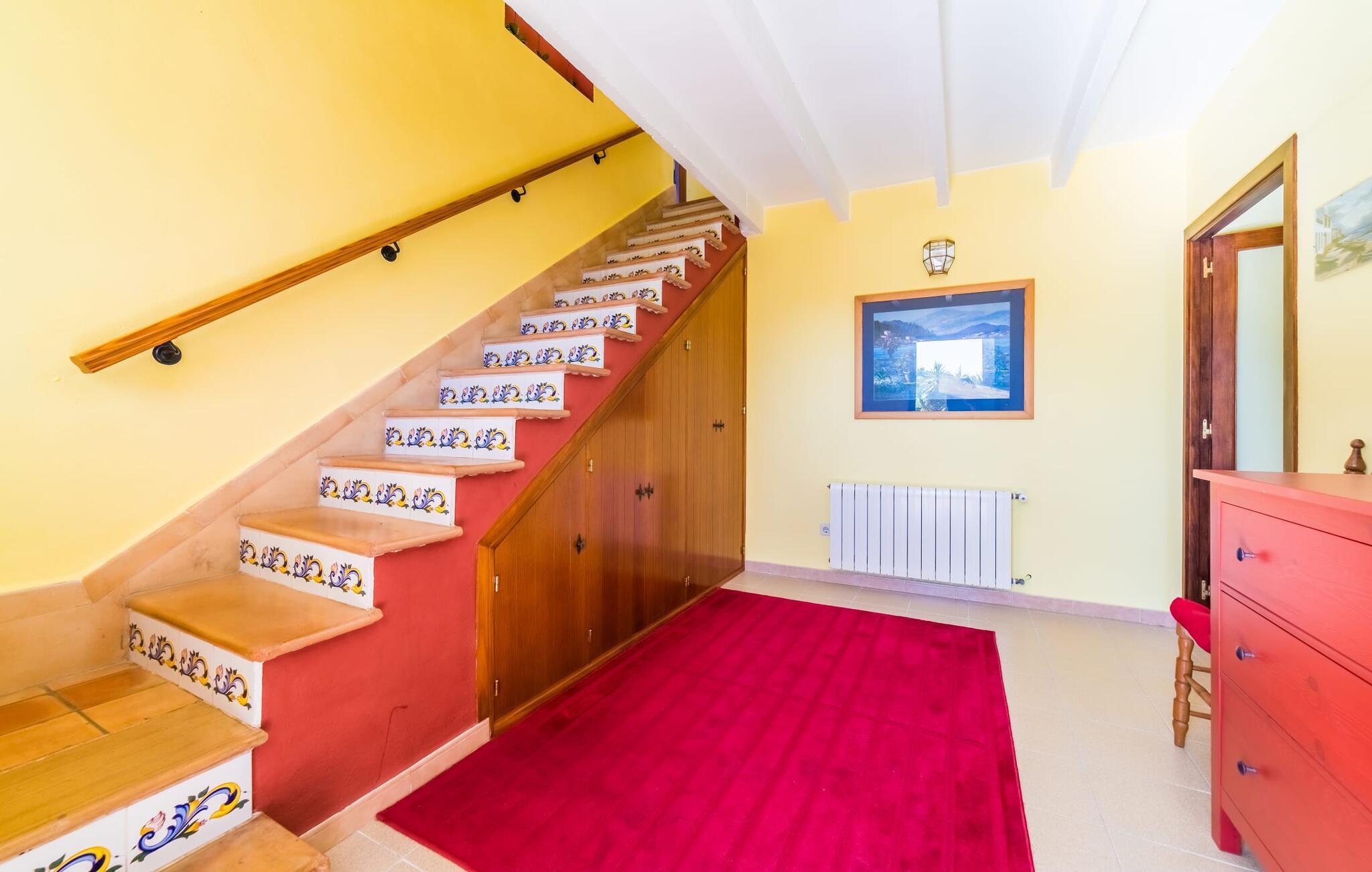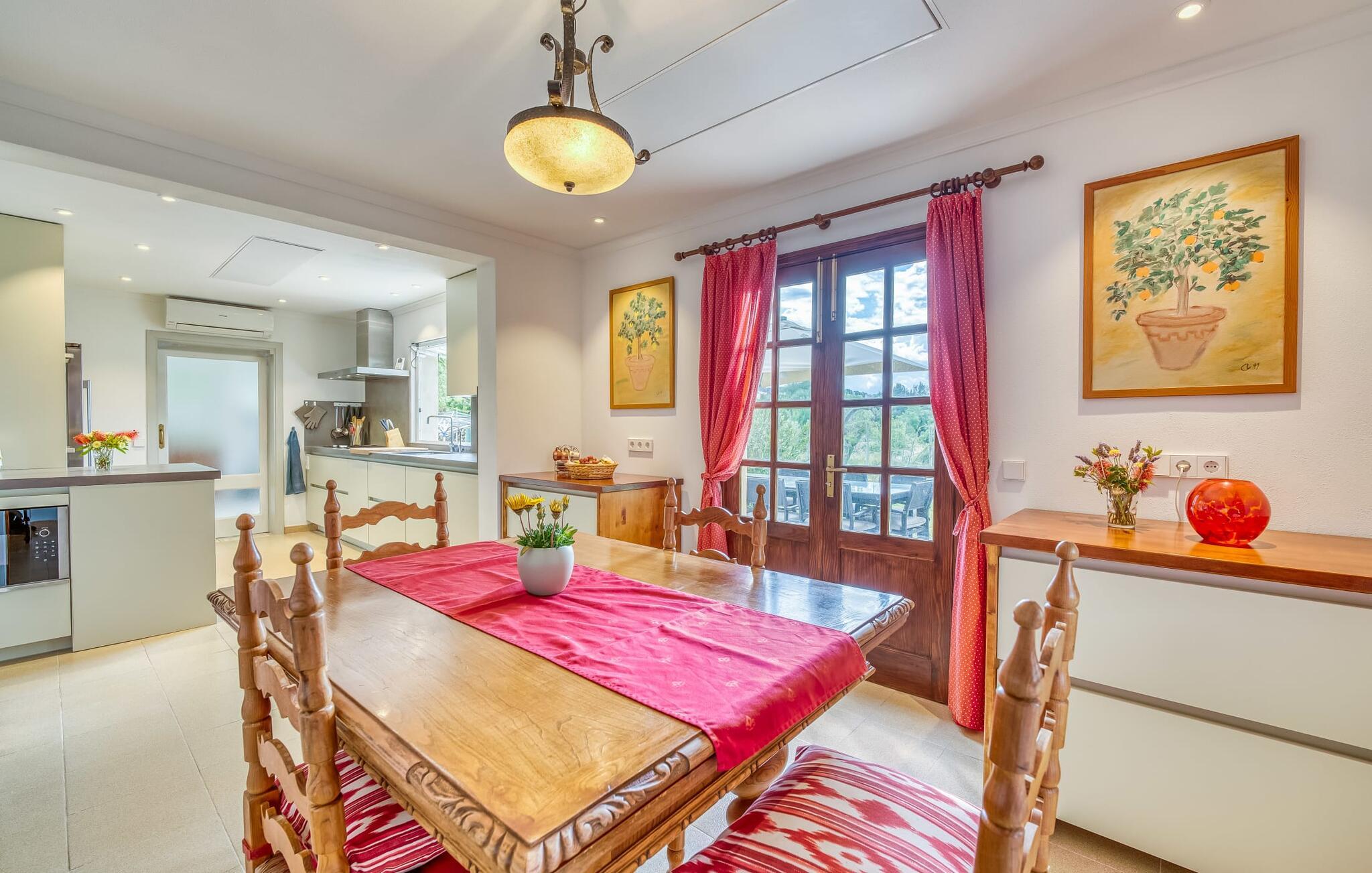 Lang indkørsel, fire parkeringspladser, middelhavsflora: mosaikstenvillaen "Koy" har taget temafarverne grøn, rød og gul til sig, farver, der kan findes i naturen og overalt i denne imponerende ferieejendom. Den velholdte ejendom med sin store græsplæne byder på en række muligheder for sport og leg. En specialdesignet spillebane har et fodboldmål og et tennisnet; Der er også to cykler til rådighed for at udforske. Andre foretrækker måske en drink i galleriet bag søjlerne. Den lange balkon på første sal, med dens vidunderligt komfortable loungeområder, har fået sin del af klapsalver og byder på udsigt fra forreste række - men spillerne nedenfor skal konkurrere mod udsigten over den glitrende bugt og toppene af Tramuntana-bjergene. Og når I virkelig sveder derude, skal I bare hoppe ind i den udendørs bruser og derefter ind i den smukt buede pool på bagsiden af huset; I mellemtiden er der forhåbentlig nogen, der har fyret op i grillen i det overdækkede udekøkken og sat et par ordentlige burgere på grillen (den vegetariske udgave med friske unge grøntsager er også en fornøjelse). Og så leder alle efter et sted at hvile, hvilket ikke burde være et problem med otte liggestole og en grund på over 8.000 m². jeres familiehund er også velkommen; "Johann" ville med glæde lade jer bruge sin kennel til jeres tid her. Har I kun set grønt før? Så følg os nu ind i det ekstremt familievenlige interiør! Røde gardiner, puder og bordløbere sætter dynamiske accenter mod den varme gule på væggene. Hvis det ikke bringer lidt solskin ind i huset... I stueetagen dominerer det rustikke køkken med opvaskemaskine og en tilstødende spisestue indgangspartiet og giver mulighed for at lukke den duftende luft ind fra haven; Et par tulipaner pynter op i soveværelset hernede, som har eget brusebad og fuldender stueetagen. Der er også vaskemaskine til fodboldtrøjer i bryggerset. På øverste etage finder I yderligere tre "drømmesteder" (herunder et hyggeligt værelse med to senge, perfekt til børn), et badeværelse med badekar og bruser og panorama-stuen på første sal med store skydedøre til terrassen; Med sådan en imponerende udsigt fra loungebalkonen må fjernsynet nøjes med sin substituerende rolle. Og da farverige sommerfugle elsker at flyve, er et af dobbeltværelserne med adgang til det fri bestemt i høj kurs. Man kan vel ikke opfylde alles ønsker? Børnene vil gerne til stranden (selvfølgelig), far er en ivrig golfspiller, og mor vil virkelig gerne tage sine vandresko på. Er der ikke en hyggelig lille by i nærheden, som alle kan besøge? Hvordan skal I glæde alle denne ferie? Ningún problem for villa "Koy": Ma-3460 (nogle gange hørbar) tager jer, hvorhen I vil... Den lille strand Cala Ponset med dens let skrånende kyst og stenstranden i Alcanada (nær golfbanen) med udsigt af øen og fyrtårnet af samme navn er blot to af de utallige strande langs den kilometerlange Alcúdia-bugt; Alcúdias snoede bymidte byder på isbarer, caféer og restauranter, og i Pollença, kun 13 km væk, byder en vandretur op ad Puig de Maria på en vidunderlig udsigt over Formentor-halvøens særegne bakkede landskab. "Koy" kunne gøre hele familien glad! I nærheden af Port d'Alcúdia-bugten, mellem Alcúdia og Alcanada, ser den lidt forhøjede, familievenlige villa "Koy" ud over havet fra balkonen på øverste etage. Der er kun få minutter på cykel til havnen, talrige butikker, en bank, restauranter og udendørscaféer, alt inden for 3 km. Andre positive punkter omfatter nærheden til Alcanada Golf Club, den hurtige adgang til stranden og de fremragende vandrestier, der strækker sig fra Pollença over La Victoria-halvøen.