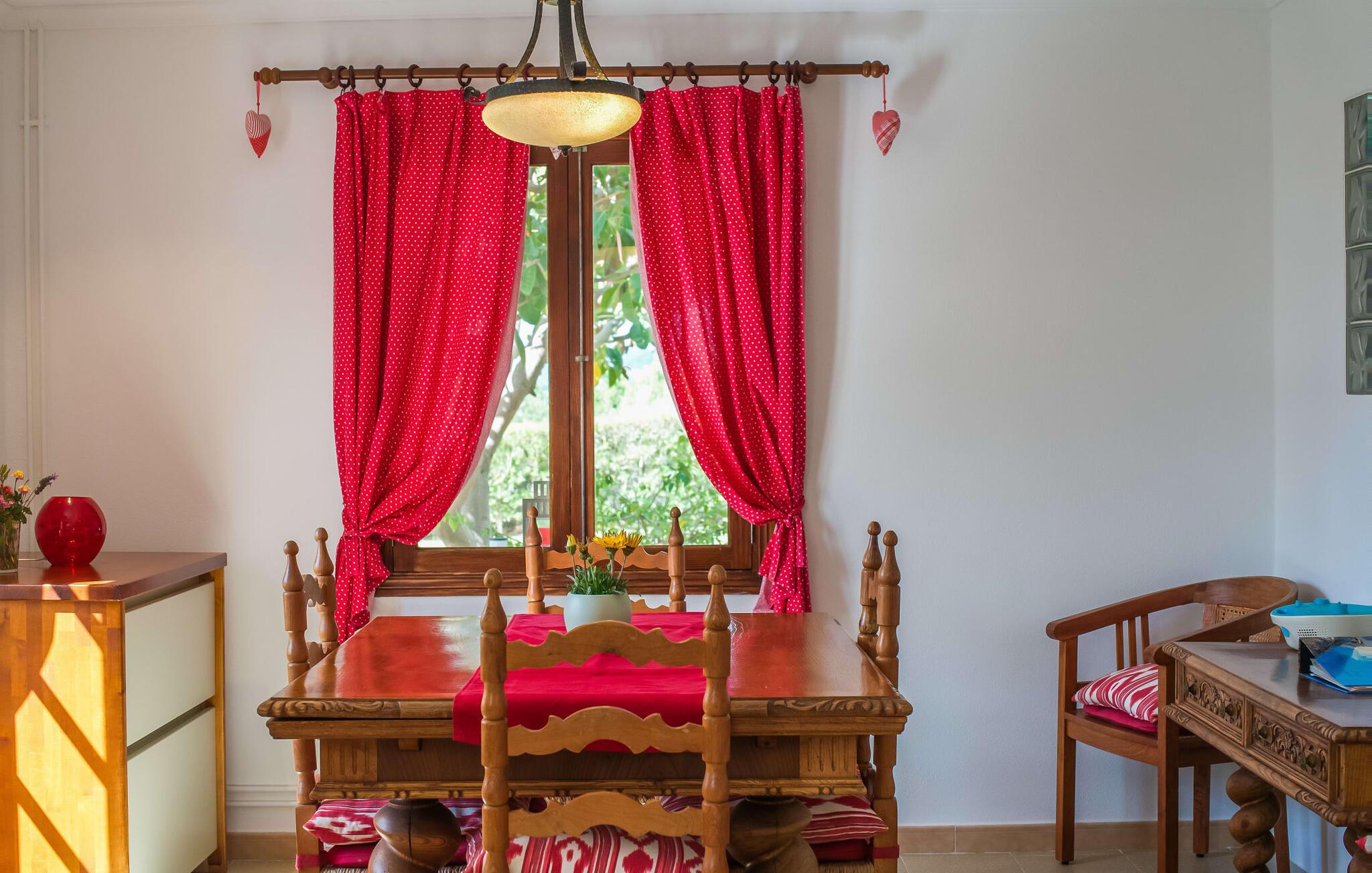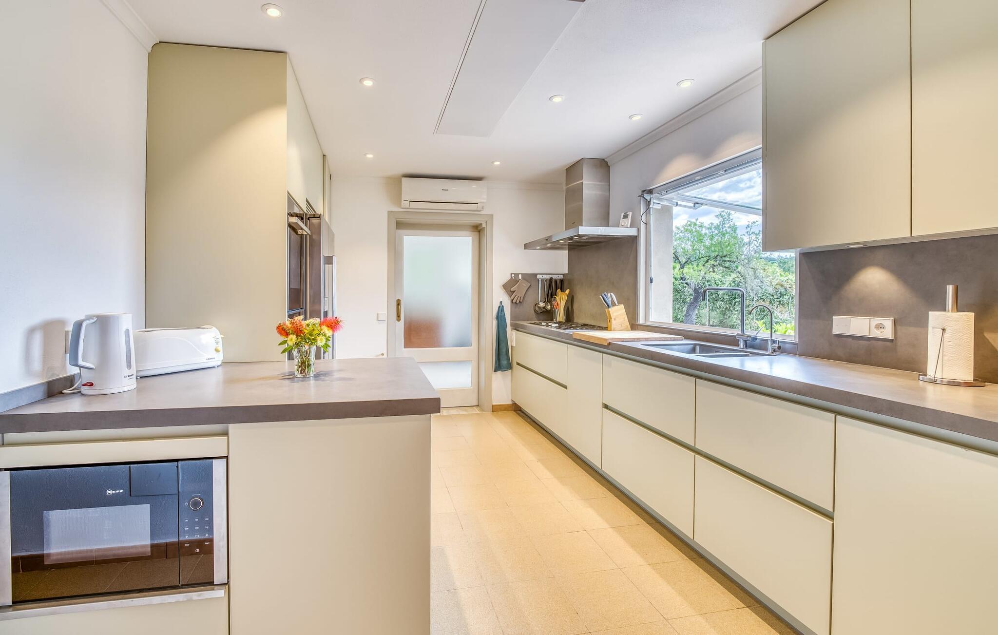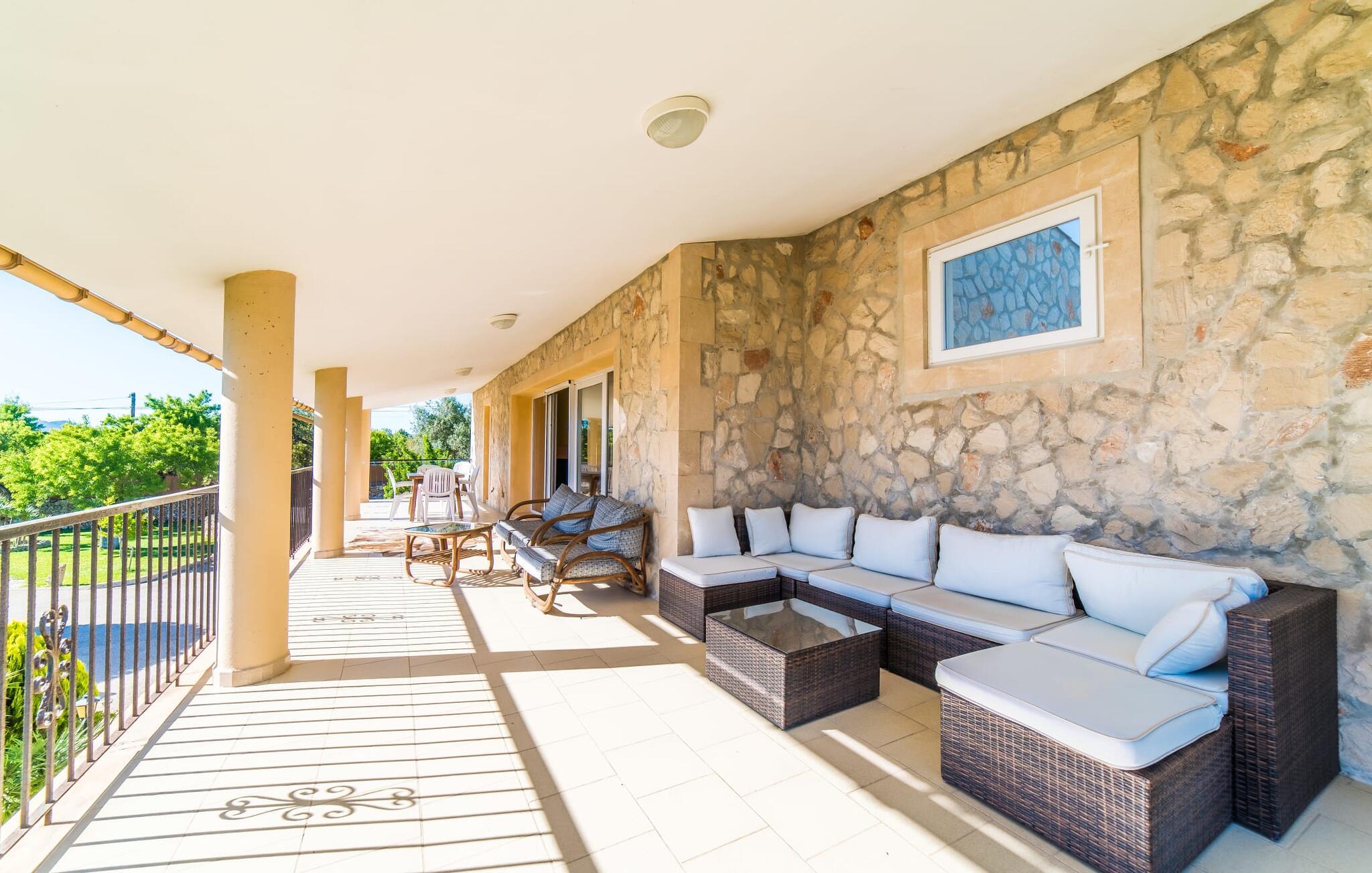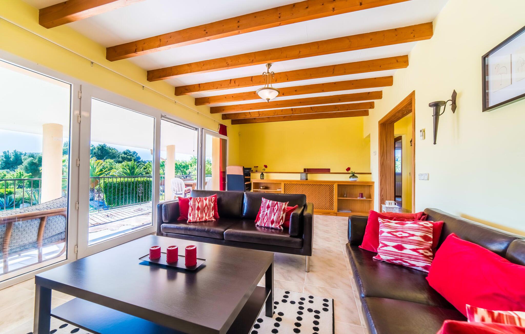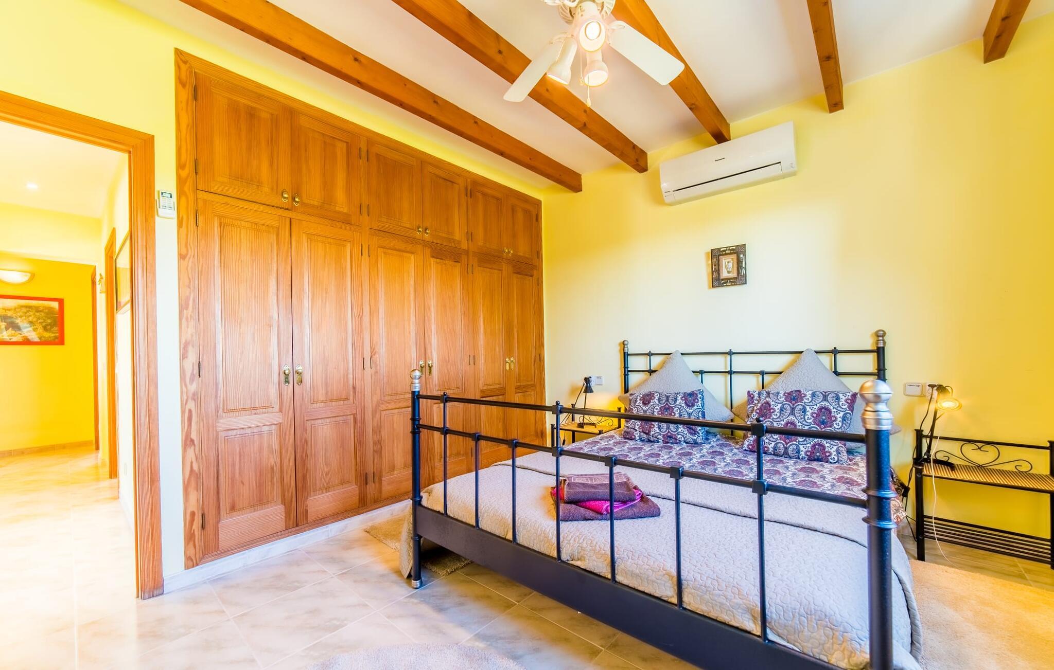 Lang indkørsel, fire parkeringspladser, middelhavsflora: mosaikstenvillaen "Koy" har taget temafarverne grøn, rød og gul til sig, farver, der kan findes i naturen og overalt i denne imponerende ferieejendom. Den velholdte ejendom med sin store græsplæne byder på en række muligheder for sport og leg. En specialdesignet spillebane har et fodboldmål og et tennisnet; Der er også to cykler til rådighed for at udforske. Andre foretrækker måske en drink i galleriet bag søjlerne. Den lange balkon på første sal, med dens vidunderligt komfortable loungeområder, har fået sin del af klapsalver og byder på udsigt fra forreste række - men spillerne nedenfor skal konkurrere mod udsigten over den glitrende bugt og toppene af Tramuntana-bjergene. Og når I virkelig sveder derude, skal I bare hoppe ind i den udendørs bruser og derefter ind i den smukt buede pool på bagsiden af huset; I mellemtiden er der forhåbentlig nogen, der har fyret op i grillen i det overdækkede udekøkken og sat et par ordentlige burgere på grillen (den vegetariske udgave med friske unge grøntsager er også en fornøjelse). Og så leder alle efter et sted at hvile, hvilket ikke burde være et problem med otte liggestole og en grund på over 8.000 m². jeres familiehund er også velkommen; "Johann" ville med glæde lade jer bruge sin kennel til jeres tid her. Har I kun set grønt før? Så følg os nu ind i det ekstremt familievenlige interiør! Røde gardiner, puder og bordløbere sætter dynamiske accenter mod den varme gule på væggene. Hvis det ikke bringer lidt solskin ind i huset... I stueetagen dominerer det rustikke køkken med opvaskemaskine og en tilstødende spisestue indgangspartiet og giver mulighed for at lukke den duftende luft ind fra haven; Et par tulipaner pynter op i soveværelset hernede, som har eget brusebad og fuldender stueetagen. Der er også vaskemaskine til fodboldtrøjer i bryggerset. På øverste etage finder I yderligere tre "drømmesteder" (herunder et hyggeligt værelse med to senge, perfekt til børn), et badeværelse med badekar og bruser og panorama-stuen på første sal med store skydedøre til terrassen; Med sådan en imponerende udsigt fra loungebalkonen må fjernsynet nøjes med sin substituerende rolle. Og da farverige sommerfugle elsker at flyve, er et af dobbeltværelserne med adgang til det fri bestemt i høj kurs. Man kan vel ikke opfylde alles ønsker? Børnene vil gerne til stranden (selvfølgelig), far er en ivrig golfspiller, og mor vil virkelig gerne tage sine vandresko på. Er der ikke en hyggelig lille by i nærheden, som alle kan besøge? Hvordan skal I glæde alle denne ferie? Ningún problem for villa "Koy": Ma-3460 (nogle gange hørbar) tager jer, hvorhen I vil... Den lille strand Cala Ponset med dens let skrånende kyst og stenstranden i Alcanada (nær golfbanen) med udsigt af øen og fyrtårnet af samme navn er blot to af de utallige strande langs den kilometerlange Alcúdia-bugt; Alcúdias snoede bymidte byder på isbarer, caféer og restauranter, og i Pollença, kun 13 km væk, byder en vandretur op ad Puig de Maria på en vidunderlig udsigt over Formentor-halvøens særegne bakkede landskab. "Koy" kunne gøre hele familien glad! I nærheden af Port d'Alcúdia-bugten, mellem Alcúdia og Alcanada, ser den lidt forhøjede, familievenlige villa "Koy" ud over havet fra balkonen på øverste etage. Der er kun få minutter på cykel til havnen, talrige butikker, en bank, restauranter og udendørscaféer, alt inden for 3 km. Andre positive punkter omfatter nærheden til Alcanada Golf Club, den hurtige adgang til stranden og de fremragende vandrestier, der strækker sig fra Pollença over La Victoria-halvøen.
