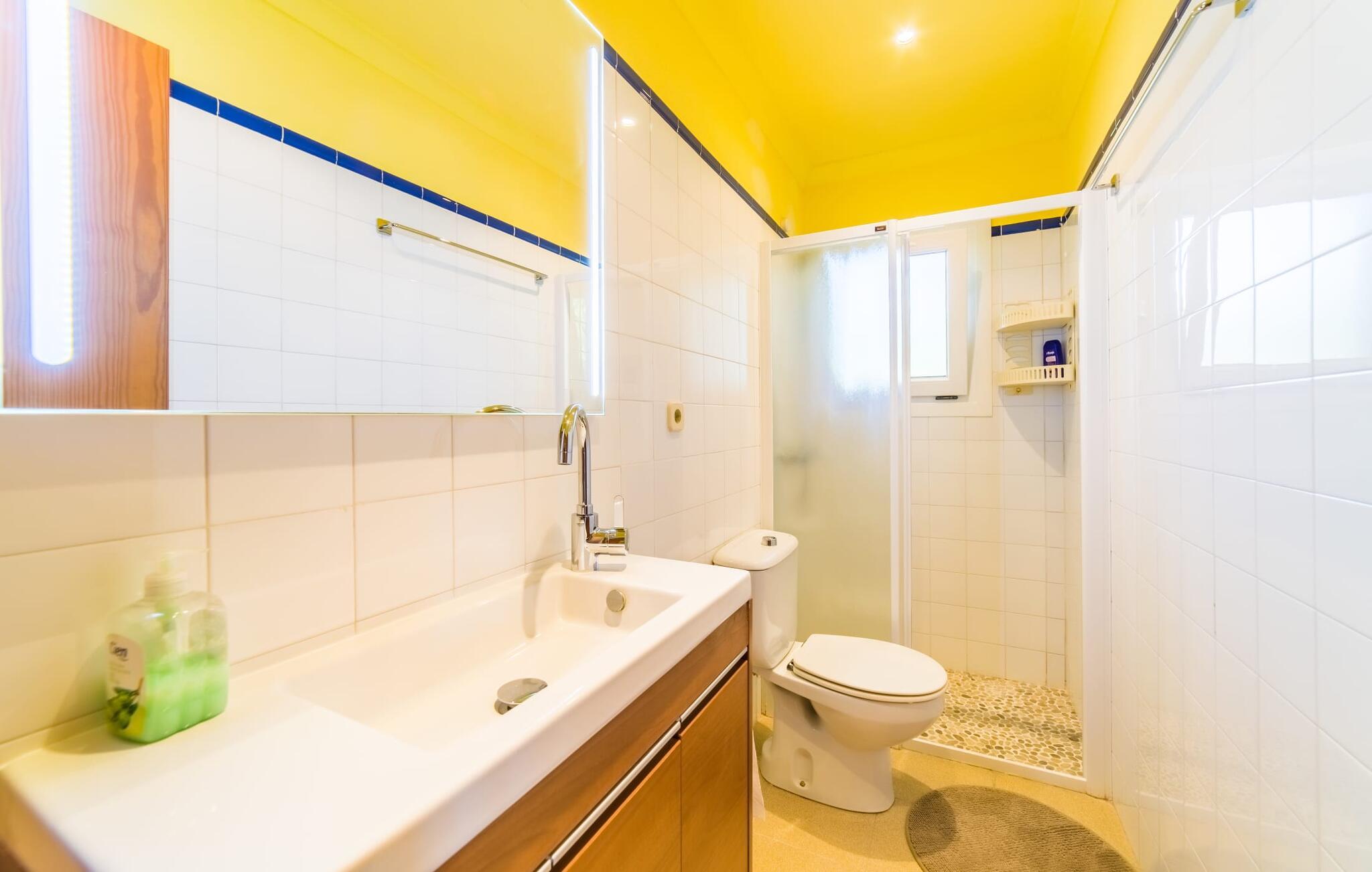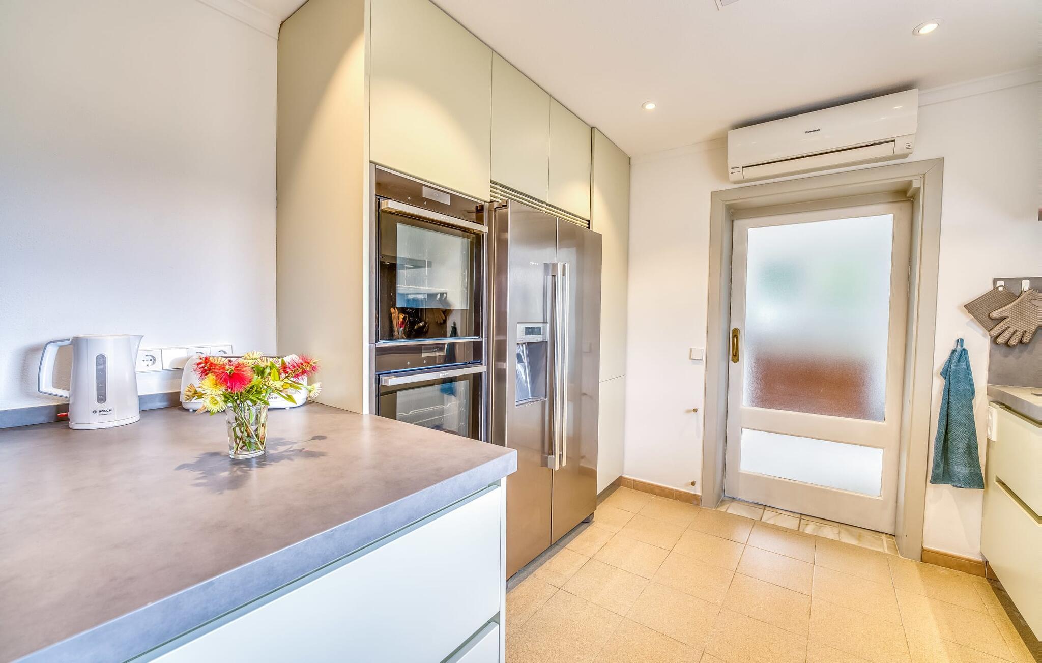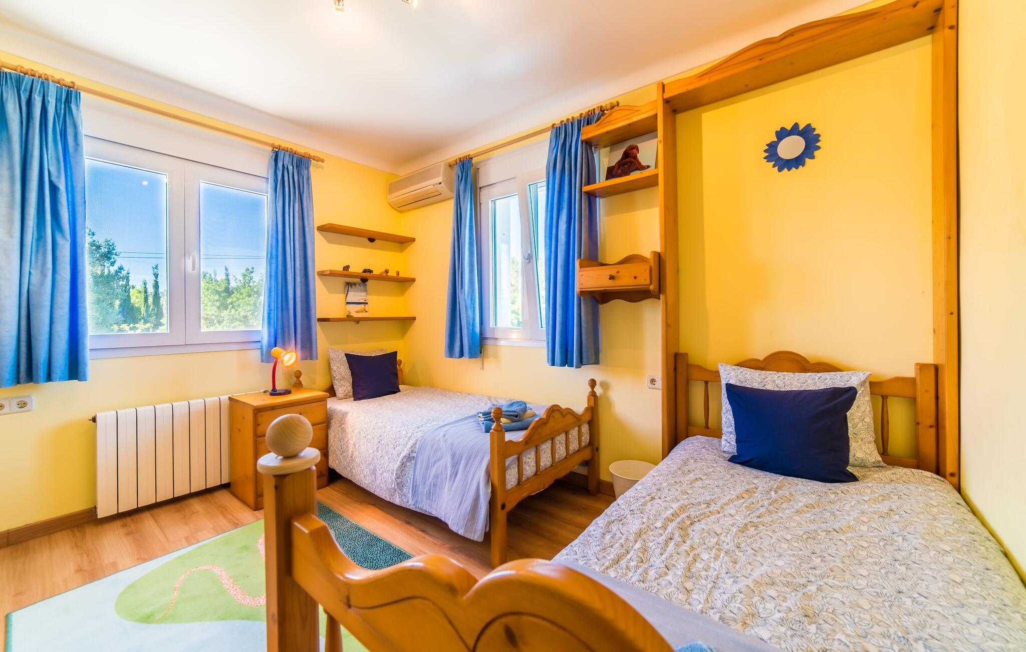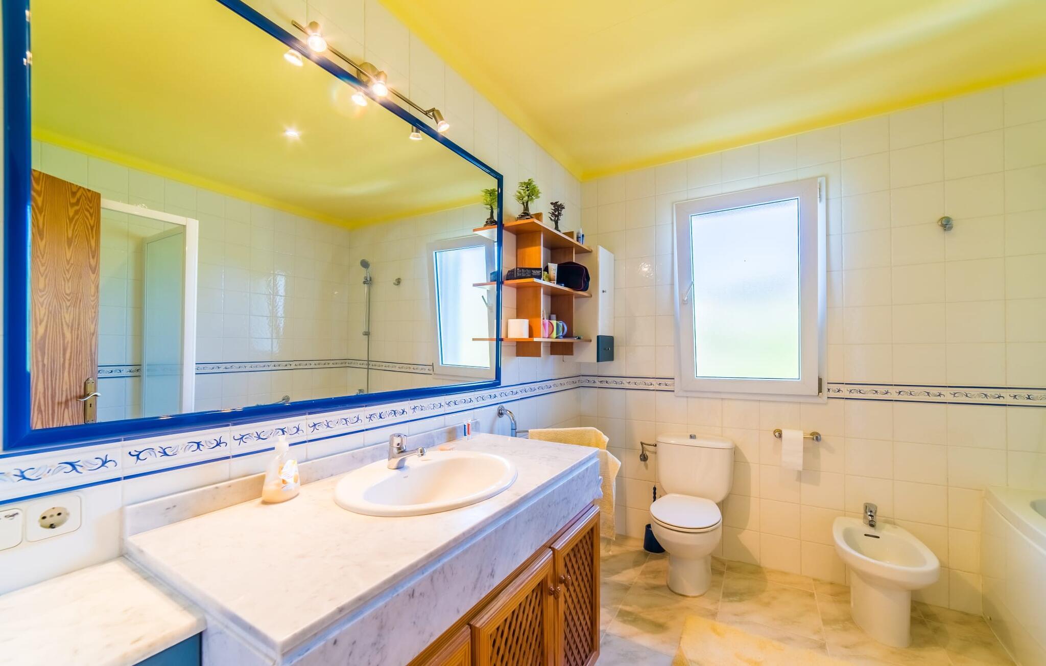 Lang indkørsel, fire parkeringspladser, middelhavsflora: mosaikstenvillaen "Koy" har taget temafarverne grøn, rød og gul til sig, farver, der kan findes i naturen og overalt i denne imponerende ferieejendom. Den velholdte ejendom med sin store græsplæne byder på en række muligheder for sport og leg. En specialdesignet spillebane har et fodboldmål og et tennisnet; Der er også to cykler til rådighed for at udforske. Andre foretrækker måske en drink i galleriet bag søjlerne. Den lange balkon på første sal, med dens vidunderligt komfortable loungeområder, har fået sin del af klapsalver og byder på udsigt fra forreste række - men spillerne nedenfor skal konkurrere mod udsigten over den glitrende bugt og toppene af Tramuntana-bjergene. Og når I virkelig sveder derude, skal I bare hoppe ind i den udendørs bruser og derefter ind i den smukt buede pool på bagsiden af huset; I mellemtiden er der forhåbentlig nogen, der har fyret op i grillen i det overdækkede udekøkken og sat et par ordentlige burgere på grillen (den vegetariske udgave med friske unge grøntsager er også en fornøjelse). Og så leder alle efter et sted at hvile, hvilket ikke burde være et problem med otte liggestole og en grund på over 8.000 m². jeres familiehund er også velkommen; "Johann" ville med glæde lade jer bruge sin kennel til jeres tid her. Har I kun set grønt før? Så følg os nu ind i det ekstremt familievenlige interiør! Røde gardiner, puder og bordløbere sætter dynamiske accenter mod den varme gule på væggene. Hvis det ikke bringer lidt solskin ind i huset... I stueetagen dominerer det rustikke køkken med opvaskemaskine og en tilstødende spisestue indgangspartiet og giver mulighed for at lukke den duftende luft ind fra haven; Et par tulipaner pynter op i soveværelset hernede, som har eget brusebad og fuldender stueetagen. Der er også vaskemaskine til fodboldtrøjer i bryggerset. På øverste etage finder I yderligere tre "drømmesteder" (herunder et hyggeligt værelse med to senge, perfekt til børn), et badeværelse med badekar og bruser og panorama-stuen på første sal med store skydedøre til terrassen; Med sådan en imponerende udsigt fra loungebalkonen må fjernsynet nøjes med sin substituerende rolle. Og da farverige sommerfugle elsker at flyve, er et af dobbeltværelserne med adgang til det fri bestemt i høj kurs. Man kan vel ikke opfylde alles ønsker? Børnene vil gerne til stranden (selvfølgelig), far er en ivrig golfspiller, og mor vil virkelig gerne tage sine vandresko på. Er der ikke en hyggelig lille by i nærheden, som alle kan besøge? Hvordan skal I glæde alle denne ferie? Ningún problem for villa "Koy": Ma-3460 (nogle gange hørbar) tager jer, hvorhen I vil... Den lille strand Cala Ponset med dens let skrånende kyst og stenstranden i Alcanada (nær golfbanen) med udsigt af øen og fyrtårnet af samme navn er blot to af de utallige strande langs den kilometerlange Alcúdia-bugt; Alcúdias snoede bymidte byder på isbarer, caféer og restauranter, og i Pollença, kun 13 km væk, byder en vandretur op ad Puig de Maria på en vidunderlig udsigt over Formentor-halvøens særegne bakkede landskab. "Koy" kunne gøre hele familien glad! I nærheden af Port d'Alcúdia-bugten, mellem Alcúdia og Alcanada, ser den lidt forhøjede, familievenlige villa "Koy" ud over havet fra balkonen på øverste etage. Der er kun få minutter på cykel til havnen, talrige butikker, en bank, restauranter og udendørscaféer, alt inden for 3 km. Andre positive punkter omfatter nærheden til Alcanada Golf Club, den hurtige adgang til stranden og de fremragende vandrestier, der strækker sig fra Pollença over La Victoria-halvøen.