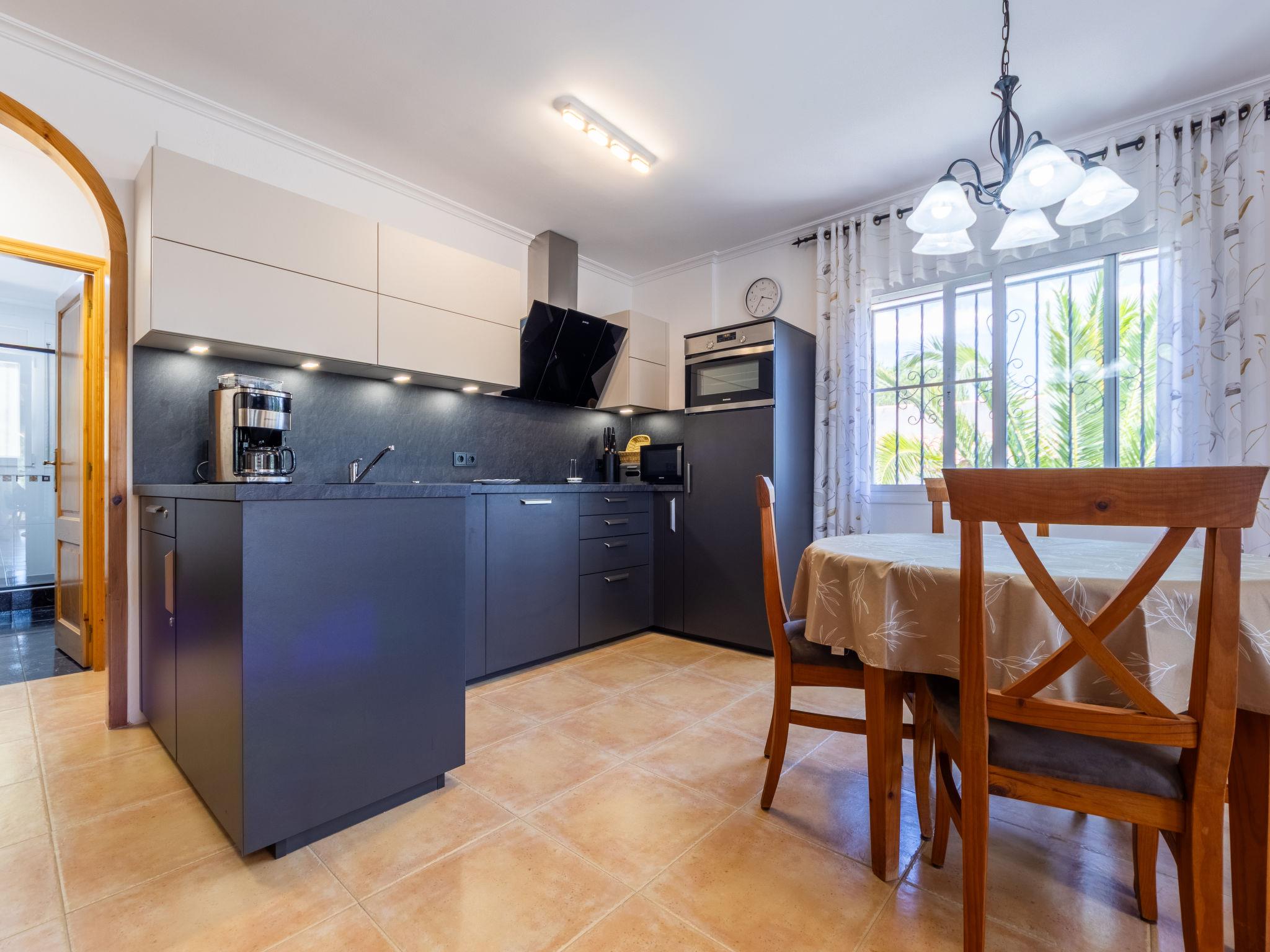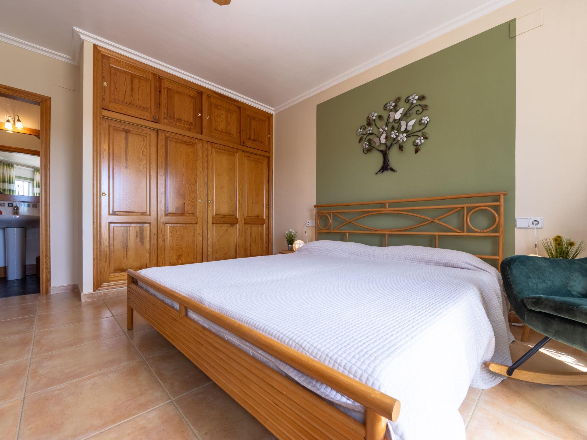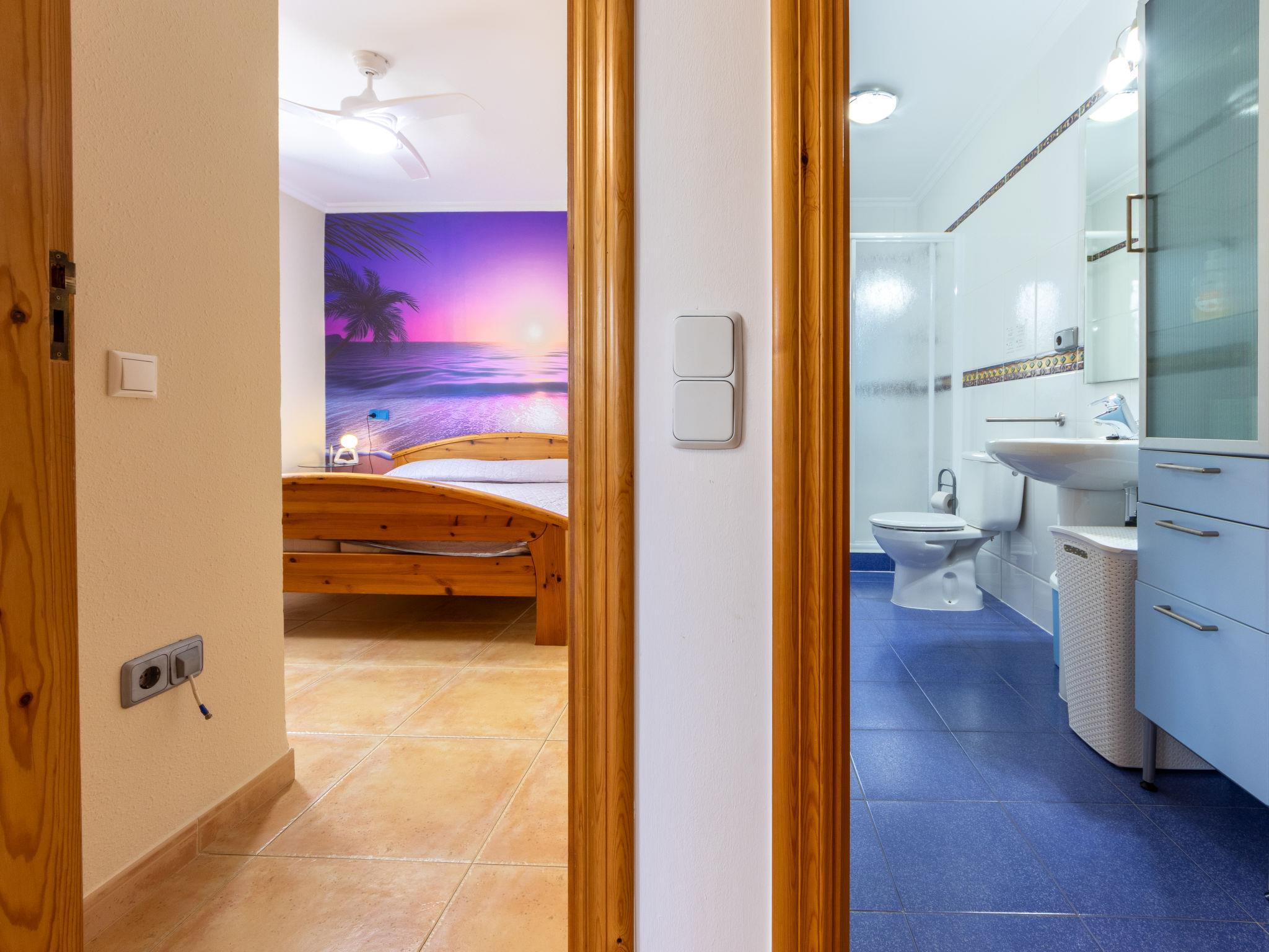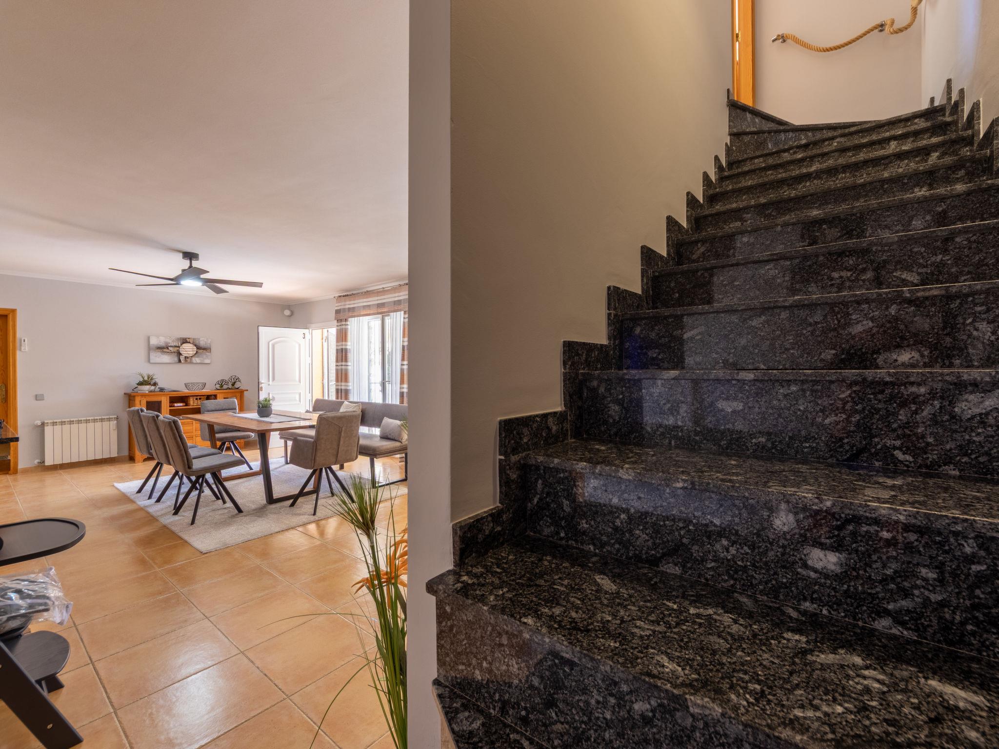 "Villa Luz del Sol", 7-room villa 180 m2 on 2 levels. Comfortable and cosy furnishings: living/dining room with 1 sofabed (135 cm), dining table, satellite TV and digital TV. Exit to the terrace. 1 room with 1 french bed (135 cm), satellite TV and digital TV. 2 rooms, each room with 1 french bed (135 cm), shower/WC, satellite TV and digital TV. Large kitchen (oven, dishwasher, 4 ceramic glass hob hotplates, toaster, kettle, microwave, freezer, electric coffee machine). Shower/WC. No heating option. Upper floor: 1 room with 1 french bed (135 cm), shower/WC and digital TV. Exit to the terrace. Garden. Terrace furniture, barbecue, covered balcony. View of the countryside. Facilities: washing machine, iron, children's high chair, baby cot, hair dryer. Internet (WiFi, free). Parking at the house. The complex consists of 3 connected semi-detached houses with separate WC and kitchen and with a shared garden and pool. HUTTE-052219 // Reg. Nr.: ESFCTU0000430200000273900000000000000000HUTTE-0522192
