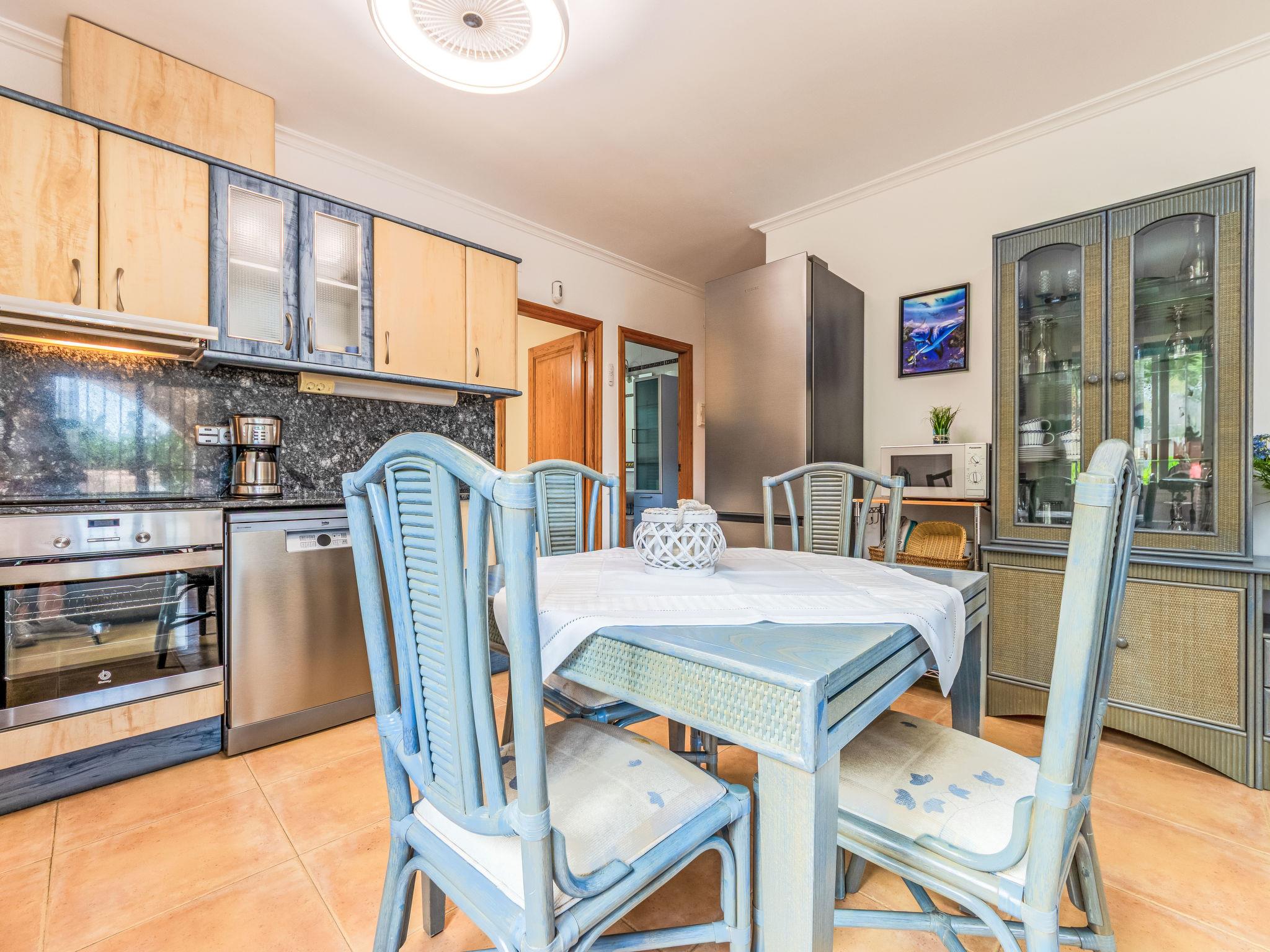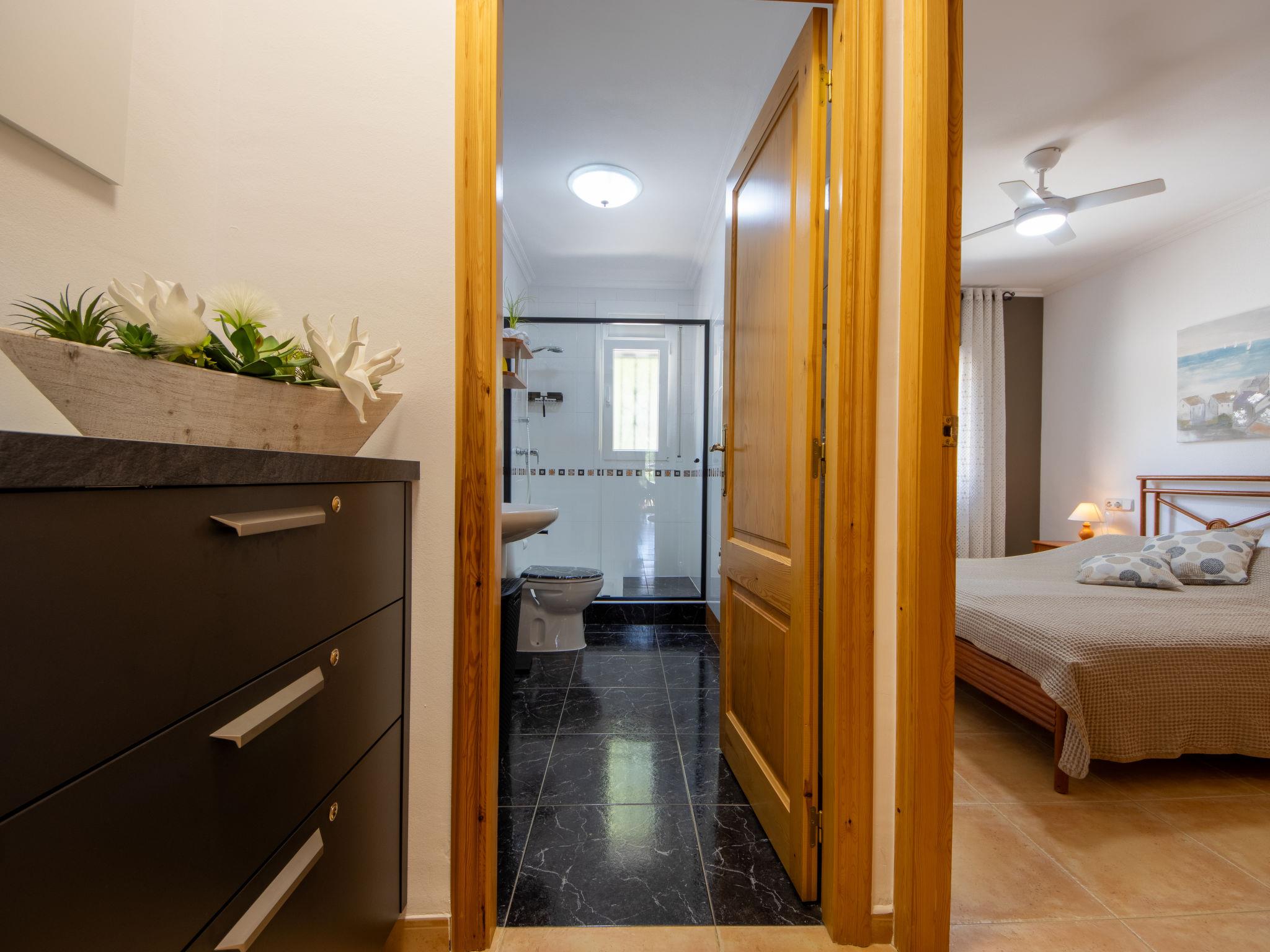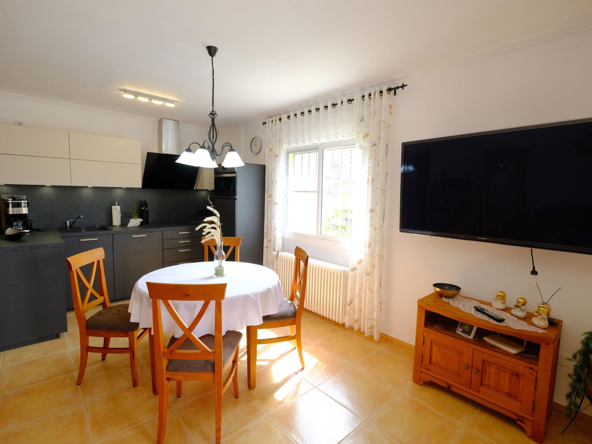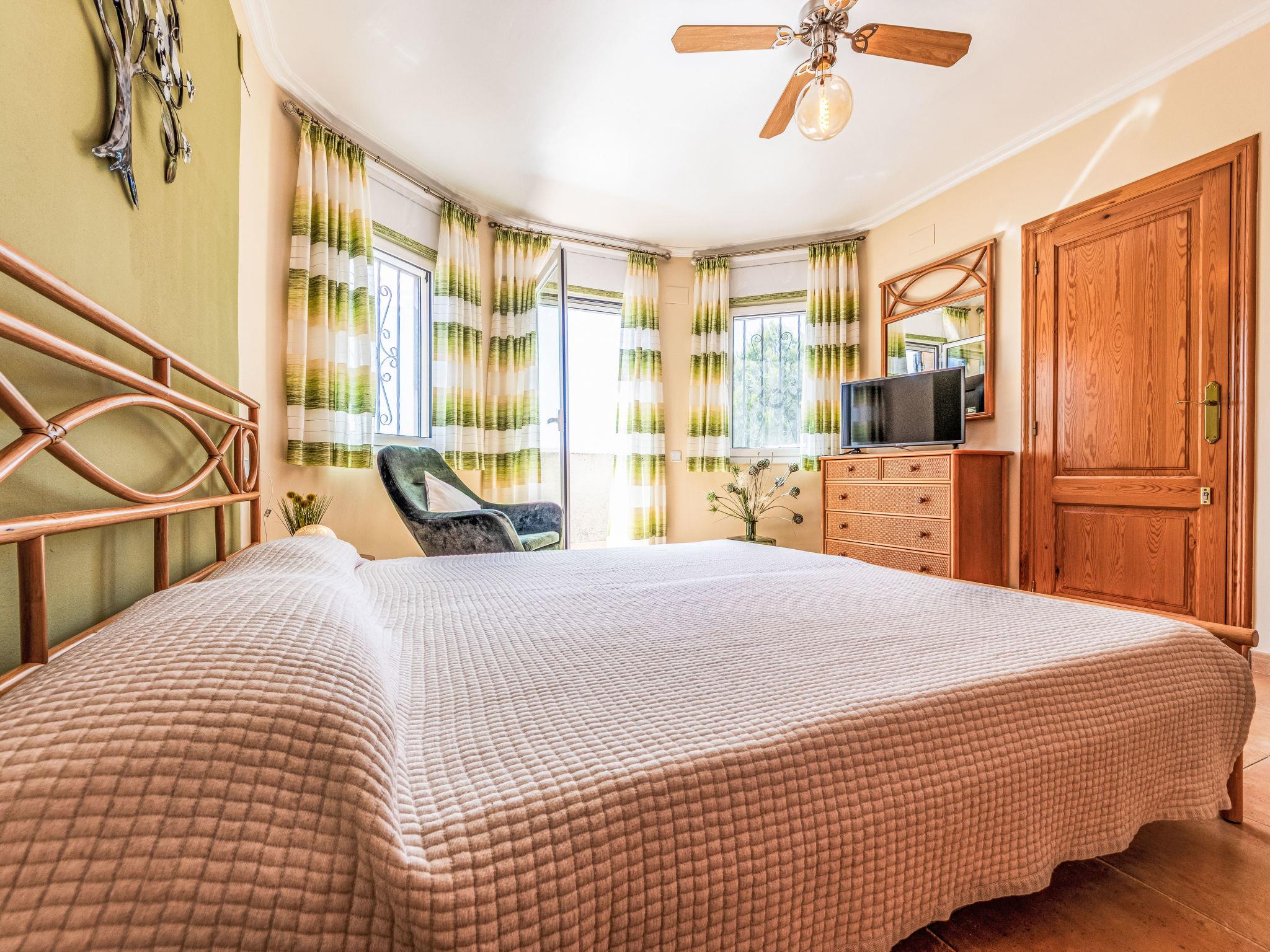 "Villa Luz del Sol", 7-room villa 180 m2 on 2 levels. Comfortable and cosy furnishings: living/dining room with 1 sofabed (135 cm), dining table, satellite TV and digital TV. Exit to the terrace. 1 room with 1 french bed (135 cm), satellite TV and digital TV. 2 rooms, each room with 1 french bed (135 cm), shower/WC, satellite TV and digital TV. Large kitchen (oven, dishwasher, 4 ceramic glass hob hotplates, toaster, kettle, microwave, freezer, electric coffee machine). Shower/WC. No heating option. Upper floor: 1 room with 1 french bed (135 cm), shower/WC and digital TV. Exit to the terrace. Garden. Terrace furniture, barbecue, covered balcony. View of the countryside. Facilities: washing machine, iron, children's high chair, baby cot, hair dryer. Internet (WiFi, free). Parking at the house. The complex consists of 3 connected semi-detached houses with separate WC and kitchen and with a shared garden and pool. HUTTE-052219 // Reg. Nr.: ESFCTU0000430200000273900000000000000000HUTTE-0522192