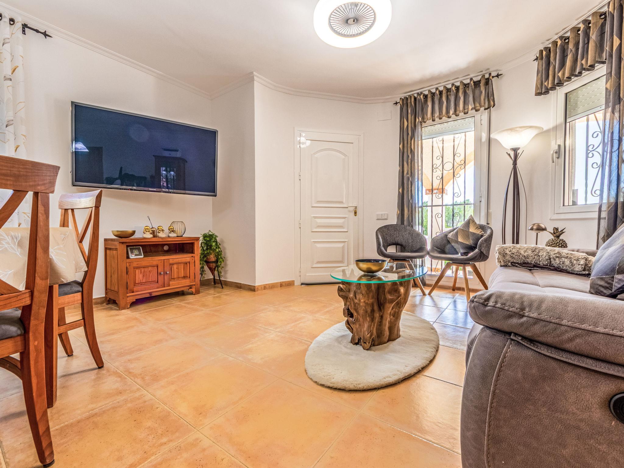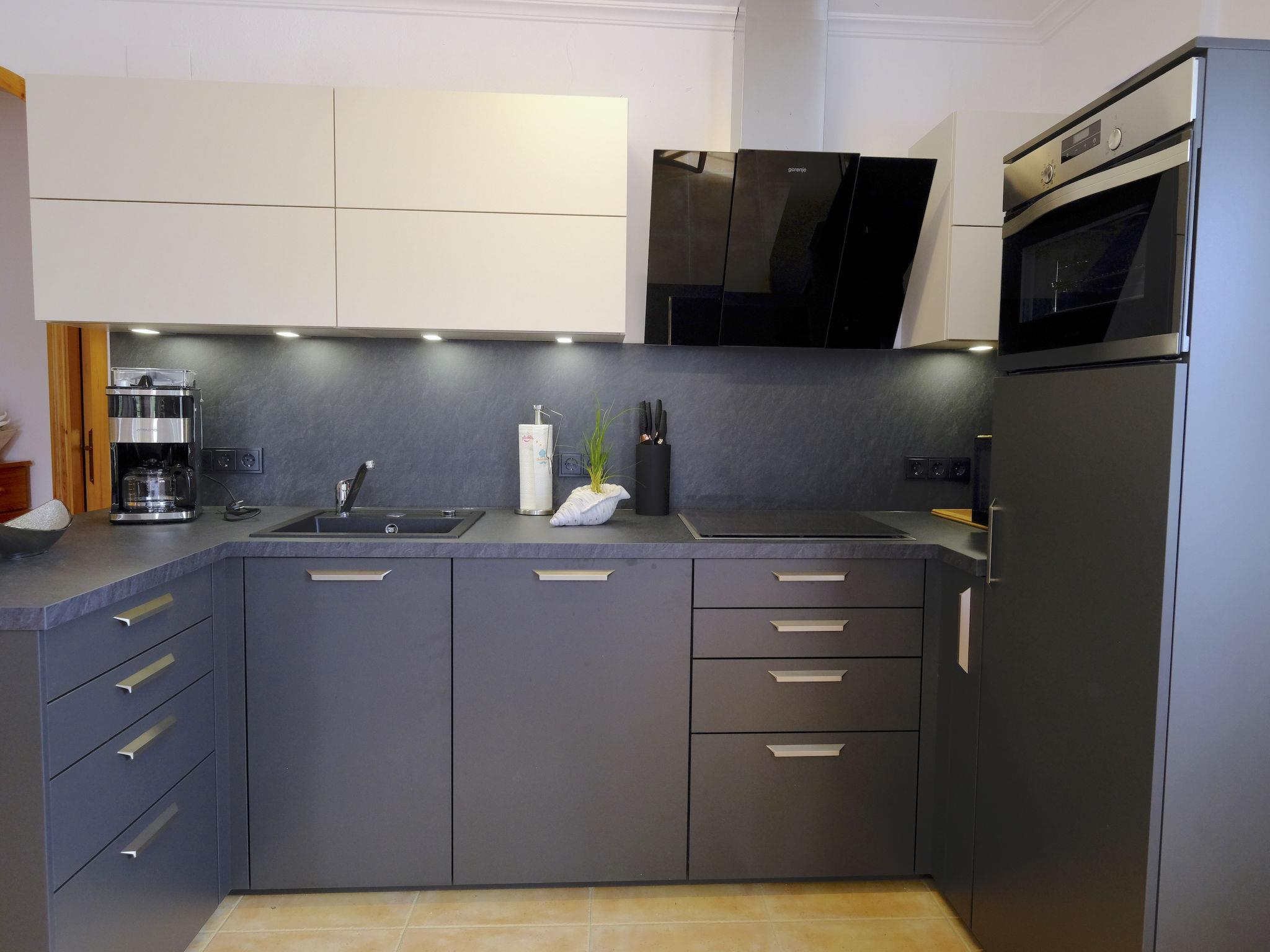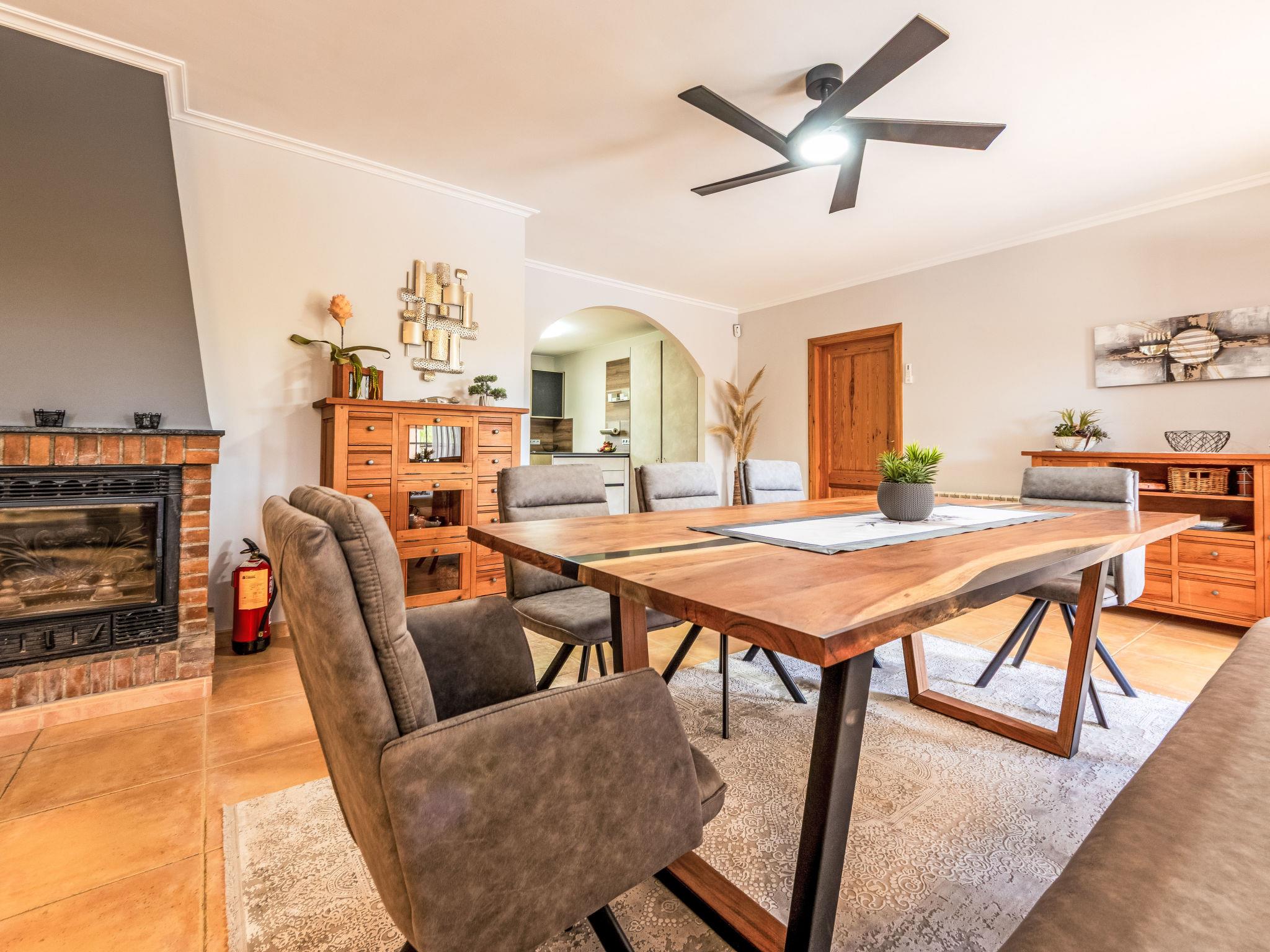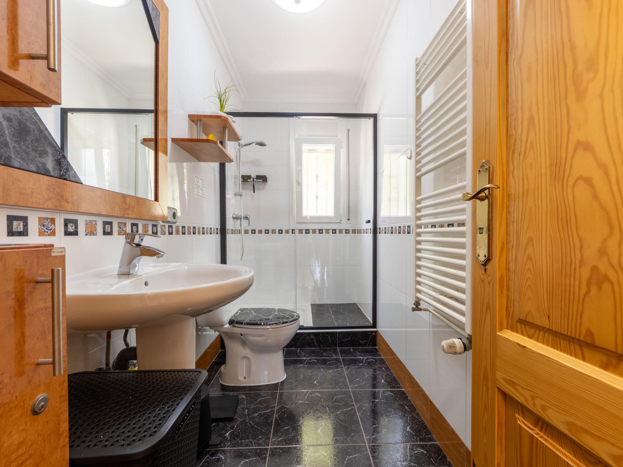 "Villa Luz del Sol", 7-room villa 180 m2 on 2 levels. Comfortable and cosy furnishings: living/dining room with 1 sofabed (135 cm), dining table, satellite TV and digital TV. Exit to the terrace. 1 room with 1 french bed (135 cm), satellite TV and digital TV. 2 rooms, each room with 1 french bed (135 cm), shower/WC, satellite TV and digital TV. Large kitchen (oven, dishwasher, 4 ceramic glass hob hotplates, toaster, kettle, microwave, freezer, electric coffee machine). Shower/WC. No heating option. Upper floor: 1 room with 1 french bed (135 cm), shower/WC and digital TV. Exit to the terrace. Garden. Terrace furniture, barbecue, covered balcony. View of the countryside. Facilities: washing machine, iron, children's high chair, baby cot, hair dryer. Internet (WiFi, free). Parking at the house. The complex consists of 3 connected semi-detached houses with separate WC and kitchen and with a shared garden and pool. HUTTE-052219 // Reg. Nr.: ESFCTU0000430200000273900000000000000000HUTTE-0522192