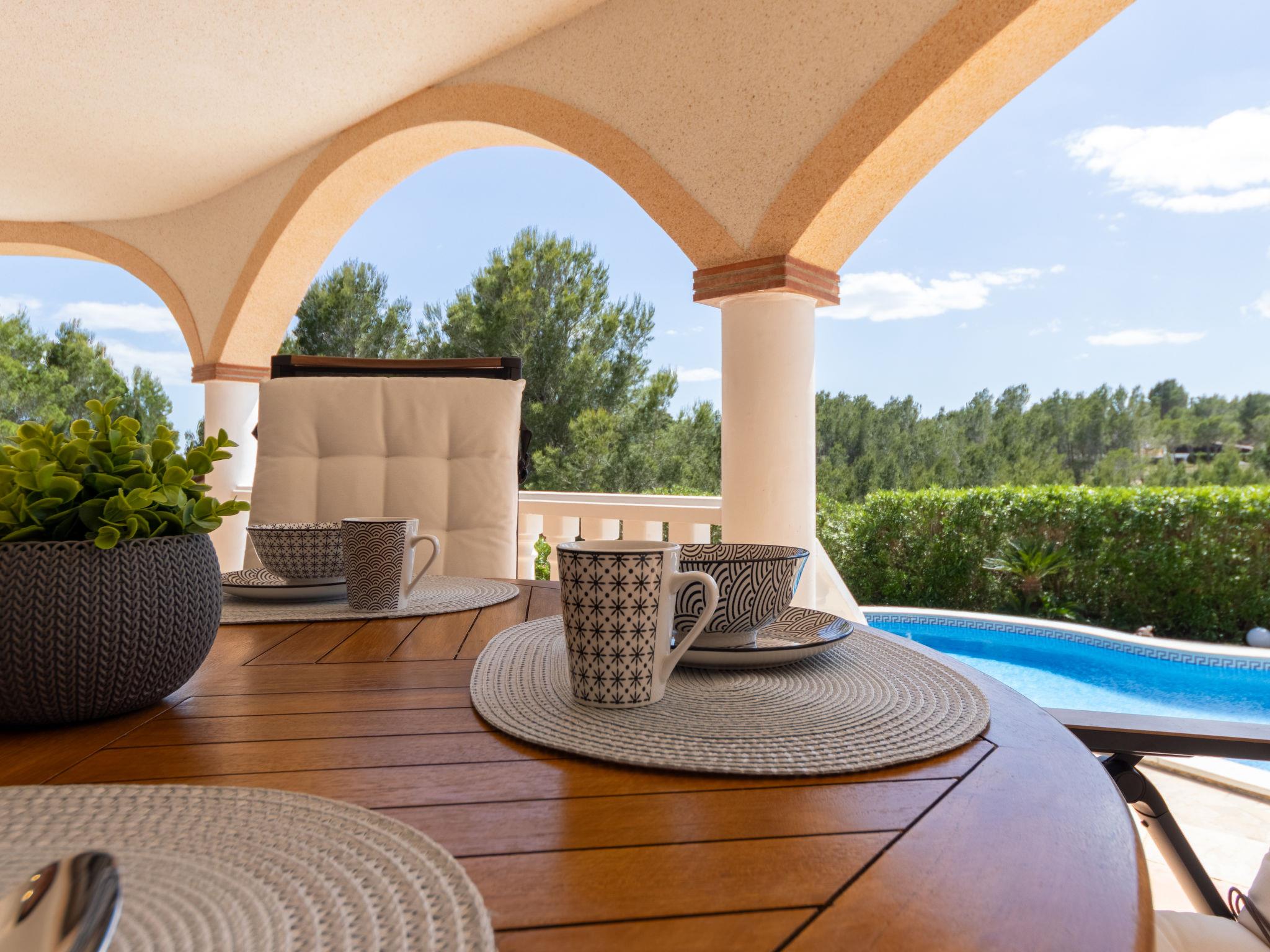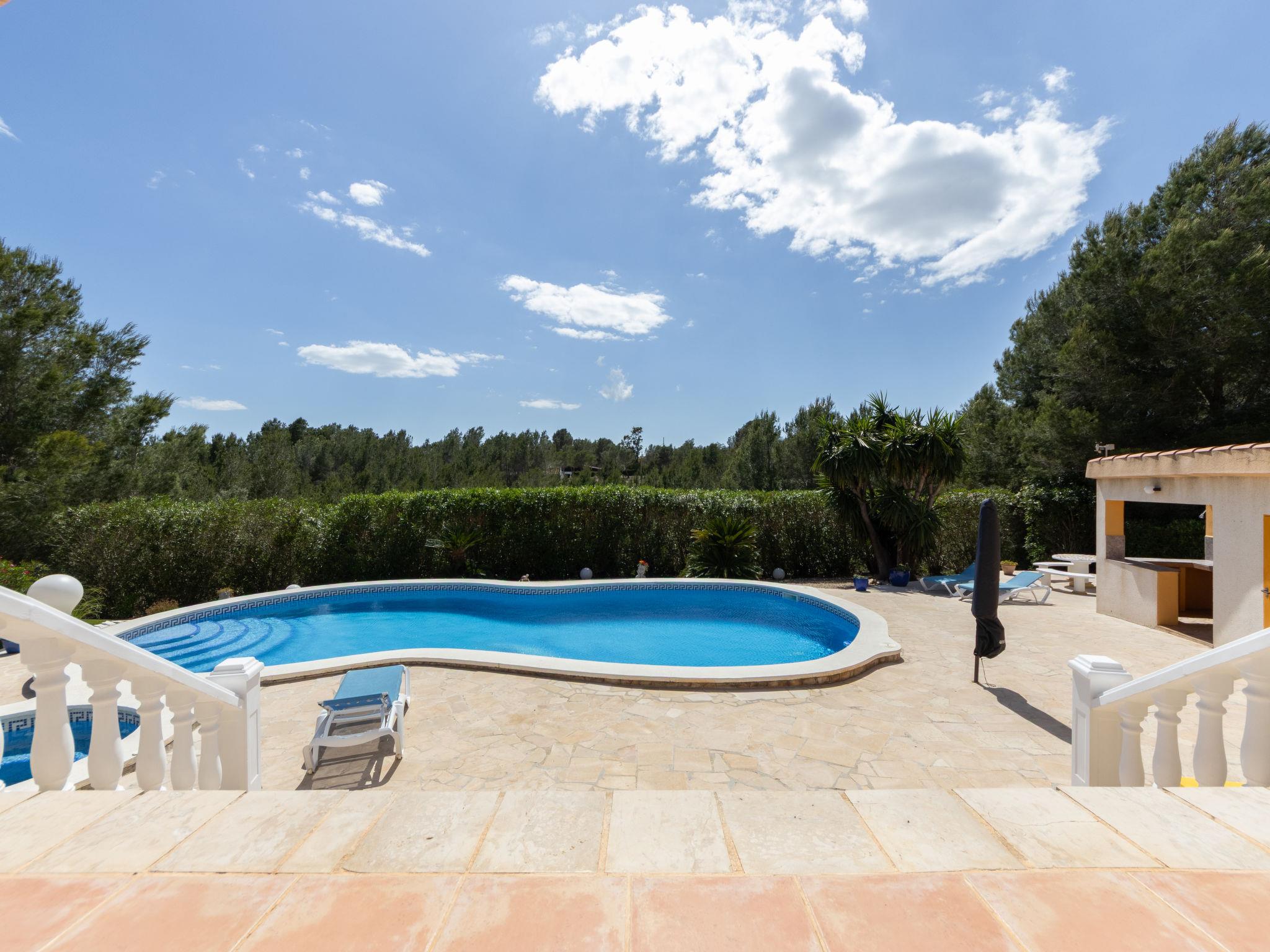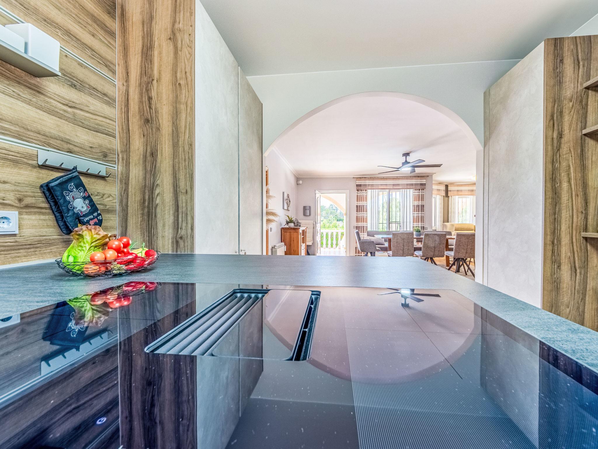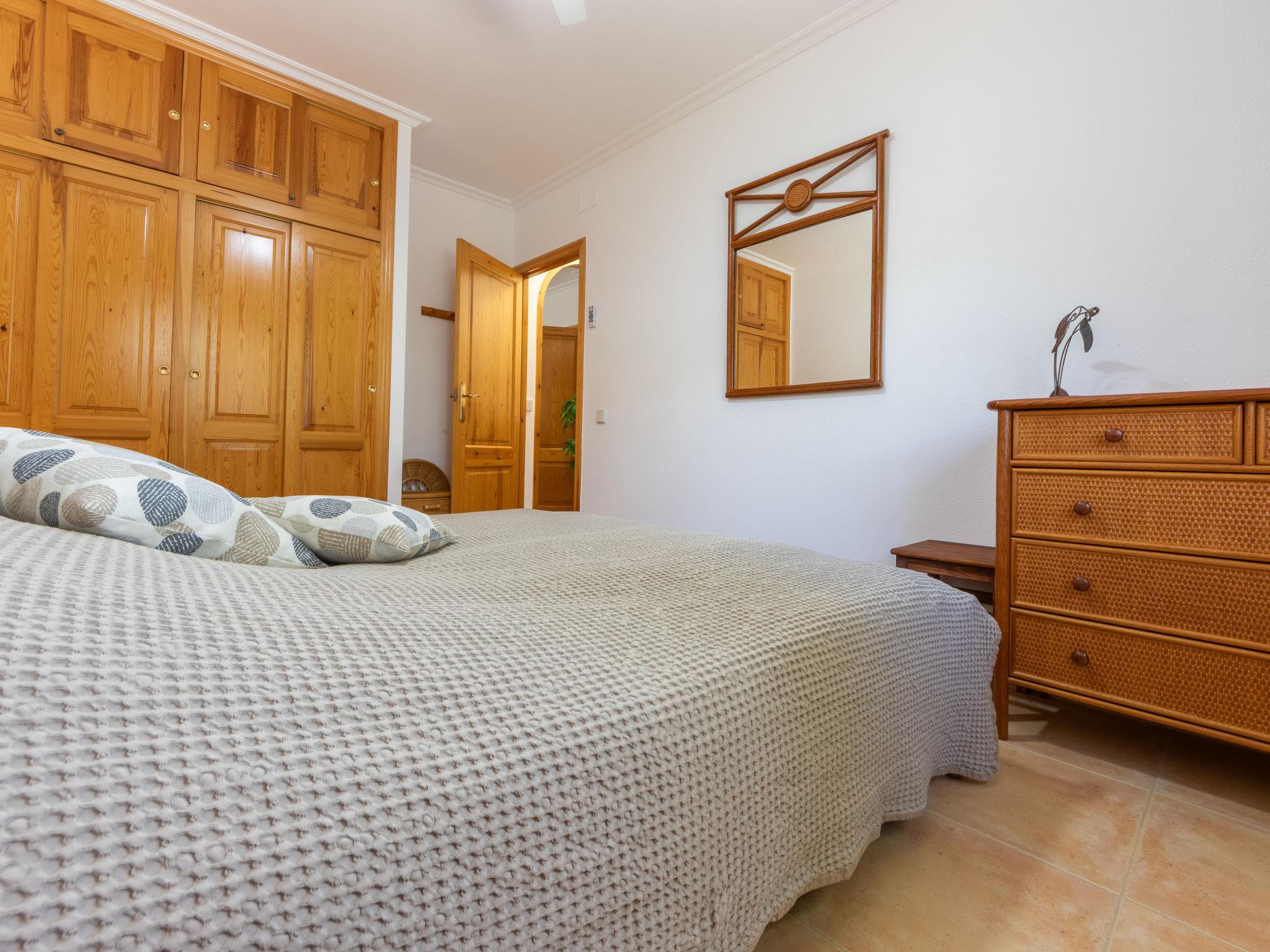"Villa Luz del Sol", 7-room villa 180 m2 on 2 levels. Comfortable and cosy furnishings: living/dining room with 1 sofabed (135 cm), dining table, satellite TV and digital TV. Exit to the terrace. 1 room with 1 french bed (135 cm), satellite TV and digital TV. 2 rooms, each room with 1 french bed (135 cm), shower/WC, satellite TV and digital TV. Large kitchen (oven, dishwasher, 4 ceramic glass hob hotplates, toaster, kettle, microwave, freezer, electric coffee machine). Shower/WC. No heating option. Upper floor: 1 room with 1 french bed (135 cm), shower/WC and digital TV. Exit to the terrace. Garden. Terrace furniture, barbecue, covered balcony. View of the countryside. Facilities: washing machine, iron, children's high chair, baby cot, hair dryer. Internet (WiFi, free). Parking at the house. The complex consists of 3 connected semi-detached houses with separate WC and kitchen and with a shared garden and pool. HUTTE-052219 // Reg. Nr.: ESFCTU0000430200000273900000000000000000HUTTE-0522192