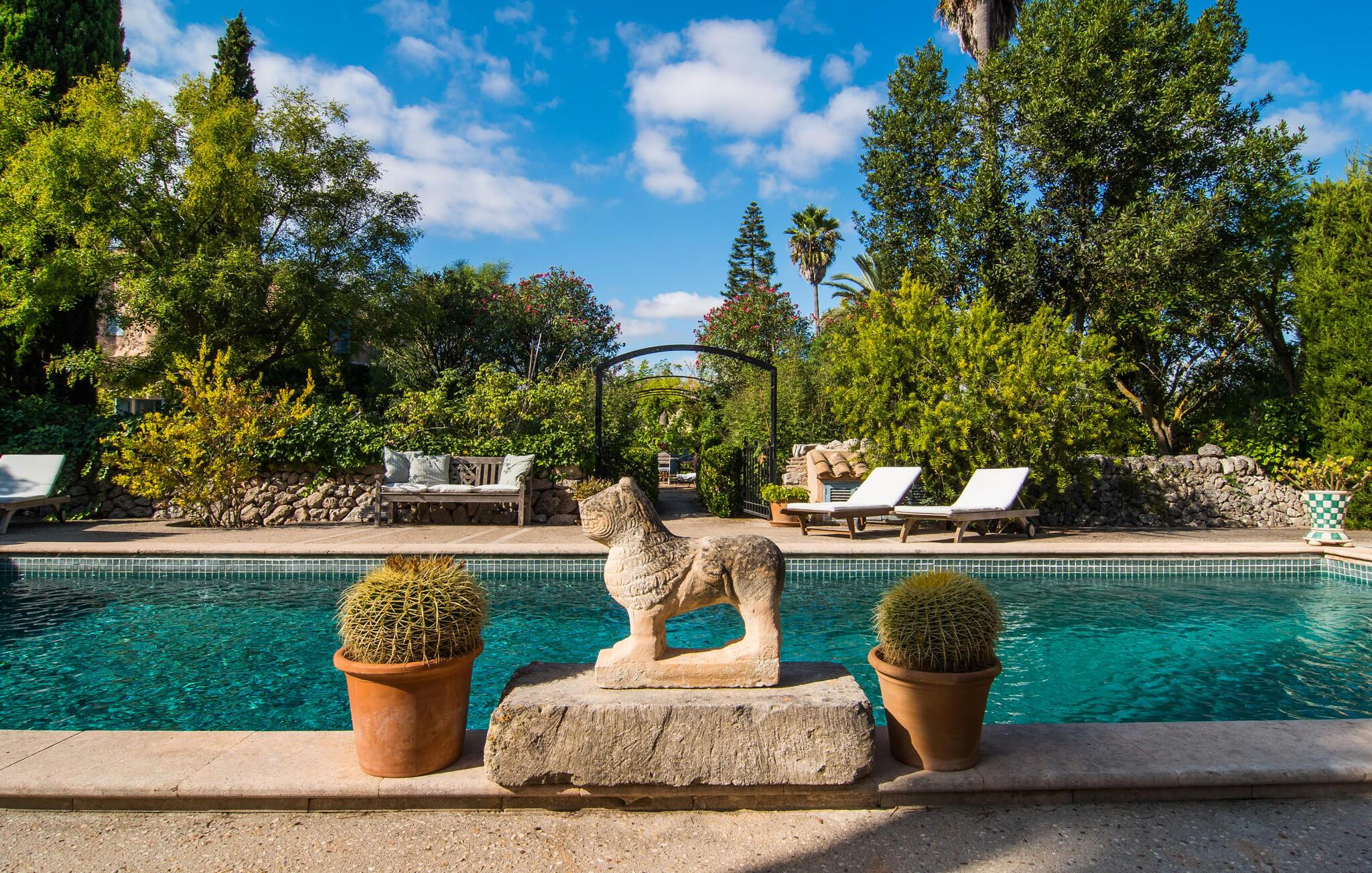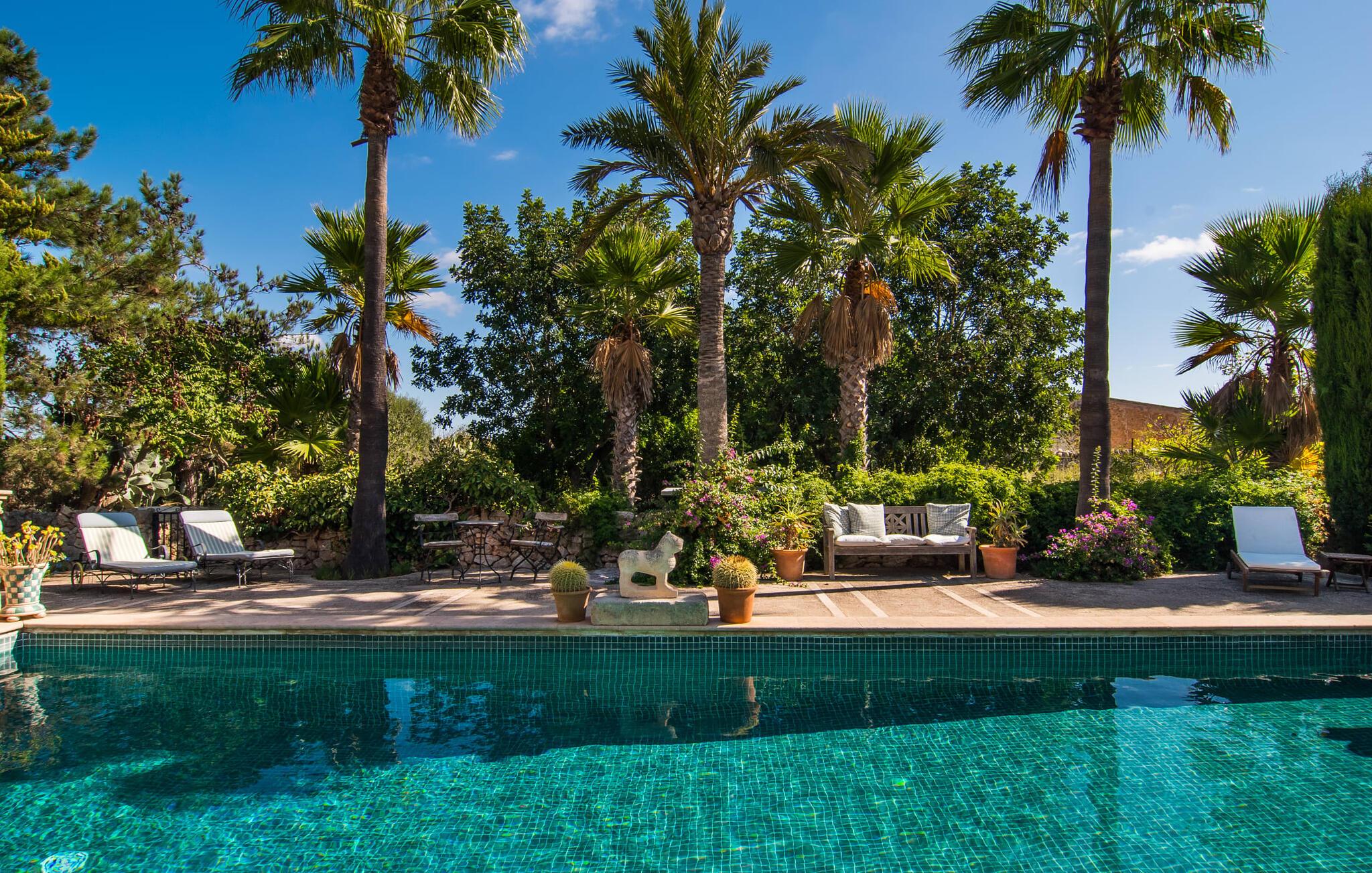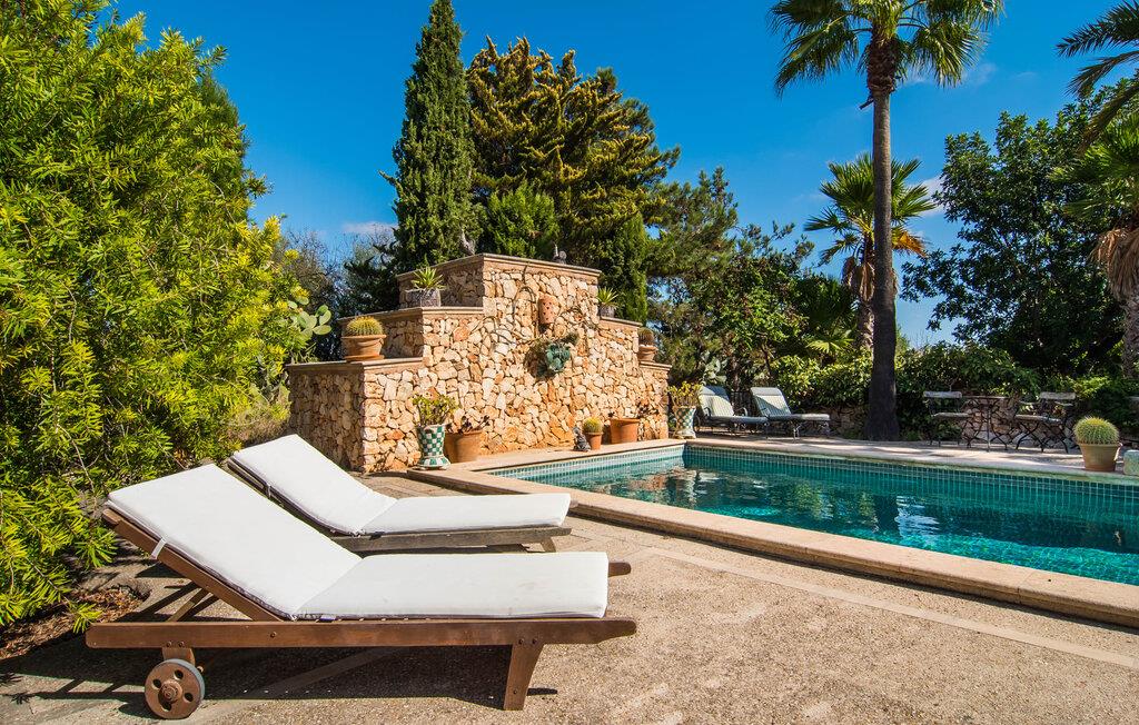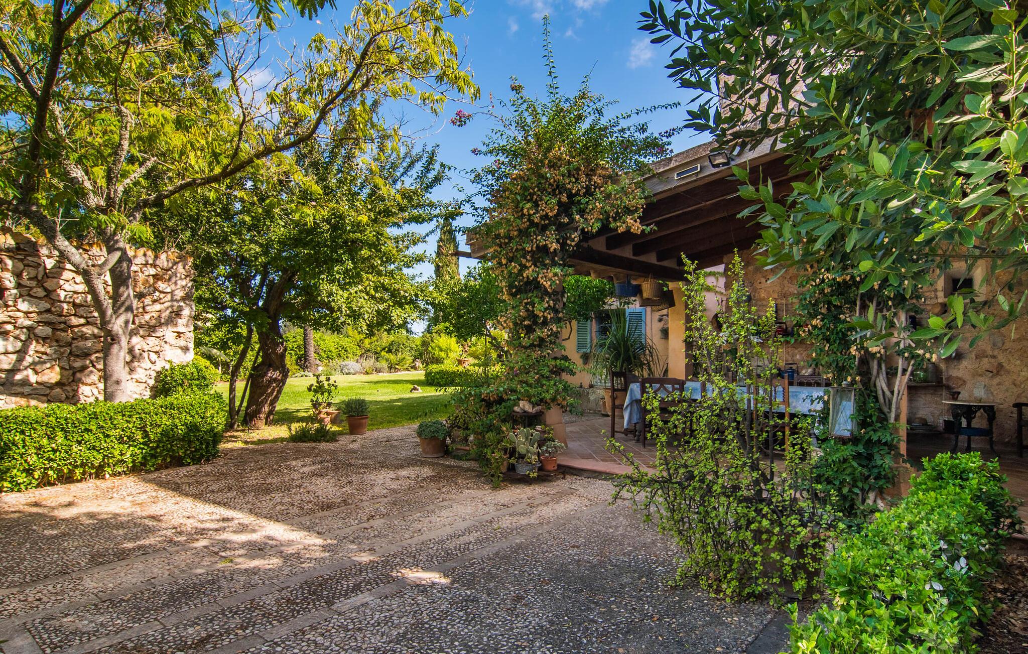 “La Calderera” er et sandt modelobjekt og samtidig så charmerende og magisk, at I simpelthen kan føle jer hjemme her. Det er da ikke så mærkeligt, at dette ubeskriveligt smukke landsted allerede er set i "Schöner Wohnen" og "Casa y Campo". Alene området udenfor er uvirkeligt. Det kunstneriske havedesign består af en tilsyneladende tilfældig kombination af enorme palmer, cypresser, oliven- og frugttræer, samt frodige blomstrende og sukkulente planter, spredt ud over store grunde. Brostensvægge og naturstensterrasser fremstår nærmest, som om de var vokset naturligt og slet ikke var designet. Siddepladser er anlagt som skjulte skatte: overdækkede terrasser foran og bag huset; en afslappet lounge i haven; og en pergola dekoreret med søde lilla blomster og et opholdsområde, der fører til poolområdet nær huset. Selve poolen, dekoreret med turkis mosaiksten, er omgivet af en solterrasse med liggestole, smukke bænke og en smuk samling af cafetilbehør med et overdækket område. Læsning af en bog, en kølig drink i skyggen, en hyggelig snak med vennerne, en godnatdrink efter en livlig grillaften i det overdækkede udekøkken med praktisk grill og indbydende spiseplads - her finder I jeres yndlingssted til alle jeres ferieaktiviteter , fordi "La Calderera" har et virkelig udsøgt udvalg. Den nutidige økologiske orientering, som afspejles både i forsyningen af solenergi og i tilstedeværelsen af dens egen vandbrønd, bør ikke forblive unævnt. Interiøret i dette smagfuldt indrettede landsted, som vi varmt anbefaler, er lige så privat, men personligt som haven. Både ude og inde er det de kærlige små detaljer, der sørger for, at besøgende hurtigt kan slappe af. Disse detaljer er så tilfældige, at de virker næsten slående, og alligevel skaber en helt igennem sammenhængende og harmonisk effekt. Dette er kunsten af fantastisk indretning; Naturligheden og tilbageholdenheden i finishen, perfekt afstemt til øen, giver villaen en vidunderlig karisma. Traditionelt kunsthåndværk i form af antikviteter, landlige artefakter, typisk keramik og neo-barokke møbler er omhyggeligt kombineret med strejf af vintage og landlig stil, hvilket resulterer i et tidløst design, der vil holde i århundreder. Den rummelige opholdsstue i brostenshuset med sine azurblå skodder strækker sig over to etager. På underetagen finder I den hyggelige stue med pejs, rundet af et flygel. Og et hyggeligt tv-hjørne skulle selvfølgelig ikke mangle. Det tilstødende værelse med udgang til en af terrasserne er et virkelig fortryllende, fuldt udstyret køkken i landlig stil i himmelblå, dygtigt kombineret med møbler i naturtræ. To badeværelser (et en-suite til naboværelset) er placeret i stueetagen, mens det tredje er på første sal, sammen med de tre hyggelige soveværelser, hvoraf det ene har to enkeltsenge. Efter en afslappende søvn begynder dagen med en ubekymret morgenmad og planlægning af jeres dag. Et ophold i haven eller poolen på "La Calderera" er bestemt en fantastisk måde at slappe af på. Men de omkringliggende feriesteder er også en attraktiv mulighed, da ejendommen ligger tæt på en landevej, der betjener den sydlige del af øen. Selve vejen kan nogle gange høres afhængigt af vindretningen. Felanitx og Manacor kan nås på meget kort tid. Dette er det perfekte sted, ikke kun for shopping, men også for kulturelle udflugter. Eller måske gå en tur til klosteret Sant Salvador, der ligger på et bjerg nær Felanitx og et af øens vartegn. Selvom poolen er betagende, som alt andet, vil de såkaldte Calas de Mallorca forbløffe jer med deres til tider forrevne klippeformationer og fine sandstrande, der er perfekte til svømning. Den udsøgte skønhed ved Villa "La Calderera" med dens haveoase byder på et muntert udvalg af siddepladser og et smukt poolområde. Det ekstraordinære feriehus ligger lige nord for Felanitx i et landligt område. Der er både butikker og marked søndag morgen - en god måde at starte dagen på. De utrolige strande mod øst, herunder ufattelige naturlige strande som Cala Varques, er let tilgængelige med bil.