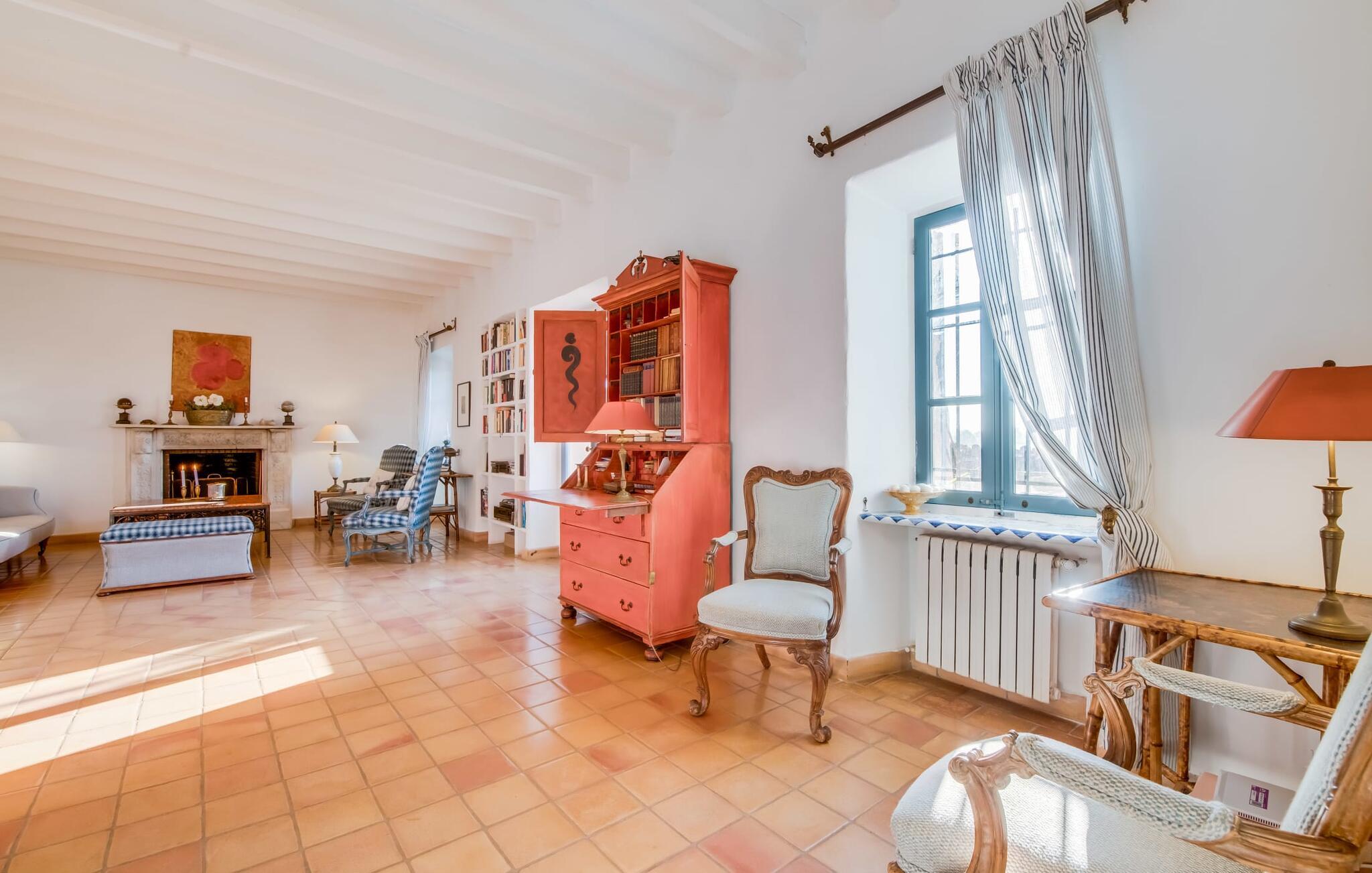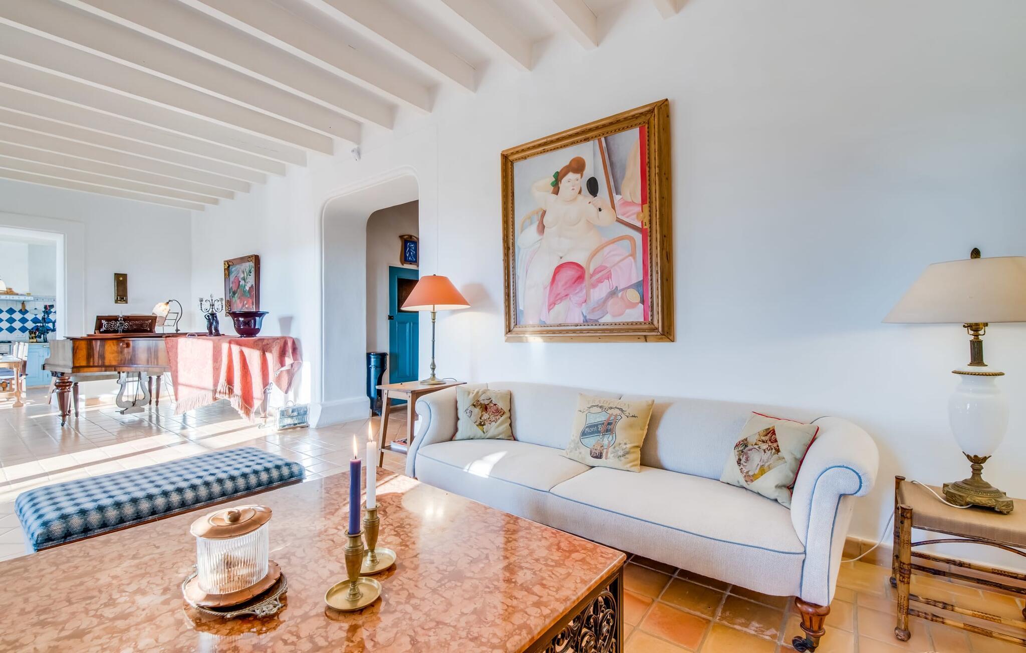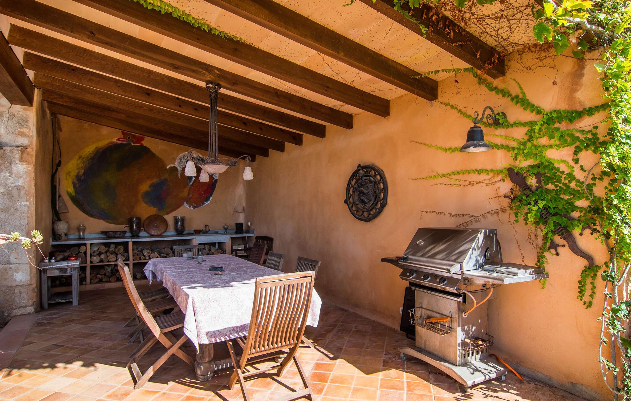“La Calderera” er et sandt modelobjekt og samtidig så charmerende og magisk, at I simpelthen kan føle jer hjemme her. Det er da ikke så mærkeligt, at dette ubeskriveligt smukke landsted allerede er set i "Schöner Wohnen" og "Casa y Campo". Alene området udenfor er uvirkeligt. Det kunstneriske havedesign består af en tilsyneladende tilfældig kombination af enorme palmer, cypresser, oliven- og frugttræer, samt frodige blomstrende og sukkulente planter, spredt ud over store grunde. Brostensvægge og naturstensterrasser fremstår nærmest, som om de var vokset naturligt og slet ikke var designet. Siddepladser er anlagt som skjulte skatte: overdækkede terrasser foran og bag huset; en afslappet lounge i haven; og en pergola dekoreret med søde lilla blomster og et opholdsområde, der fører til poolområdet nær huset. Selve poolen, dekoreret med turkis mosaiksten, er omgivet af en solterrasse med liggestole, smukke bænke og en smuk samling af cafetilbehør med et overdækket område. Læsning af en bog, en kølig drink i skyggen, en hyggelig snak med vennerne, en godnatdrink efter en livlig grillaften i det overdækkede udekøkken med praktisk grill og indbydende spiseplads - her finder I jeres yndlingssted til alle jeres ferieaktiviteter , fordi "La Calderera" har et virkelig udsøgt udvalg. Den nutidige økologiske orientering, som afspejles både i forsyningen af solenergi og i tilstedeværelsen af dens egen vandbrønd, bør ikke forblive unævnt. Interiøret i dette smagfuldt indrettede landsted, som vi varmt anbefaler, er lige så privat, men personligt som haven. Både ude og inde er det de kærlige små detaljer, der sørger for, at besøgende hurtigt kan slappe af. Disse detaljer er så tilfældige, at de virker næsten slående, og alligevel skaber en helt igennem sammenhængende og harmonisk effekt. Dette er kunsten af fantastisk indretning; Naturligheden og tilbageholdenheden i finishen, perfekt afstemt til øen, giver villaen en vidunderlig karisma. Traditionelt kunsthåndværk i form af antikviteter, landlige artefakter, typisk keramik og neo-barokke møbler er omhyggeligt kombineret med strejf af vintage og landlig stil, hvilket resulterer i et tidløst design, der vil holde i århundreder. Den rummelige opholdsstue i brostenshuset med sine azurblå skodder strækker sig over to etager. På underetagen finder I den hyggelige stue med pejs, rundet af et flygel. Og et hyggeligt tv-hjørne skulle selvfølgelig ikke mangle. Det tilstødende værelse med udgang til en af terrasserne er et virkelig fortryllende, fuldt udstyret køkken i landlig stil i himmelblå, dygtigt kombineret med møbler i naturtræ. To badeværelser (et en-suite til naboværelset) er placeret i stueetagen, mens det tredje er på første sal, sammen med de tre hyggelige soveværelser, hvoraf det ene har to enkeltsenge. Efter en afslappende søvn begynder dagen med en ubekymret morgenmad og planlægning af jeres dag. Et ophold i haven eller poolen på "La Calderera" er bestemt en fantastisk måde at slappe af på. Men de omkringliggende feriesteder er også en attraktiv mulighed, da ejendommen ligger tæt på en landevej, der betjener den sydlige del af øen. Selve vejen kan nogle gange høres afhængigt af vindretningen. Felanitx og Manacor kan nås på meget kort tid. Dette er det perfekte sted, ikke kun for shopping, men også for kulturelle udflugter. Eller måske gå en tur til klosteret Sant Salvador, der ligger på et bjerg nær Felanitx og et af øens vartegn. Selvom poolen er betagende, som alt andet, vil de såkaldte Calas de Mallorca forbløffe jer med deres til tider forrevne klippeformationer og fine sandstrande, der er perfekte til svømning. Den udsøgte skønhed ved Villa "La Calderera" med dens haveoase byder på et muntert udvalg af siddepladser og et smukt poolområde. Det ekstraordinære feriehus ligger lige nord for Felanitx i et landligt område. Der er både butikker og marked søndag morgen - en god måde at starte dagen på. De utrolige strande mod øst, herunder ufattelige naturlige strande som Cala Varques, er let tilgængelige med bil.