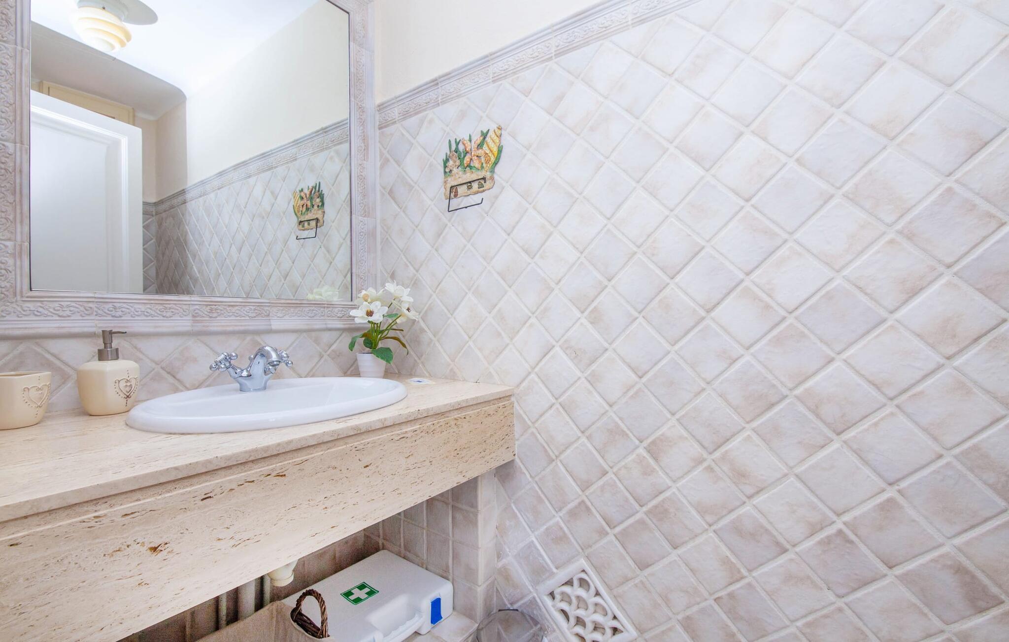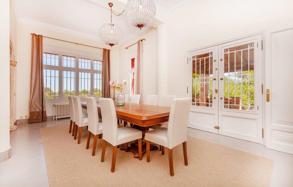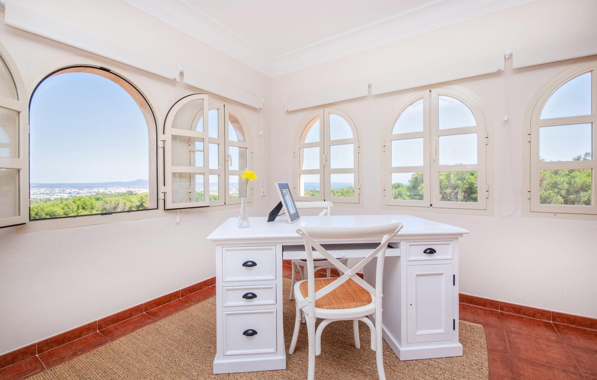 På trods af sin nærhed til øens hovedstad Palma, tilbyder villaen “La casa de las Vistas” jer et vidunderligt naturligt Eldorado lige uden for døren: Det parklignende udendørsområde, som har mange højdepunkter, er et ægte blikfang på 7.000 m². Rejsende med sportslige ambitioner kan slippe dampen af på den interne tennisbane. Eller nyd poolens generøse dimensioner, som på 13 x 6 m er mere end blot et sted at køle af. Uanset hvor I sidder i haven, vil udsigten over Palma-bugten altid bidrage til magien ved denne ejendom. Gå en tur langs dammen, hvil ved foden af et stateligt træ, slap af med en drink i skyggen af pergolaen ved siden af poolen, solbad på terrassen – eller forkæl jer selv med kulinariske lækkerier i den lille grillhytte om aftenen. Fordelt på tre etager udstråler husets indre en vidunderlig flair. Fra entréen med sin dekorative vindeltrappe passerer man gennem gamle romerske søjler, som giver stueetagen en åben, lys karakter i de forskellige områder: Stuen med sine to sofaer, den herskabelige pejs og fladskærms-tv er sikker på at sikre endeløse timers komfort. På den anden side af entréen ligger spisepladsen med et aflangt træbord, hvor det komfortabelt og praktisk indrettede køkken er placeret. Her finder I alt, hvad I skal bruge for at fremtrylle en ægte italiensk espresso eller et friskpresset, opkvikkende glas juice. I stueetagen er der også et af dobbeltværelserne med eget badeværelse. Når I går en etage op, kommer I til yderligere to soveværelser, begge med en-suite badeværelser. Et af værelserne har en dobbeltseng, det andet har to enkeltsenge. Disse værelser tilbyder en betagende udsigt over havets skønhed ud for Palma. Men for den bedste udsigt skal I sørge for at besøge det fyrtårnslignende studieværelse på øverste etage, komplet med sofa, skrivebord og masser af vinduer. Etagerne er forbundet via en elevator. Derudover er der aircondition i alle soveværelser, så I kan vågne op og føle jer frisk og frisk hver morgen. Det er beliggende i det smagfulde Son Xigala-distrikt og kun 6 km fra centrum af den pulserende hovedstad. Der er marked om fredagen, hvor der sælges friske delikatesser, men byen byder også på et omfattende program af aktiviteter og seværdigheder hver anden dag. Med dette i tankerne er det en god ting, at villaen ligger i et vidunderligt roligt område, da det betyder, at jeres bolig står klar til at tilbyde jer noget tiltrængt ro efter en dag i de travle gader. Dette burde bestemt være muligt på en af de fremragende sandstrande. Sant Agusti, 7 km væk, er et vigtigt centrum for sejlere. På et malerisk tog, det legendariske "Red Flash", rejser I langs de smukke landskaber og bjerge til Sóller, hvor spektakulære vandrestier fører jer ud i naturen. Deià, Valldemossa og de mauriske "Jardines de Alfabia" er mulige udflugtsmål at udforske i denne smukke region på Mallorca. Fincaen "La casa de las Vistas" byder på en fantastisk udsigt over det smukke omkringliggende landskab: 6 km til centrum af Palma, 30 km til den idylliske by Sóller i Tramuntana-bjergene. I kan svinge jeres golfkølle direkte på en af de tre golfbaner i umiddelbar nærhed: "Son Quint", "Son Vida" og "Son Muntaner". Eller I kan besøge de lettilgængelige strande som Platja de Can Pere Antoni med sin palmepromenade for en lang dag med svømning.