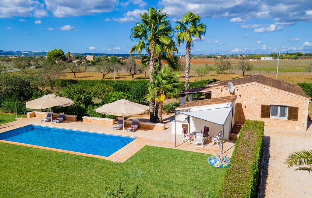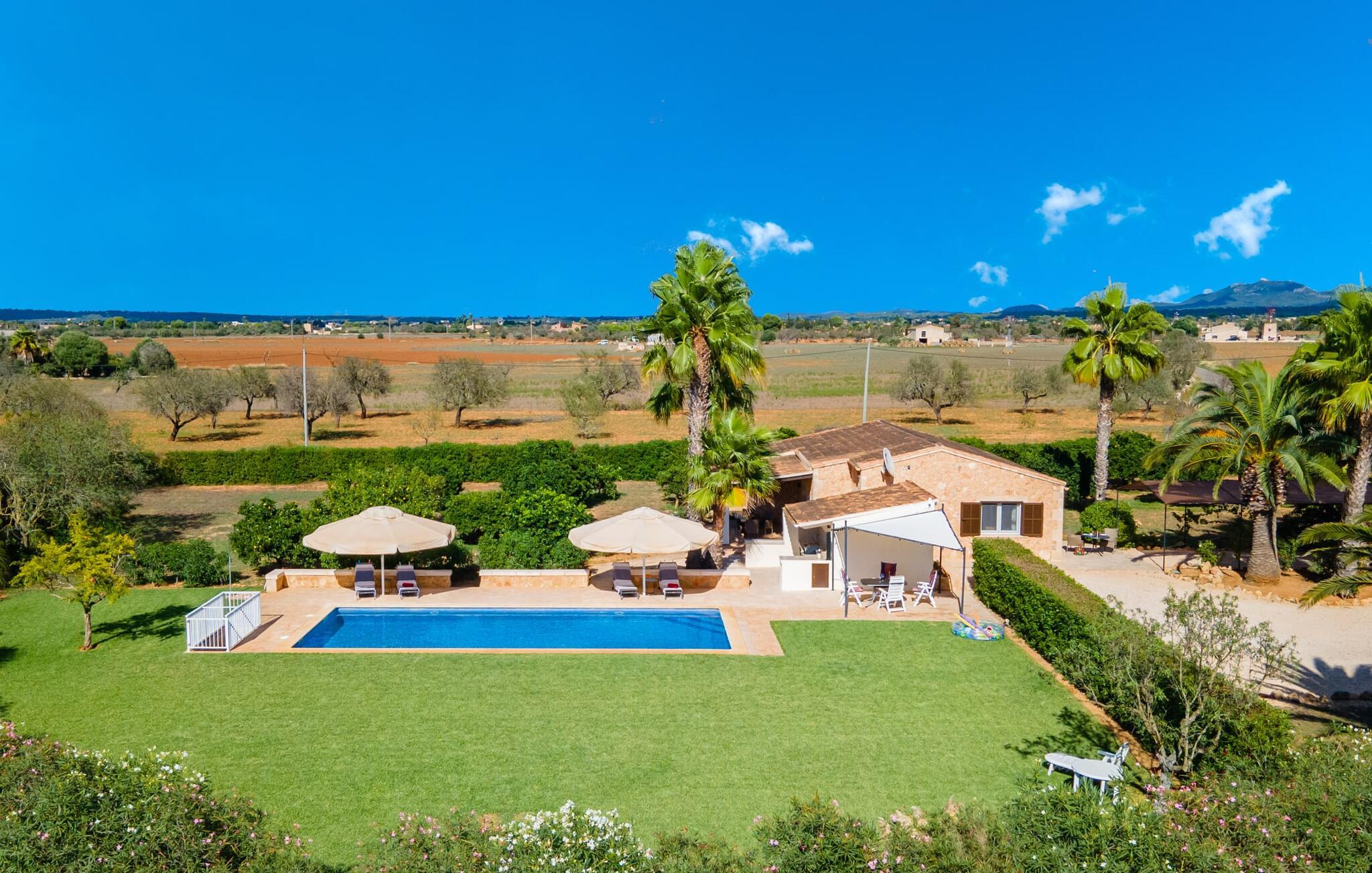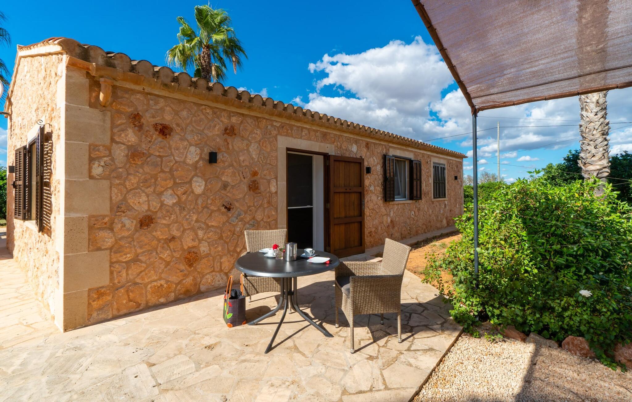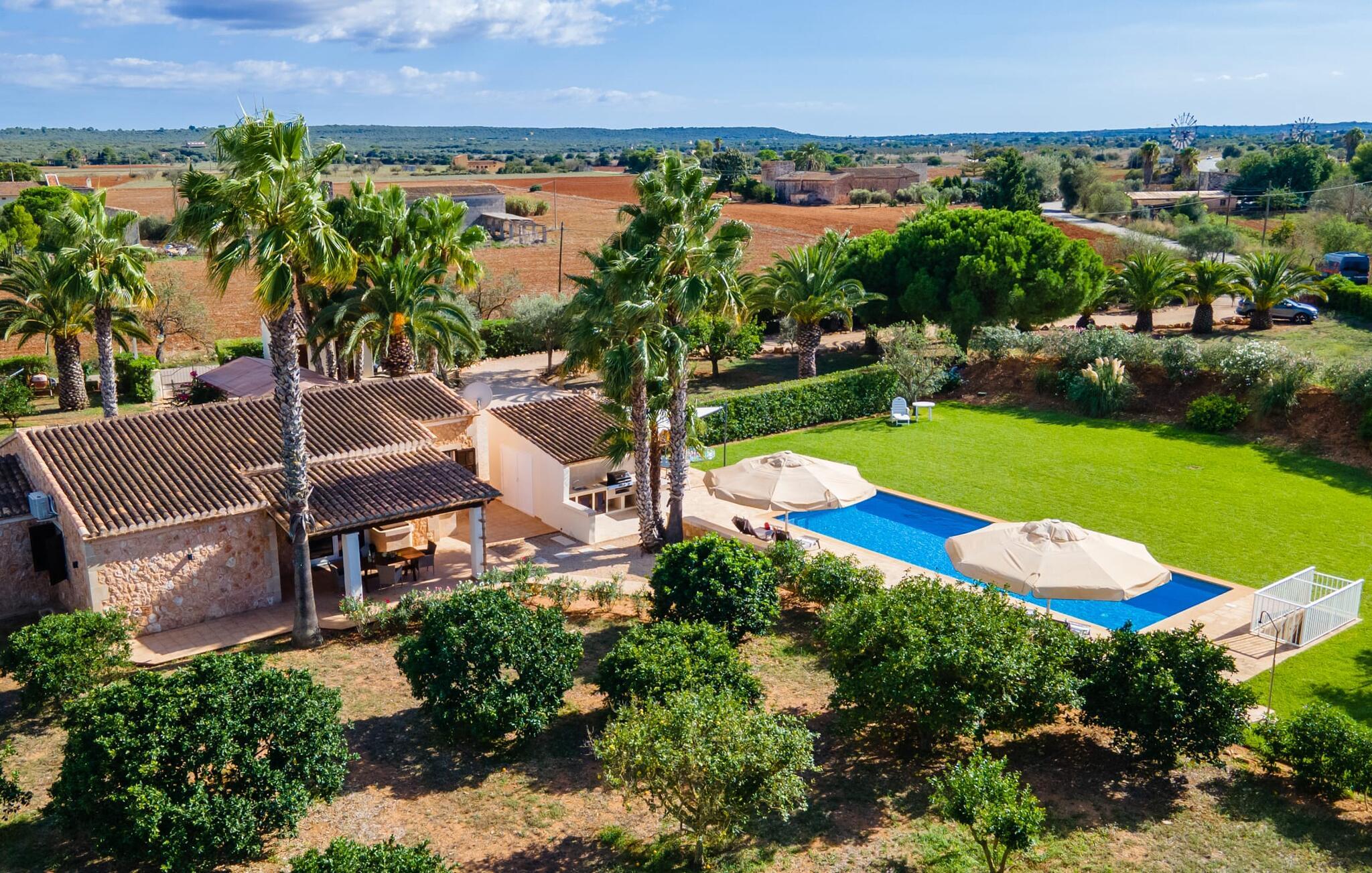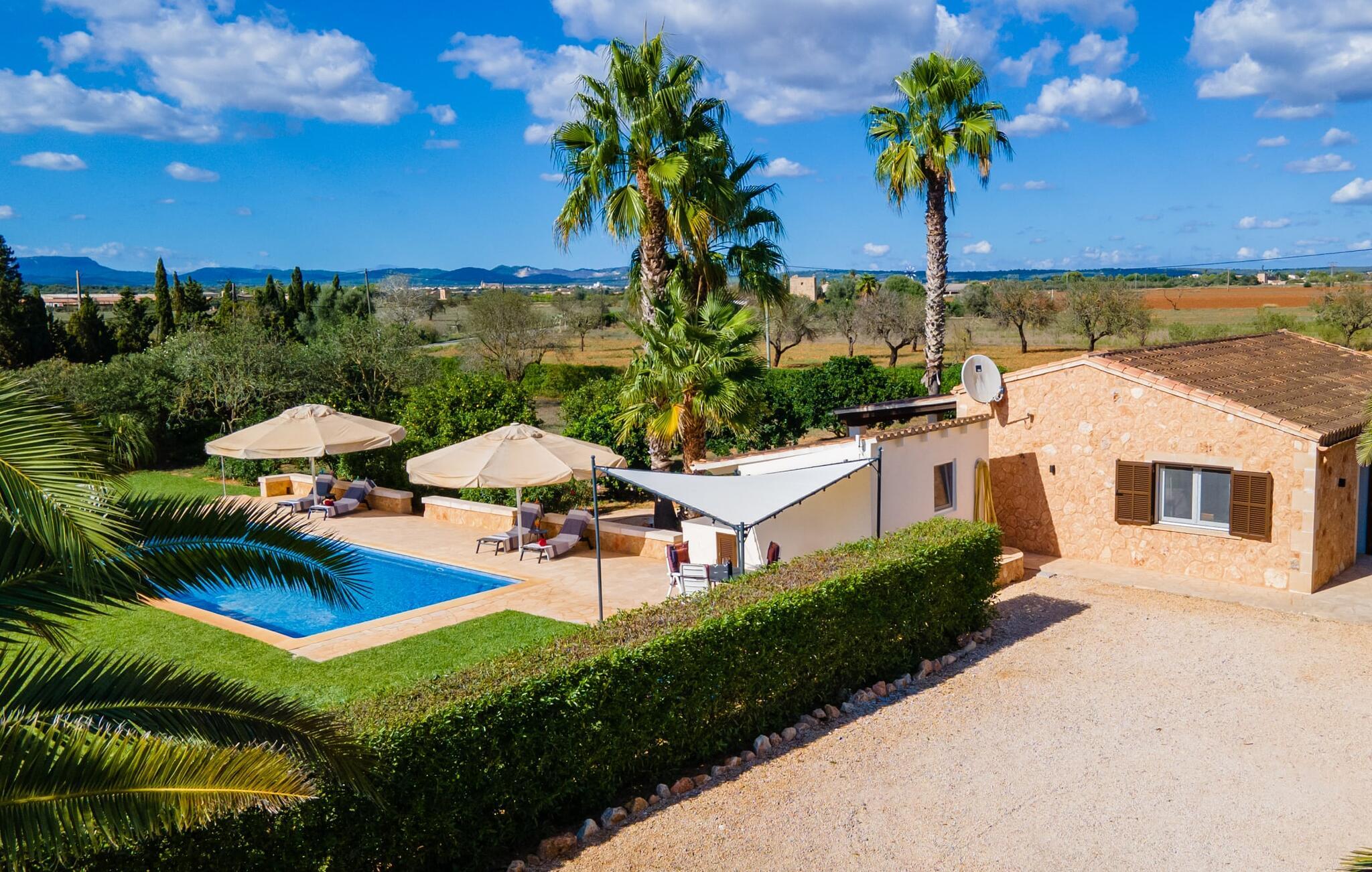 Så snart I træder ind i jeres smukke feriehus “La Estrella” på det sydlige Mallorca, bliver I mødt af tre høje palmer. Dette venlige landsted med naturstensfacade bliver kærligt plejet af et tysk par. Den ene side af ejendommen er indrettet med en orange have. Den anden del er dedikeret til en pragtfuld solterrasse med skøn pool og masser af velholdt græsplæne. Brug gerne god tid udendørs ved at benytte det store udekøkken med grill og køleskab! Lige ved siden af indbyder en stor, oplyst pavillon med en smuk spiseplads til at nyde jeres frisklavede måltider og skønne middelhavssommernætter. I øvrigt: I vil især sætte pris på den skyggefulde parkeringsplads til biler og motorcykler på parkeringspladsen i den varme årstid. På grund af sin beliggenhed tæt på den akustisk mærkbare forbindelsesvej mellem Campos og Colonia de Sant Jordi, kan I nå smukke strande på få minutter i bil. Smagfuld indretning og masser af naturligt dagslys præger opholdsrummet i stueetagen i dette charmerende feriehus. Velholdte møbler og behagelige farver skaber en venlig atmosfære. Når I træder ind i landstedet, bliver I mødt af en lys spisestue. Til højre er der et rummeligt, veludstyret køkken. Stuen fremhæves af en behagelig sofa. En anden dør til venstre for stuens indgang fører ind til et badeværelse med bruser. Herfra kan I også få adgang til de hyggelige soveværelser, som alle er udstyret med aircondition og varme. Fra stuen er der også udgang til den skønne, overdækkede terrasse foran huset. Feriehuset ligger cirka 5 minutters kørsel syd for landsbyen Campos. Her finder I supermarkeder og restauranter. Feriebyen Colònia de Sant Jordi med sin lille havn og lange sandstrande ligger 10 minutter væk i bil. De naturlige strande i Es Trenc og Sa Ràpita ligger 15 km derfra.