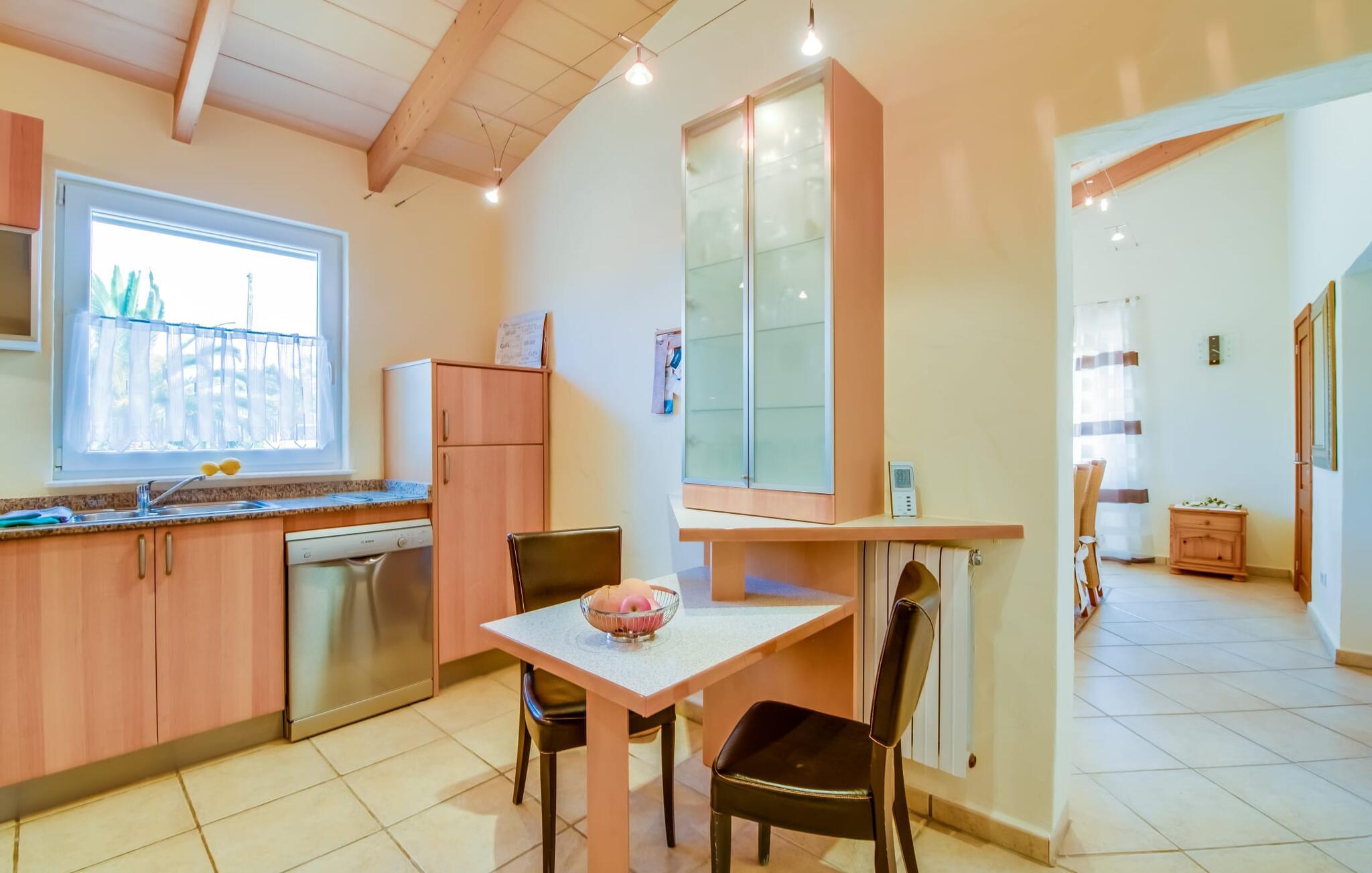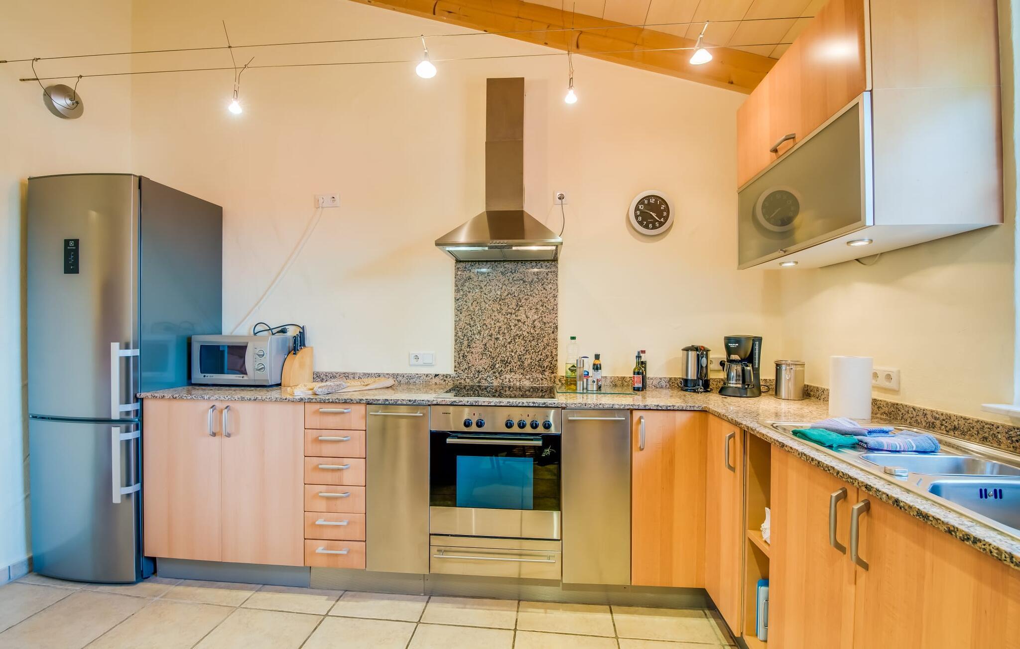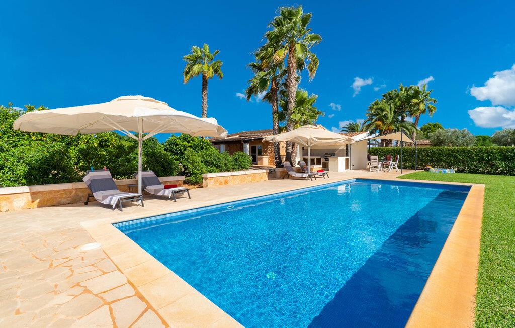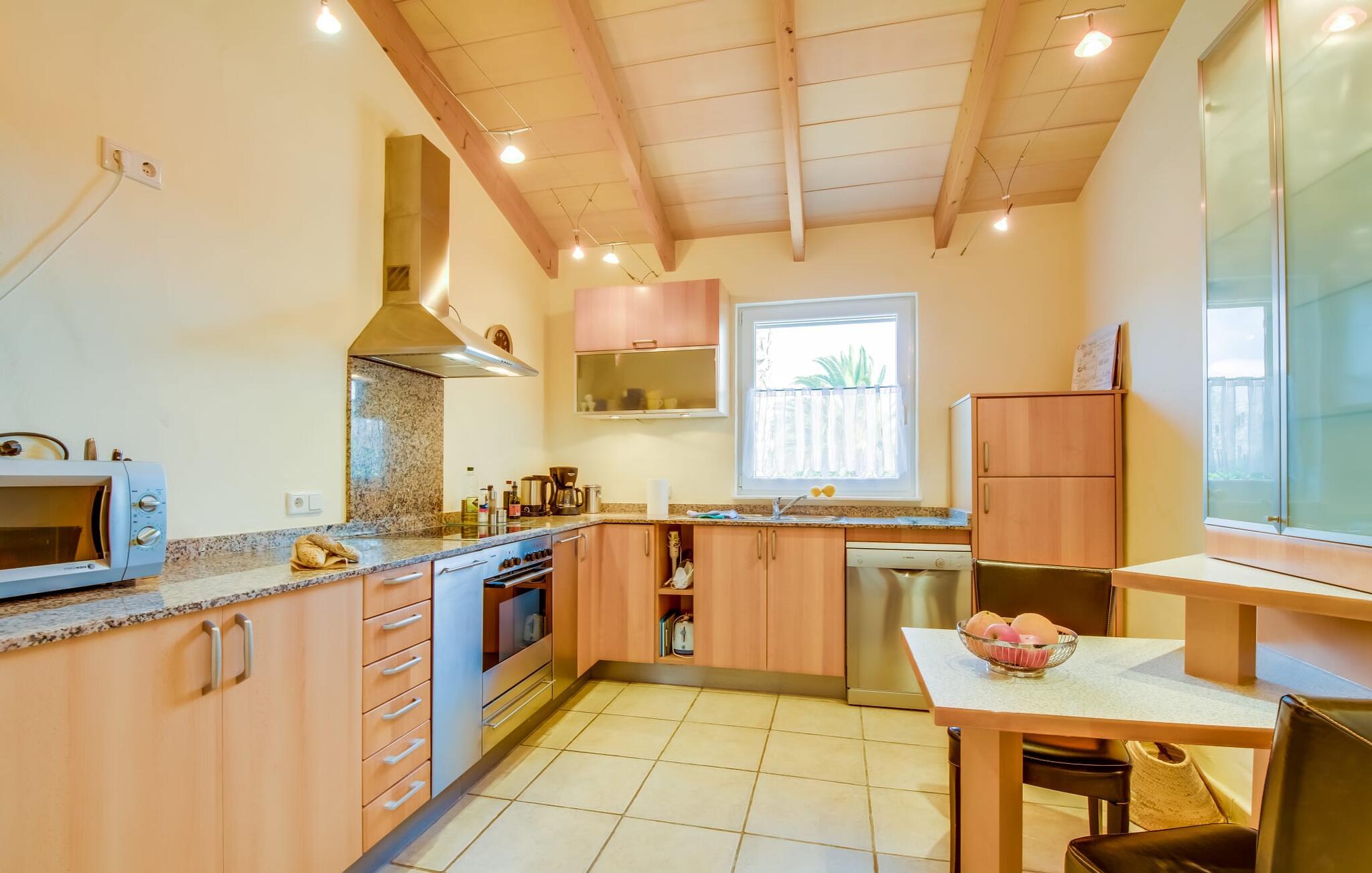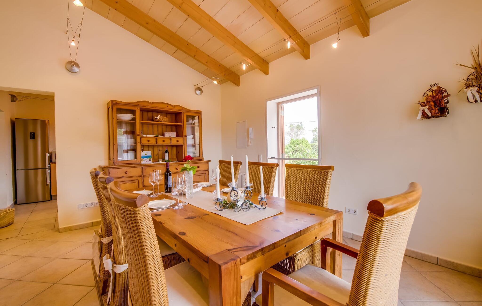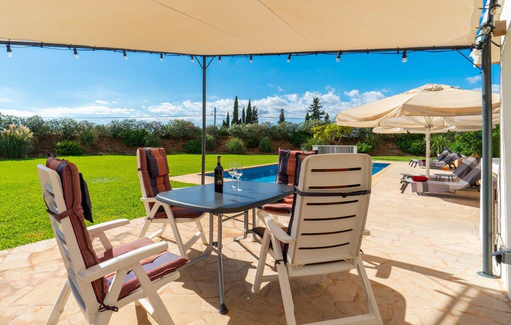 Så snart I træder ind i jeres smukke feriehus “La Estrella” på det sydlige Mallorca, bliver I mødt af tre høje palmer. Dette venlige landsted med naturstensfacade bliver kærligt plejet af et tysk par. Den ene side af ejendommen er indrettet med en orange have. Den anden del er dedikeret til en pragtfuld solterrasse med skøn pool og masser af velholdt græsplæne. Brug gerne god tid udendørs ved at benytte det store udekøkken med grill og køleskab! Lige ved siden af indbyder en stor, oplyst pavillon med en smuk spiseplads til at nyde jeres frisklavede måltider og skønne middelhavssommernætter. I øvrigt: I vil især sætte pris på den skyggefulde parkeringsplads til biler og motorcykler på parkeringspladsen i den varme årstid. På grund af sin beliggenhed tæt på den akustisk mærkbare forbindelsesvej mellem Campos og Colonia de Sant Jordi, kan I nå smukke strande på få minutter i bil. Smagfuld indretning og masser af naturligt dagslys præger opholdsrummet i stueetagen i dette charmerende feriehus. Velholdte møbler og behagelige farver skaber en venlig atmosfære. Når I træder ind i landstedet, bliver I mødt af en lys spisestue. Til højre er der et rummeligt, veludstyret køkken. Stuen fremhæves af en behagelig sofa. En anden dør til venstre for stuens indgang fører ind til et badeværelse med bruser. Herfra kan I også få adgang til de hyggelige soveværelser, som alle er udstyret med aircondition og varme. Fra stuen er der også udgang til den skønne, overdækkede terrasse foran huset. Feriehuset ligger cirka 5 minutters kørsel syd for landsbyen Campos. Her finder I supermarkeder og restauranter. Feriebyen Colònia de Sant Jordi med sin lille havn og lange sandstrande ligger 10 minutter væk i bil. De naturlige strande i Es Trenc og Sa Ràpita ligger 15 km derfra.