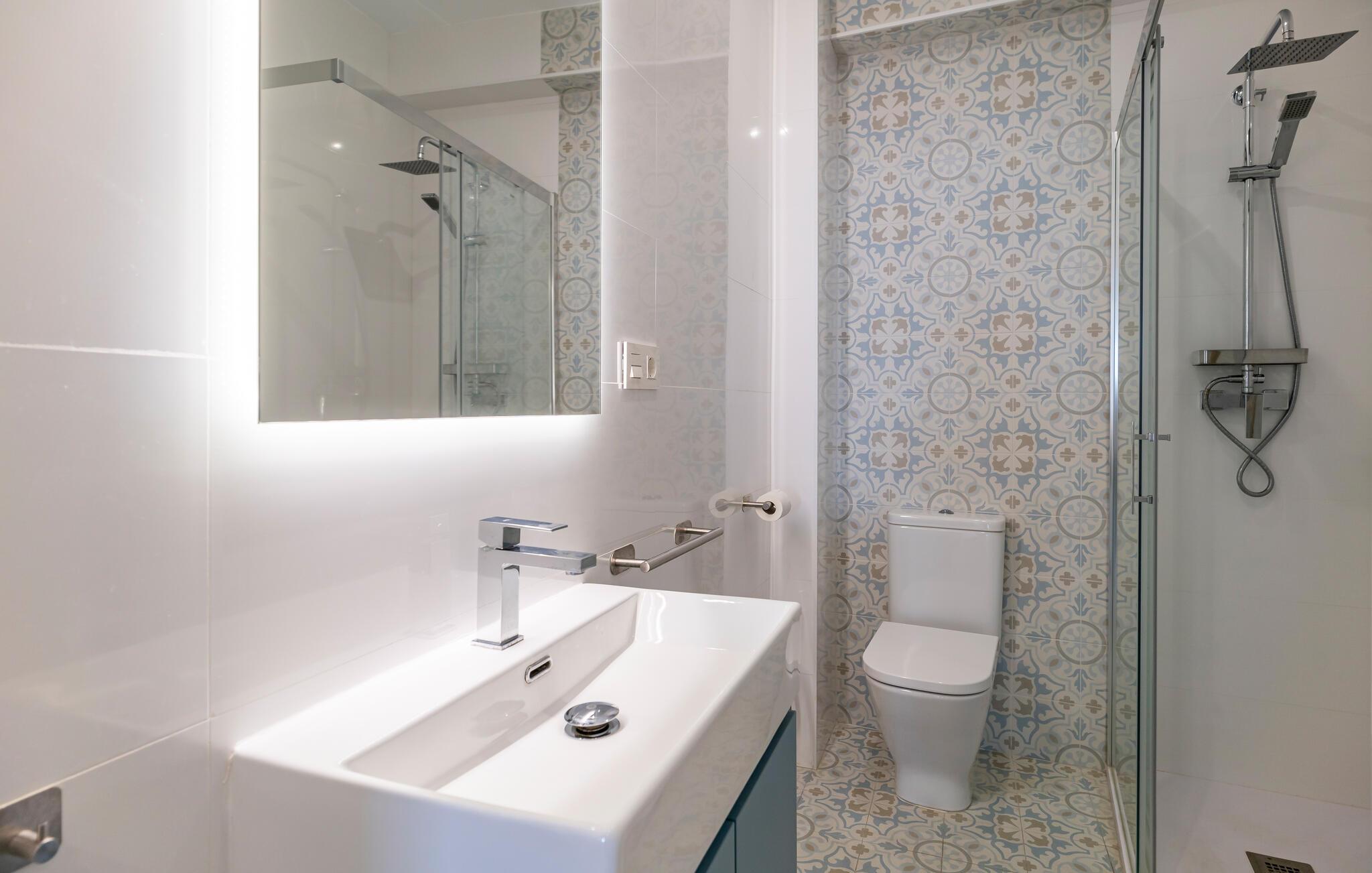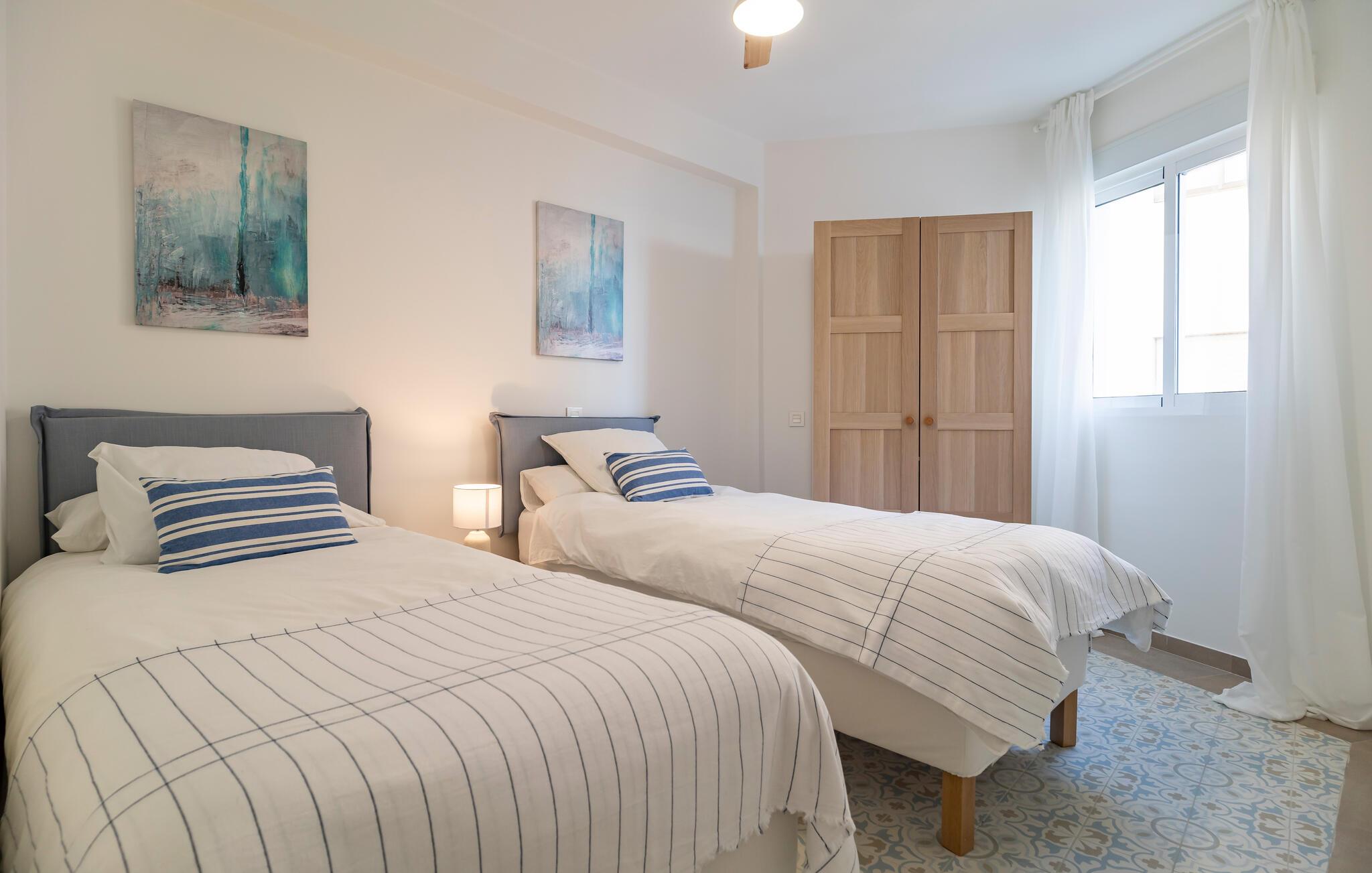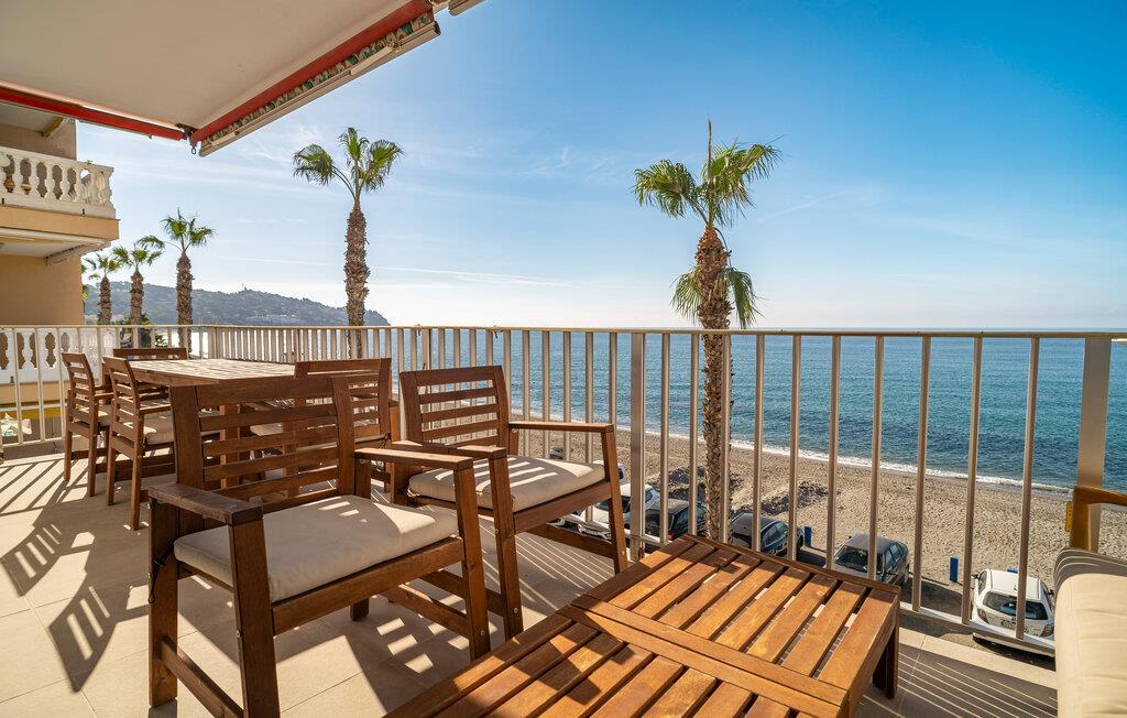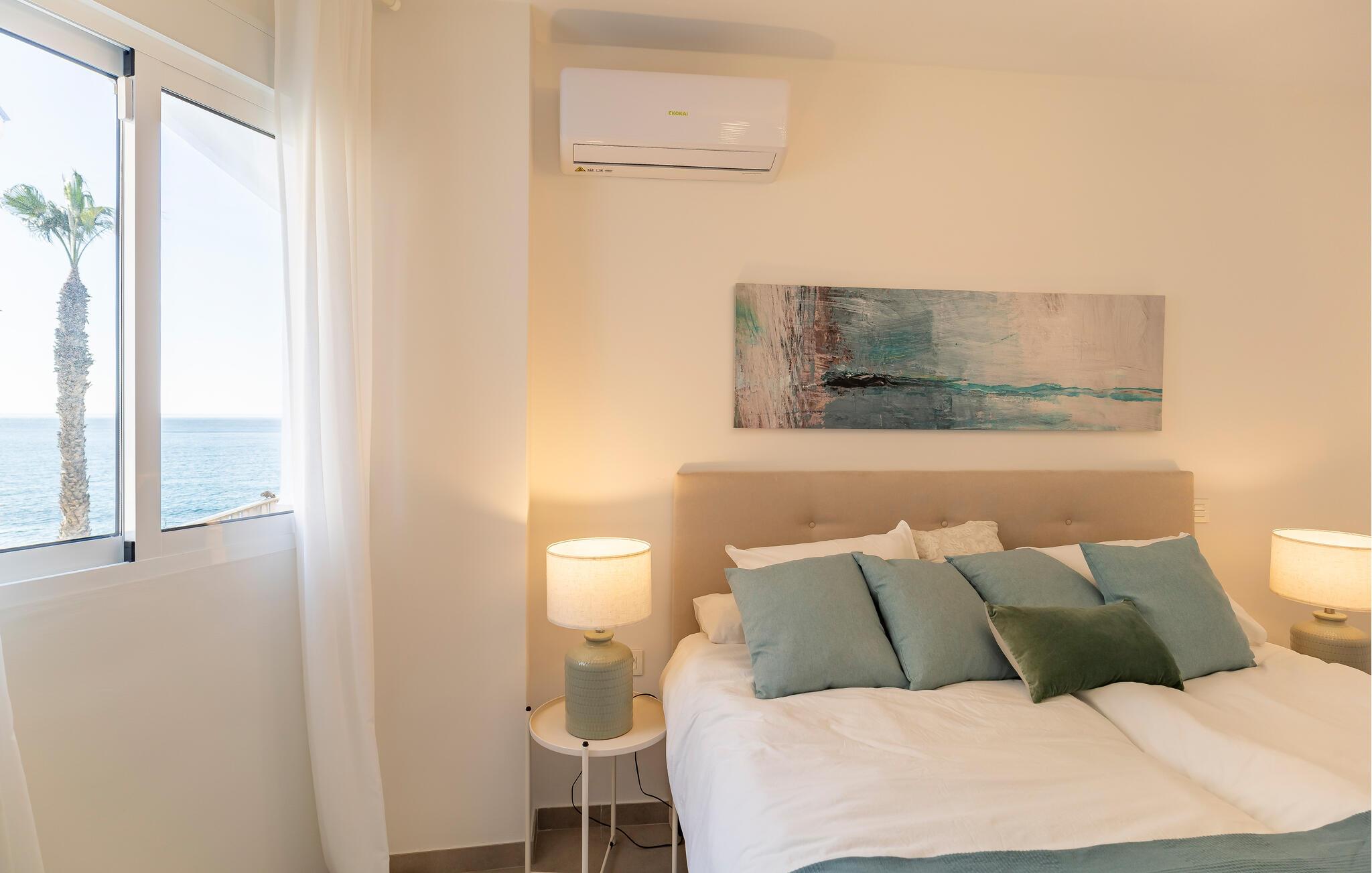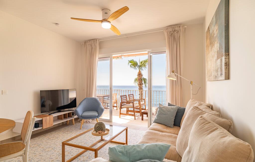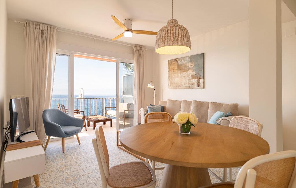 Denne moderne og komfortable bolig ligger i første række til vandet og forkæler jer med en uforglemmelig udsigt over havet. Den smagfulde og omhyggeligt udvalgte indretning skaber et behageligt opholdsmiljø, hvor I kan føle jer helt hjemme. Nyd afslappende stunder i den lyse stue, tilbered tapas i det veludstyrede køkken, eller slap af på balkonen, hvor havudsigten lægger op til drømmende øjeblikke.