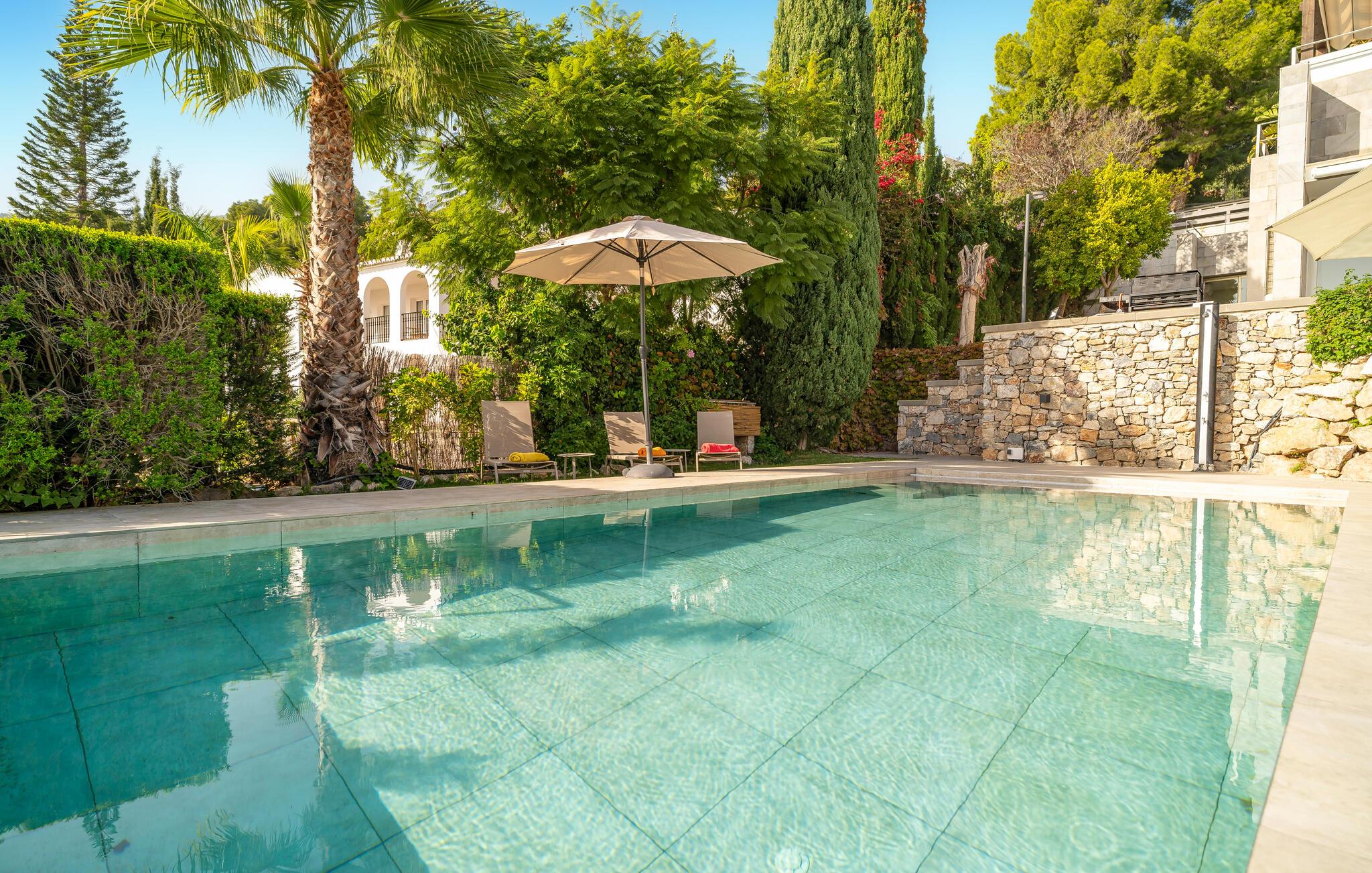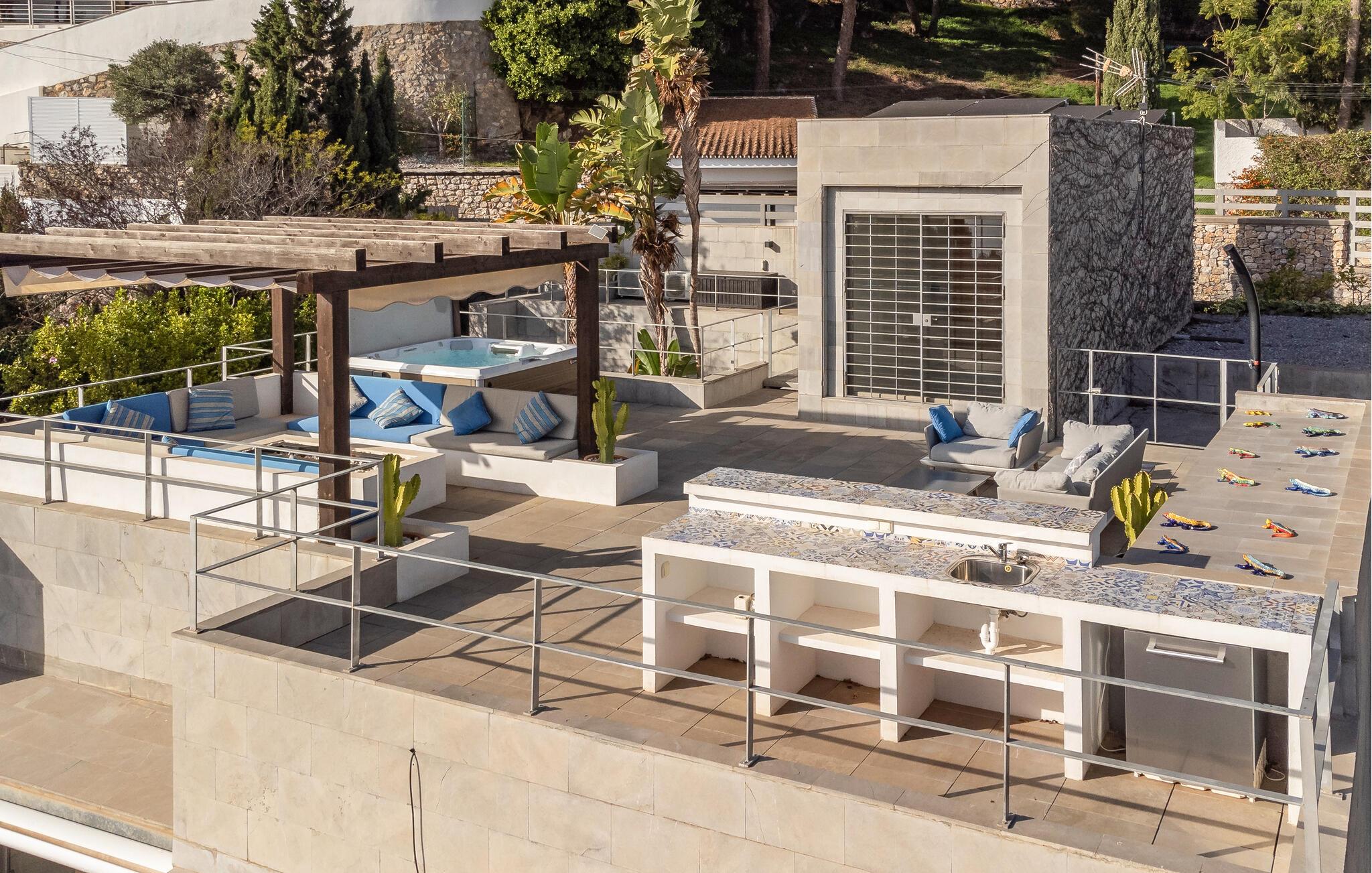 Denne smukke villa i La Herradura lader intet tilbage at ønske: Med et storslået havpanorama, stilfulde værelser og en åben planløsning tilbyder den de perfekte rammer for jeres drømmeferie. Vågn op til udsigt over det glitrende vand og gå direkte fra jeres soveværelse ud på terrassen. Den rummelige have strækker sig over flere niveauer med terrasser, hvor I kan slappe af. Uanset om det er hyggelige aftener ved bålstedet, en tur i spabadet eller en dukkert i swimmingpoolen - her finder I det ideelle sted at slappe af og nyde livet.