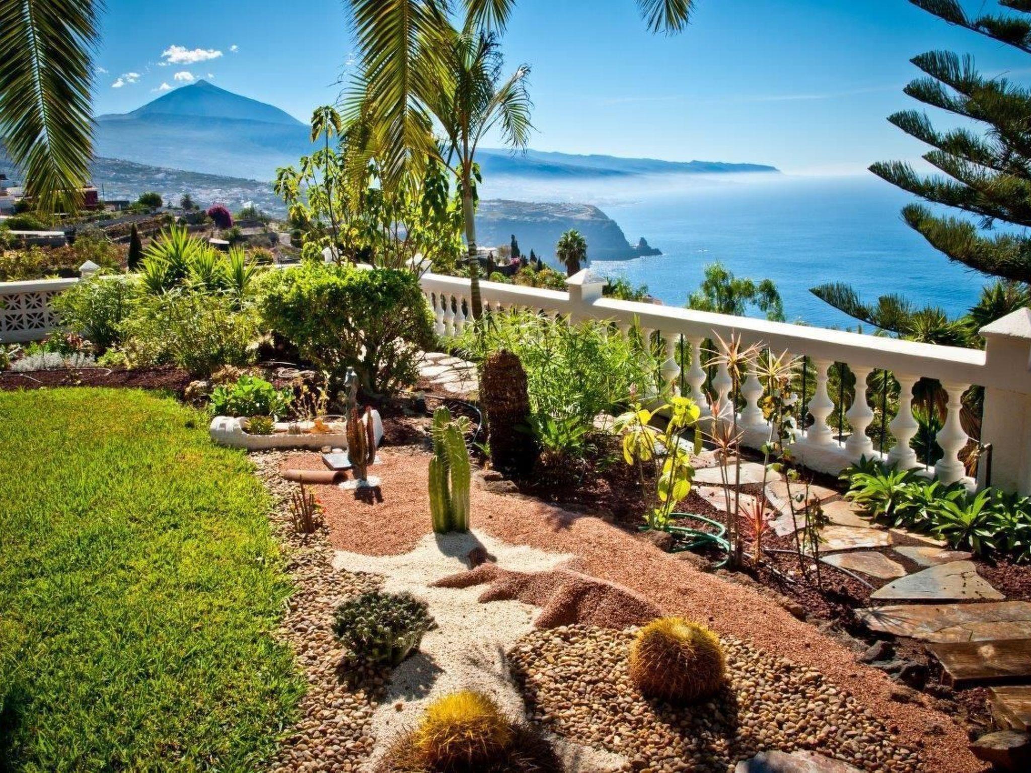 The flat also has a cosy, typical Canarian balcony for quiet hours. Let your gaze wander over the garden area, to the Teide, Puerto de la Cruz and the sea. There is also a sunbathing lawn with sun loungers in the large garden with typical Canarian plants.