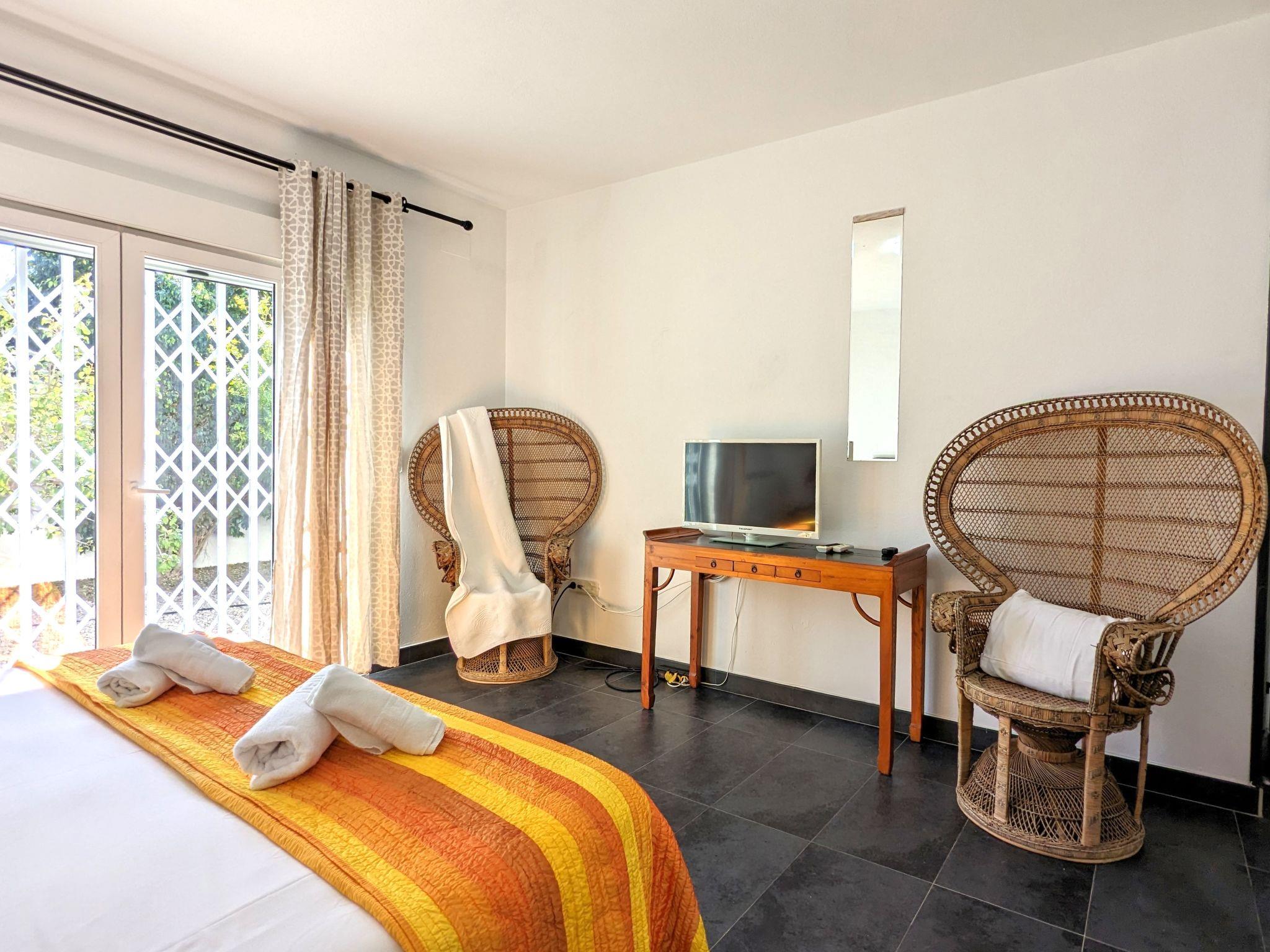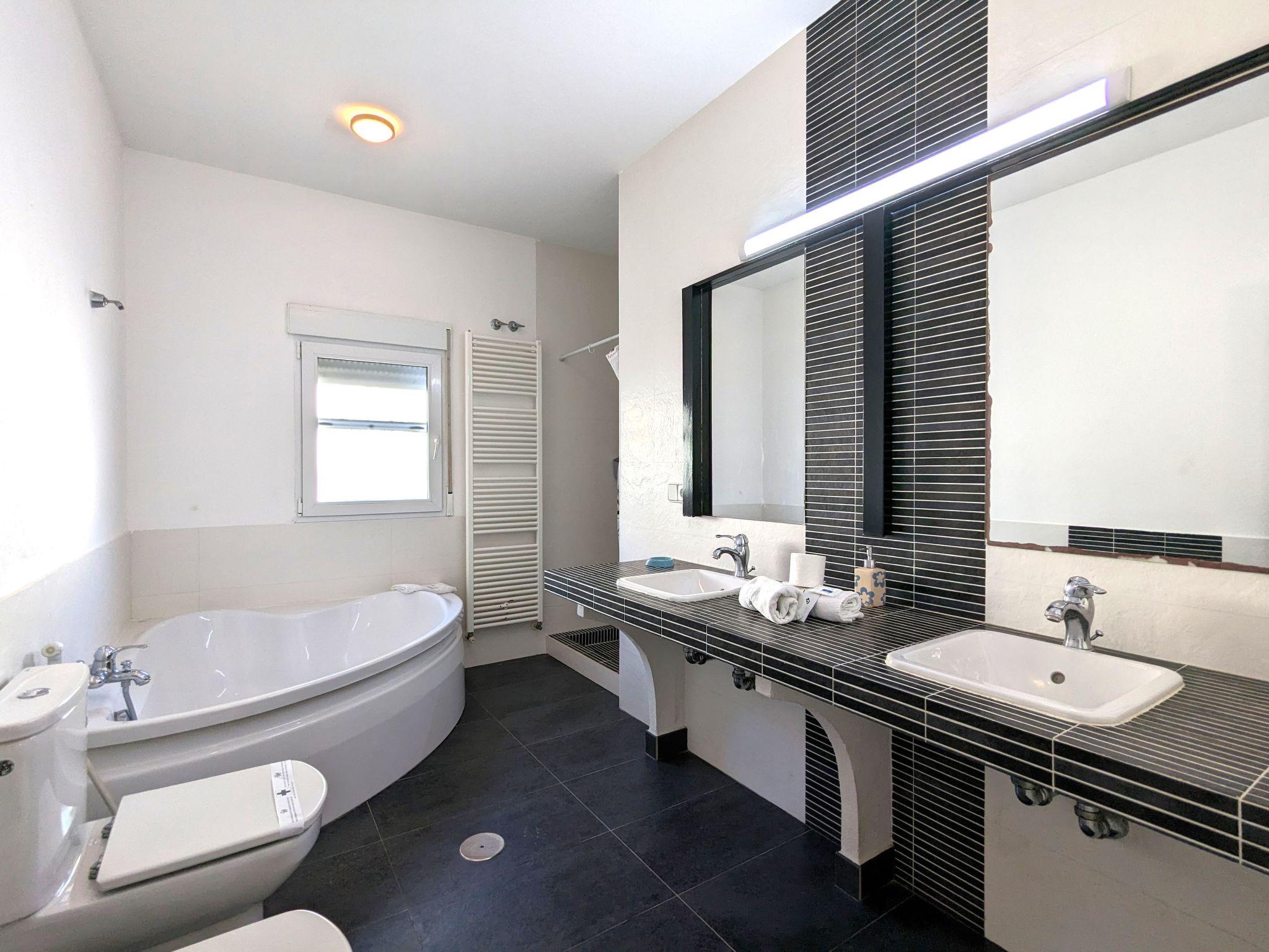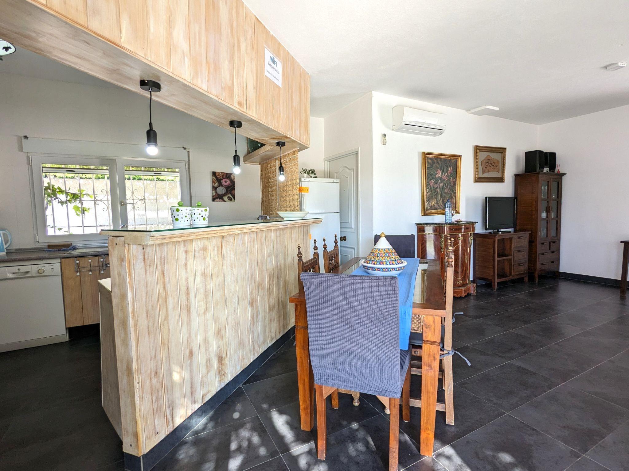 "Mexico", 4-room house 110 m2. Object suitable for 6 adults. Spacious and bright, simple and practical furnishings: living/dining room 30 m2 with digital TV, air conditioning and forced-air heating. Exit to the garden, to the terrace, to the swimming pool. 1 room 22 m2 with 1 french bed (160 cm, length 190 cm), bath/WC, air conditioning and forced-air heating. Exit to the garden, to the terrace. 1 room 9 m2 with 2 beds (90 cm, length 190 cm), air conditioning and forced-air heating. 1 room 9 m2 with 2 beds (90 cm, length 190 cm), fan. Kitchenette (oven, dishwasher, 4 ceramic glass hob hotplates, toaster, kettle, microwave, freezer, electric coffee machine). Exit to the garden, to the terrace, to the swimming pool. Shower/bidet/WC. Terrace, patio 300 m2. Terrace furniture, deck chairs (3). View of the swimming pool, the garden and the resort. Facilities: washing machine, iron, hair dryer. Internet (WiFi, free). At the house. EGVT-593-A. VT-447189-A // Reg. Nr.: ESFCTU00000305300037003800000000000000000VT-447189-A4
