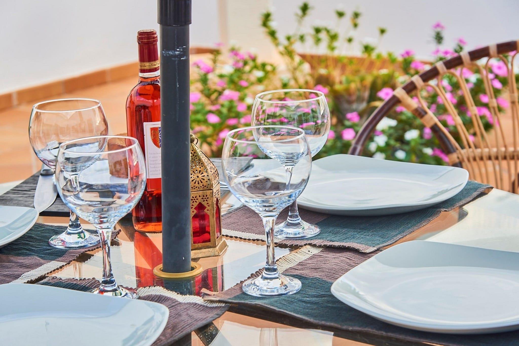 Stueetage: (Indgang , Stue(sofahjørne, køle-fryseskab), spisestue(spisebord(10 personer)), Køkken(spisebord, brødrister, komfur(Komfur med fire kogeplader, induktion), ovn, mikrobølgeovn, opvaskemaskine , køle-fryseskab), soveværelse(enkeltseng(90 x 190 cm), enkeltseng(90 x 190 cm)), soveværelse(2x enkeltseng(90 x 190 cm)), soveværelse(2x enkeltseng(90 x 190 cm)), Soveværelse med badeværelse(dobbeltseng(135 x 190 cm), badekar med bruser, håndvask, toilet, bidet), Soveværelse med badeværelse(dobbeltseng(135 x 190 cm), badekar med bruser, håndvask, toilet, bidet), badeværelse(badekar med bruser, håndvask, toilet, bidet), badeværelse(badekar med bruser, håndvask, toilet, bidet), klimaanlæg) solarium, terrasse, terrasse, havemøbler, solstole, grill(trækul), Parasol, swimmingpool(privat, naturlig svømmedam, 8 x 5 m., opened from Jan upto and including Dec), barneseng, barnestol