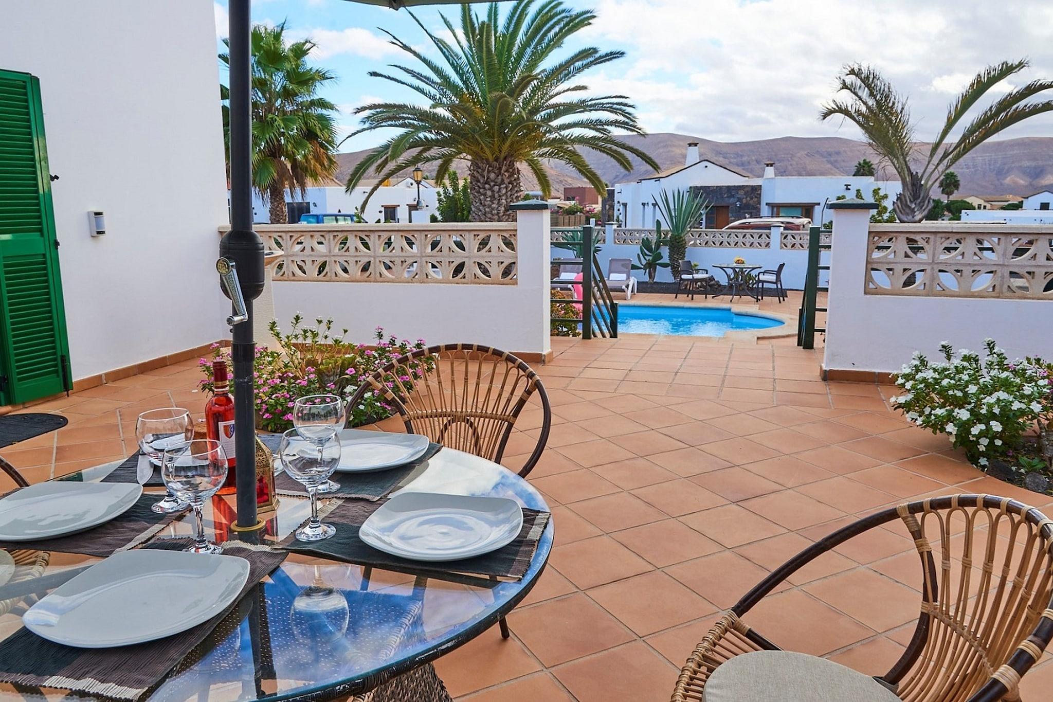 Dette rummelige hus inviterer dig til at nyde en dejlig ferie i Fuerteventura. Det gode vejr hele året og den rolige beliggenhed væk fra travlhed med turistattraktioner er blot nogle af fordelene ved dette vidunderlige sted. Huset er bygget i en U-form med to terrasser i midten; ideel til morgenmad eller middag med udsigt over vulkanen. Den storslåede saltvandspool har et termisk system, der gør den halvopvarmet, så du kan nyde det hele året rundt. La Oliva ligger 1 km væk, det er en lille by nord for Fuerteventura. Når du besøger området, kan du nyde den smukke udsigt over det ekstraordinære vulkanske landskab. Den nærmeste strand er mod øst i Barranco de Tinojay (13,5 km). For en smuk solnedgang skal du uden tvivl gå vestpå; stærkt anbefalet El Cotillo (16 km) med en smuk robust kystlinje med skjulte strande, hvor du kan se solen gemme sig i havet. I byen er der flere restauranter, der afslutter dagen med en lækker tallerken med frisk fisk. For mere underholdning, besøg den berømte kystby Corralejo, 15 km væk. Turist, ja, men øens paradis for surfere. For mere erfarne surfere er der i nord mange andre steder at erobre bølgerne.