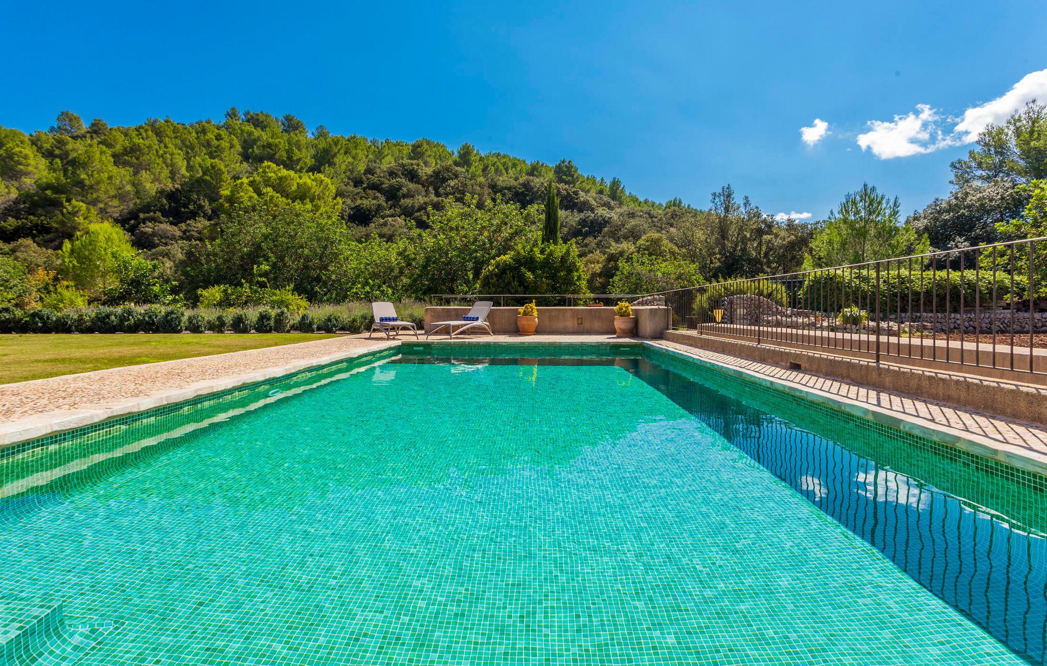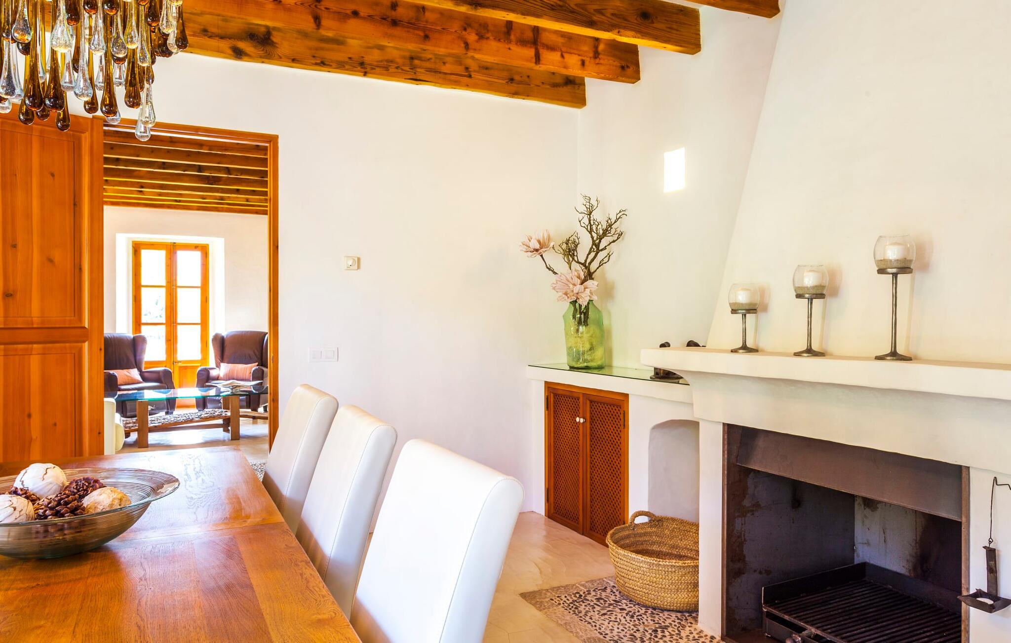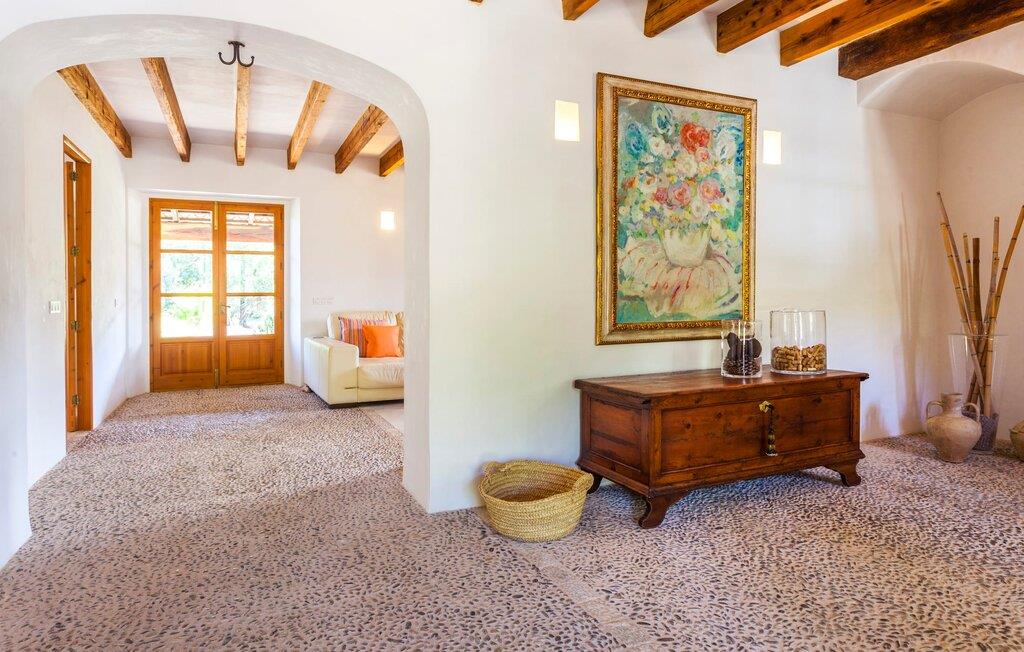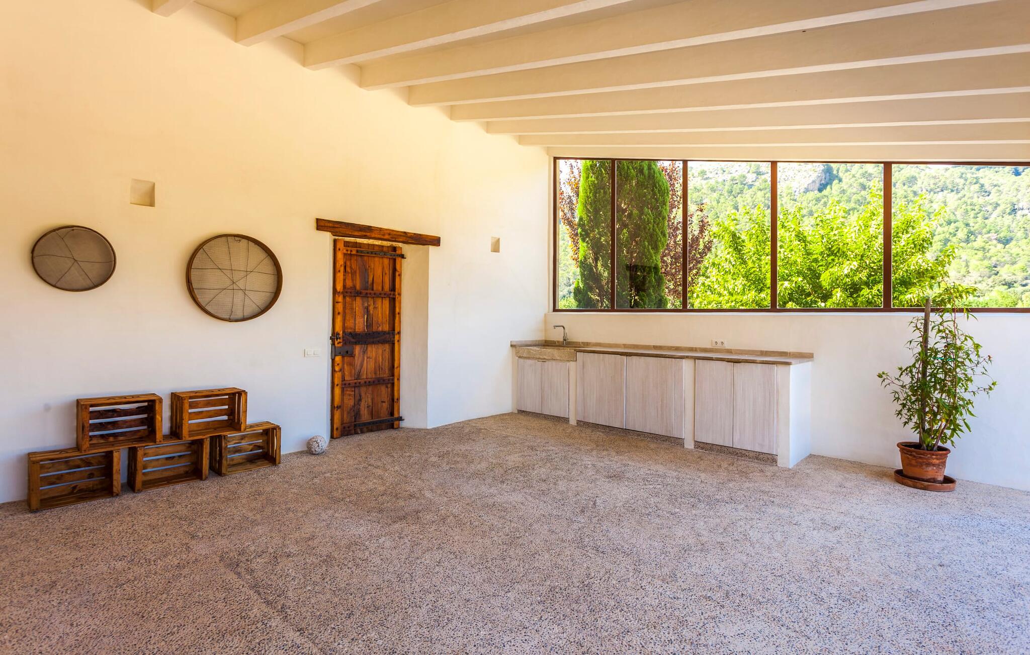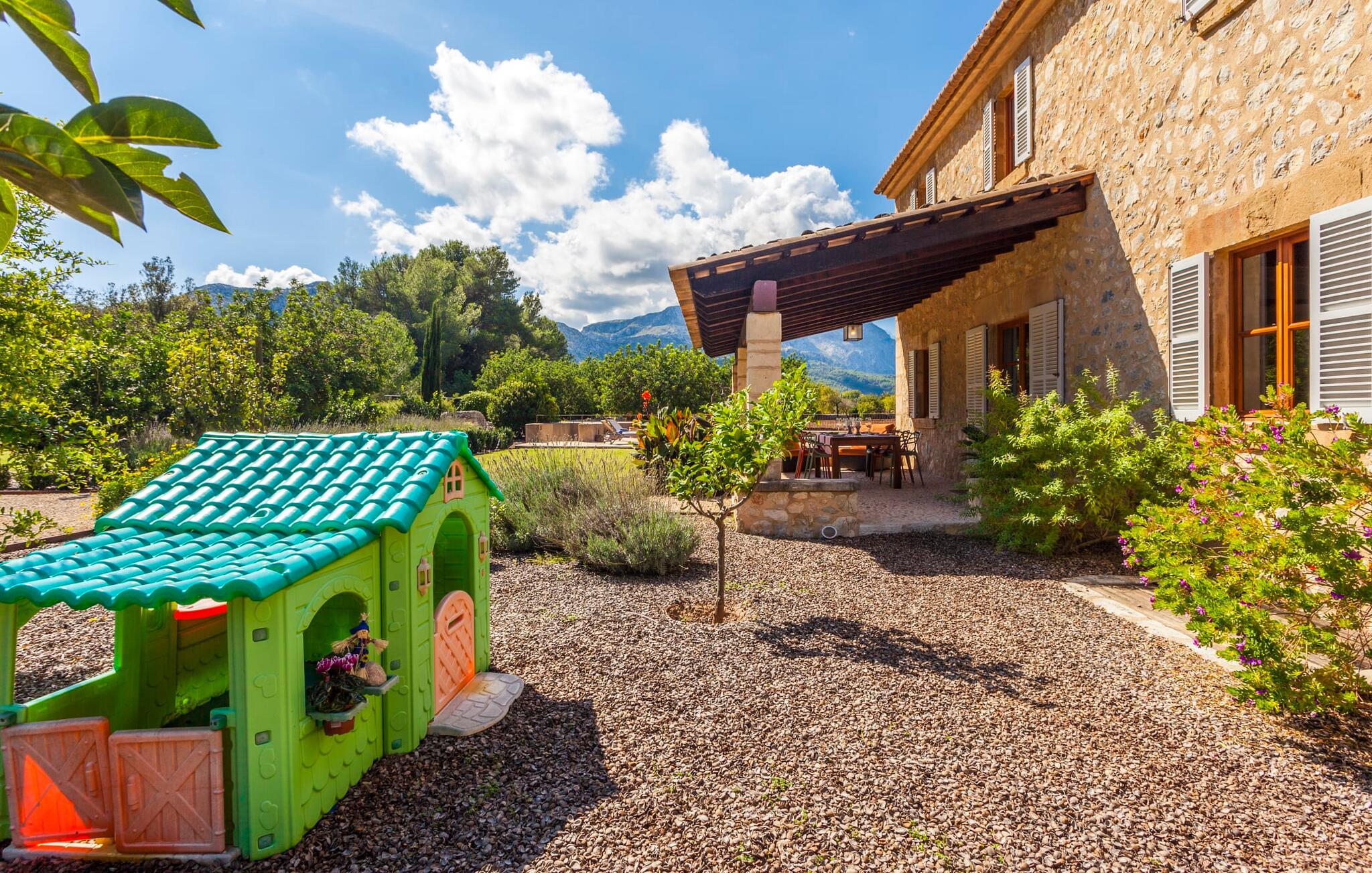 For at sige det kort: alt er lige her. Modernitet og stil møder rustikt og naturligt design. Der er også en velholdt have og møbler af høj kvalitet - for ikke at nævne den fantastiske udsigt, der vil betage enhver besøgende. Villaen med det vidunderlige navn "La Rovina" ligger i maleriske omgivelser, omgivet af middelhavsbuske, palmer og skovklædte bakker - dette er i sandhed Mallorca. Poolen med trappegulve og en smuk naturlig terrasse lover masser af svømmesjov og en afslappende tid på ferien. Der er også liggestole og en smart pergola, der giver behagelig skygge. Børnegyngen er placeret ved poolen, så I kan holde øje med de små, selv når I ligger ned. Der er også et legehus og en sandkasse til børnene. Bag huset finder I en overdækket terrasse med rustikt træbord og stilfulde stole. Herfra kan I nyde en vidunderlig udsigt over den frodige grønne have, som er nænsomt designet ned til mindste detalje. Et vidunderligt sted at afslutte en mild sommeraften. En flaske spansk rødvin med et par oliven og duften af lavendel fylder jeres næse. I kan nyde fuldstændig privatliv på ejendommen - ikke så mærkeligt, da selve ejendommen er 40.000 m² stor. En normal, delvist asfalteret jordvej fører direkte til huset, hvor der er parkering til op til otte biler og to garagepladser. Den gode nyhed er, at La Rovinas interiørdesign matcher charmen ved dets ydre. Der er moderne udstyr af høj kvalitet overalt, men det sker ikke på bekostning af komforten; her er meget hyggeligt. Store værelser, lyse vinduer, smart indretning og sofistikeret tilbehør viser villaen fra sin bedste side. Den rummelige veranda fører direkte ind i stuen med pejs, fladskærms-tv og lædermøbler. Varme farver blander sig problemfrit med omhyggeligt udvalgte træaccenter, mens åbne altaner og stengulve fremhæver den naturlige skønhed og atmosfære. Lige ved siden af finder I den fremragende spisestue med pejs og åben passage til køkkenet. Her bliver hver madlavningsaften sammen en skøn lejlighed. I alt har den to-etagers villa tre soveværelser (to med enkeltsenge, et med dobbeltseng) og fire meget moderne badeværelser. Lidt ekstra – myggenet, der ikke kun forhindrer irriterende bid, men også giver ekstra komfort. "La Rovina" ligger direkte på kanten af Tramuntana-bjergene, omkring 2,5 km vest for Pollença, i den nordlige del af Mallorca. Placeringen af den rustikt designede moderne villa kunne næsten ikke være mere malerisk - udsigten er simpelthen betagende. Shopping kan nemt gøres til fods, og den smukke strand Platja de Port de Pollença ligger lidt over 7 km væk. Det populære feriested Alcúdia er heller ikke mere end en halv time væk. Bemærk venligst, at denne ejendom ikke accepterer ungdomsgrupper eller polterabender. En ungdomsgruppe på denne ejendom består af personer under 30 år. Book ikke denne ejendom, hvis I er en ungdomsgruppe eller polterabend, da jeres reservation vil blive afvist, når den er booket, hvilket også kan være tilfældet ved ankomst til ejendommen eller under jeres ophold, og I vil ikke modtage en refusion