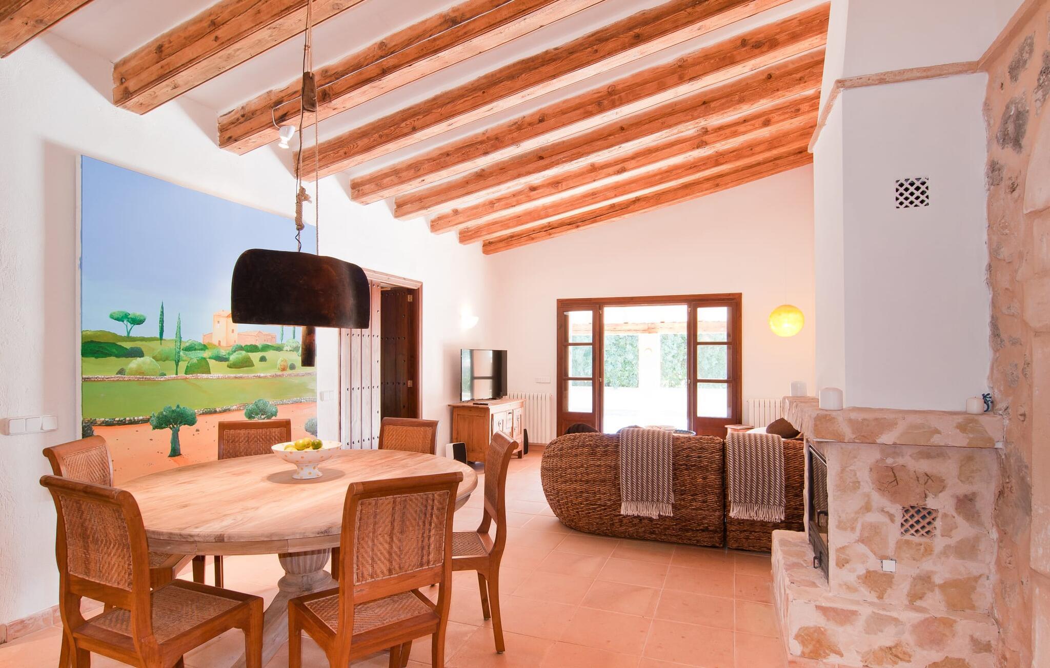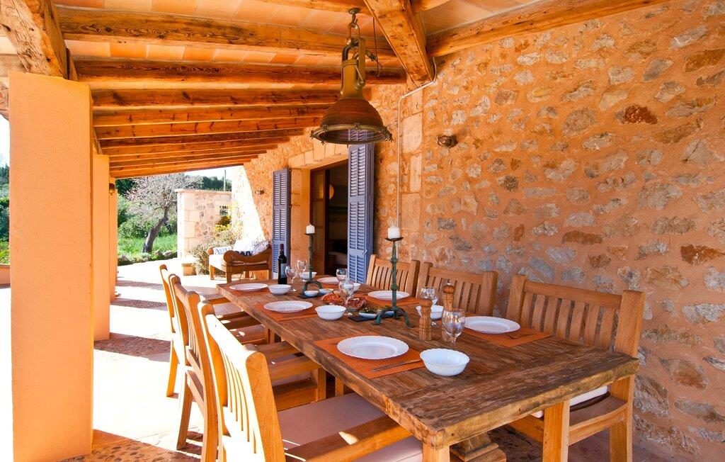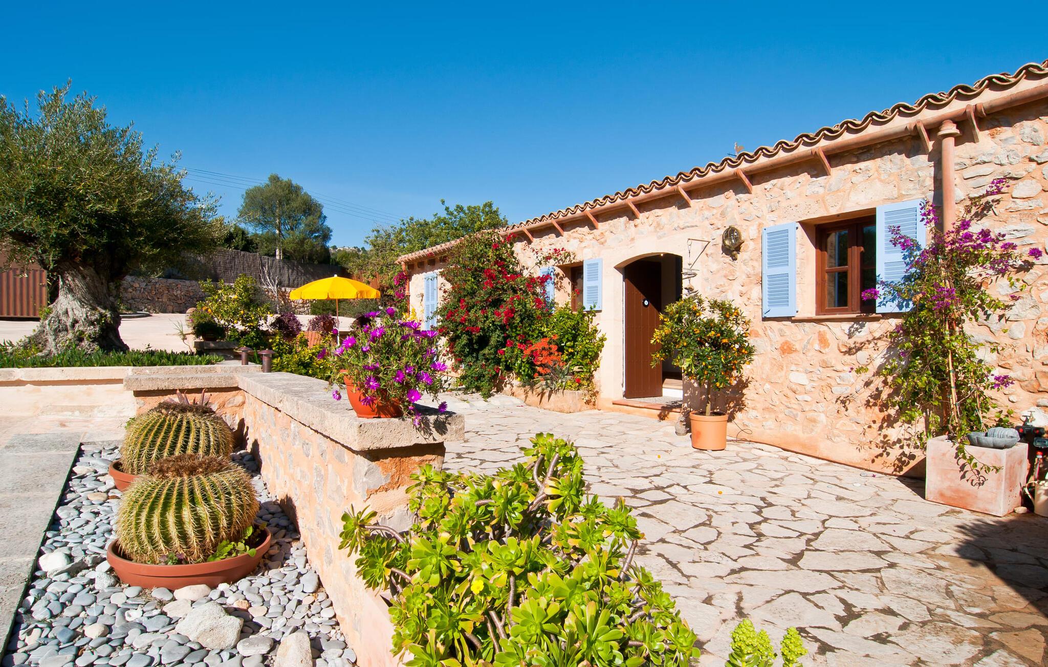 Villa "La Serendipia" tilbyder alt hvad I behøver for en billedskøn ferie. Læn jer tilbage og nyd de paradisiske omgivelser i dette landlige område. Ejendommen grænser direkte op til et naturreservat og fire nærliggende golfbaner. Selve huset er omgivet af en grøn oase: oleandere, unge træer, bougainvillea, kaktusser, mandeltræer og et hundrede år gammelt oliventræ udgør et fortryllende ensemble, der inviterer til at opdage den let hævede terrasse bag huset. En smuk pool er beliggende rundt om et soldæk med massivt træ liggestole og en bænk. Terrassens terracotta klinkegulv afspejler denne villas varme karakter, som tilbyder jer en helt speciel lille perle: Der er et afskærmet loungeområde på terrassen for alle sol- eller stjernedyrkere. De rustikke stenmure bidrager også til denne ejendoms traditionelle karakter, hvor I kan blive forkælet fra top til tå. Og når det kommer til at forkæle jer selv, vil den indbyggede grill med glæde rumme jer, hvor delikatesser fra det nærliggende hav nænsomt kan tilberedes til perfektion og spises ved det stilfulde naturlige træbord på den overdækkede veranda. En anden terrasse, også tilgængelig via et af soveværelserne, er placeret på den ene side af huset. Når I sidder her i selskab med et lille citrontræ og smiler til solen, vil I glæde jer over, at det er lykkedes arkitekten så godt at skabe så beskyttede oaser som denne terrasse. Interiøret understreger kun dette indtryk: boligarealet er enkelt; Naturlige farver og en hyggelig pejs midt i rummet sætter tonen her, samt et stort maleri, der viser det mallorcanske landskabs lighed med de smukkeste seværdigheder i Toscana. Rattan sofaen og spisepladsen passer perfekt ind i denne fincas naturlige stil; Hans uberørte, jordnære måde inviterer sine gæster til at slukke og nyde hvert øjeblik af livet fuldt ud. Køkkenet forbliver også tro mod denne enkle elegance og tilbyder med sine varme trætoner al den boligkomfort, I behøver for at frigøre jer fra alle husholdningsproblemer under jeres ophold. Vaskemaskine og tørretumbler er tilgængelige i et separat bryggers. De tre soveværelser, hvoraf to har eget badeværelse, har små dekorative detaljer som en skibsfigur eller en stor konkylie, der tilføjer et maritimt præg, der på ingen måde forringer villaens rene linjer. Træmøblerne minder jer altid om interiøret i et elegant skib og giver jer følelsen af at være tæt på havet hele dagen lang. Så snart I lukker øjnene ved villa "La Serendipia" om natten, vil I blive beroliget af den fuldstændige ro i det tilstødende naturreservat. Samtidig ligger landsbyen Font de Sa Cala med sin turkisblå bugt kun 1,5 km væk, hvor fristende varer og udsøgte restauranter venter på jer. Derudover er der fire golfbaner inden for blot 5 km.