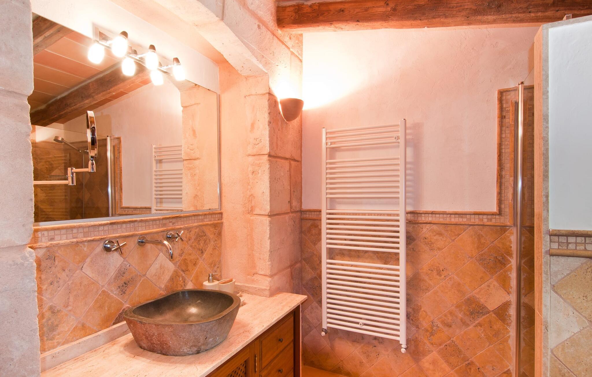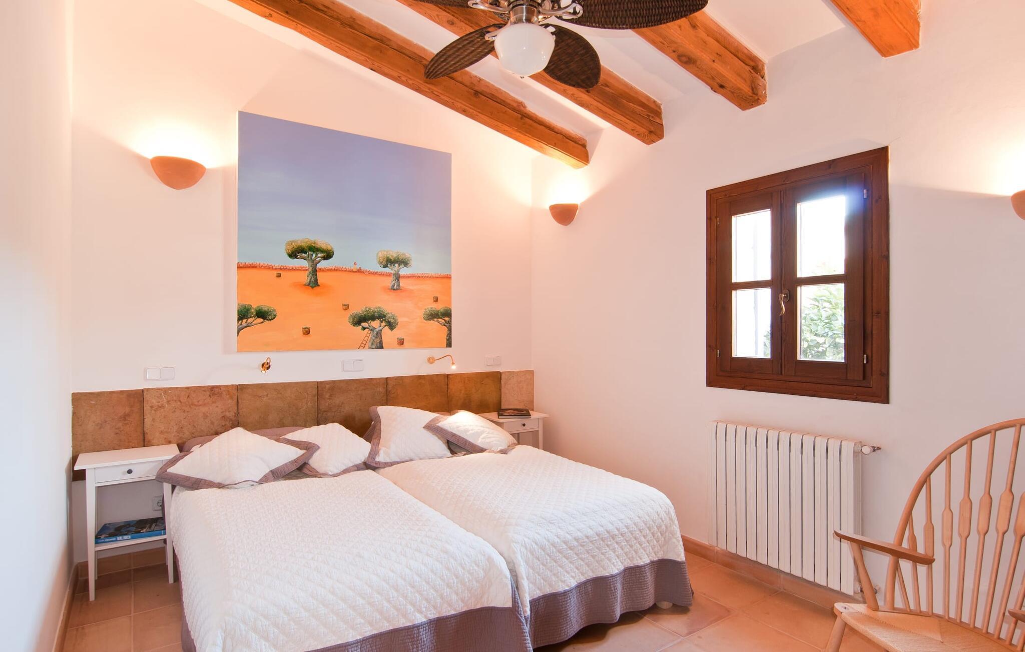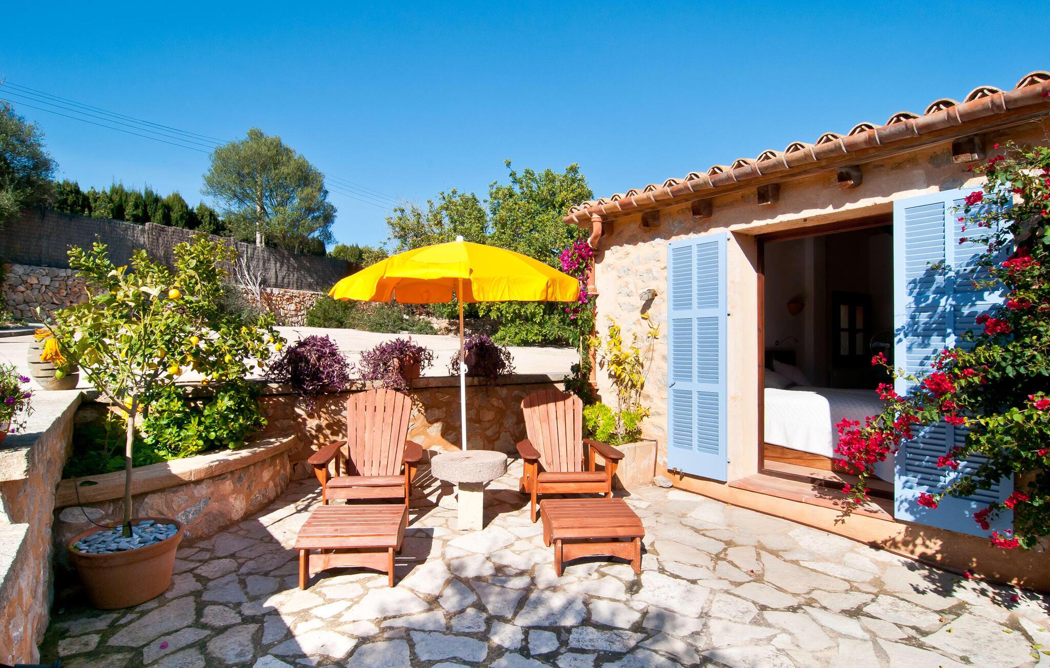 Villa "La Serendipia" tilbyder alt hvad I behøver for en billedskøn ferie. Læn jer tilbage og nyd de paradisiske omgivelser i dette landlige område. Ejendommen grænser direkte op til et naturreservat og fire nærliggende golfbaner. Selve huset er omgivet af en grøn oase: oleandere, unge træer, bougainvillea, kaktusser, mandeltræer og et hundrede år gammelt oliventræ udgør et fortryllende ensemble, der inviterer til at opdage den let hævede terrasse bag huset. En smuk pool er beliggende rundt om et soldæk med massivt træ liggestole og en bænk. Terrassens terracotta klinkegulv afspejler denne villas varme karakter, som tilbyder jer en helt speciel lille perle: Der er et afskærmet loungeområde på terrassen for alle sol- eller stjernedyrkere. De rustikke stenmure bidrager også til denne ejendoms traditionelle karakter, hvor I kan blive forkælet fra top til tå. Og når det kommer til at forkæle jer selv, vil den indbyggede grill med glæde rumme jer, hvor delikatesser fra det nærliggende hav nænsomt kan tilberedes til perfektion og spises ved det stilfulde naturlige træbord på den overdækkede veranda. En anden terrasse, også tilgængelig via et af soveværelserne, er placeret på den ene side af huset. Når I sidder her i selskab med et lille citrontræ og smiler til solen, vil I glæde jer over, at det er lykkedes arkitekten så godt at skabe så beskyttede oaser som denne terrasse. Interiøret understreger kun dette indtryk: boligarealet er enkelt; Naturlige farver og en hyggelig pejs midt i rummet sætter tonen her, samt et stort maleri, der viser det mallorcanske landskabs lighed med de smukkeste seværdigheder i Toscana. Rattan sofaen og spisepladsen passer perfekt ind i denne fincas naturlige stil; Hans uberørte, jordnære måde inviterer sine gæster til at slukke og nyde hvert øjeblik af livet fuldt ud. Køkkenet forbliver også tro mod denne enkle elegance og tilbyder med sine varme trætoner al den boligkomfort, I behøver for at frigøre jer fra alle husholdningsproblemer under jeres ophold. Vaskemaskine og tørretumbler er tilgængelige i et separat bryggers. De tre soveværelser, hvoraf to har eget badeværelse, har små dekorative detaljer som en skibsfigur eller en stor konkylie, der tilføjer et maritimt præg, der på ingen måde forringer villaens rene linjer. Træmøblerne minder jer altid om interiøret i et elegant skib og giver jer følelsen af at være tæt på havet hele dagen lang. Så snart I lukker øjnene ved villa "La Serendipia" om natten, vil I blive beroliget af den fuldstændige ro i det tilstødende naturreservat. Samtidig ligger landsbyen Font de Sa Cala med sin turkisblå bugt kun 1,5 km væk, hvor fristende varer og udsøgte restauranter venter på jer. Derudover er der fire golfbaner inden for blot 5 km.