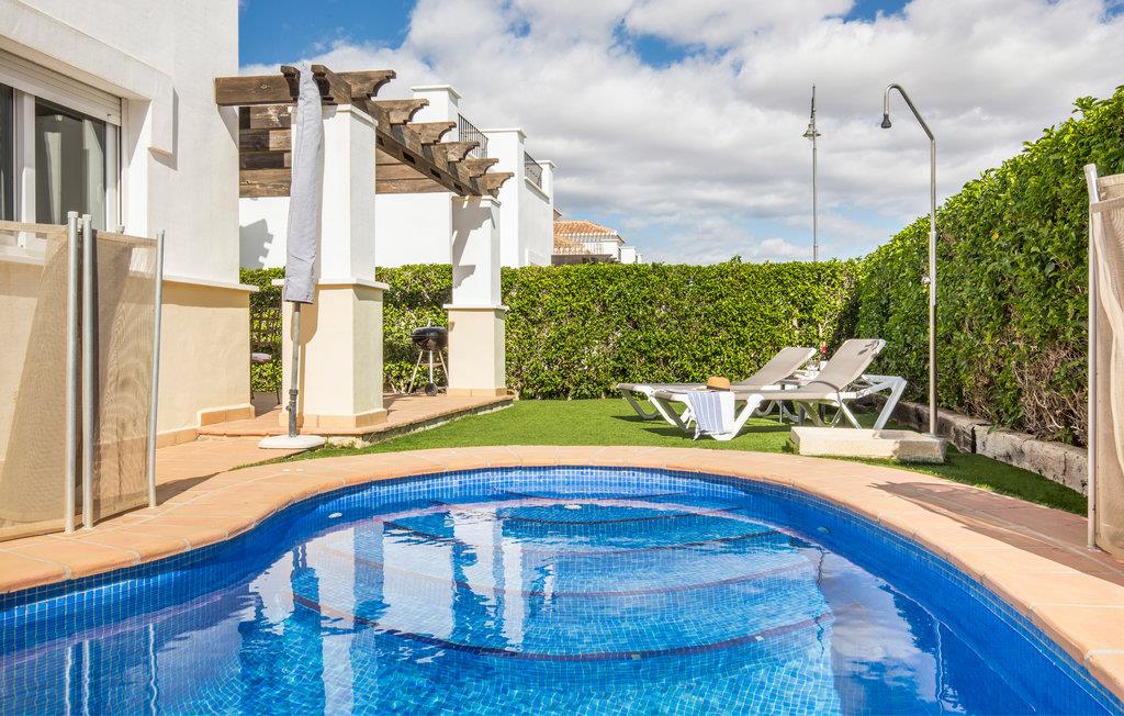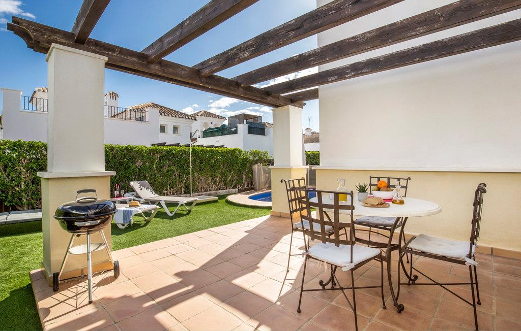 Et perfekt lille ferieparadis, med skøn terrasse og pool. Som noget helt specielt ligger huset på La Torre Golf Resort, hvis bane er designet af den legendariske golfspiller Jack Nicklaus. Hvis ikke poolen er lang nok til en energisk svømmetur, så er der mindre end 18 kilometer til stranden og middelhavet. De fælles faciliteter omfatter en italiensk restaurant, et supermarked og en irsk bar, hvor I kan hygge jer med vennerne. Der er to km til den nærmeste by Roldan og 15 km til nærmeste lufthavn.