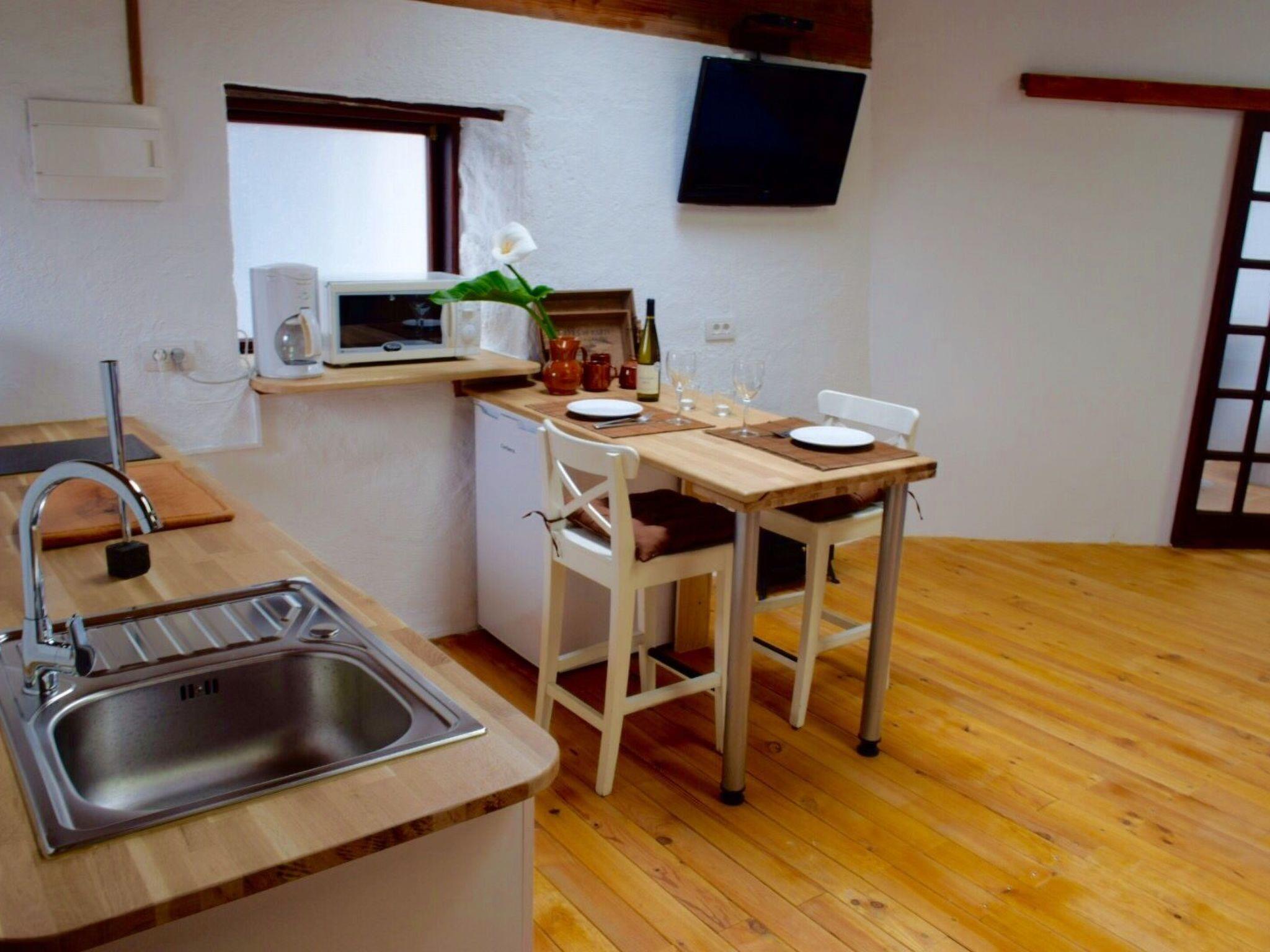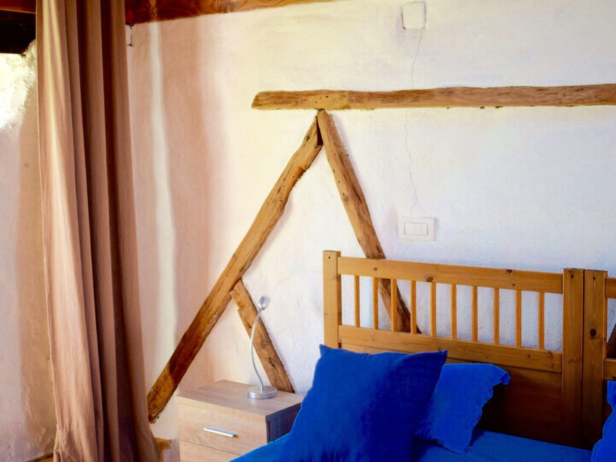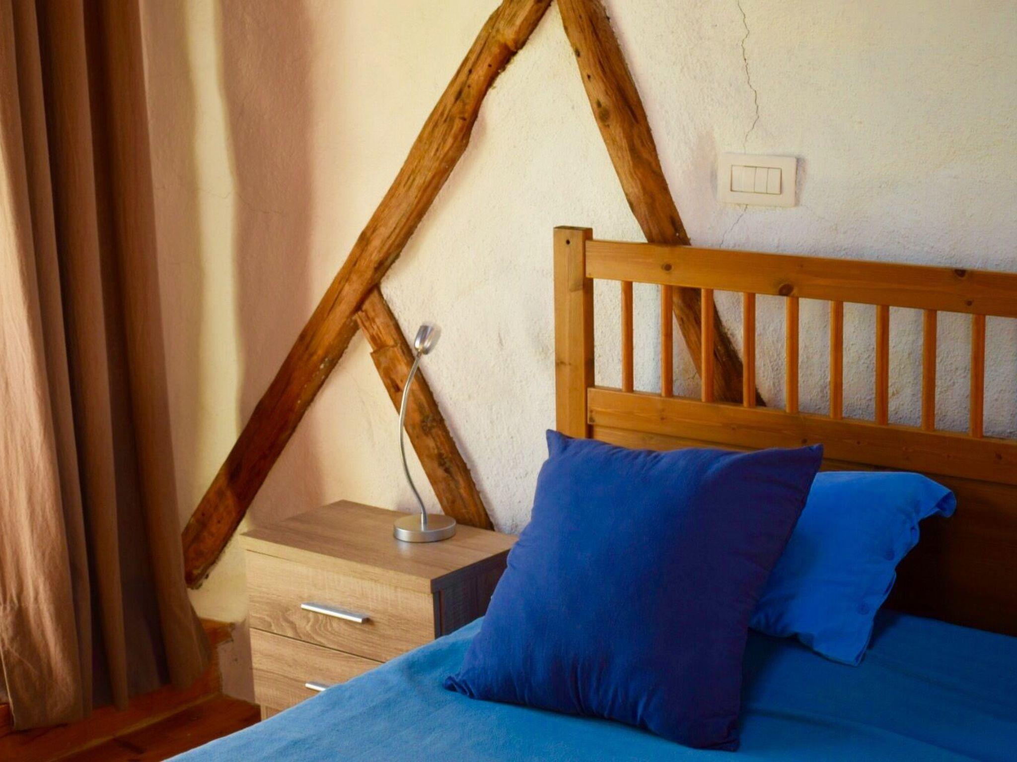 The sustainably run finca holiday home has an area of 45 sqm and consists of one large room. There is a flatscreen TV and a double bed, which can also be placed separately. The kitchen is integrated into the room. The dining table separates the fully equipped kitchen with cooker, fridge, oven/microwave, coffee machine, kettle, blender and lemon squeezer from the living/sleeping area. The adjoining bathroom has a WC, a walk-in shower and a washing machine.