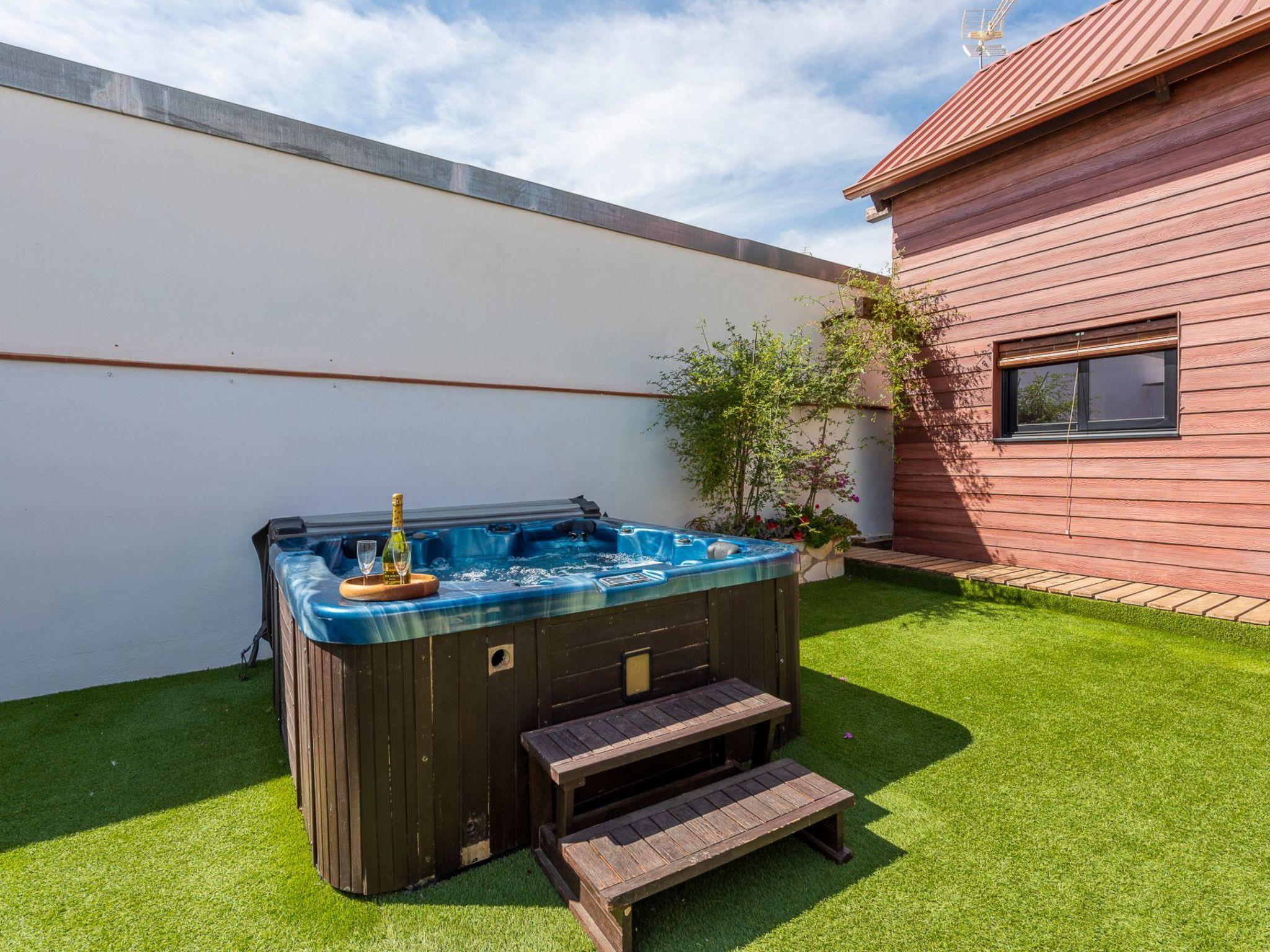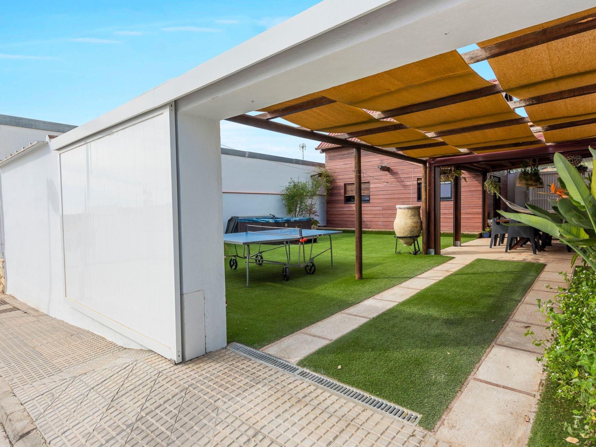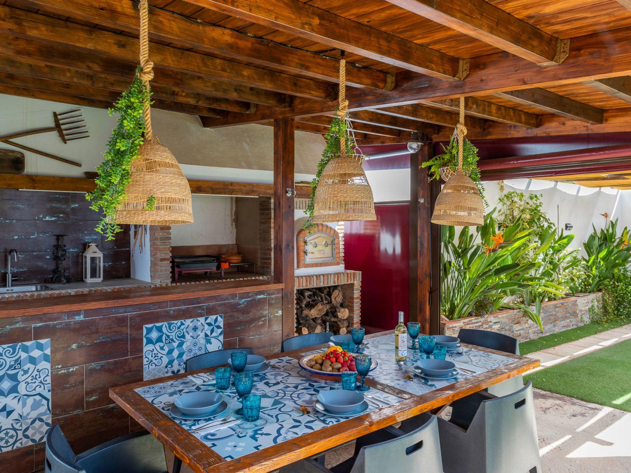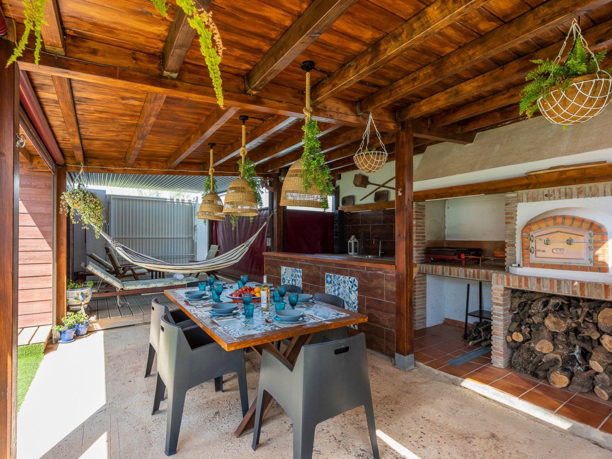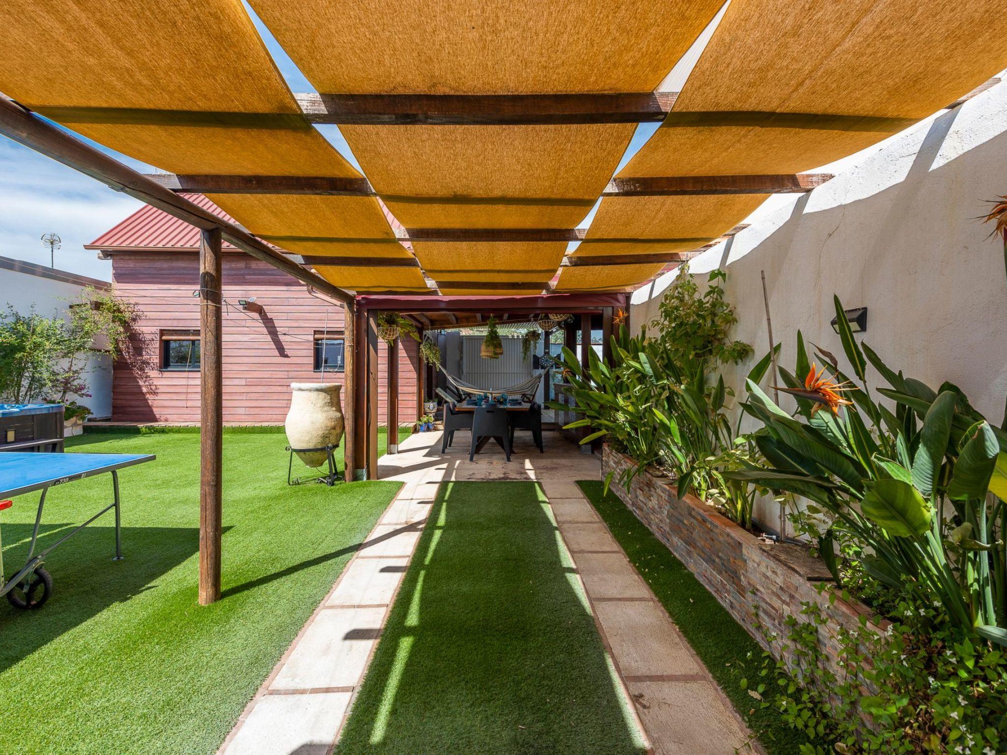 It is built on a 205 m2 plot, with a large artificial grass garden where children can play without getting hurt. In this outdoor space we have a porch of wood and Arabic tiles of 50 m2 where we have a wood oven, barbecue, gas grill, bar, sink, along with a large tiled table with 6 seats. We also have a 5-seater jacuzzi, which you can hire optionally, so you can relax and let yourself go.