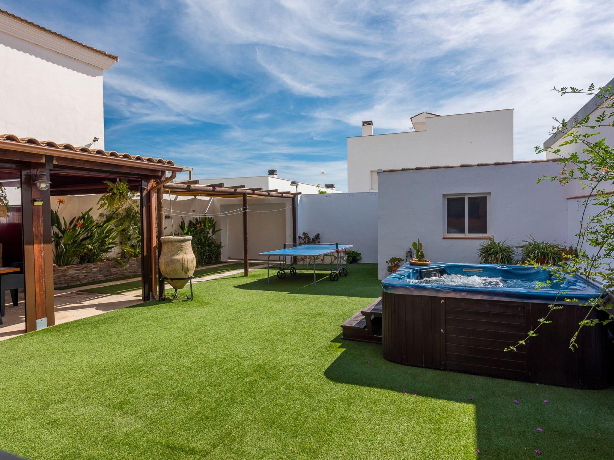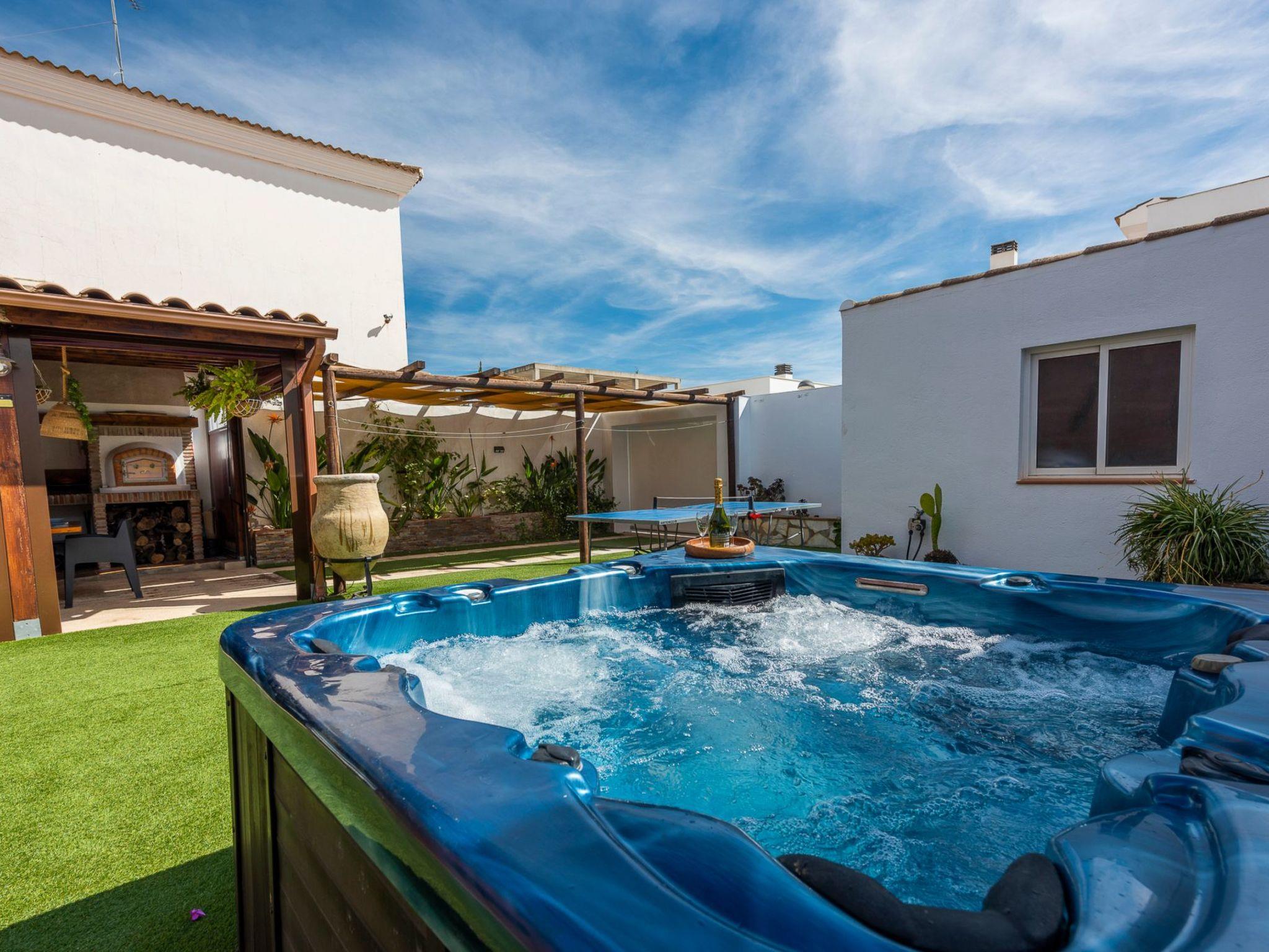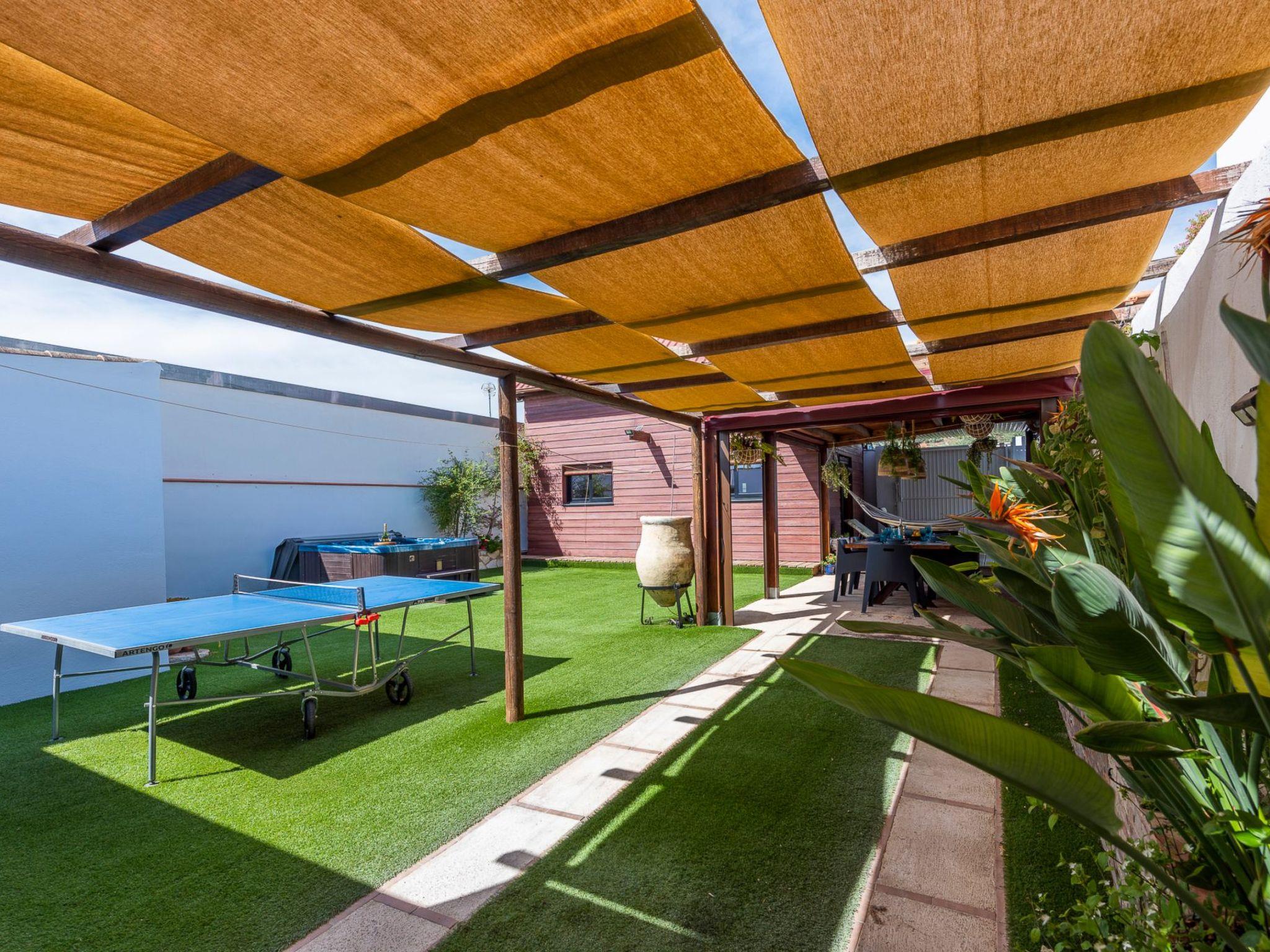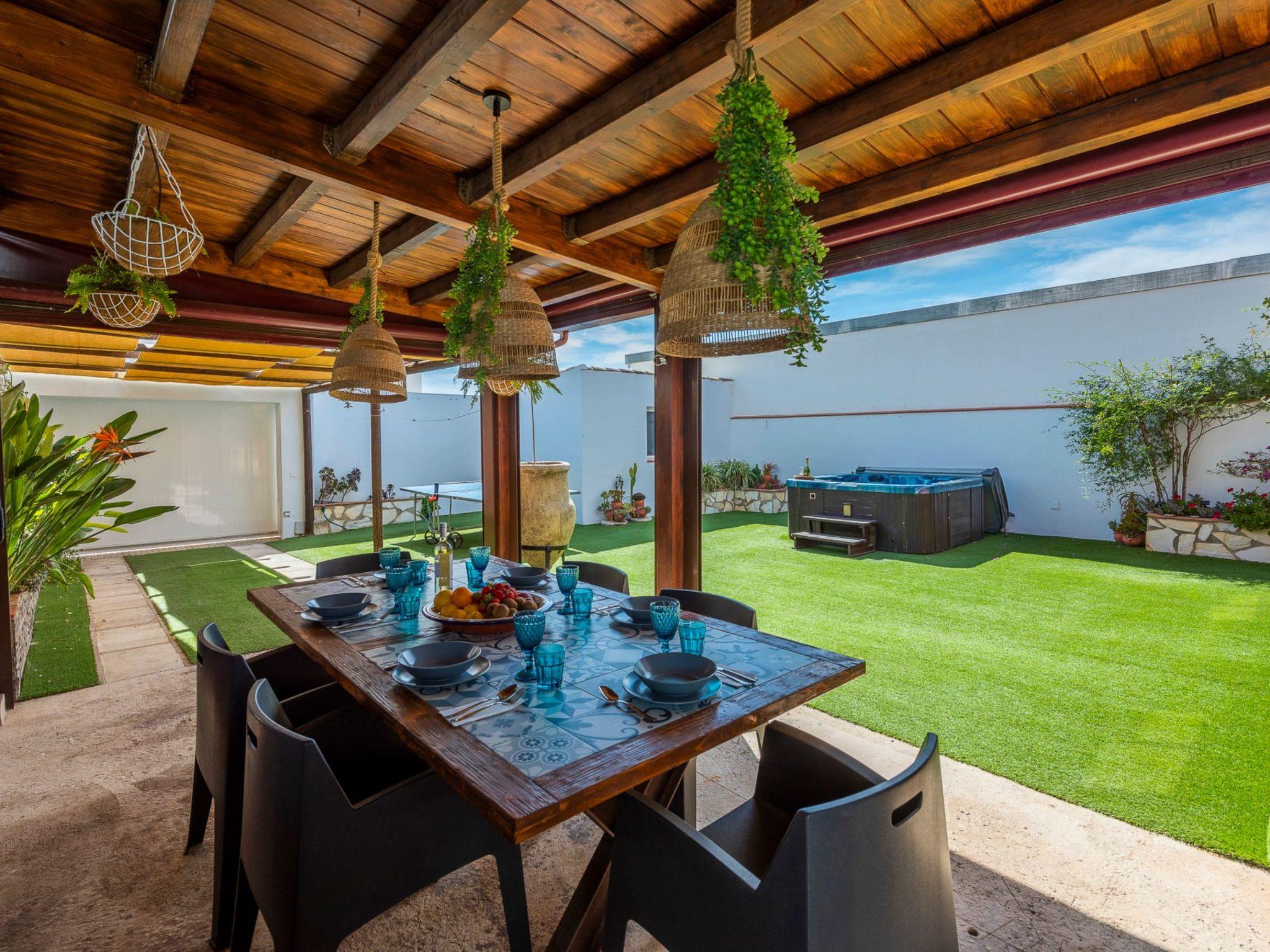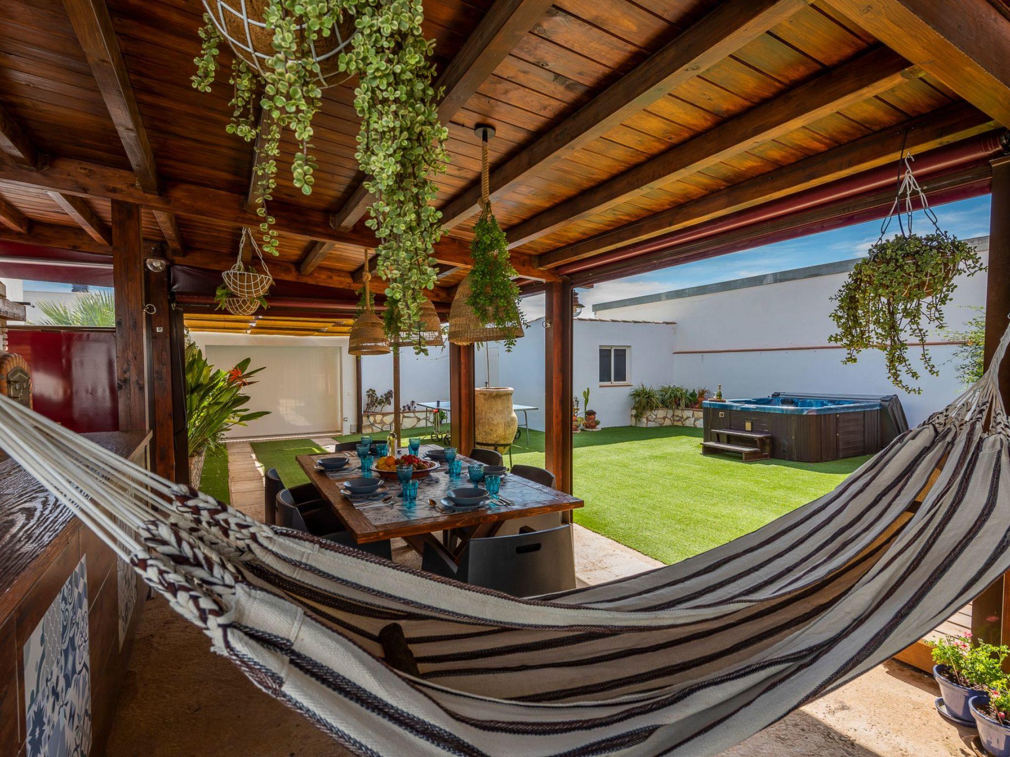 It is built on a 205 m2 plot, with a large artificial grass garden where children can play without getting hurt. In this outdoor space we have a porch of wood and Arabic tiles of 50 m2 where we have a wood oven, barbecue, gas grill, bar, sink, along with a large tiled table with 6 seats. We also have a 5-seater jacuzzi, which you can hire optionally, so you can relax and let yourself go.