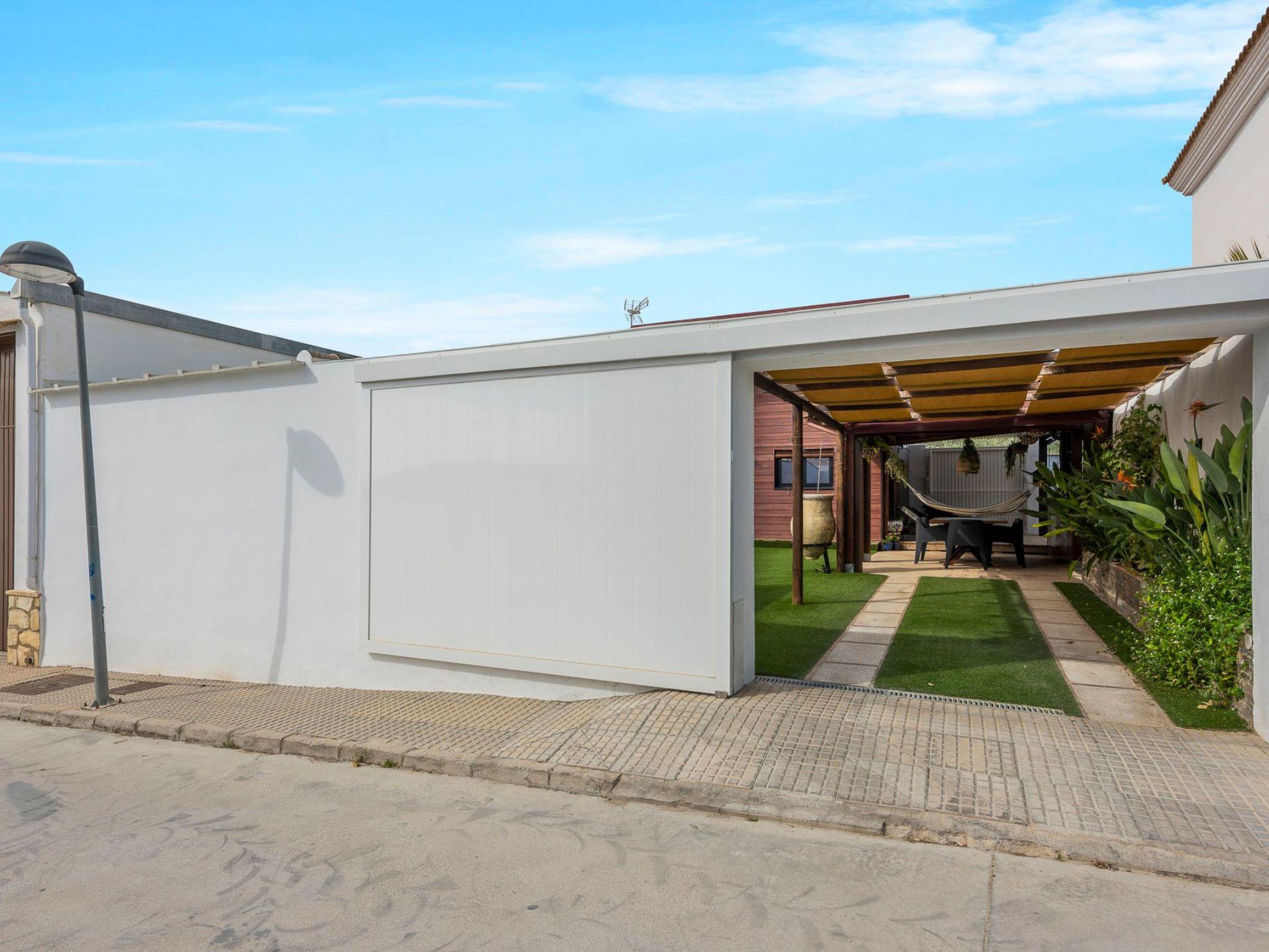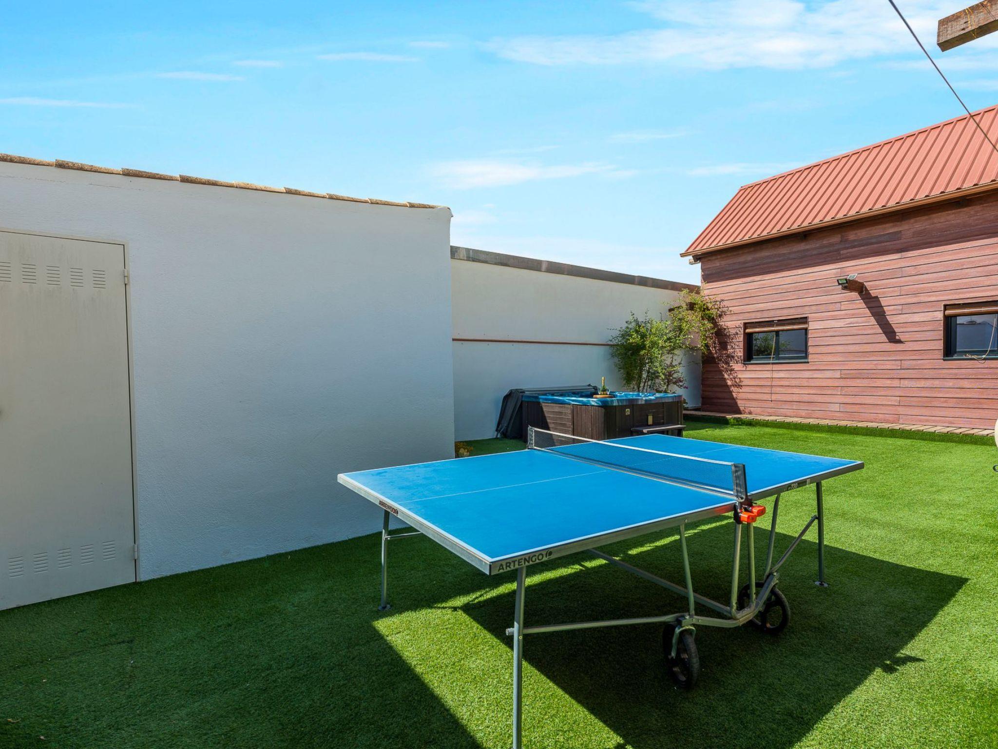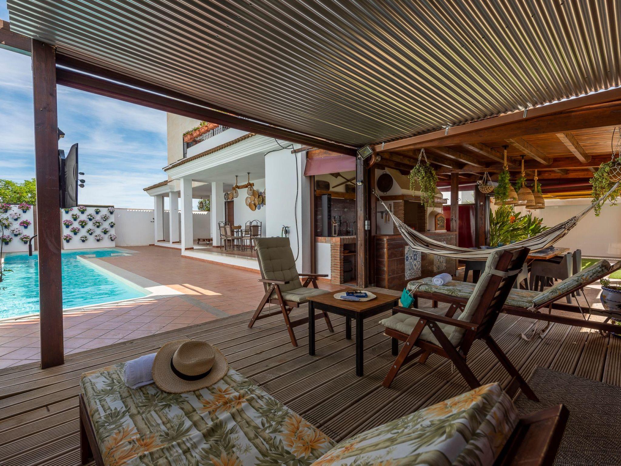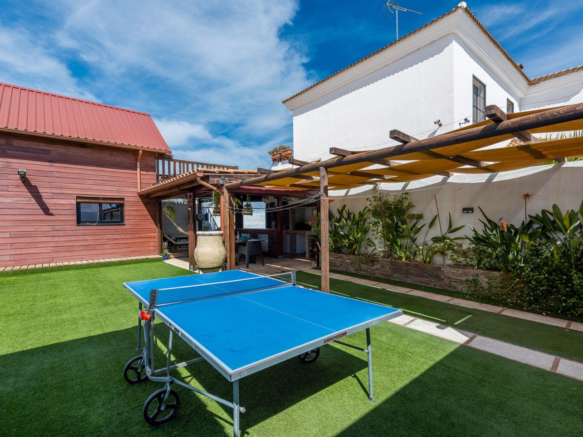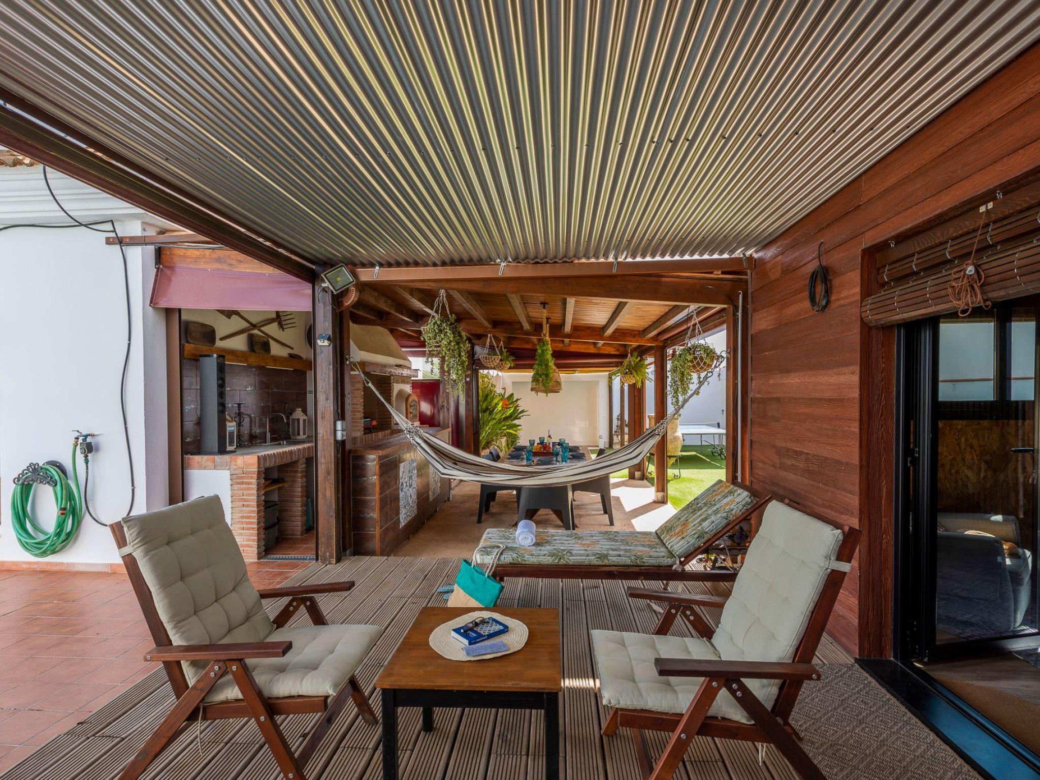 It is built on a 205 m2 plot, with a large artificial grass garden where children can play without getting hurt. In this outdoor space we have a porch of wood and Arabic tiles of 50 m2 where we have a wood oven, barbecue, gas grill, bar, sink, along with a large tiled table with 6 seats. We also have a 5-seater jacuzzi, which you can hire optionally, so you can relax and let yourself go.