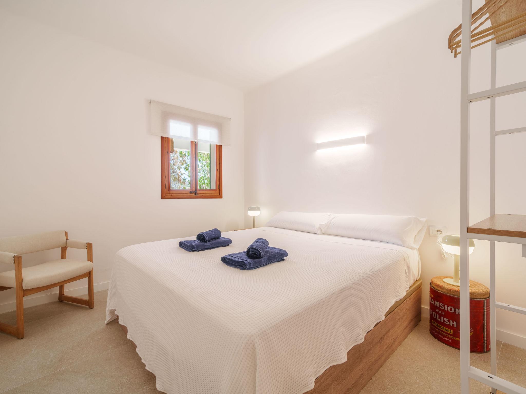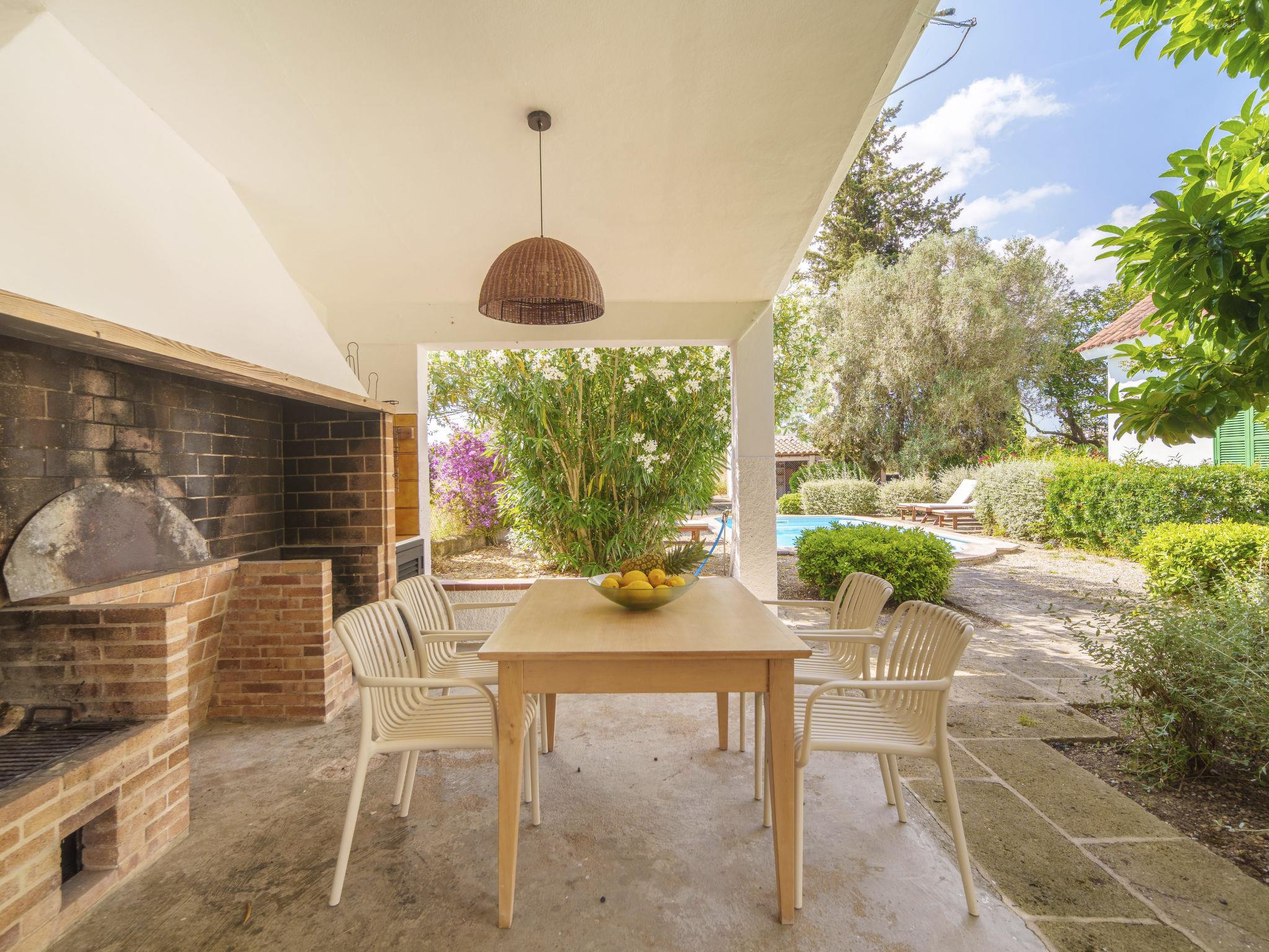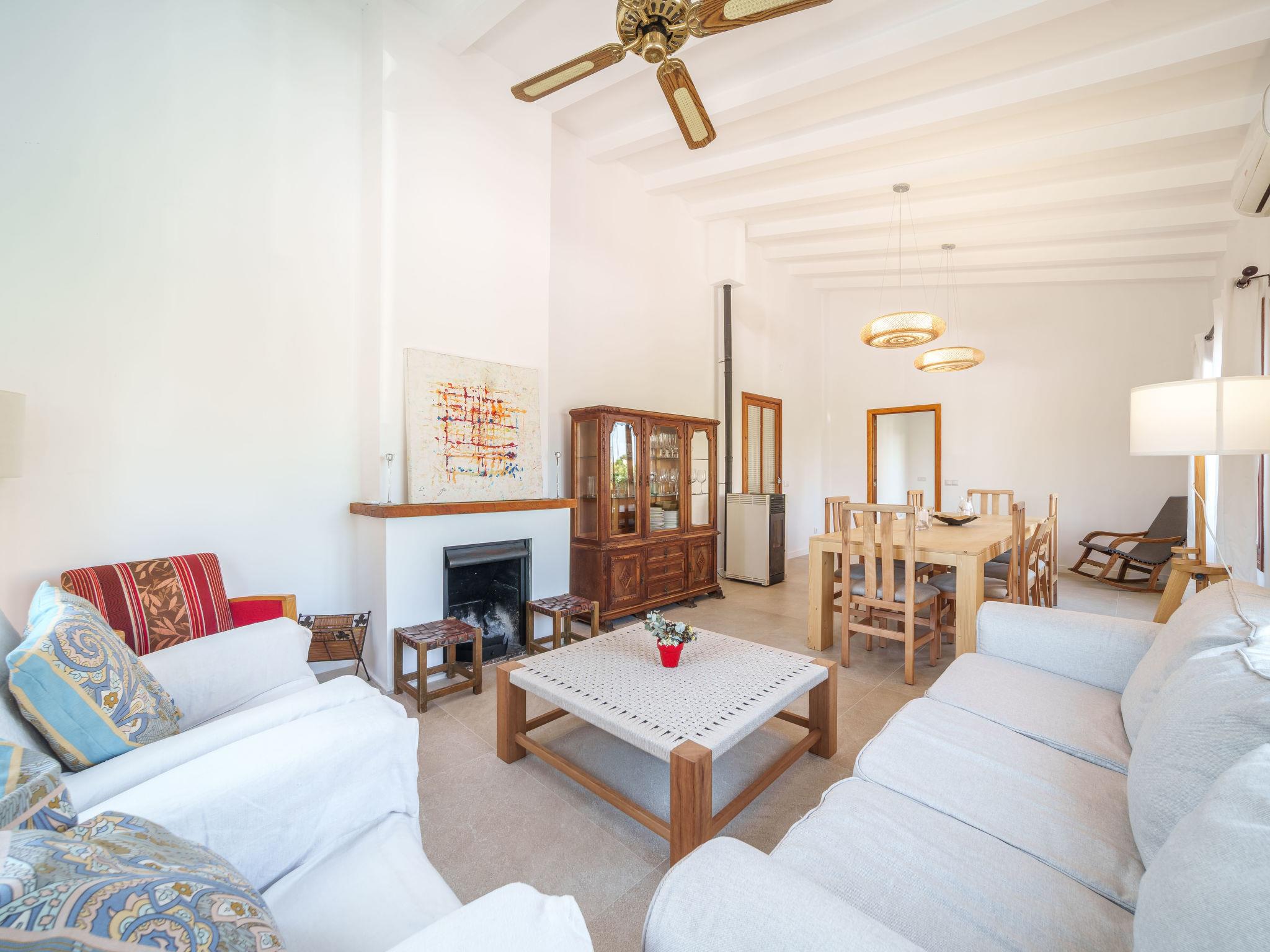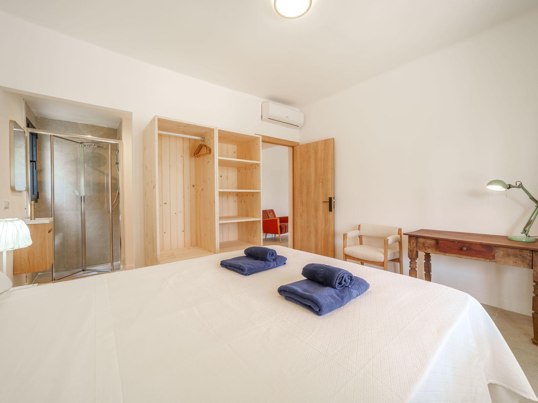 "Es Camp Jeu", 5-room cottage 200 m2, on the upper ground floor. Object suitable for 5 adults. Spacious and bright, fully renovated, practical and comfortable furnishings: open living/dining room with open-hearth fireplace, dining table, digital TV, flat screen, air conditioning, fan and forced-air heating. 3 large double bedrooms with panoramic window, each room with 1 french bed (150 cm, length 200 cm), shower/WC, air conditioning and forced-air heating. Open kitchen (oven, dishwasher, 3 ceramic glass hob hotplates, toaster, kettle, microwave, freezer, electric coffee machine, cooking island). Sep. WC. Large patio, porch. Terrace furniture, barbecue, deck chairs, covered balcony. View of the countryside. Facilities: washing machine, children's high chair, baby cot for up to 2 year olds, hair dryer. Internet (WiFi, free). Please note: non-smoking house. The pool mentioned in the description is for private use. ETV/4672 // Reg. Nr.: ESFCTU00000701100056803500000000000000000000ETV/46723
