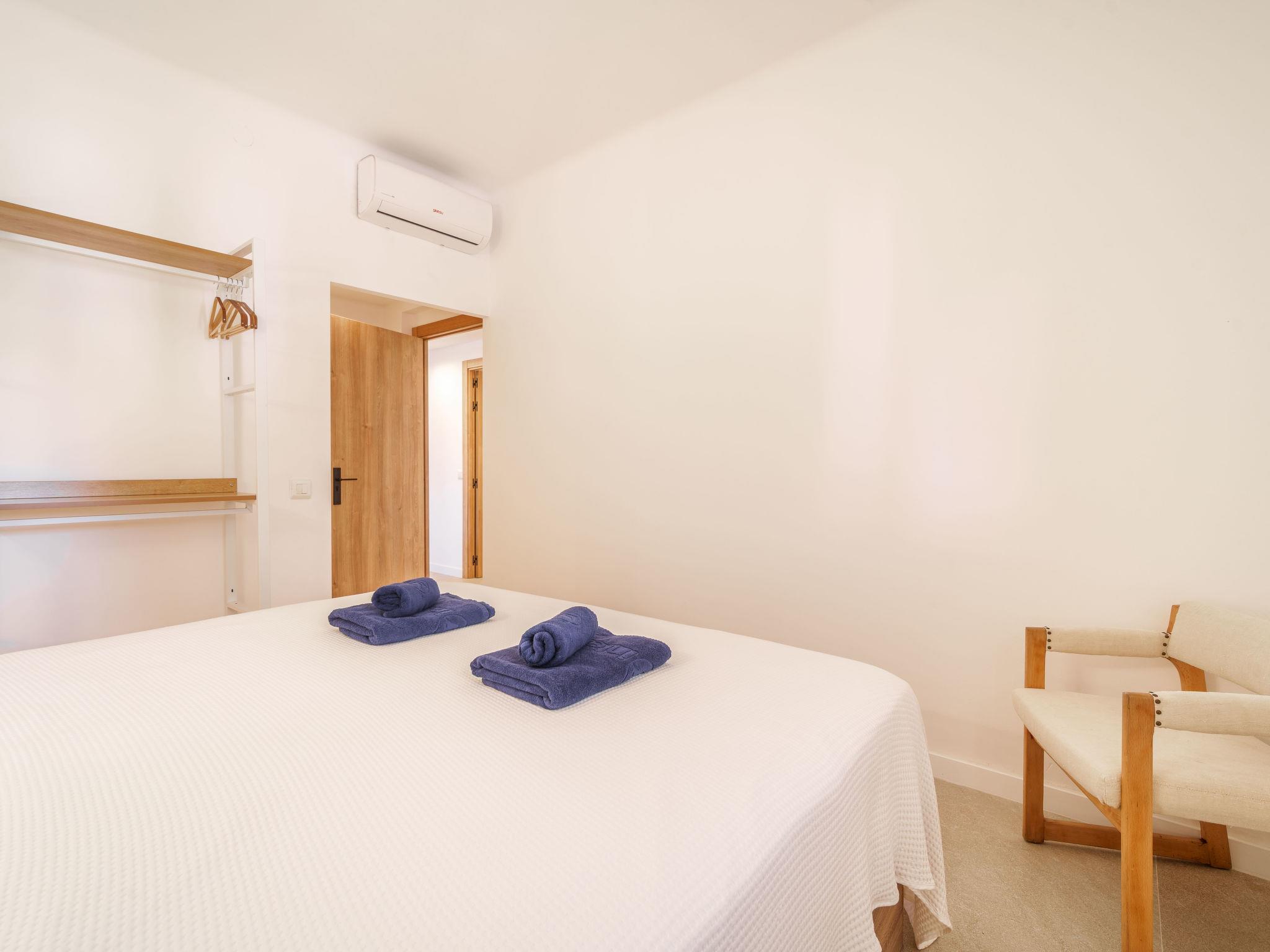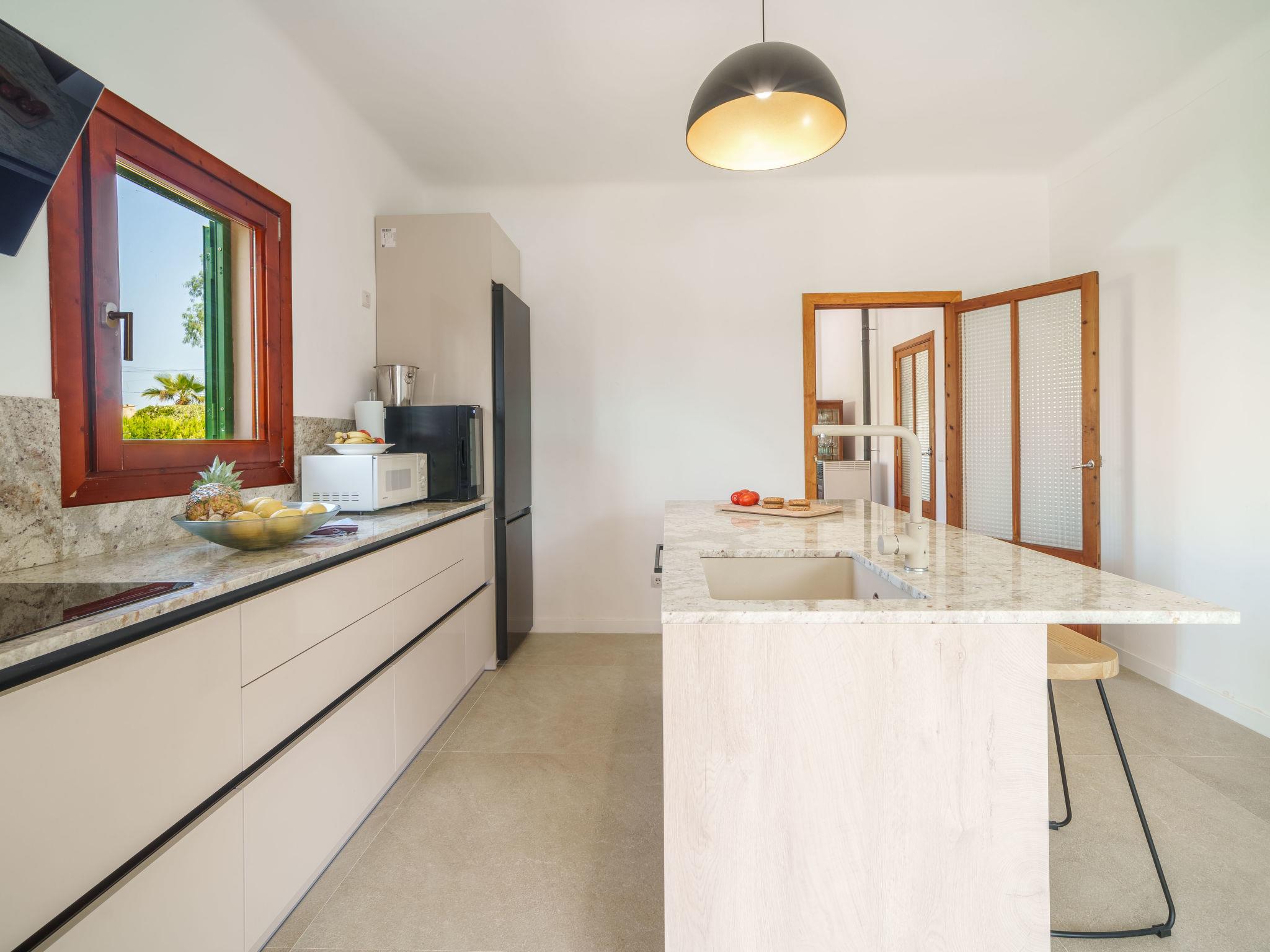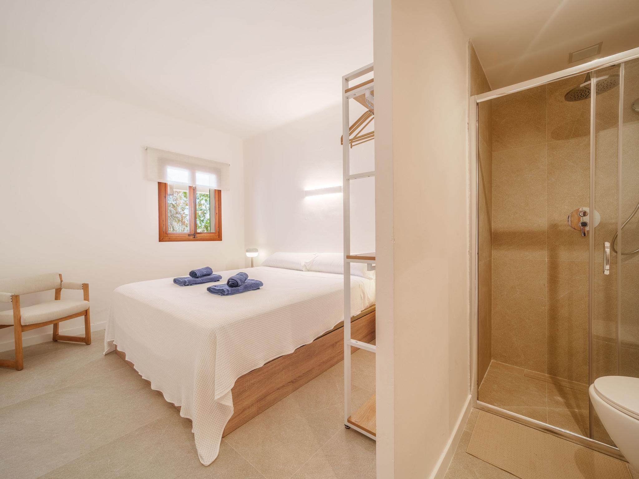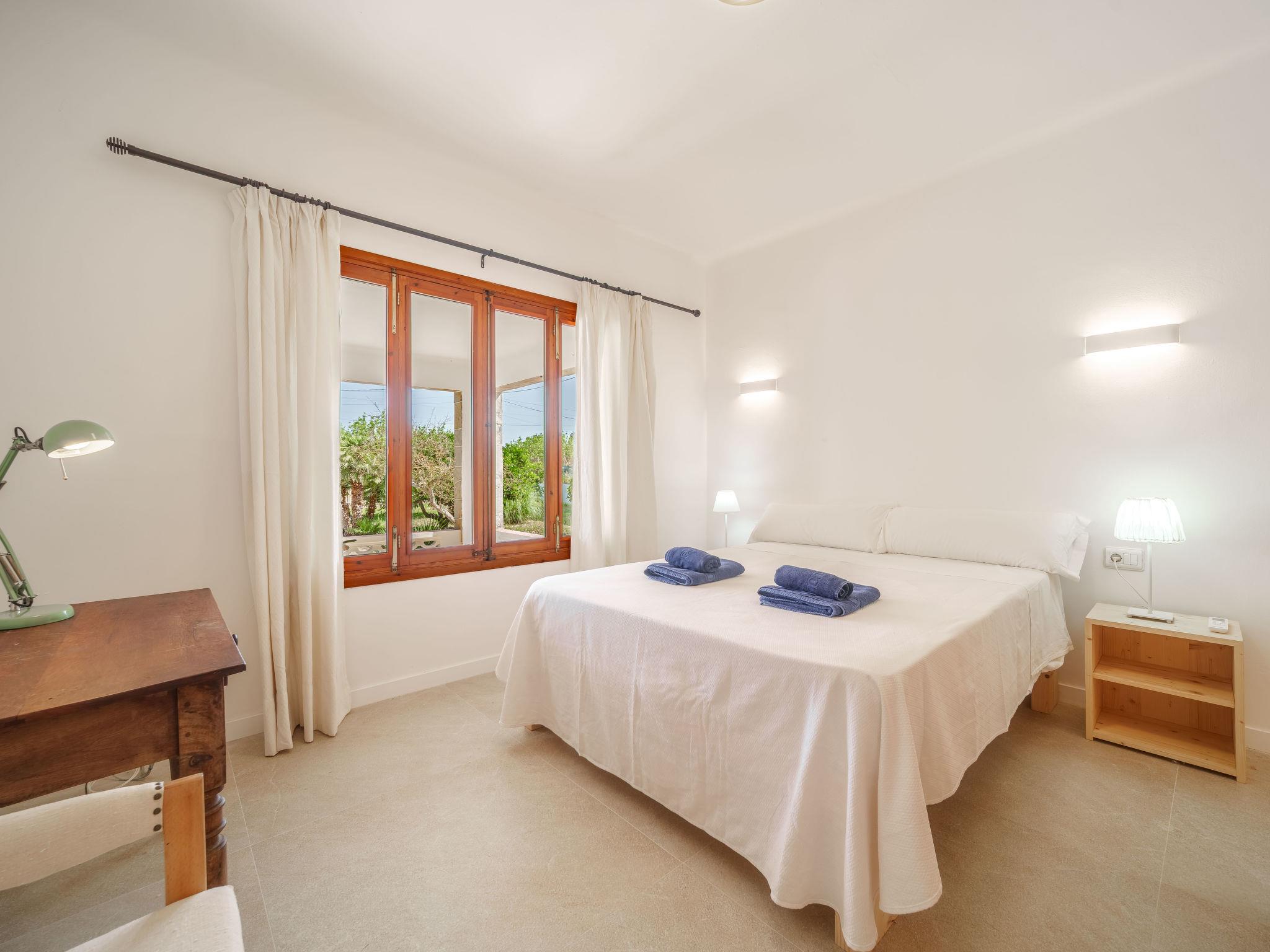 "Es Camp Jeu", 5-room cottage 200 m2, on the upper ground floor. Object suitable for 5 adults. Spacious and bright, fully renovated, practical and comfortable furnishings: open living/dining room with open-hearth fireplace, dining table, digital TV, flat screen, air conditioning, fan and forced-air heating. 3 large double bedrooms with panoramic window, each room with 1 french bed (150 cm, length 200 cm), shower/WC, air conditioning and forced-air heating. Open kitchen (oven, dishwasher, 3 ceramic glass hob hotplates, toaster, kettle, microwave, freezer, electric coffee machine, cooking island). Sep. WC. Large patio, porch. Terrace furniture, barbecue, deck chairs, covered balcony. View of the countryside. Facilities: washing machine, children's high chair, baby cot for up to 2 year olds, hair dryer. Internet (WiFi, free). Please note: non-smoking house. The pool mentioned in the description is for private use. ETV/4672 // Reg. Nr.: ESFCTU00000701100056803500000000000000000000ETV/46723