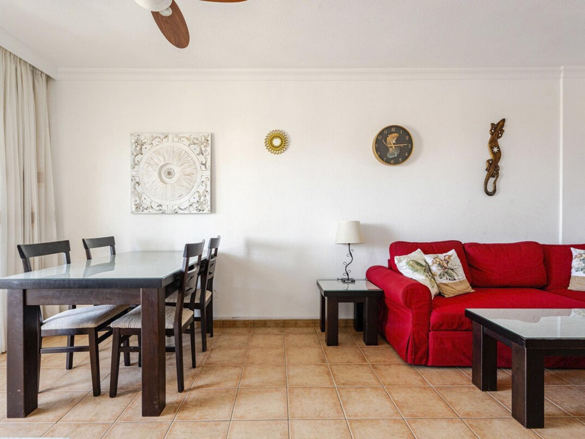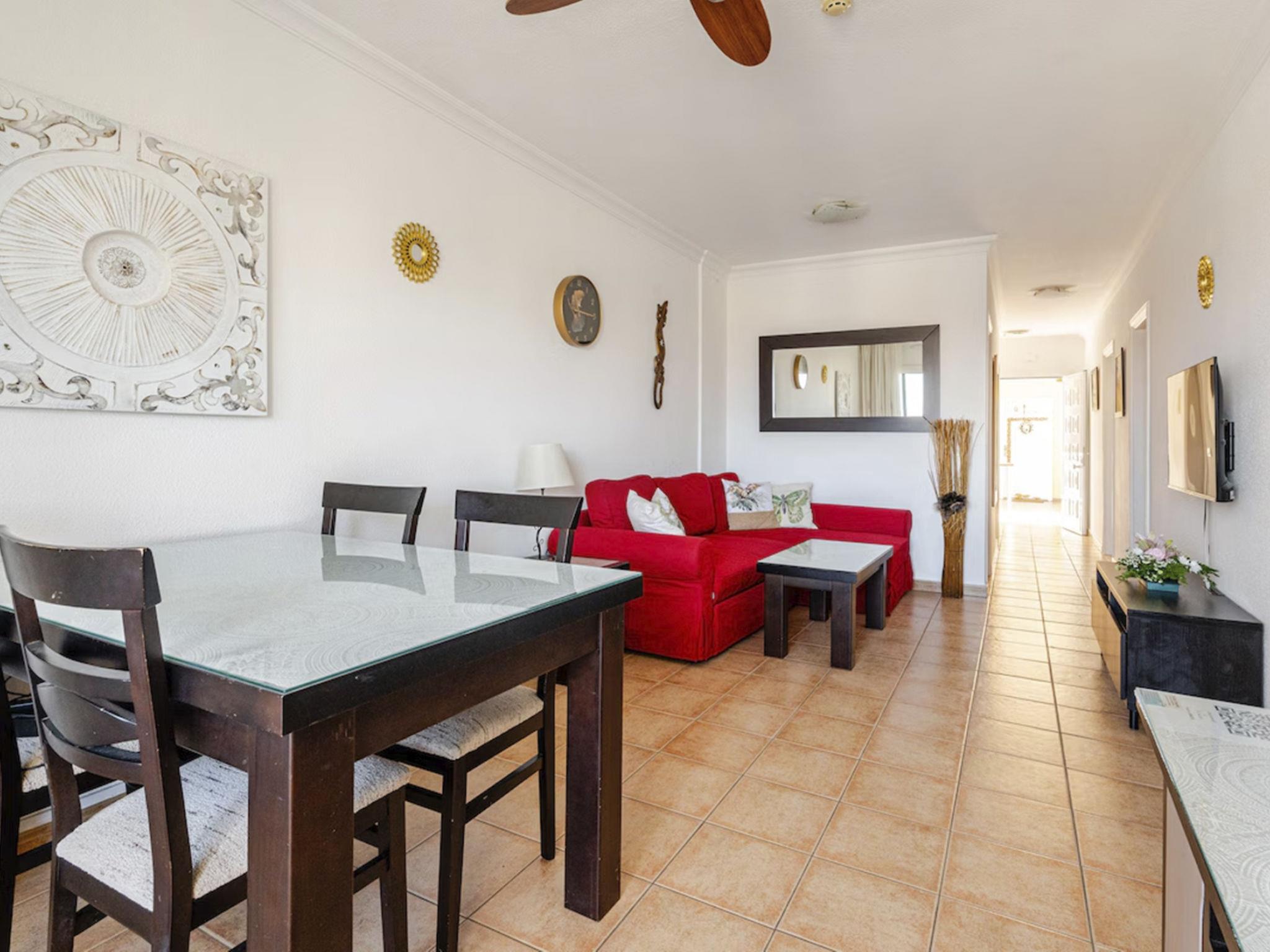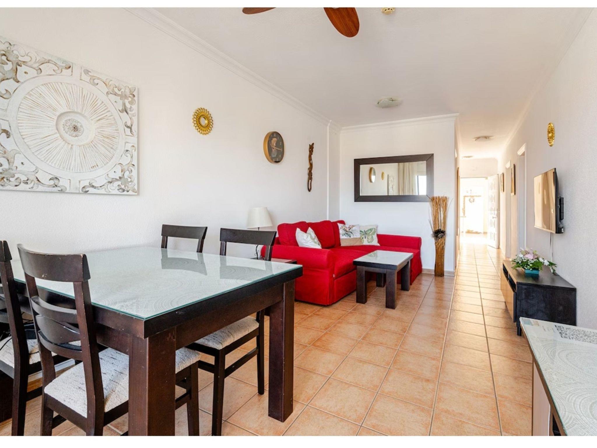 The flat has a sea-facing balcony, is modern and brightly furnished and is designed for a maximum of 6 people. It has a fully equipped kitchen with electric hob, oven, fridge/freezer, microwave, kettle, toaster and everything else you need for cooking. There are two cosy bathrooms, one with a bath/shower, the other with a shower and two spacious bedrooms, one with a double bed, the other with two single beds, which can be put together if desired. In the living room there is a cosy seating area with a sofa bed, a separate dining area and a TV with satellite reception (German/Russian/English and others). From here you can also access the beautifully furnished balcony with lovely views of the sea and La Gomera. The washing machine is located in a small separate utility room. There is also a separate storage room for drying laundry. The flat has a very quiet fan in every room for the hot days and good ventilation, as well as air conditioning.