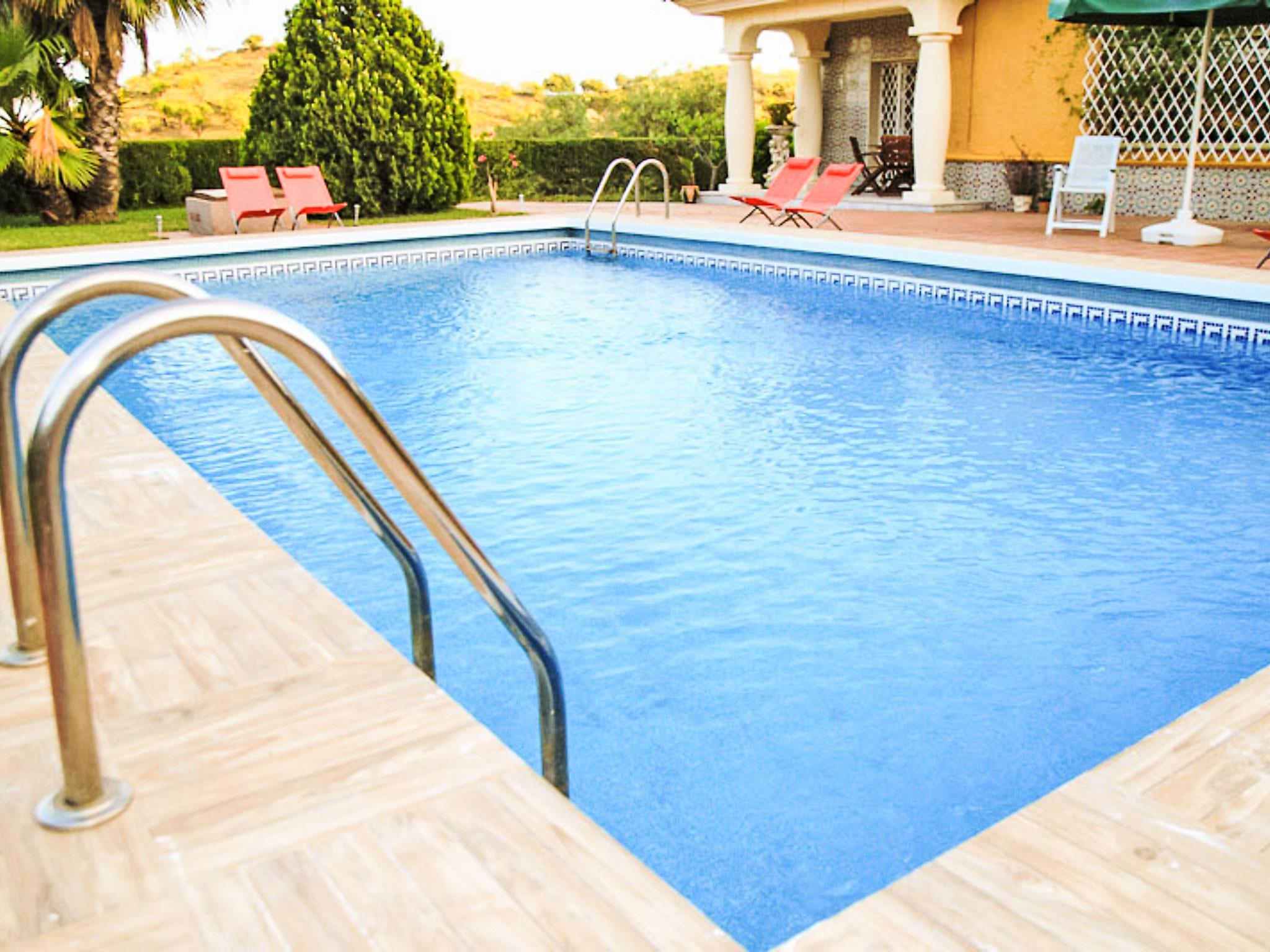 Large, beautiful house "La Poza". Outside the resort, 16 km from the centre of Málaga, in a quiet, sunny position on top of a hill, 16 km from the sea, 16 km from the beach, in a cul-de-sac, in the countryside. Private: property (fenced), garden 1'600 m2 with lawn and flowers, swimming pool (6 x 9 m, depth 130 - 195 cm, seasonal availability: 01.Jan. - 31.Dec.). Outdoor shower, garden furniture, barbecue, parking (for 4 cars) at the house. Shop 3 km, restaurant 3 km, bar 3 km, bus stop "El Cortijuelo L-21" 1.5 km, sandy beach 16 km. Please note: car recommended. Owner lives in separate semi-detached house. Motorway 1.5 km from the property.