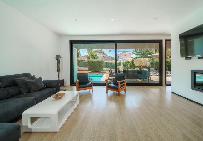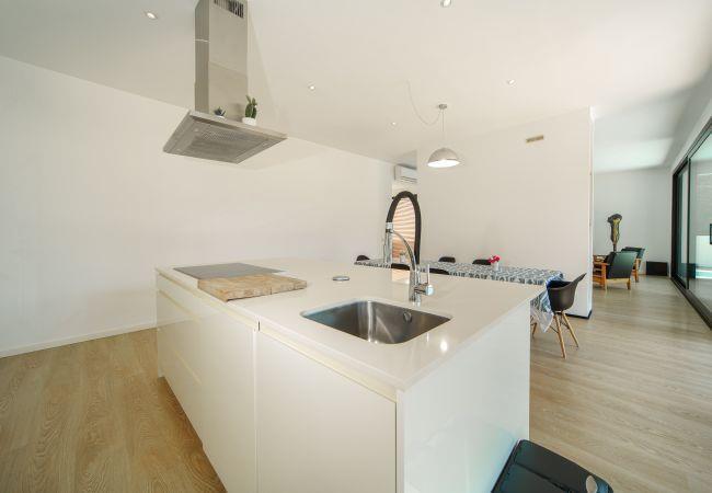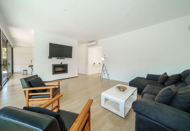 The interior of the house is a display of elegance and natural light. The completely open living room is designed for your maximum comfort, with a cozy sofa, two armchairs and a wood stove creating the perfect atmosphere for any season. In addition, the house has satellite television and Wi-Fi connection, so you are always connected. The kitchen, modern and equipped with the best appliances, includes a central island and is integrated with the dining room, offering an ideal space for memorable dinners. The large glass doors allow fluid access to the garden and pool, merging the interior with the exterior.