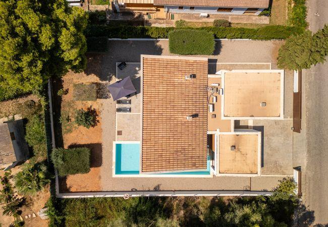 The villa can comfortably accommodate six people in its three bright bedrooms, all with 160x200 cm double beds. They offer large closets and direct access to the garden through glass doors. The two bathrooms, with a modern design and easy access, are equipped with semi-open showers. The main bathroom is also accessible from the outside and has direct access to the pool.