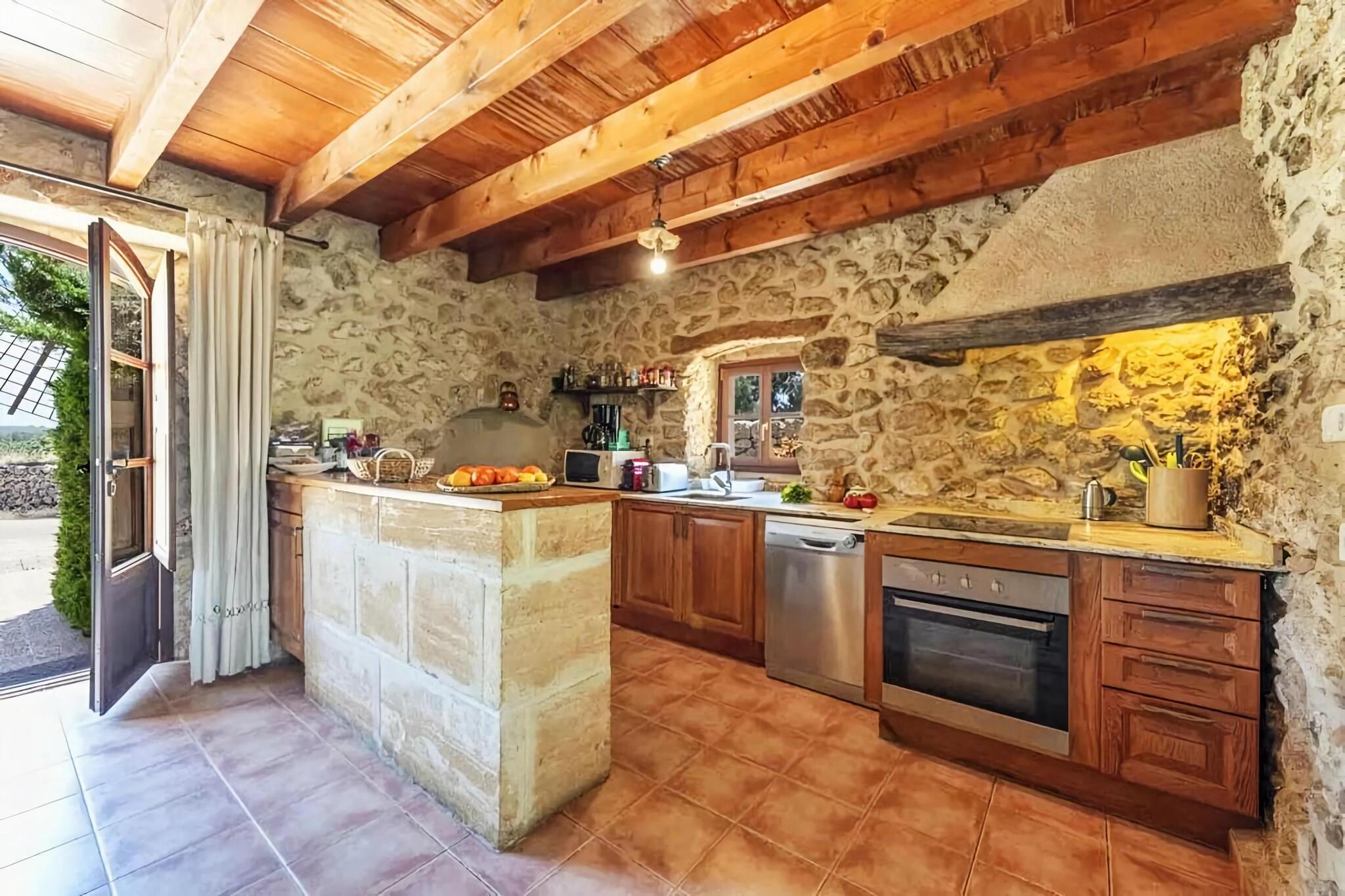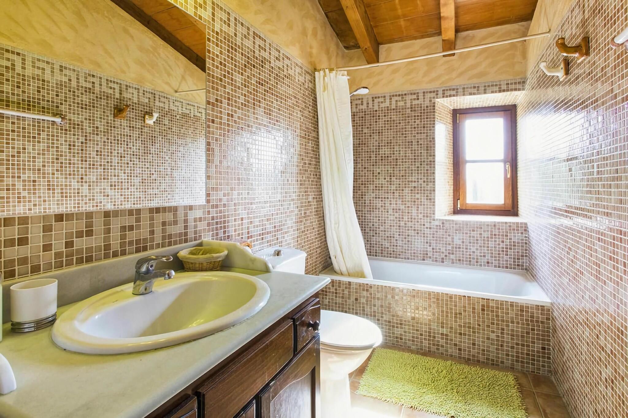 Ejendommen er vidunderligt beliggende midt i en mallorcansk vingård i udkanten af Santa María. Den gamle restaurerede mølle foran gården er et sandt blikfang! Selve huset byder på omkring 250 m² boligareal fordelt på to etager, i alt 4 soveværelser med dobbeltsenge (tre med hver 2 enkeltsenge og 1 med dobbeltseng), fire badeværelser (alle en suite), alle soveværelser har deres eget aircondition , stue-spisestue med satellit-tv, WiFi og tekøkken med opvaskemaskine. En guidet tur og smagning under din ferie. Byen Santa María ligger i den nordlige del af hovedstaden Palma de Mallorca og er siden blevet et ideelt udgangspunkt for alle retninger af øen. Der er en motorvejsforbindelse i nærheden. De nærmeste supermarkeder i Santa María eller Marratxi ligger kun et stenkast væk. Blot et par minutter i bil. For mere omfattende indkøb kan du nå hovedstaden Palma på få minutter (15 km). For dem, der leder efter særlige tilbyder eller bare ønsker at tilbringe en sjov eftermiddag med familien, anbefaler vi Mallorca Fashion Outlet indkøbscenter, kun 6 km væk: denne ejendom kan kombineres Perfekt med en anden ranch (op til 8 ekstra gæster) placeret på den samme ejendom, kun et par minutter væk. Spørg os om dette. Fra stuen er der udgang til den magiske have anlagt som en lille skov og byder derfor på masser af skygge. Her finder du også den store private pool saltvand og den overdækkede terrasse til at sidde lige ved siden af. Et drømmested til hurtigt at glemme hverdagens stress. Der er en mobil grill og masser af parkeringspladser i haven. Ejerfamilien producerer deres egen vin på denne enorme 26 hektar store ejendom, så du kan nyde.
