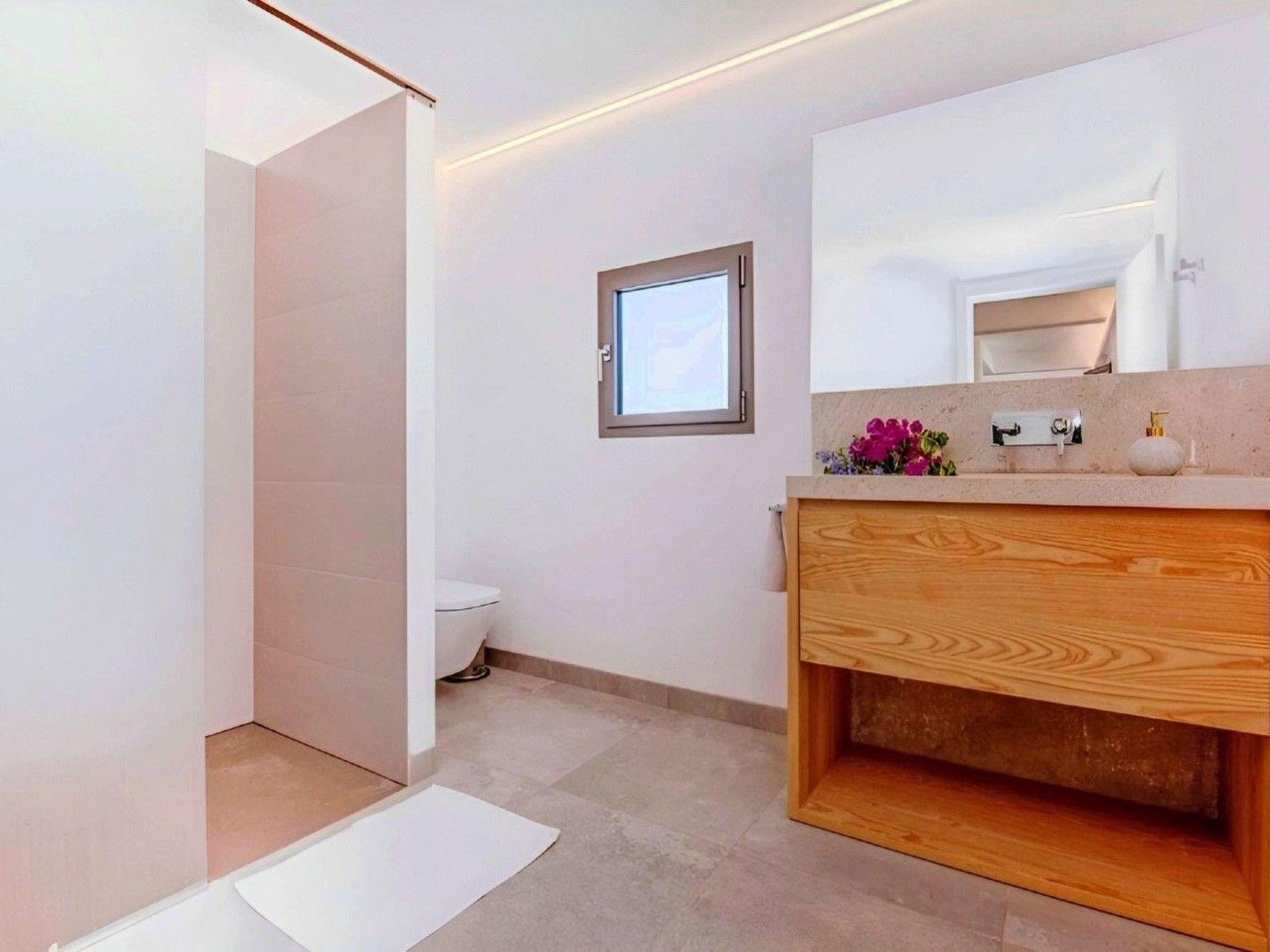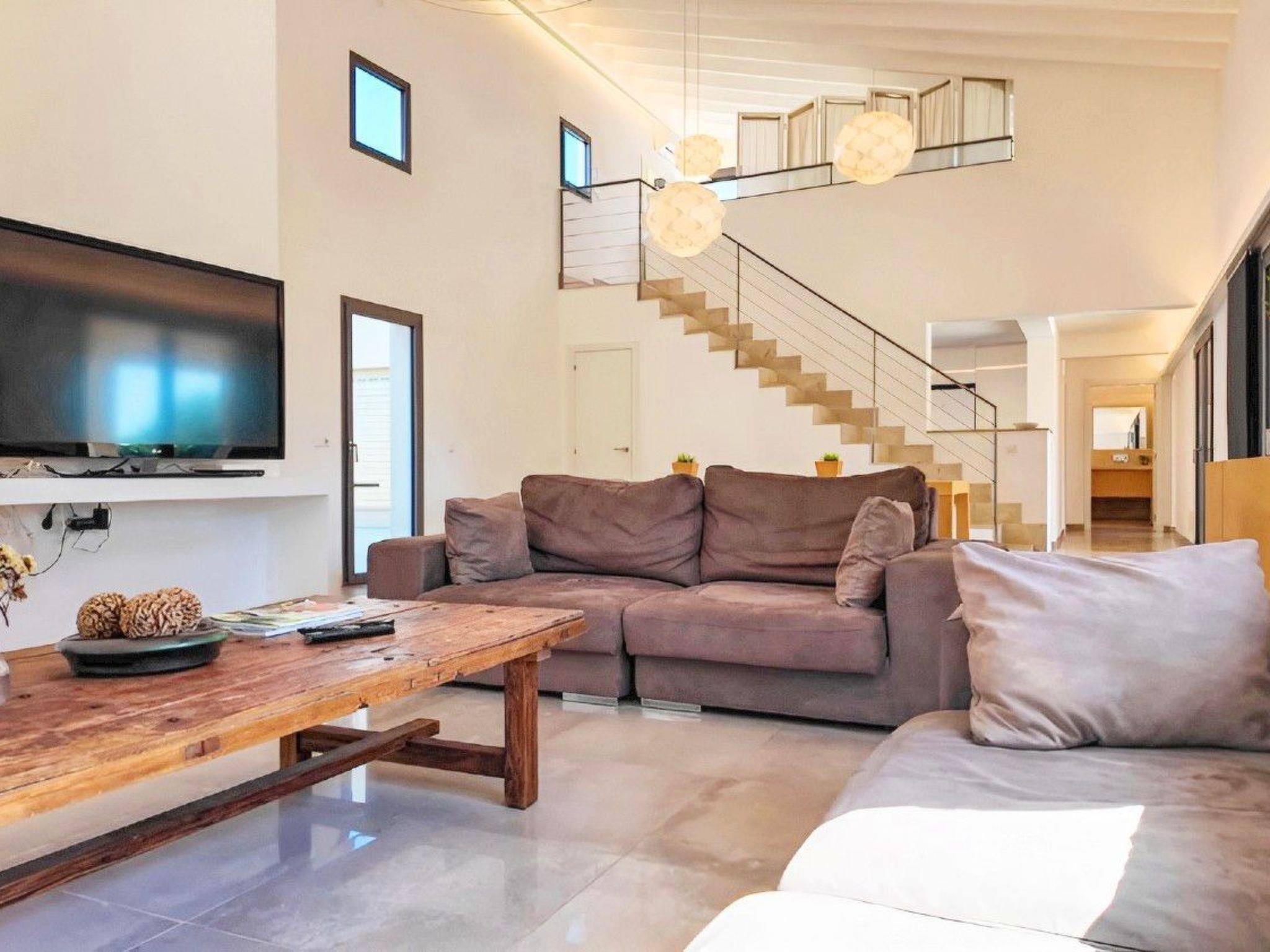 The house, which can accommodate up to 8 persons, offers approx. 230 m² of living space on two floors, an open and bright living/dining room, a huge fitted kitchen with dishwasher, four spacious bedrooms (three with single beds consisting of a double bed, the fourth with a double bed) and a total of three bathrooms (2x EnSuite). The bedroom with double bed is located on the upper floor, which is designed as an open gallery. All bedrooms and the living room have their own air conditioning.