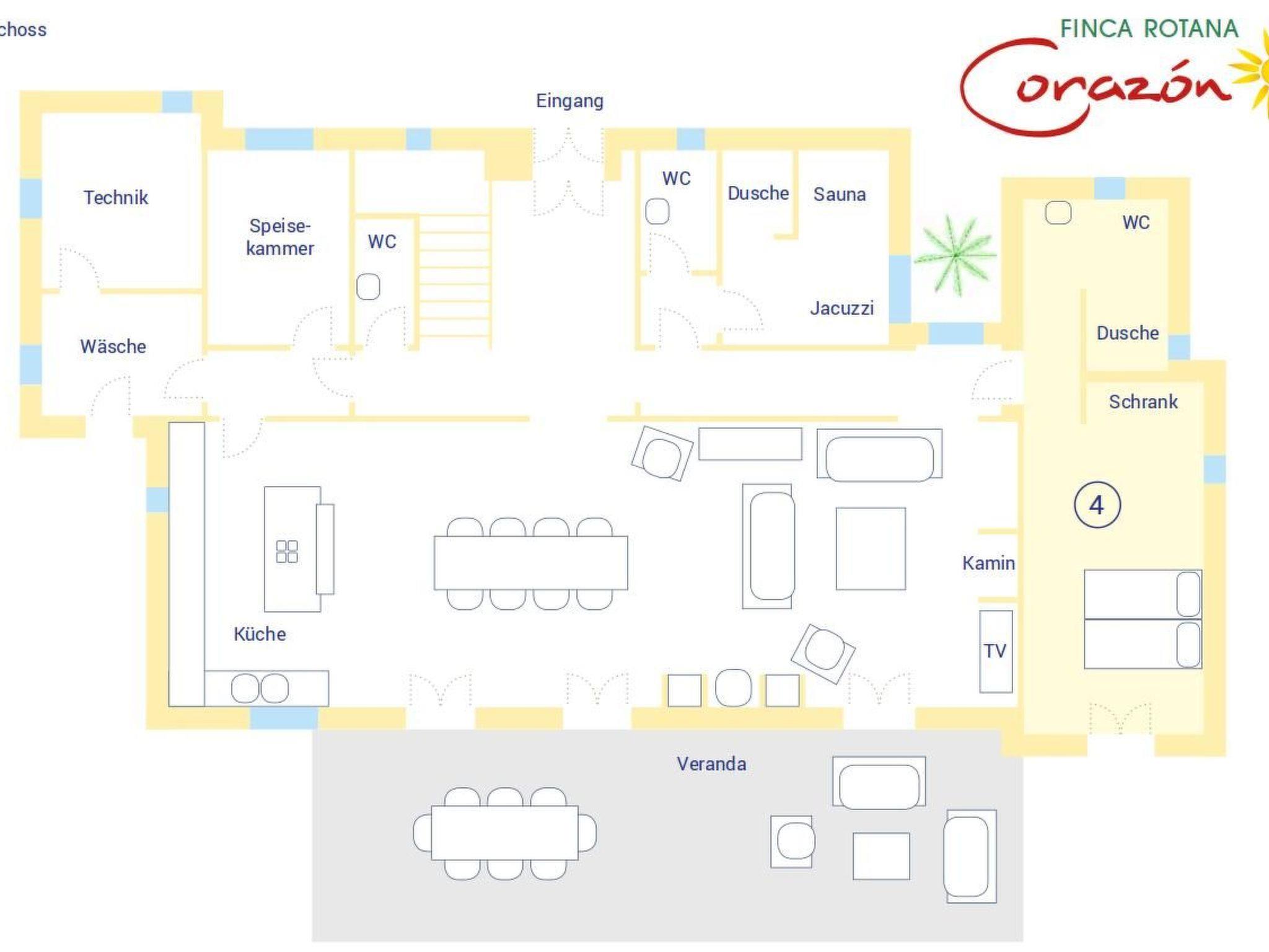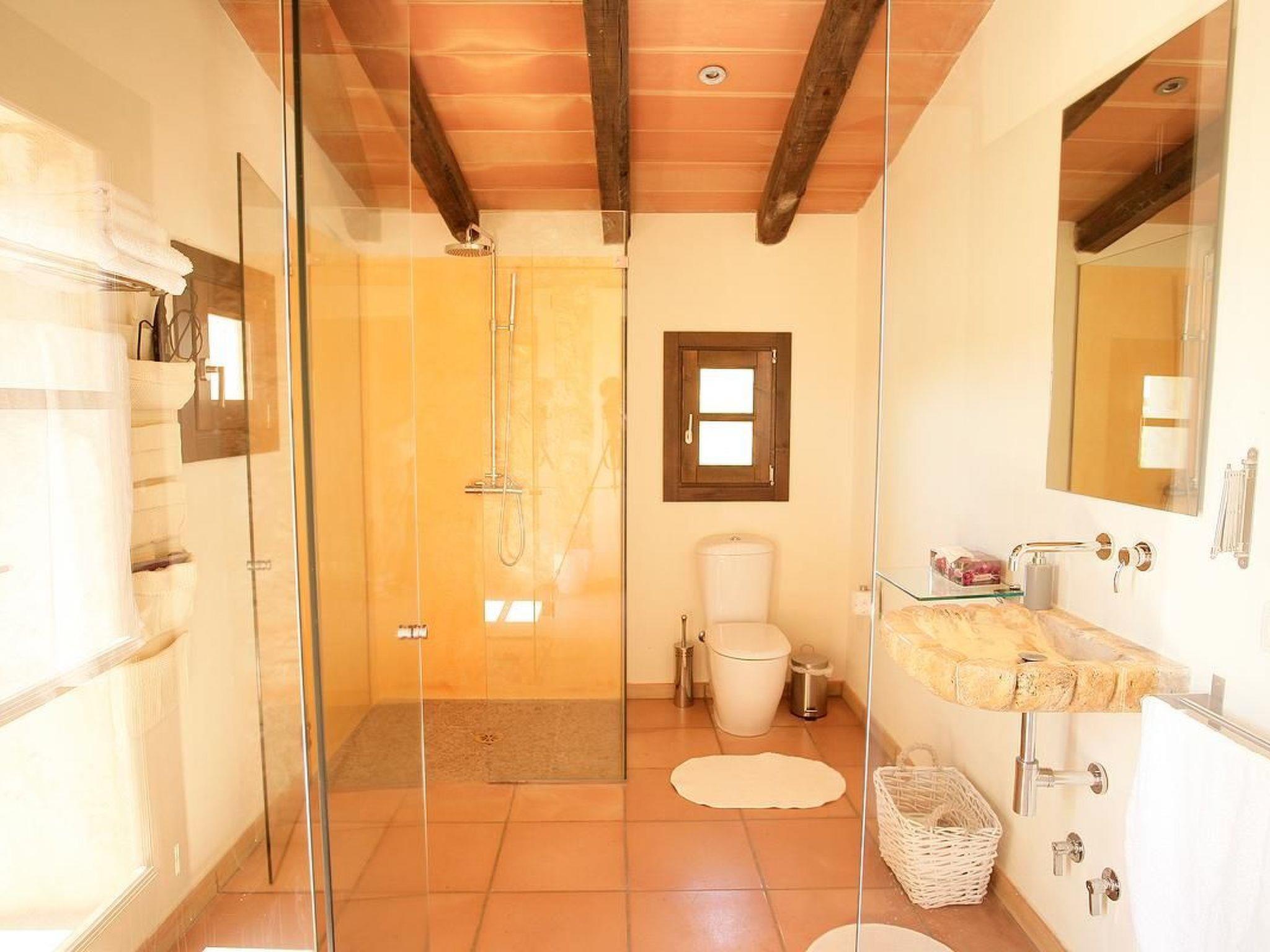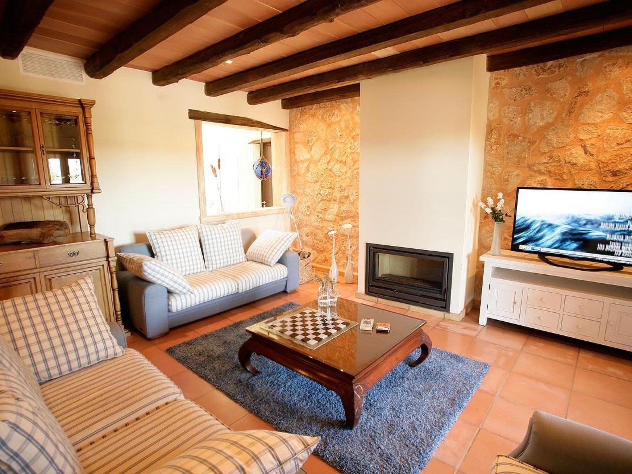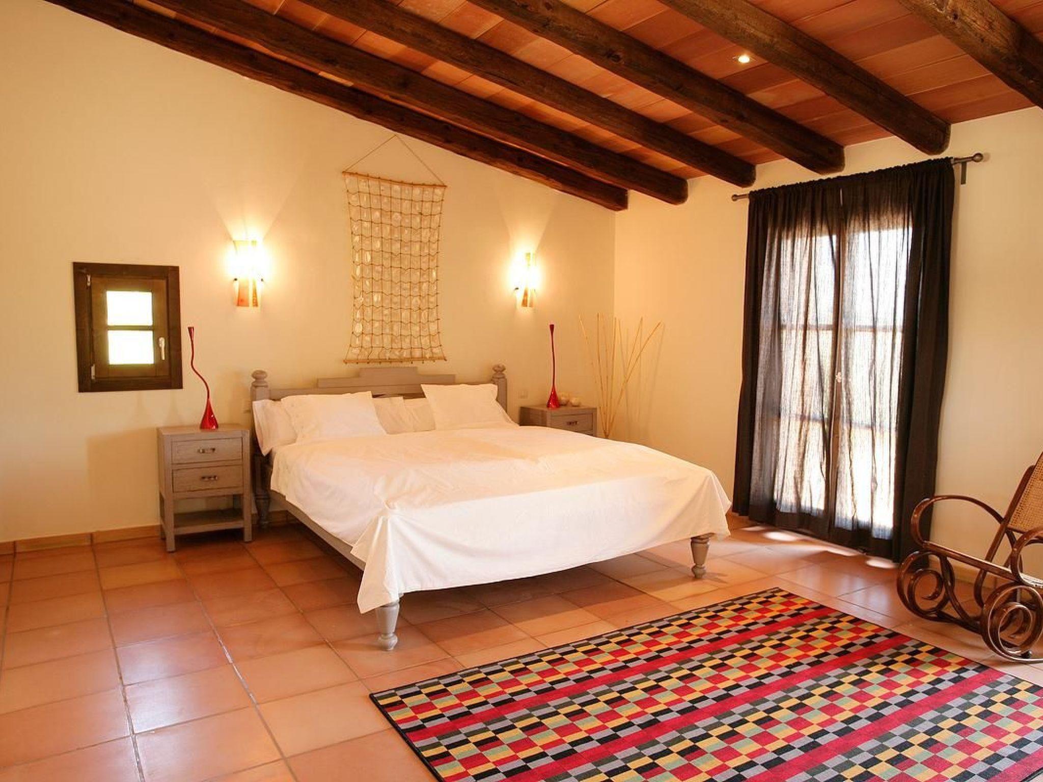 The entrance area leads to the open plan living and dining area with a professional kitchen. The kitchen offers a modern ceran stove, an oven, an exhaust hood, a freezer, a refrigerator and a bar with plenty of worktop counter space. A Phillips coffee machine (professional model) is available.The dining table for eight is ideal for enjoying a lovely meal. The adjacent living room offers a fireplace, which is especially comforting during the cooler months. The four double bedrooms offer privacy. The high end bedrooms have level access showers. The first bedroom is a master suite with an open dressing area and an additional sofa bed. The large dressing area and the master suite are on the top floor. The spacious patio on the top floor, accessible from two rooms, grants stunning views over the south of the island. You will feel comfortable year round, thanks to the air conditioning unit and the underfloor heating. The owner welcomes you to enjoy your stay here. A welcome gift awaits upon your arrival. Wi-Fi is available. The bedrooms are furnished as follows: master suite: 180 x 220 cm, bed 2: 150x 200 cm (romance room, top floor=, bed three: 180 x 200cm (top floor), bed 4: 180 x 200 (two single mattresses combined to make a double; in the downstairs bedroom). The Finca is heated with underfloor heating and the air conditioning unit if necessary. Each bedroom and the living room are equipped with air conditioning.