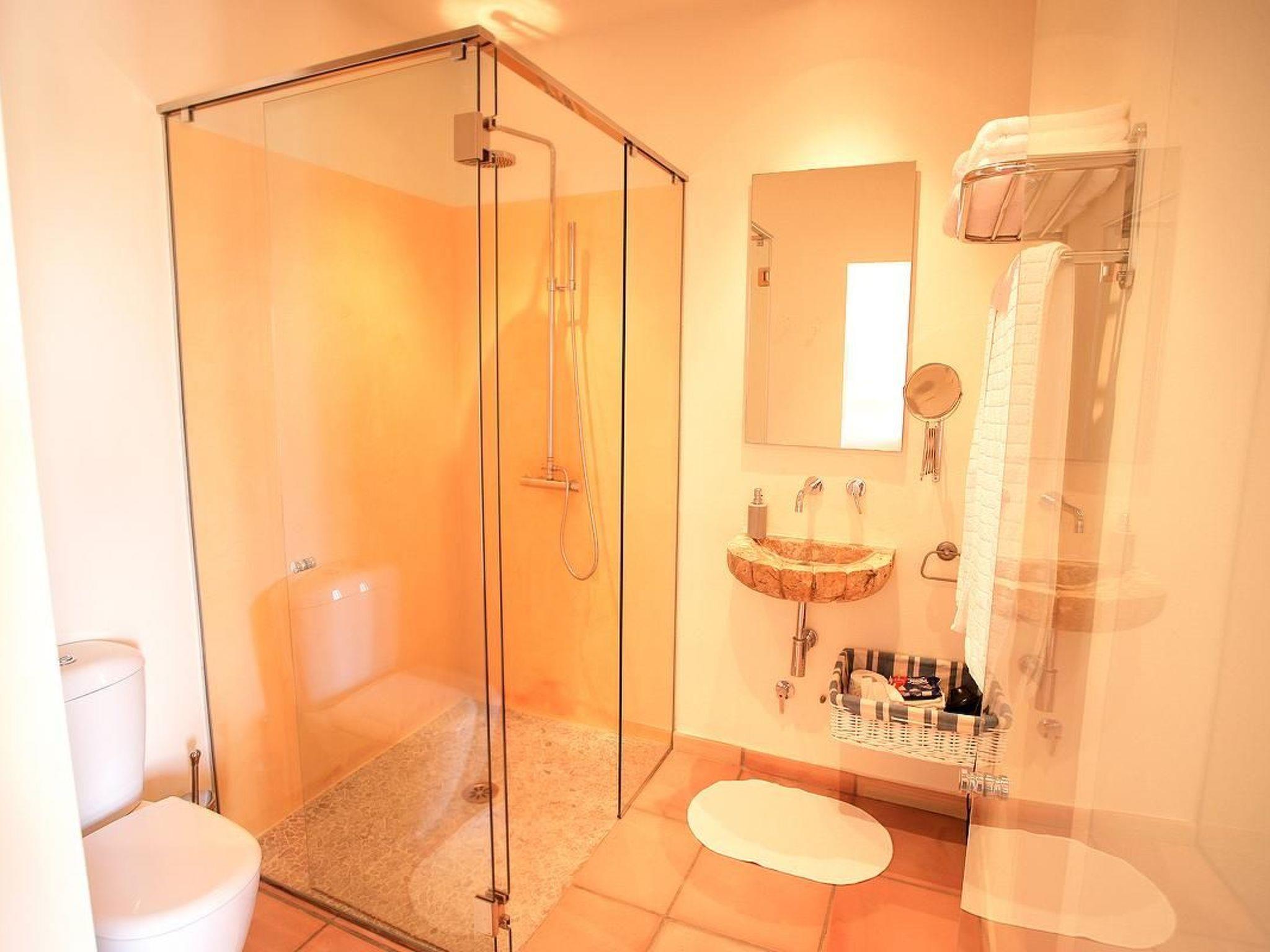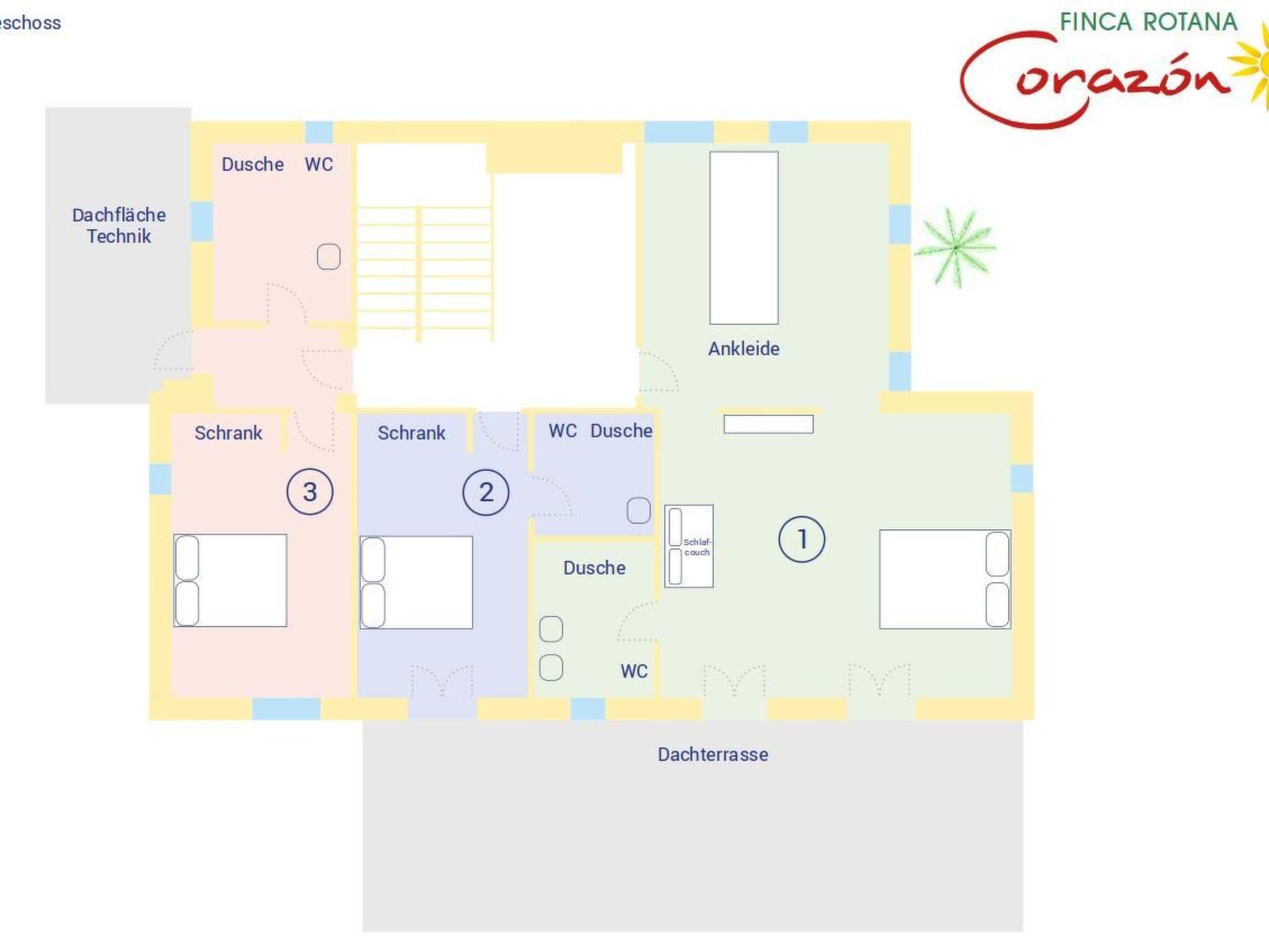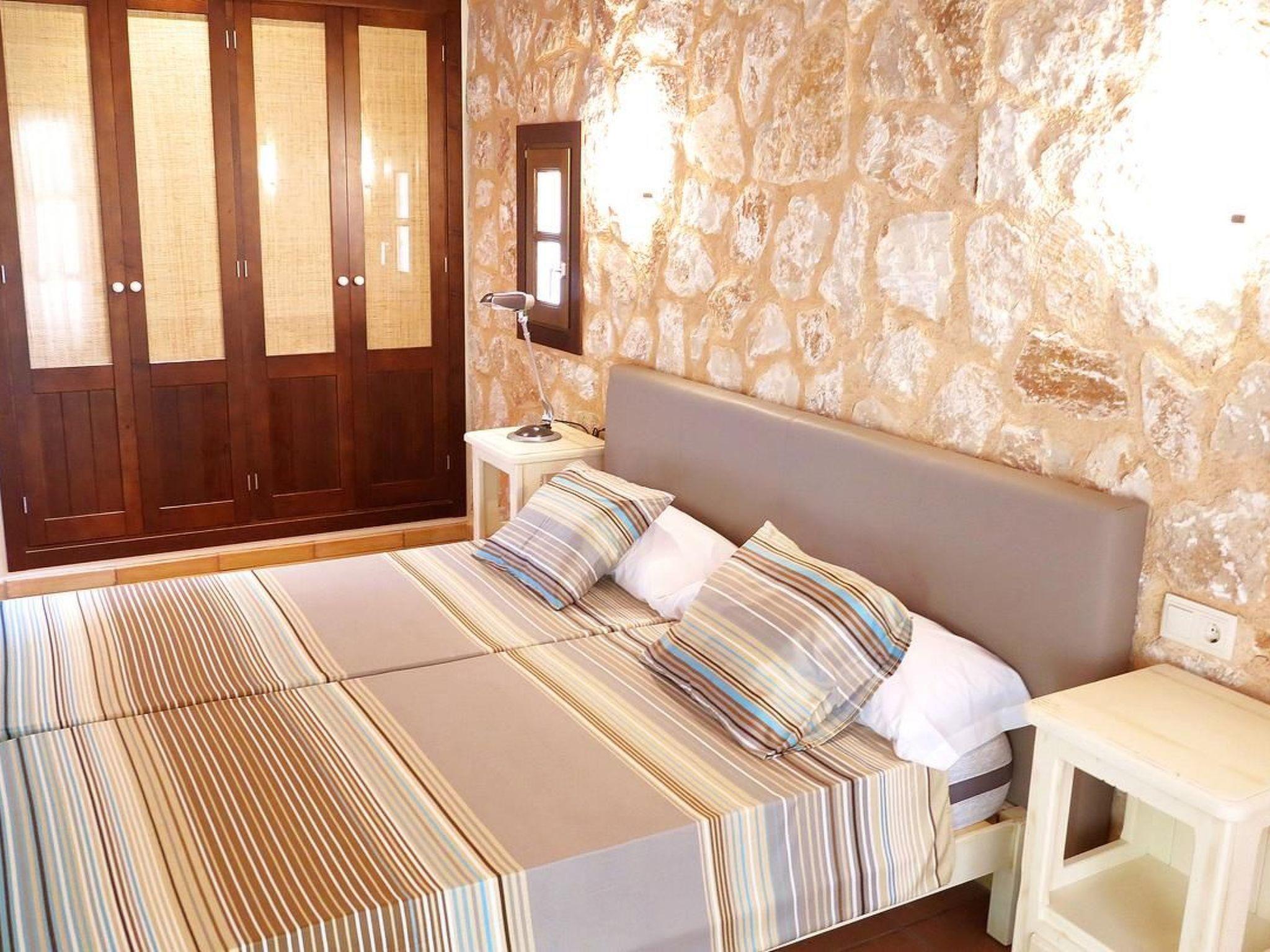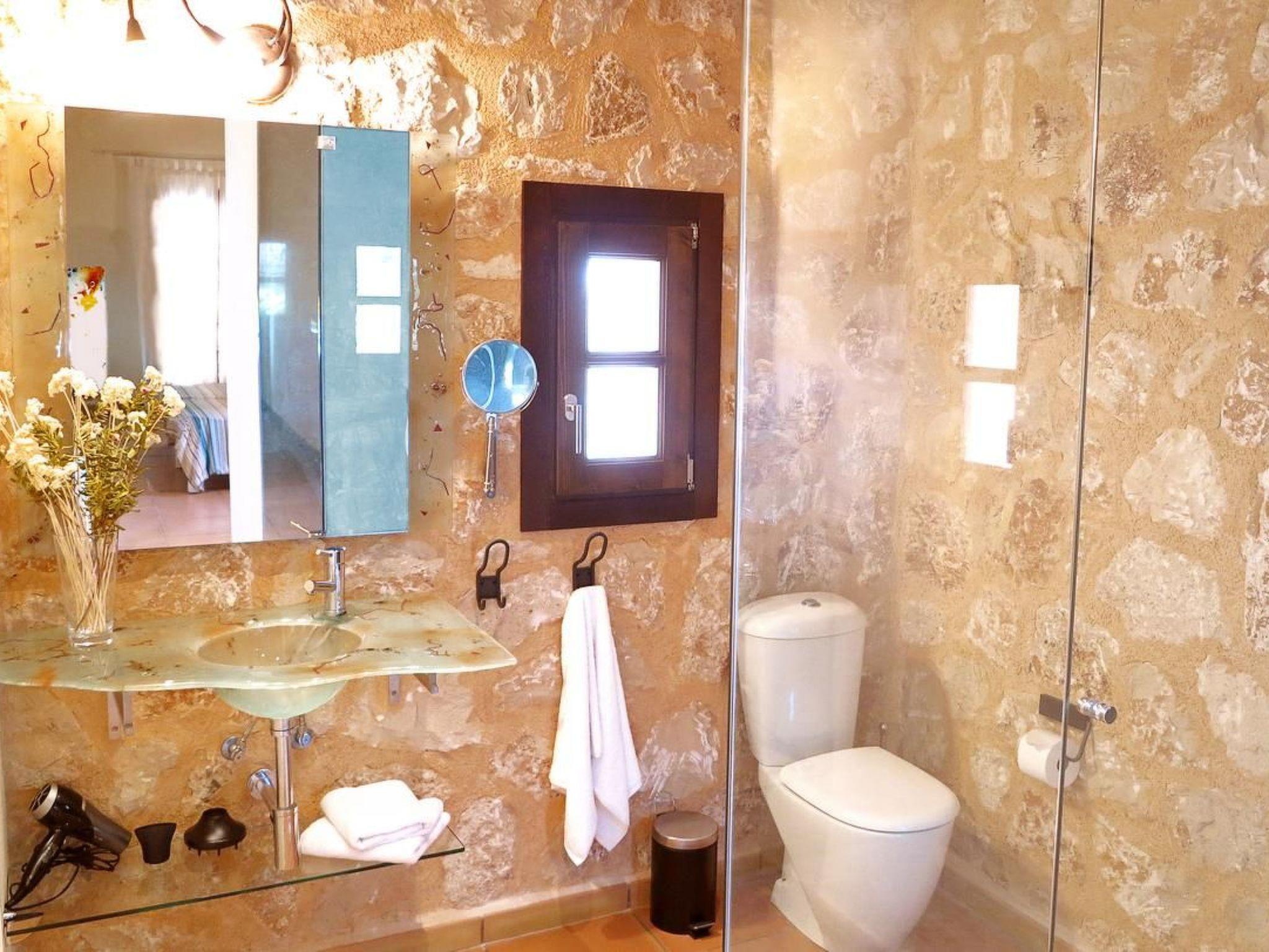 The entrance area leads to the open plan living and dining area with a professional kitchen. The kitchen offers a modern ceran stove, an oven, an exhaust hood, a freezer, a refrigerator and a bar with plenty of worktop counter space. A Phillips coffee machine (professional model) is available.The dining table for eight is ideal for enjoying a lovely meal. The adjacent living room offers a fireplace, which is especially comforting during the cooler months. The four double bedrooms offer privacy. The high end bedrooms have level access showers. The first bedroom is a master suite with an open dressing area and an additional sofa bed. The large dressing area and the master suite are on the top floor. The spacious patio on the top floor, accessible from two rooms, grants stunning views over the south of the island. You will feel comfortable year round, thanks to the air conditioning unit and the underfloor heating. The owner welcomes you to enjoy your stay here. A welcome gift awaits upon your arrival. Wi-Fi is available. The bedrooms are furnished as follows: master suite: 180 x 220 cm, bed 2: 150x 200 cm (romance room, top floor=, bed three: 180 x 200cm (top floor), bed 4: 180 x 200 (two single mattresses combined to make a double; in the downstairs bedroom). The Finca is heated with underfloor heating and the air conditioning unit if necessary. Each bedroom and the living room are equipped with air conditioning.