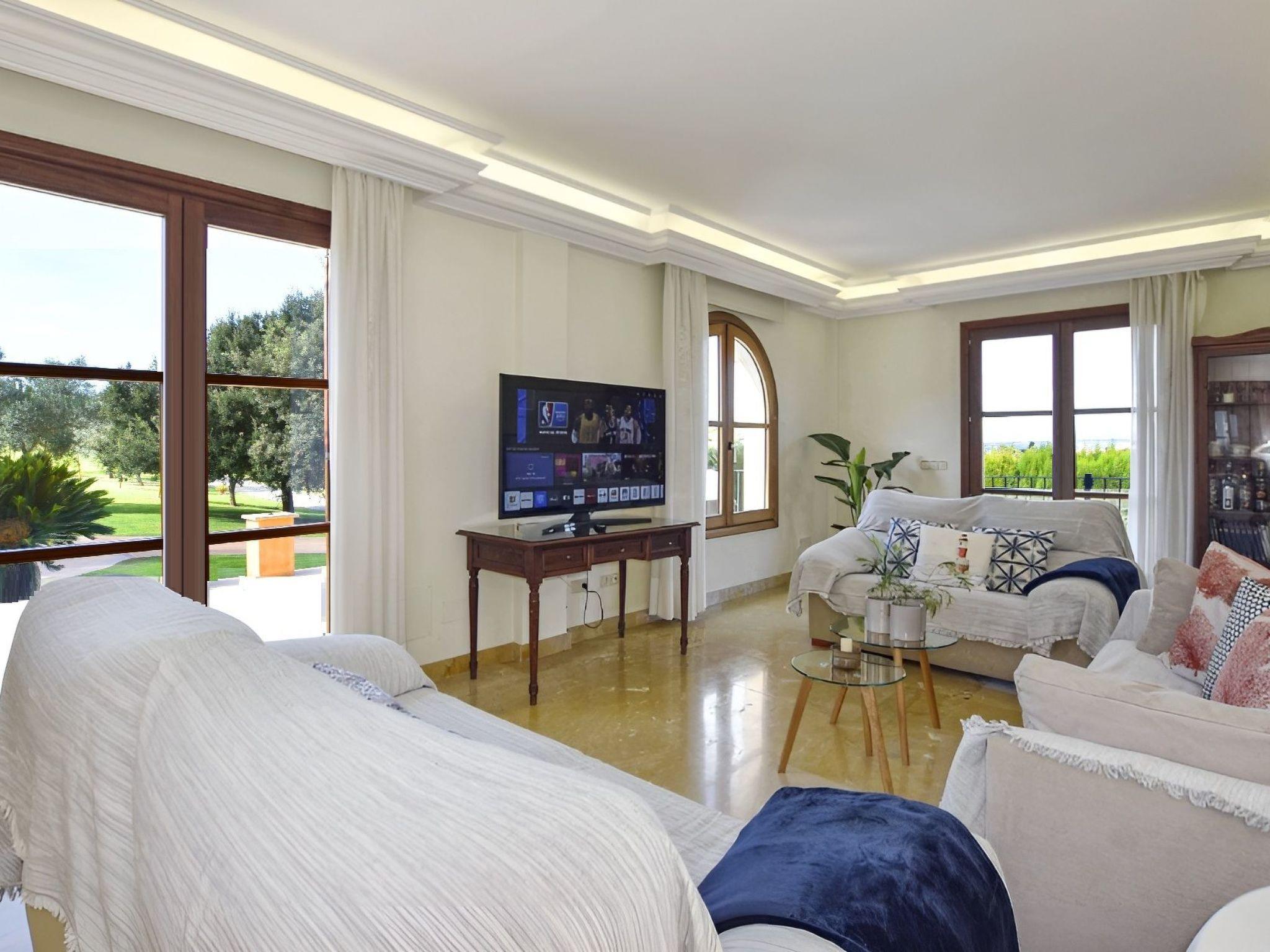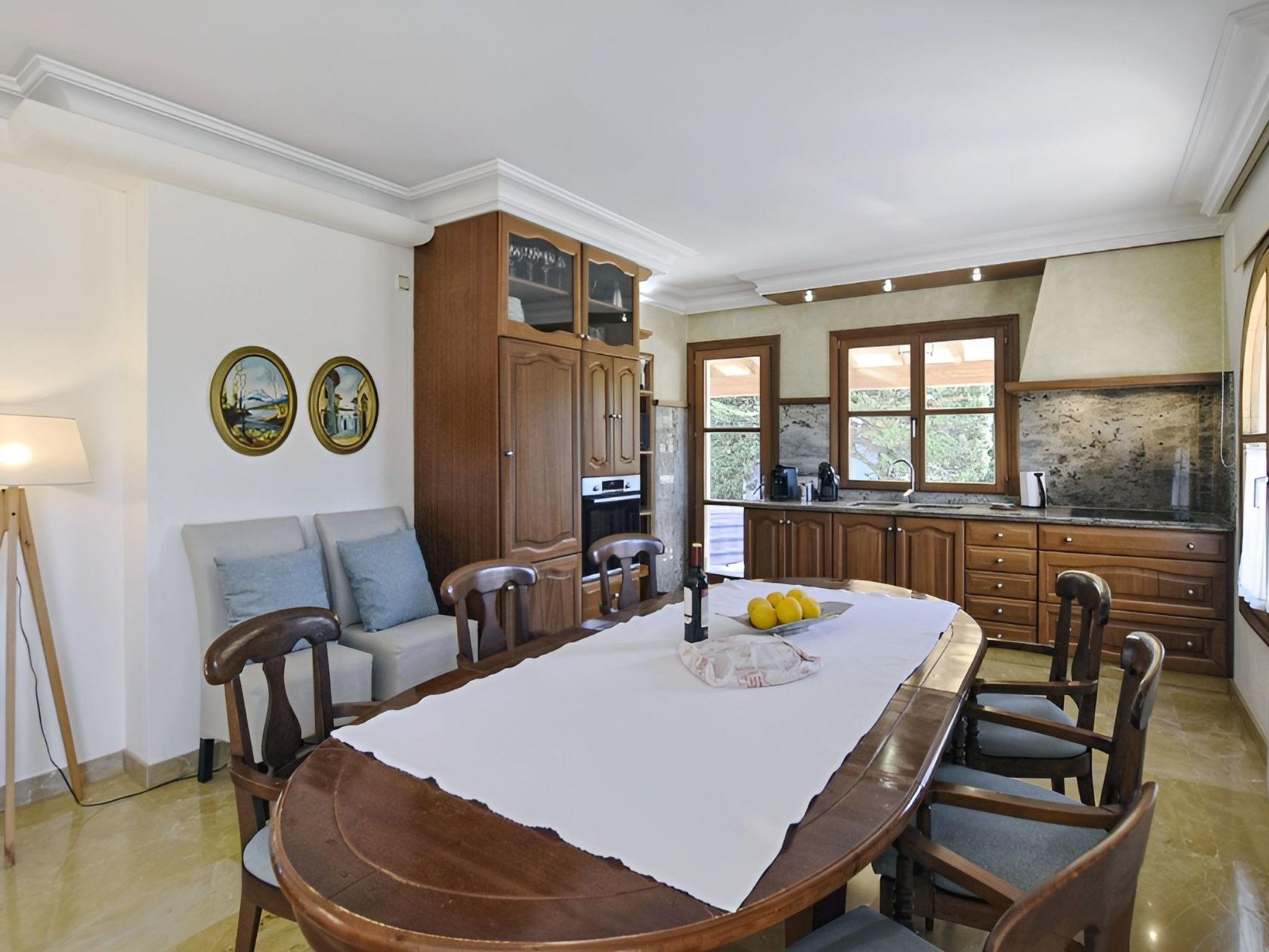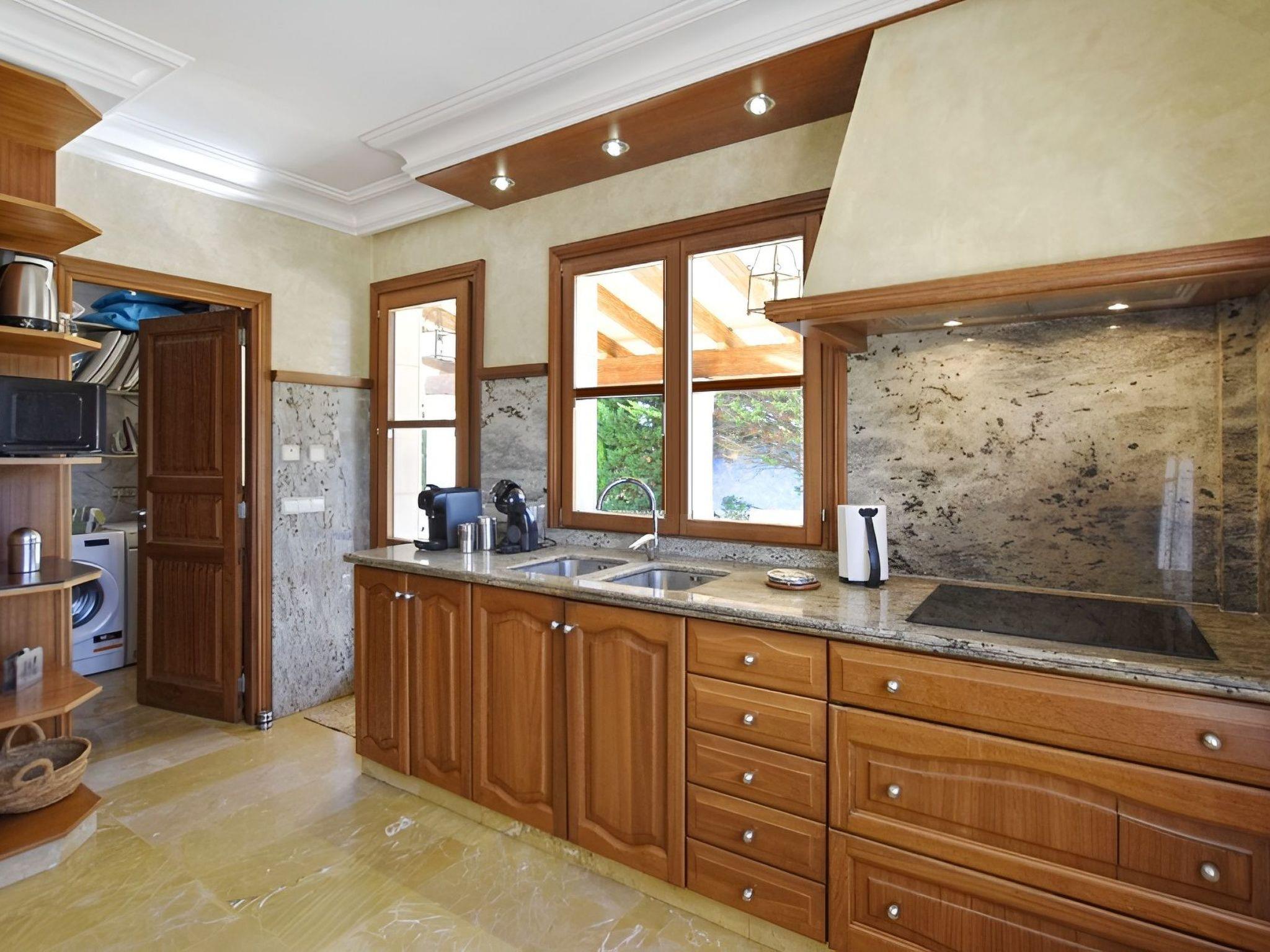 The highlight of this finca is undoubtedly the beautiful natural garden with the lawn area surrounding the pool. The covered terrace next to the pool with comfortable sofas offers plenty of shade. The pool measures 9 m x 5 m (depth 0,90 - 1,70 m, salt water) and is perfectly integrated in the garden. Near the covered porch of the house with dining table and sofas, there is a barbecue area. For a bit of activity, there is a ping pong table, a trampoline, football goals and basketball goals.