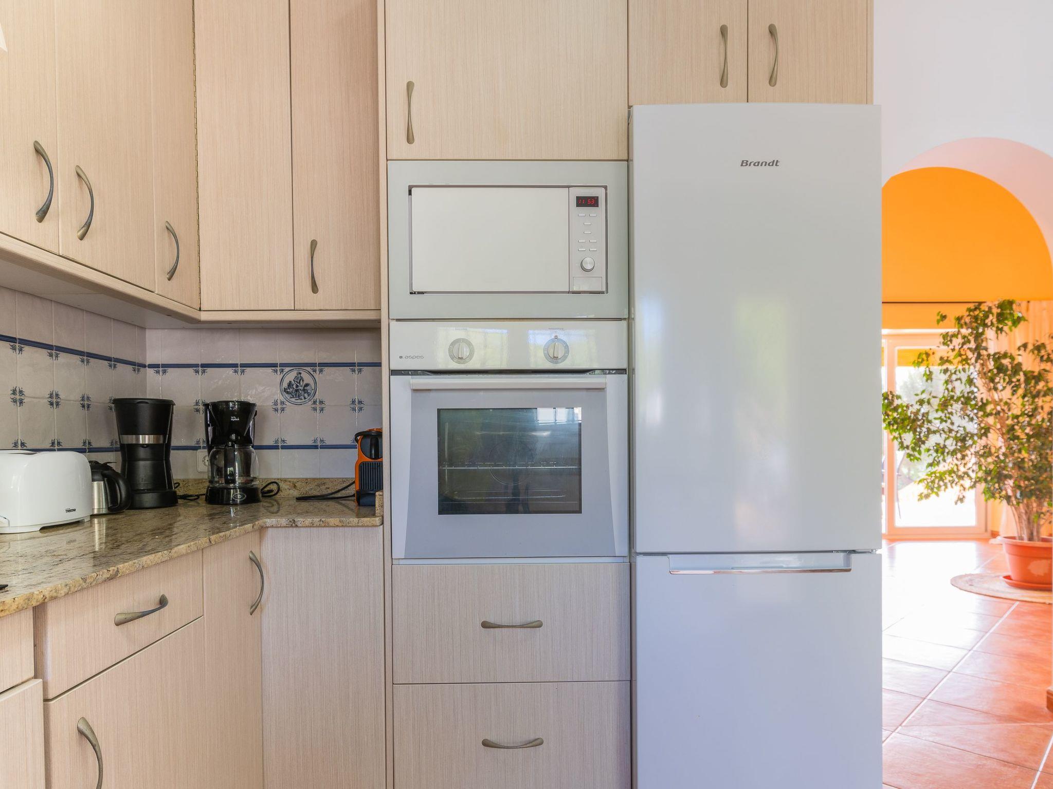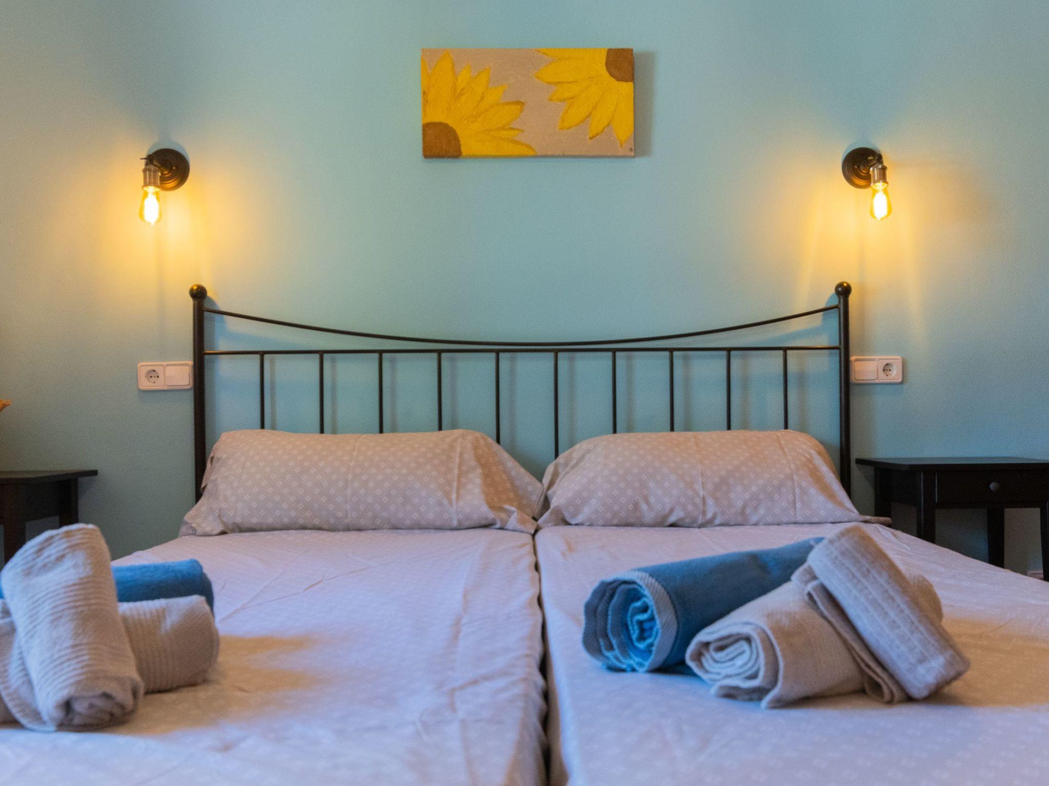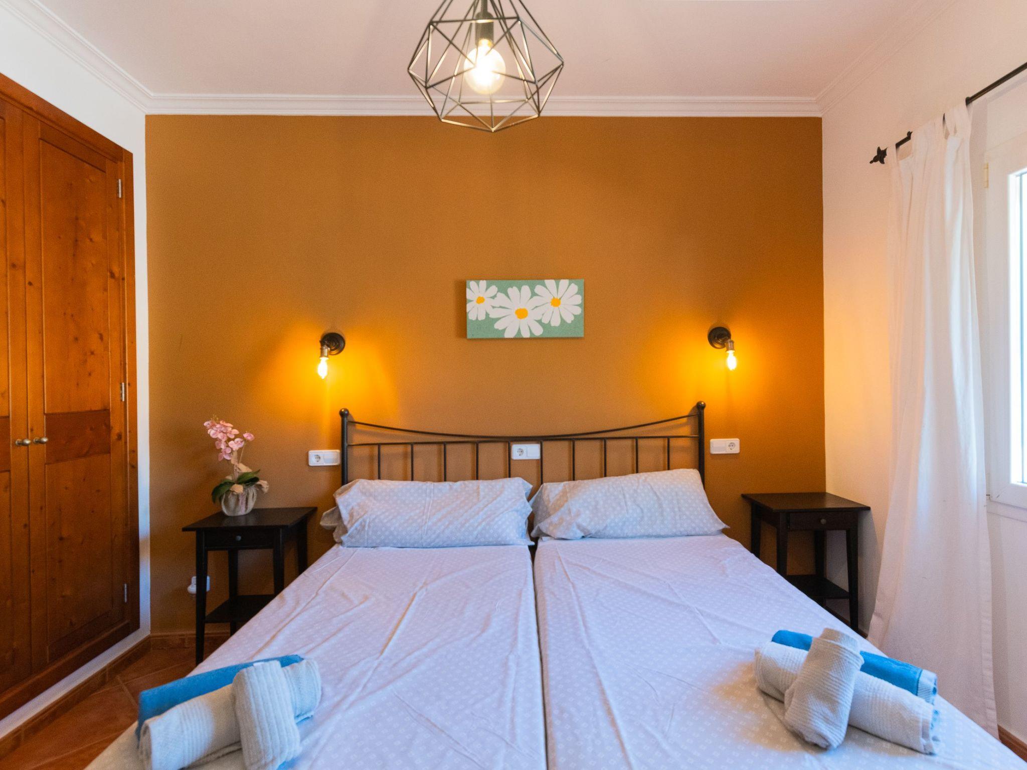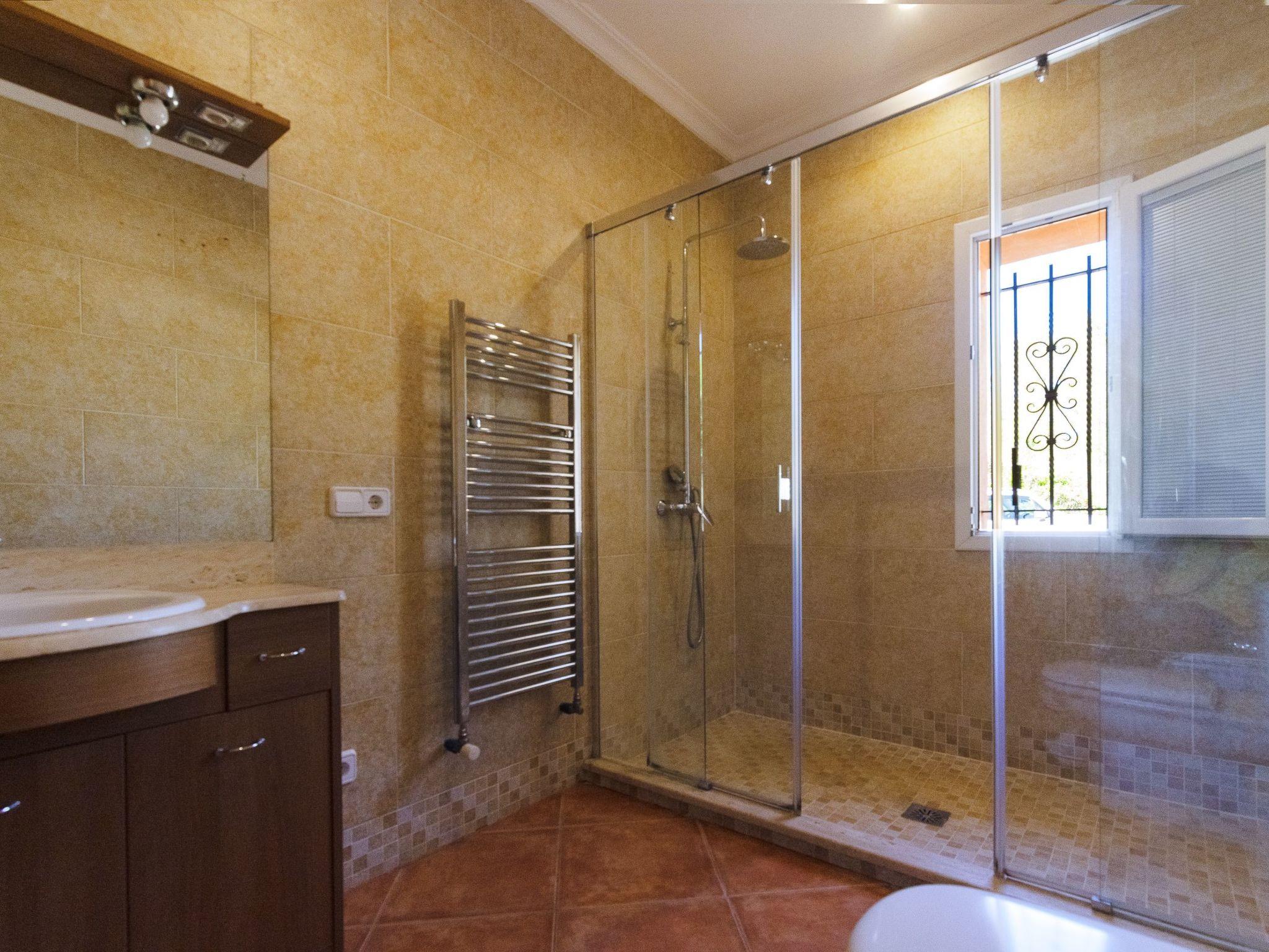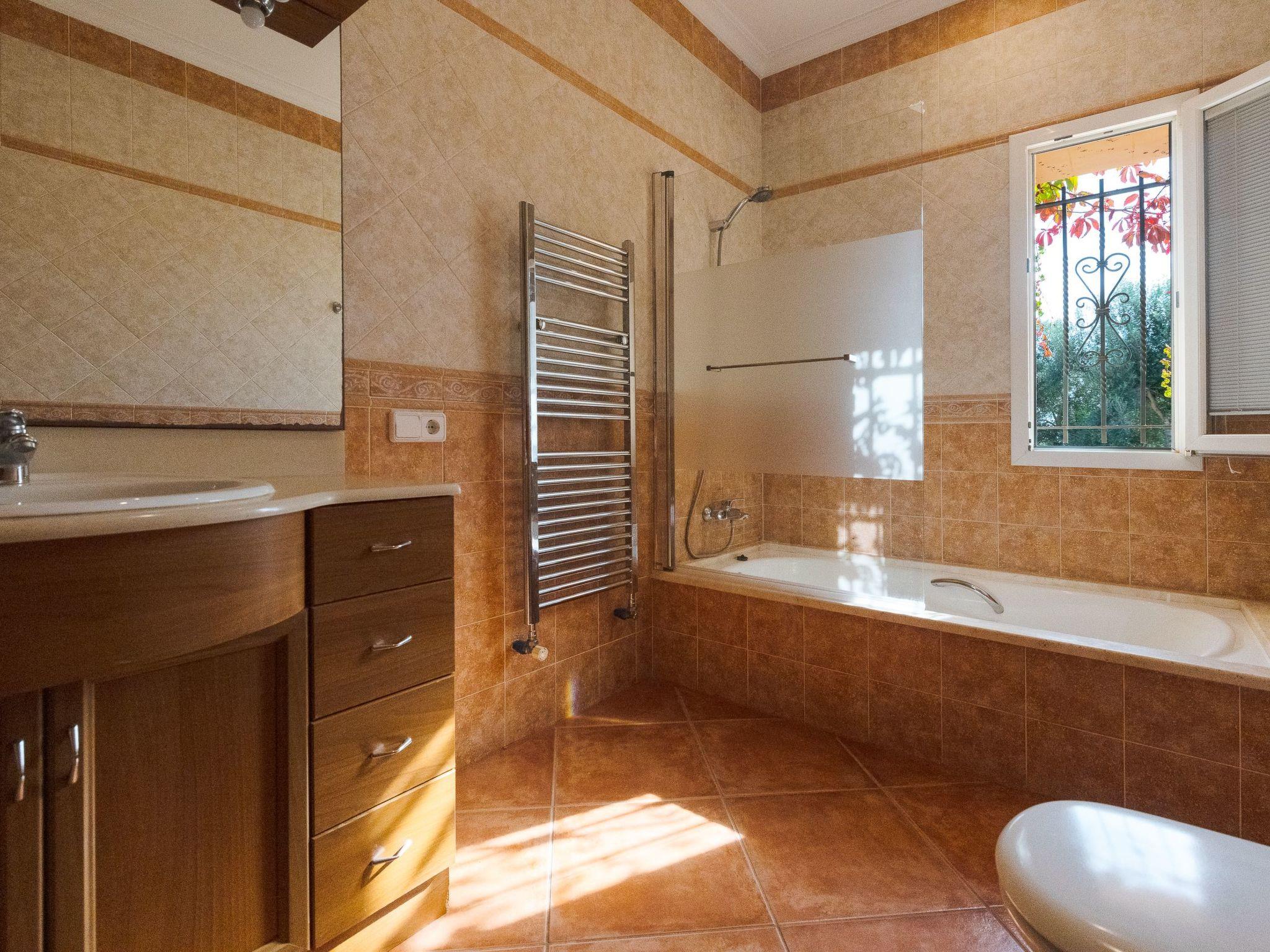 All rooms are on one floor, which offers spacious areas both inside and out. The large open-plan living room is connected to the kitchen and has access to the beautiful terrace via sliding glass doors. The kitchen is well equipped and has a dining area. Next to it is the utility room with washing machine and an additional fridge. There is also a bathroom with shower next to the kitchen. The house has four bedrooms. Two of them have a double bed and two have two single beds each. There are two further bathrooms, one with a shower and the other with a bathtub. Air conditioning in the bedrooms with fixed and limited hours of use from 21:00 to 09:00.