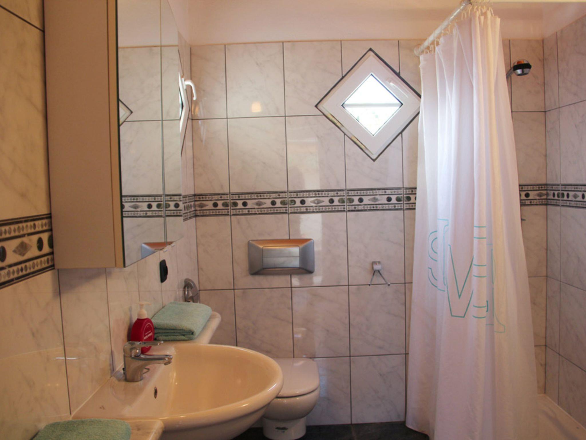 Auf der gegenüberliegenden Hausseite befinden sich ein weiteres Schlafzimmer und ein Bad mit Dusche, Waschbecken, WC und Waschmaschine. Dieses Schlafzimmer steht bei einer Belegung des Hauses mit nur 2 Personen nicht zur Verfügung.