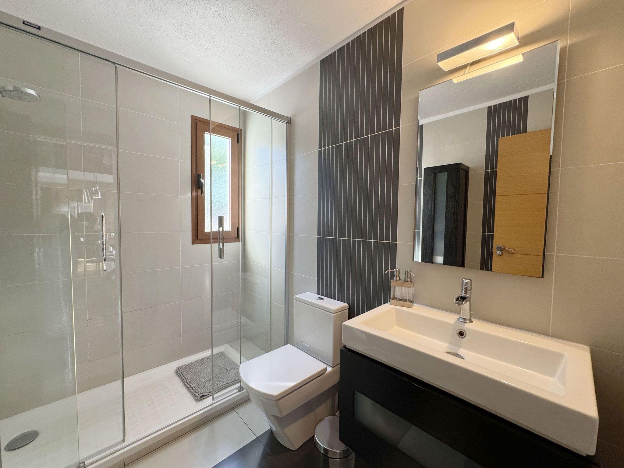 Das Ferienhaus bietet außerdem zwei komfortable Badezimmer. Das Hauptbadezimmer ist mit zwei Handwaschbecken, einer ebenerdigen Dusche, einem WC und einem Föhn ausgestattet. Das zweite Badezimmer verfügt über ein Handwaschbecken, eine ebenerdige Dusche und ein WC.