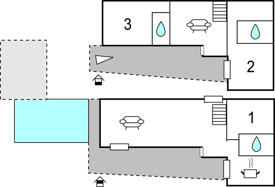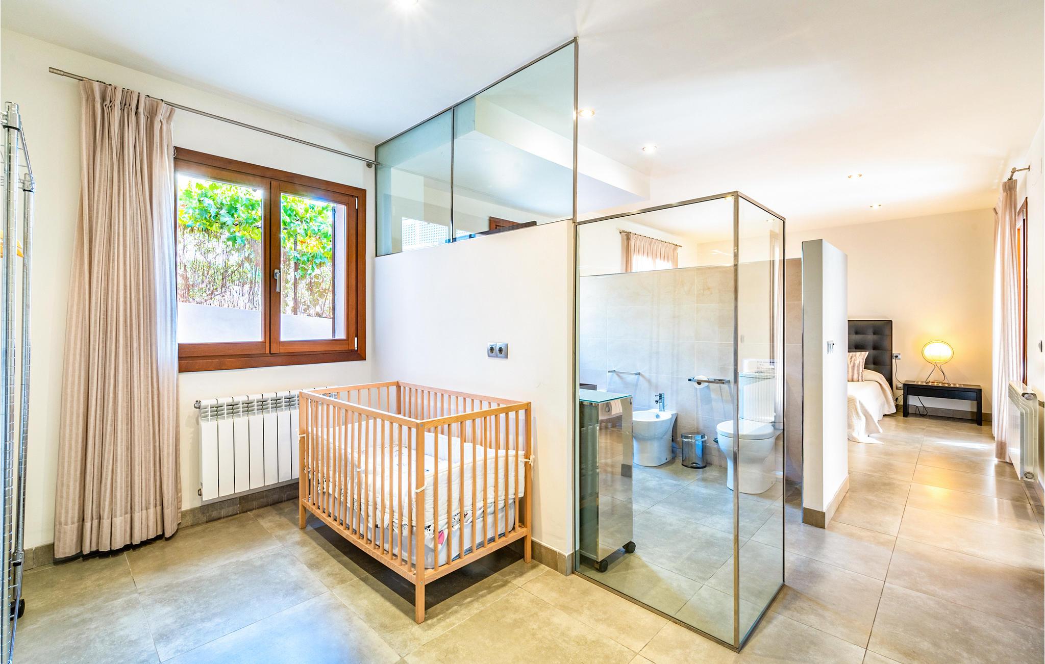 På grund af bjergskråningen ligger indgangen på 1. sal. Der finder du salonen med et moderne musik- og tv-system, en spiseplads, køkkenet og et soveværelse med badeværelse, en hyggelig terrasse, poolområdet og en lille græsplæne. Den smaragdgrøn infinity-pool vil bare glæde dig. I stueetagen er der yderligere to soveværelser med 2 badeværelser. En af soveværelserne skiller sig ud på grund af sit originale koncept. Badeværelset er integreret i rummet og delvist åbent til toppen.